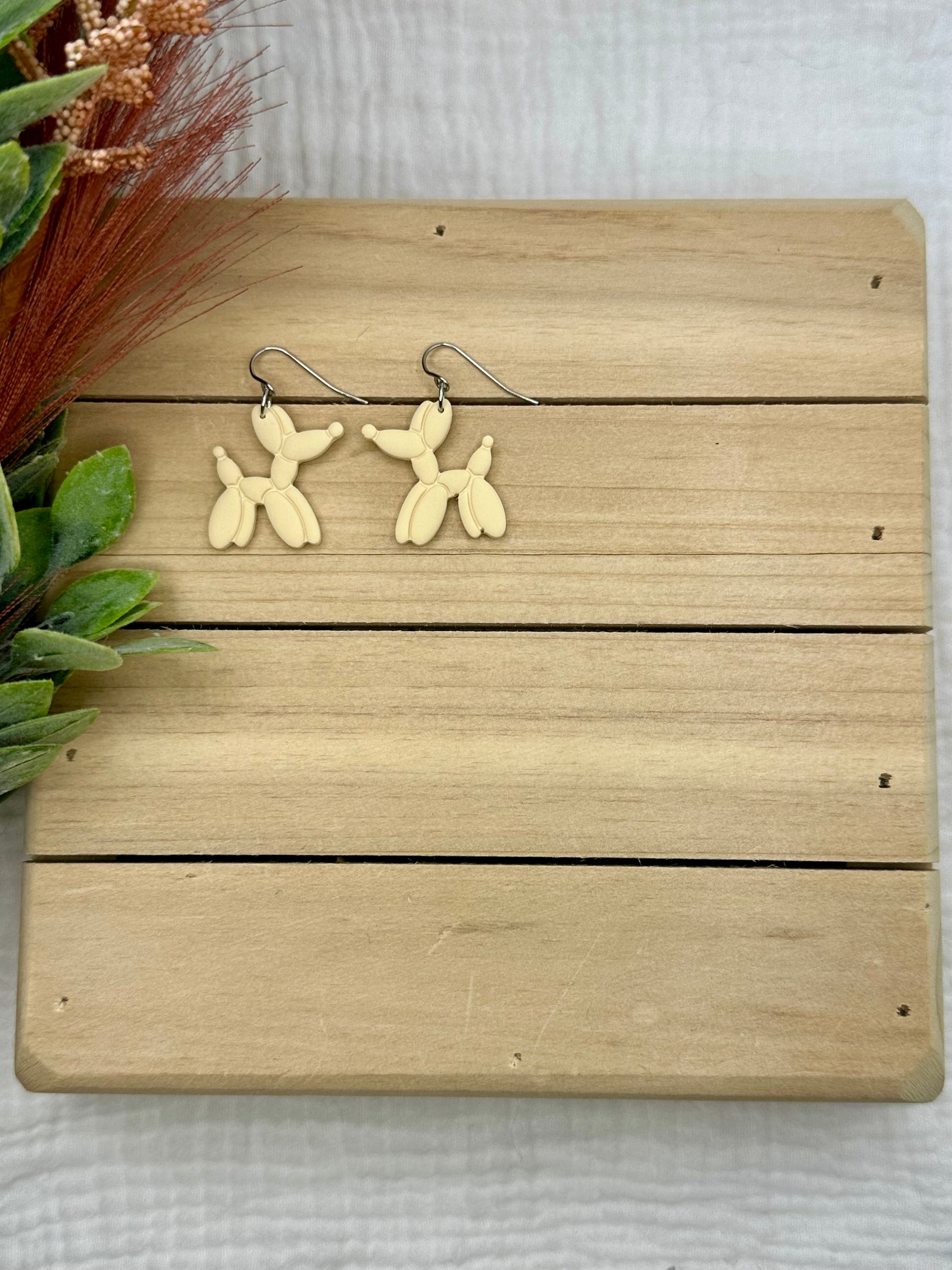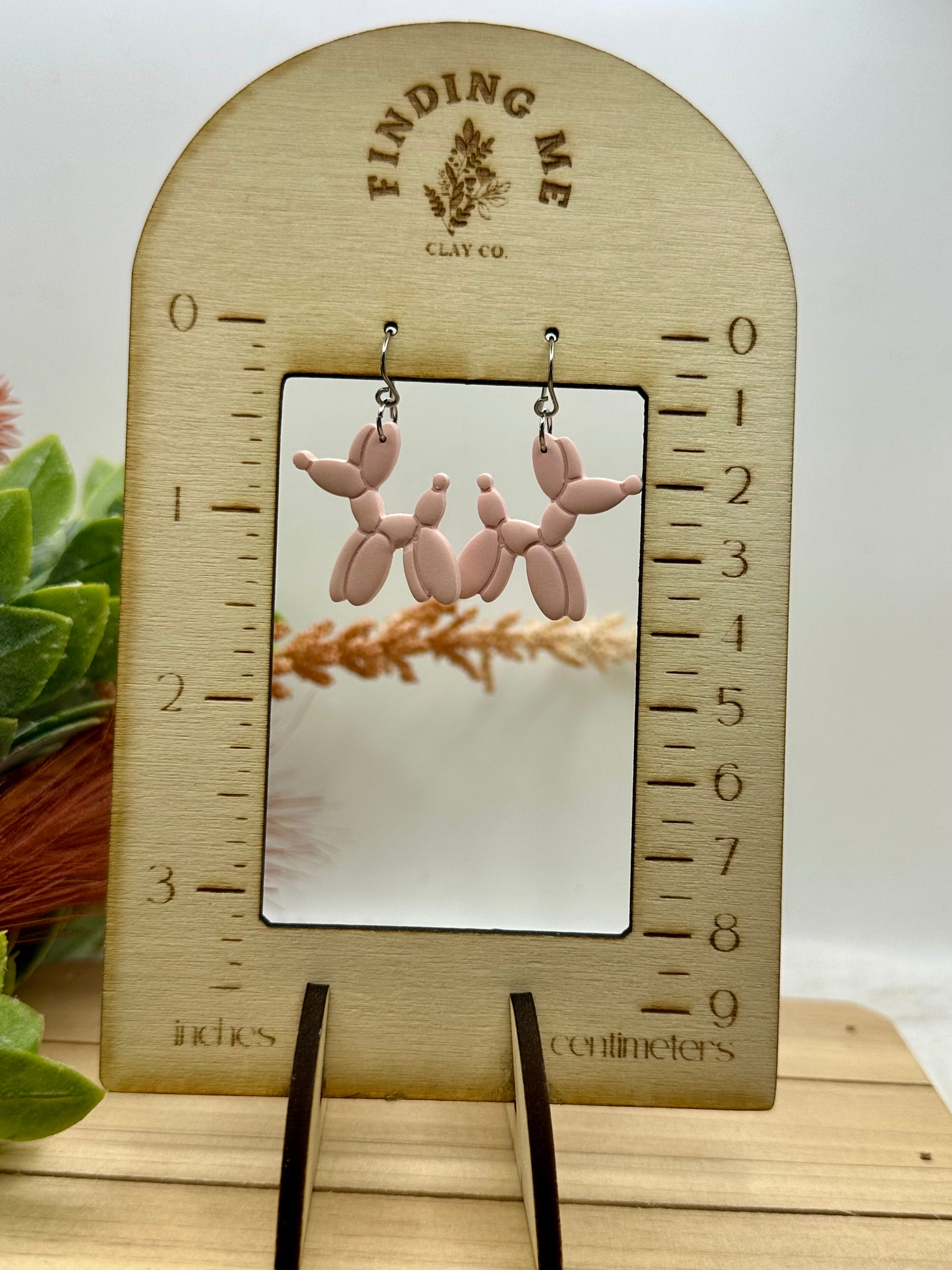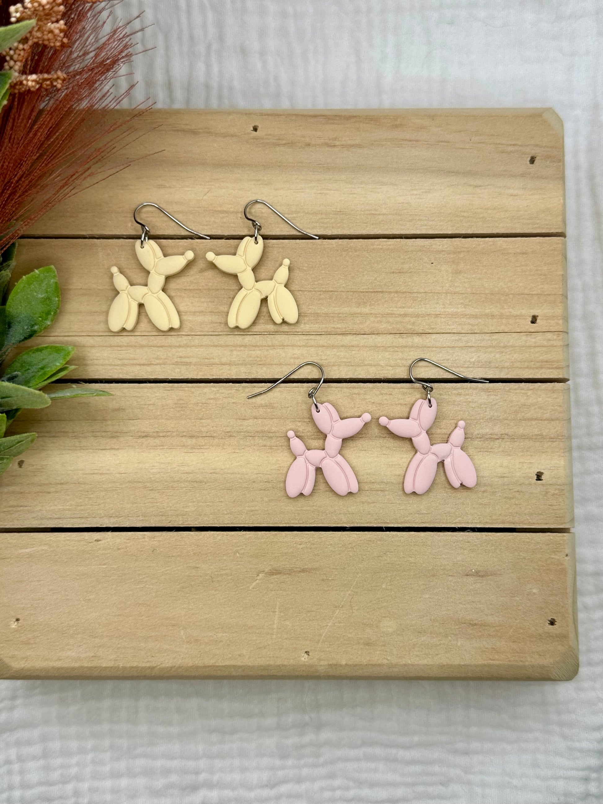 Handmade polymer clay earrings. All on hypoallergenic surgical grade steel findings. Balloon dogs in Pink and orange on surgical steel hooks