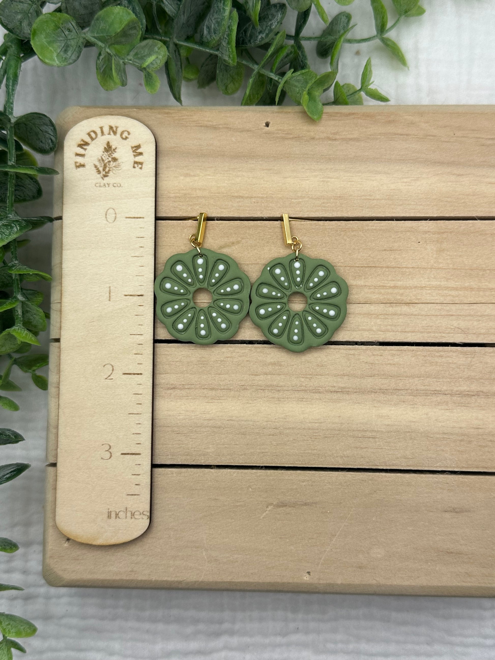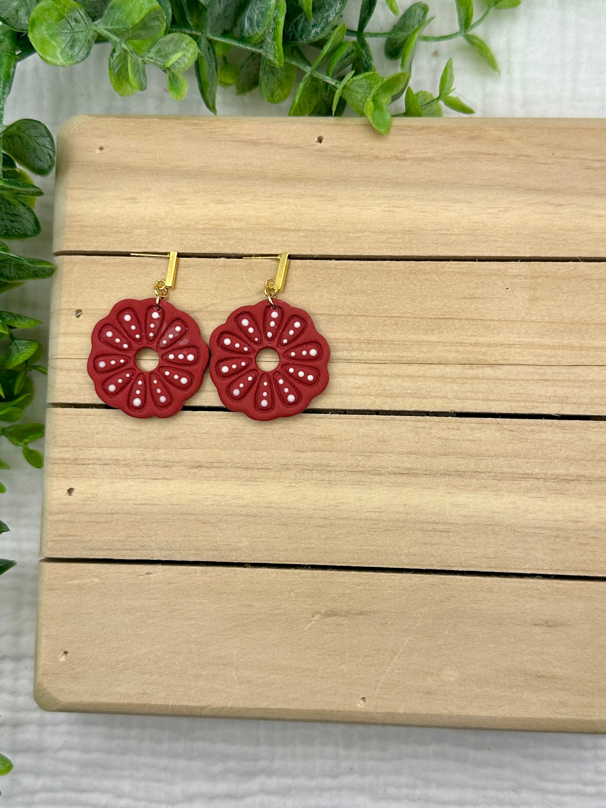 Handmade polymer clay earrings. All on hypoallergenic surgical grade steel findings. Hand Painted Middle cut out on gold coated stud top