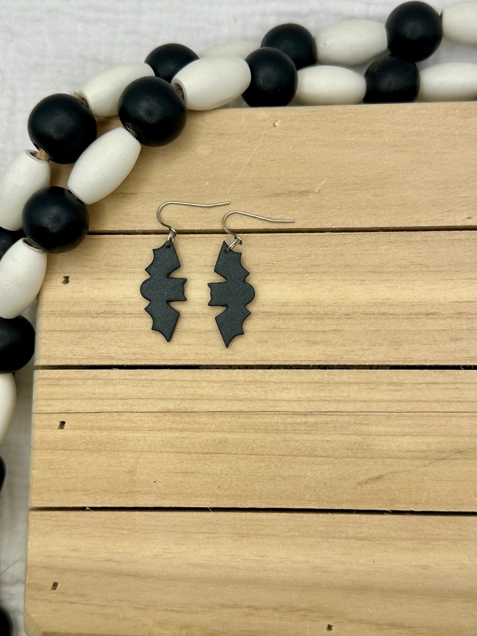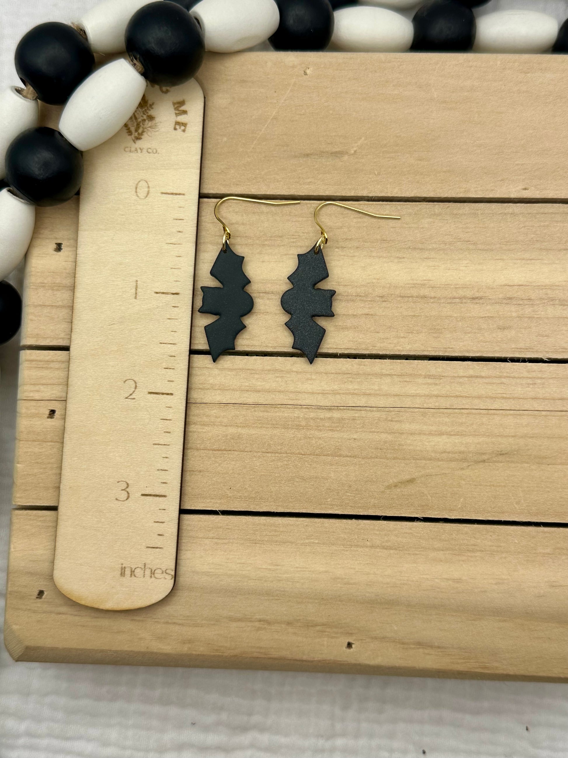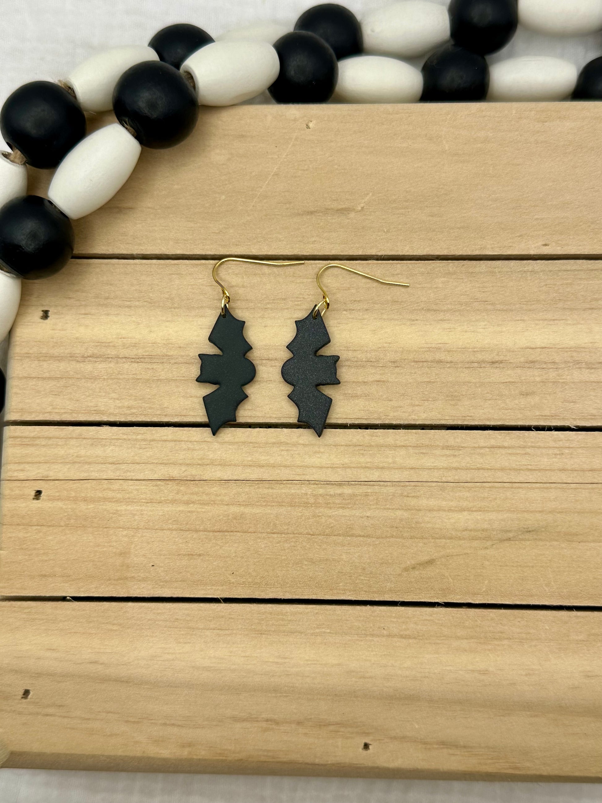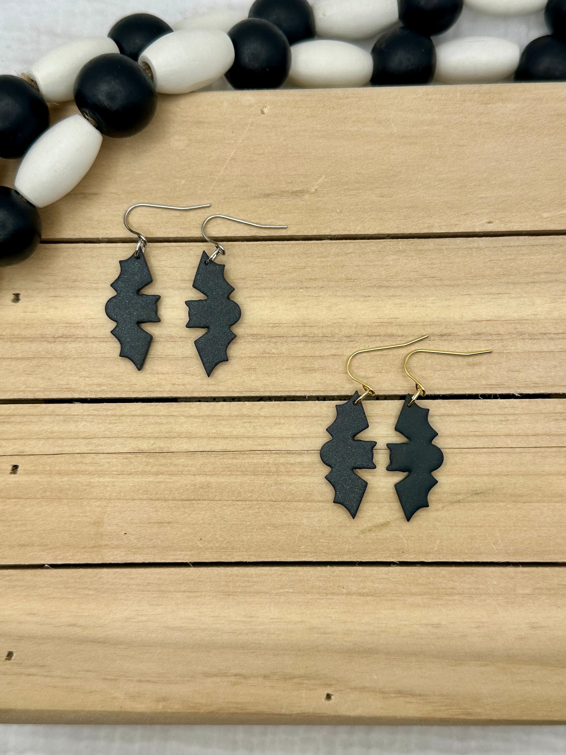 Handmade Polymer Clay earrings. Black bats with gold and silver findings