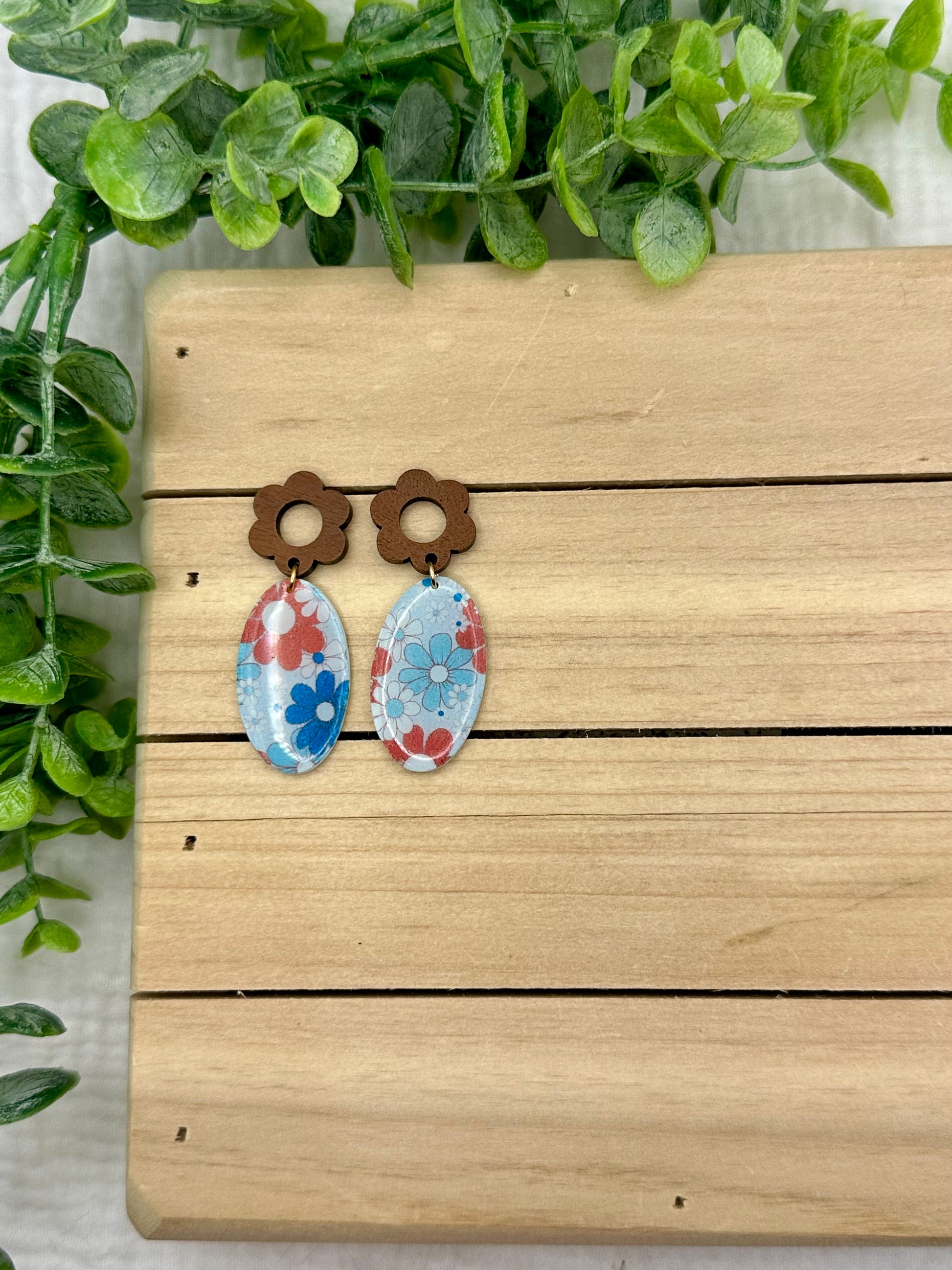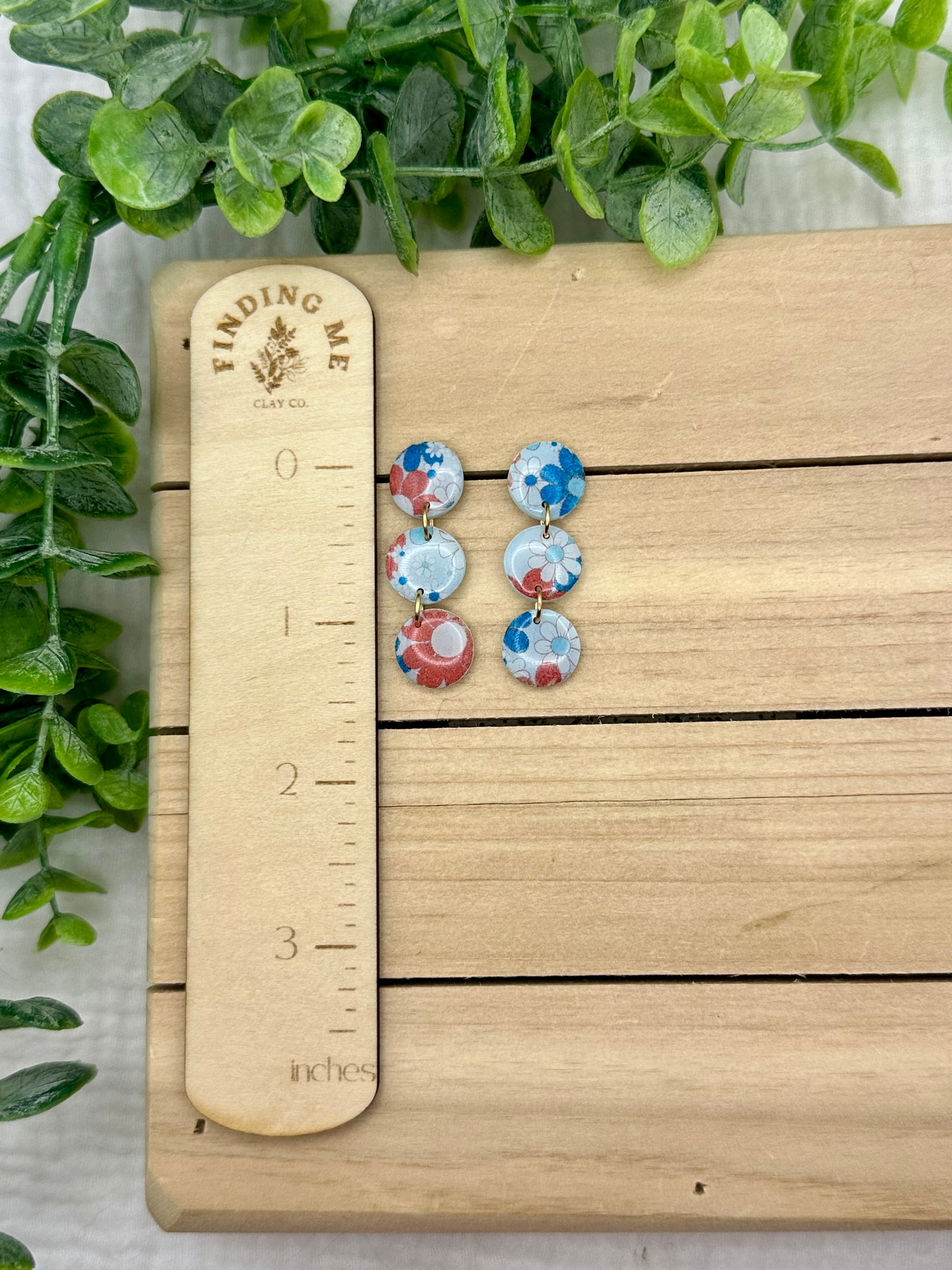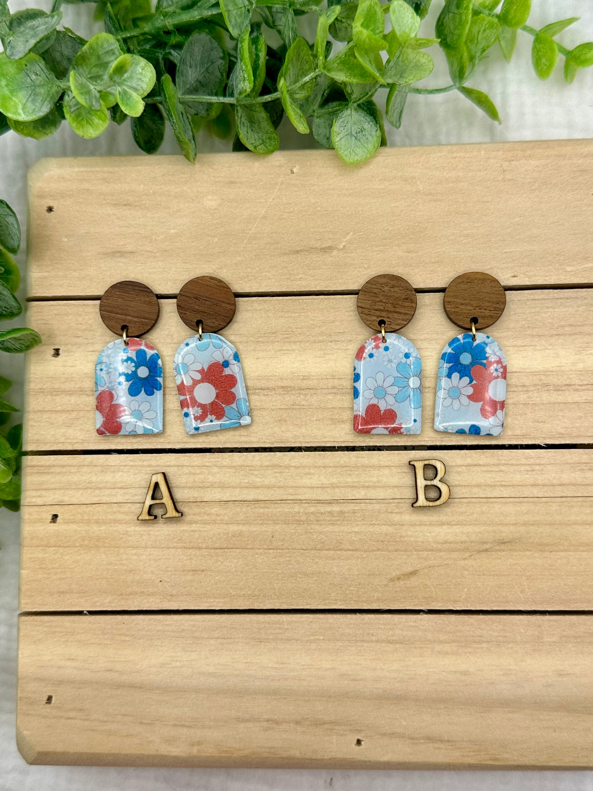 Handmade polymer clay earrings. All on hypoallergenic surgical grade steel findings. Boho floral print perfect for the 4th of July with gold coated and wooden findings