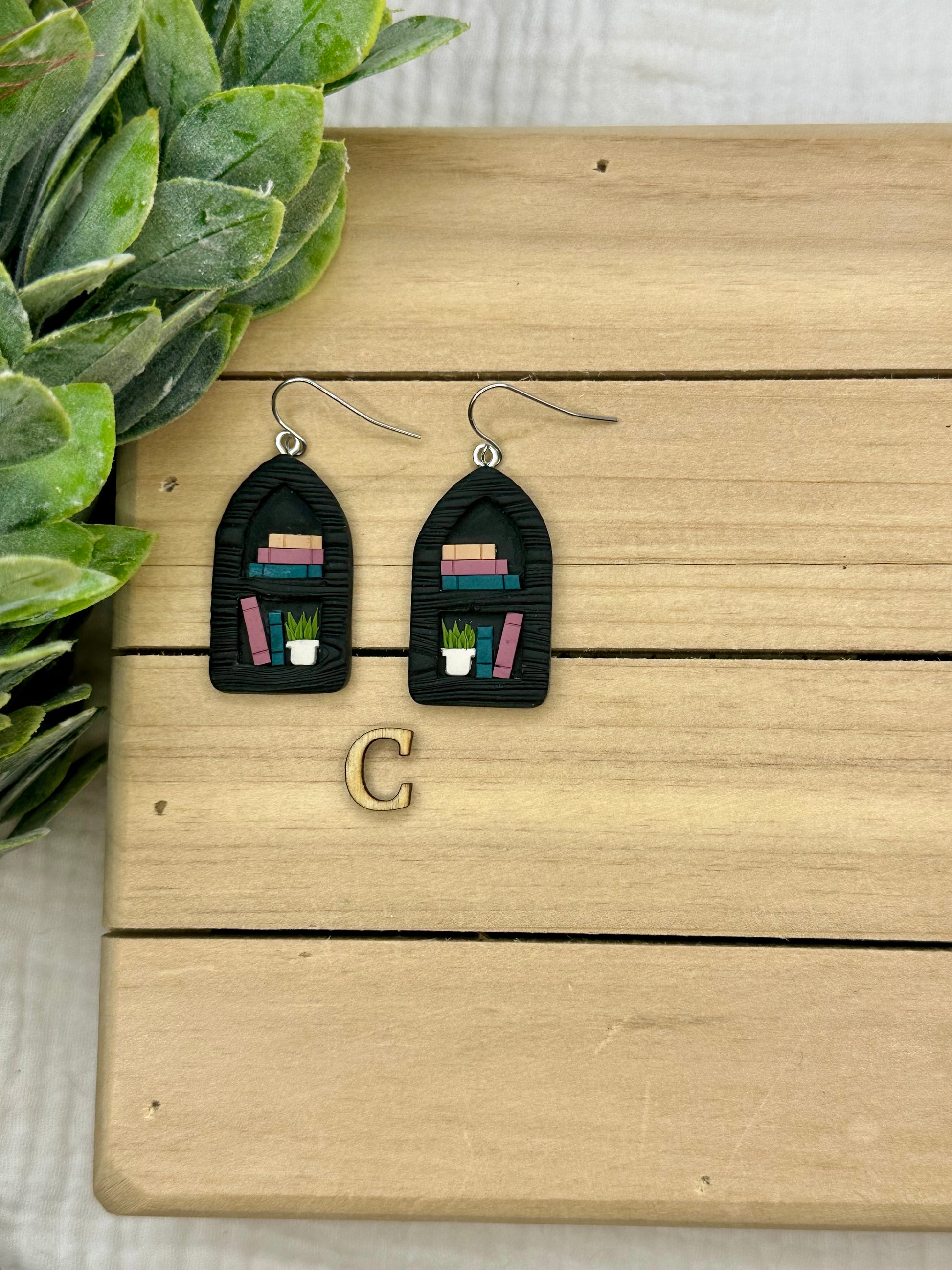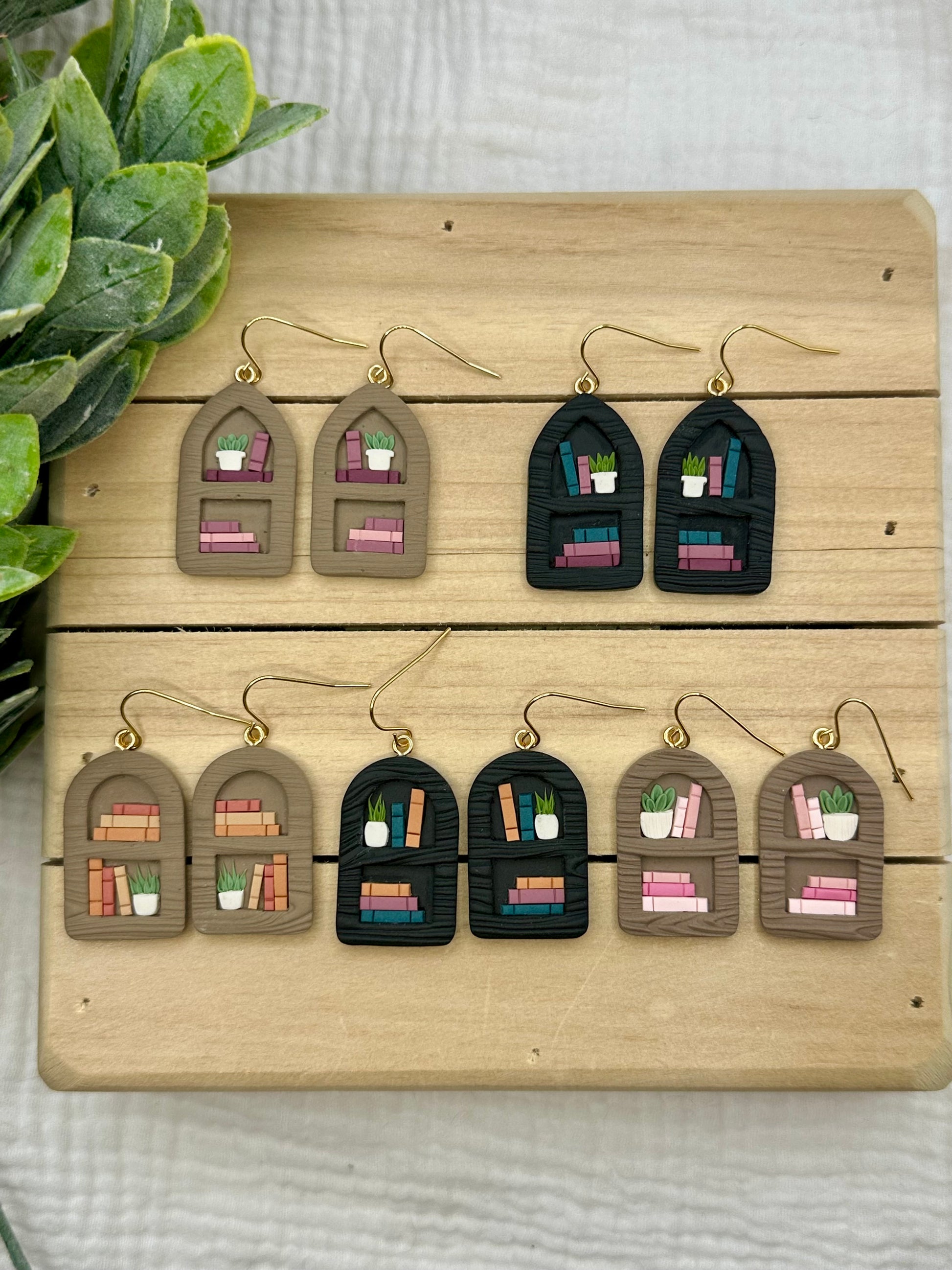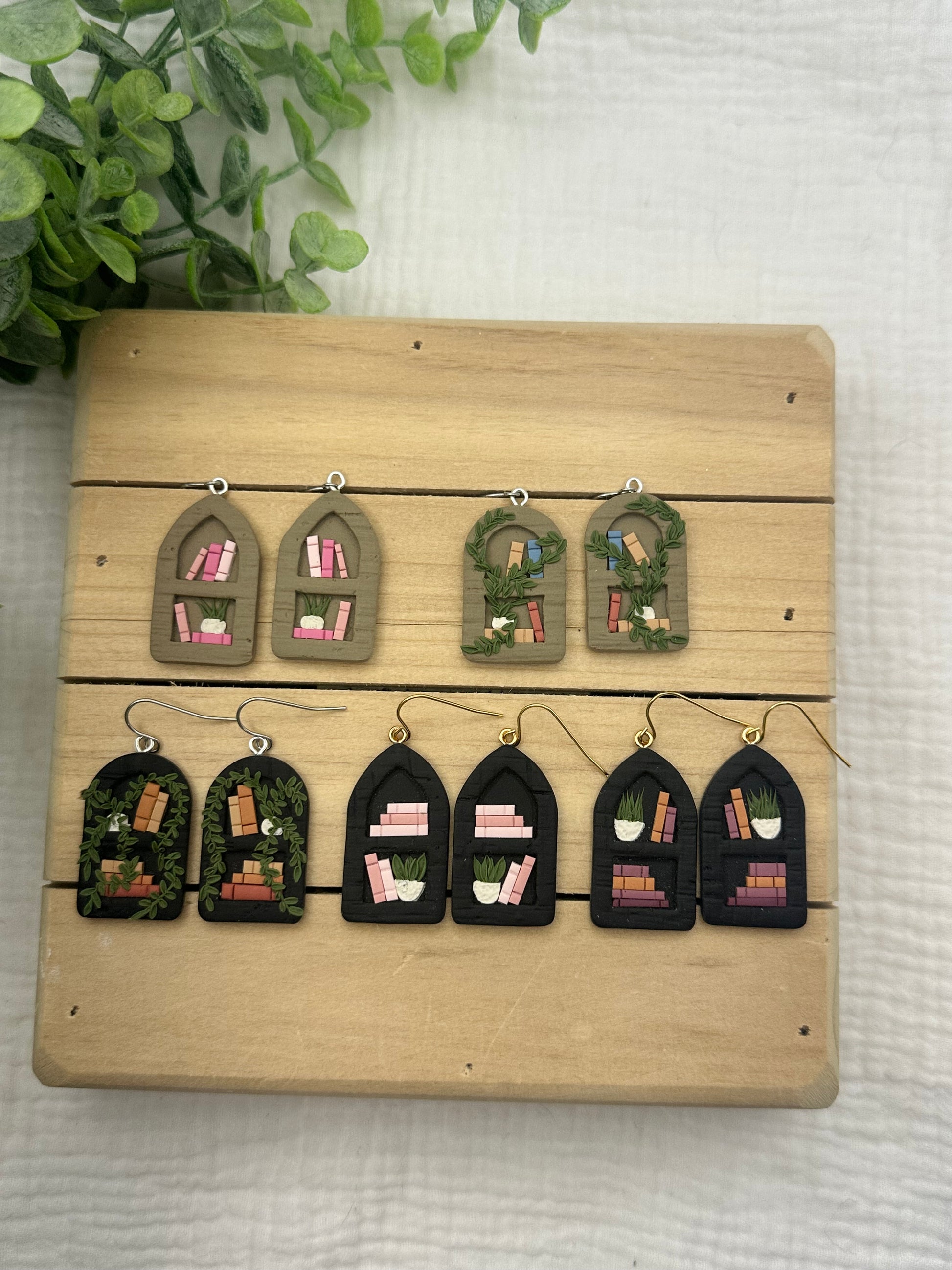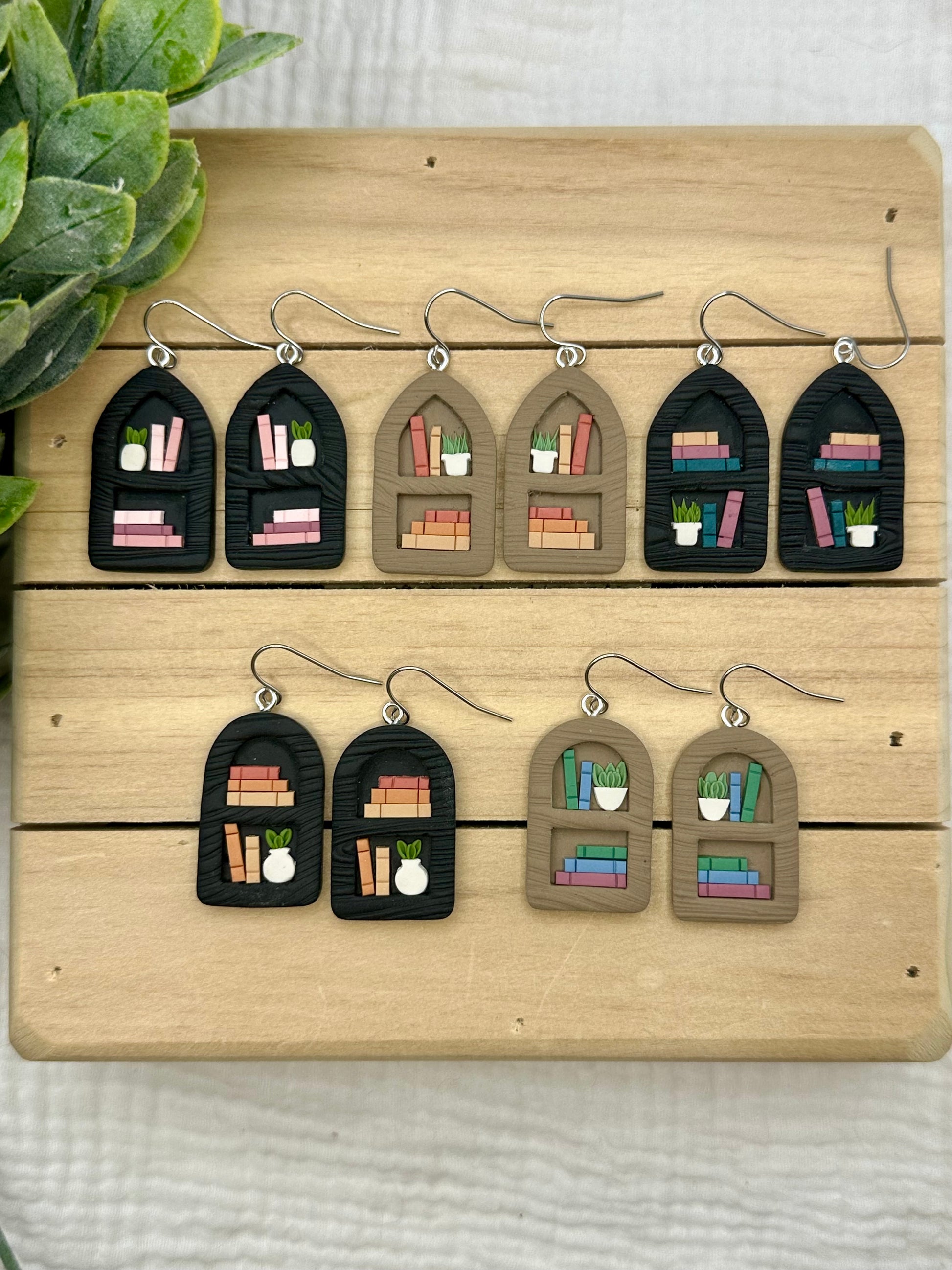 Handmade polymer clay earrings. All on hypoallergenic surgical grade steel findings. Bookshelf earrings are handcrafted and either on surgical steel hooks or gold coated surgical steel hooks