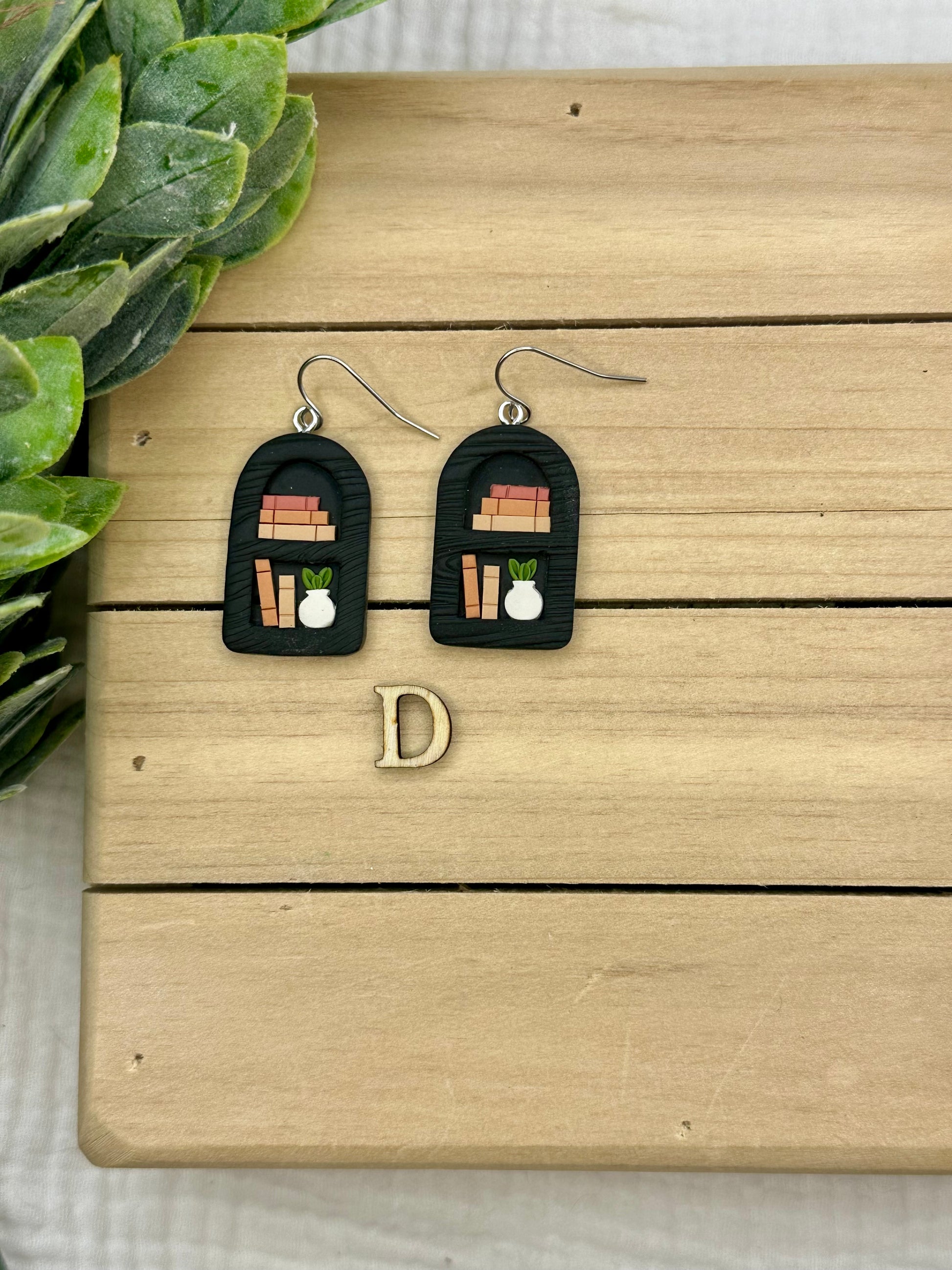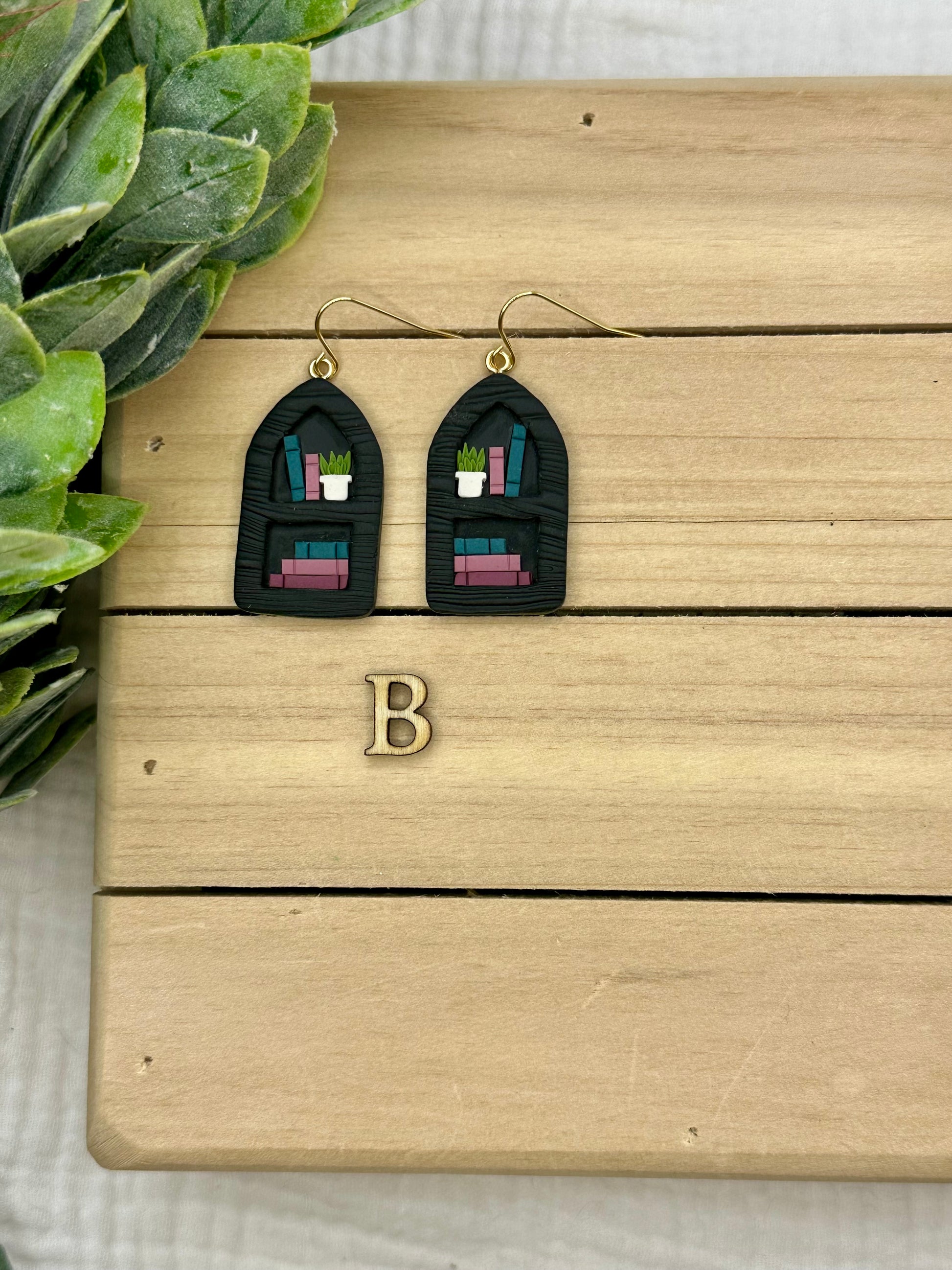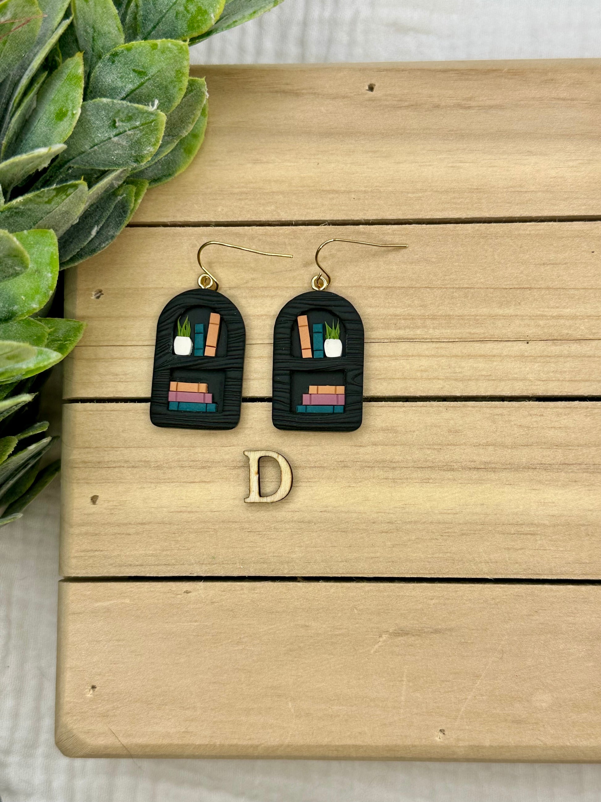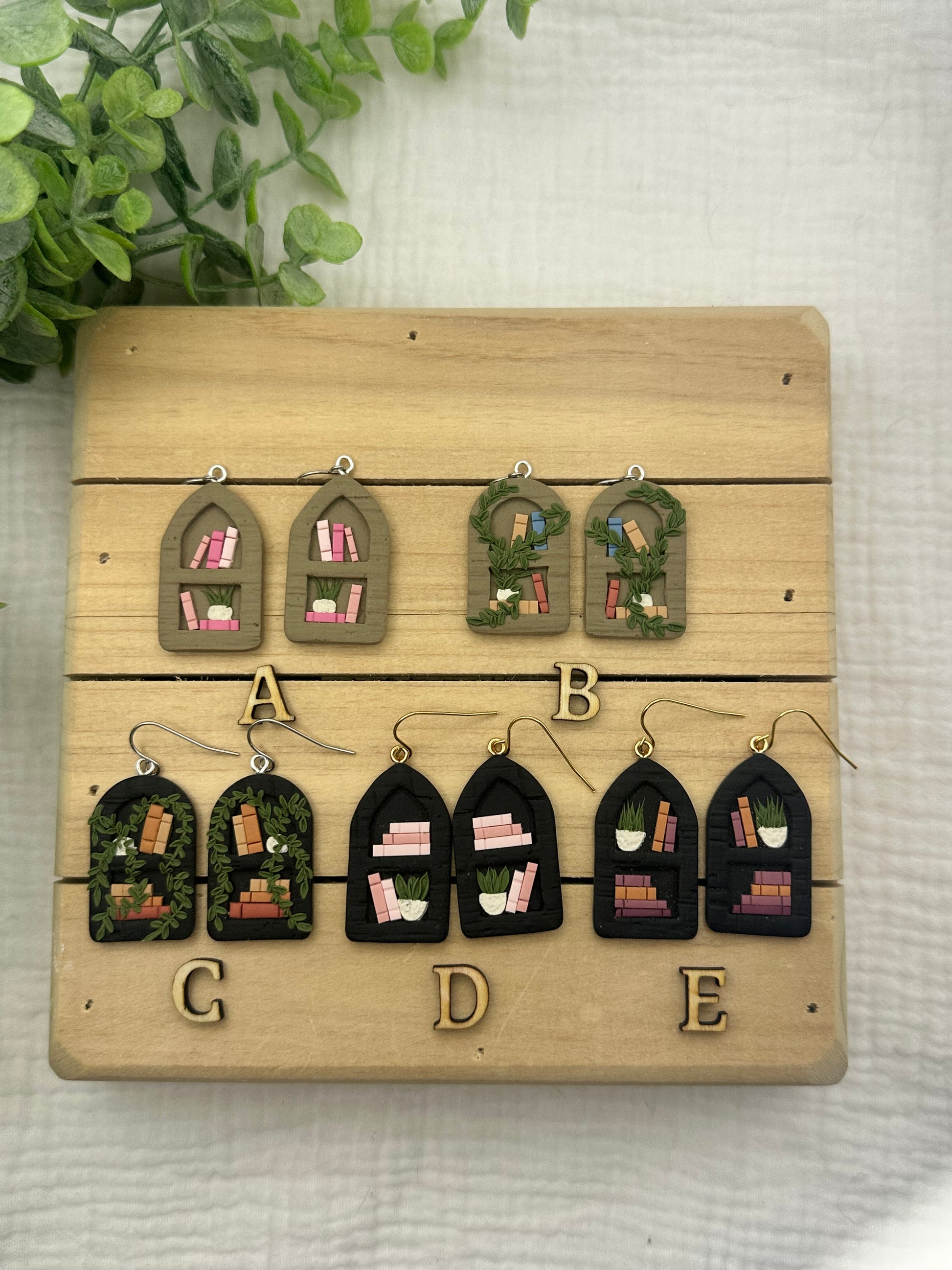Handmade polymer clay earrings. All on hypoallergenic surgical grade steel findings. Bookshelf earrings are handcrafted and either on surgical steel hooks or gold coated surgical steel hooks