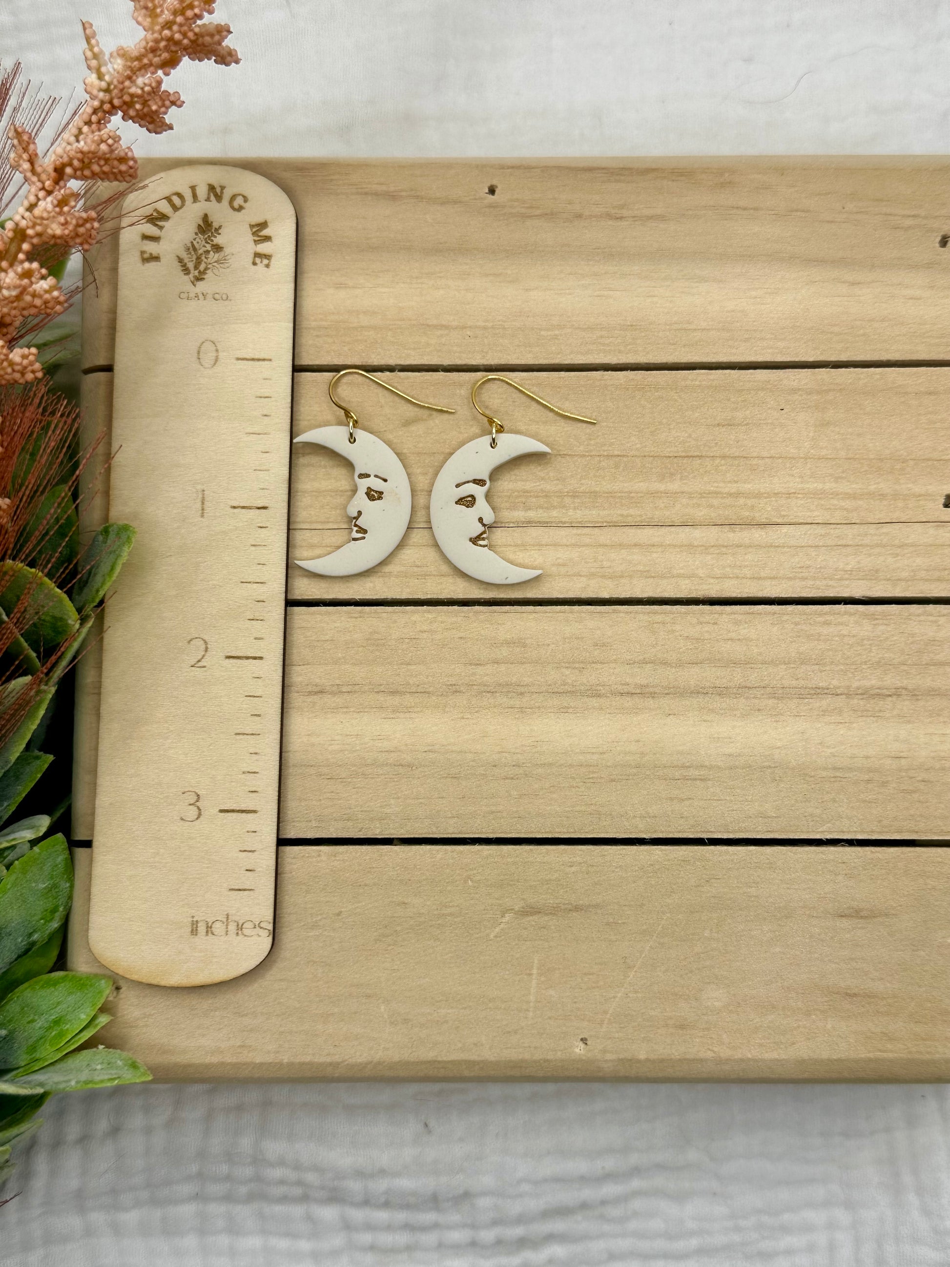 Handmade polymer clay earrings. All on hypoallergenic surgical grade steel findings. Celestial moon embossed with bronze on gold coated surgical steel hooks