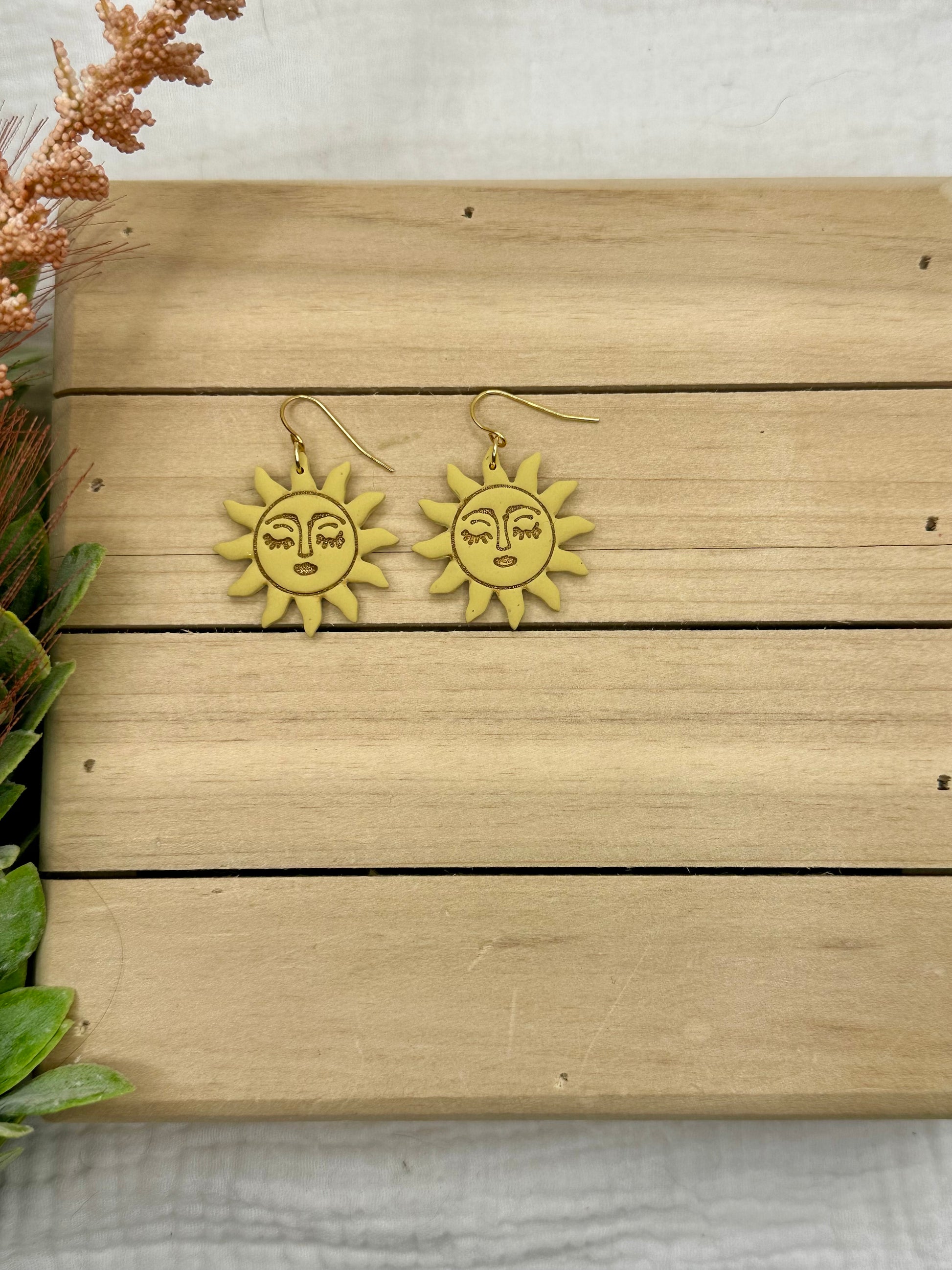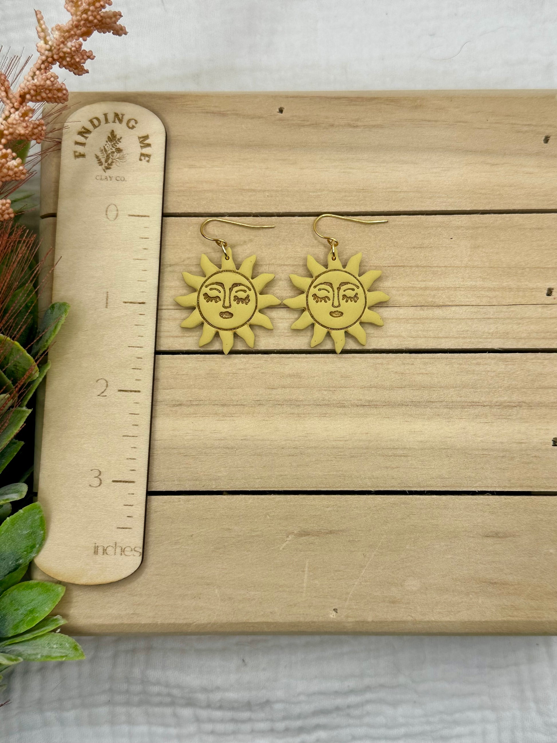 Handmade polymer clay earrings. All on hypoallergenic surgical grade steel findings. Celestial Sun embossed with bronze on gold coated surgical steel hooks