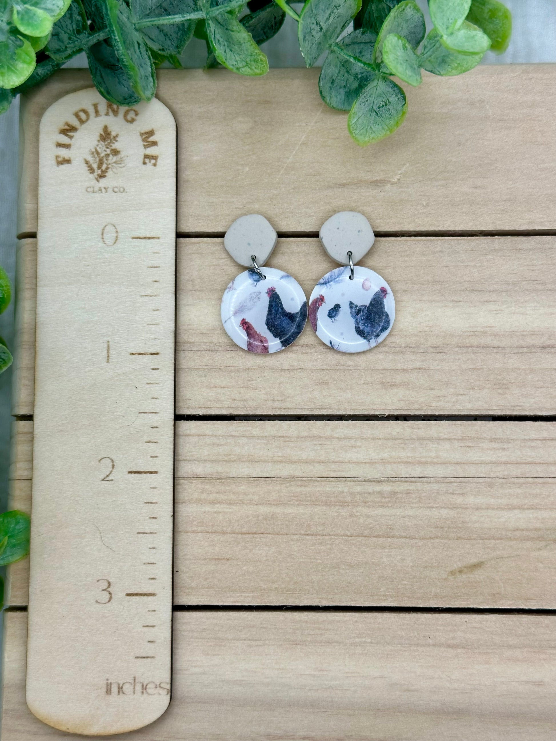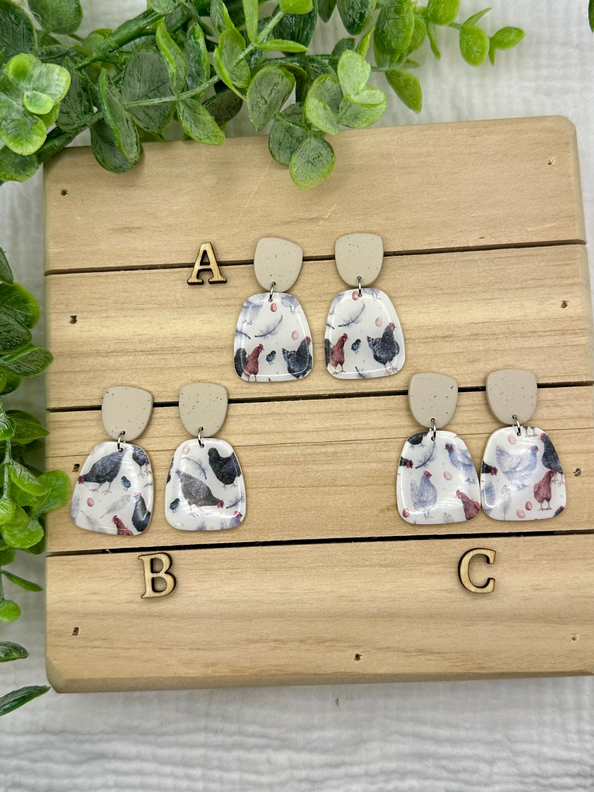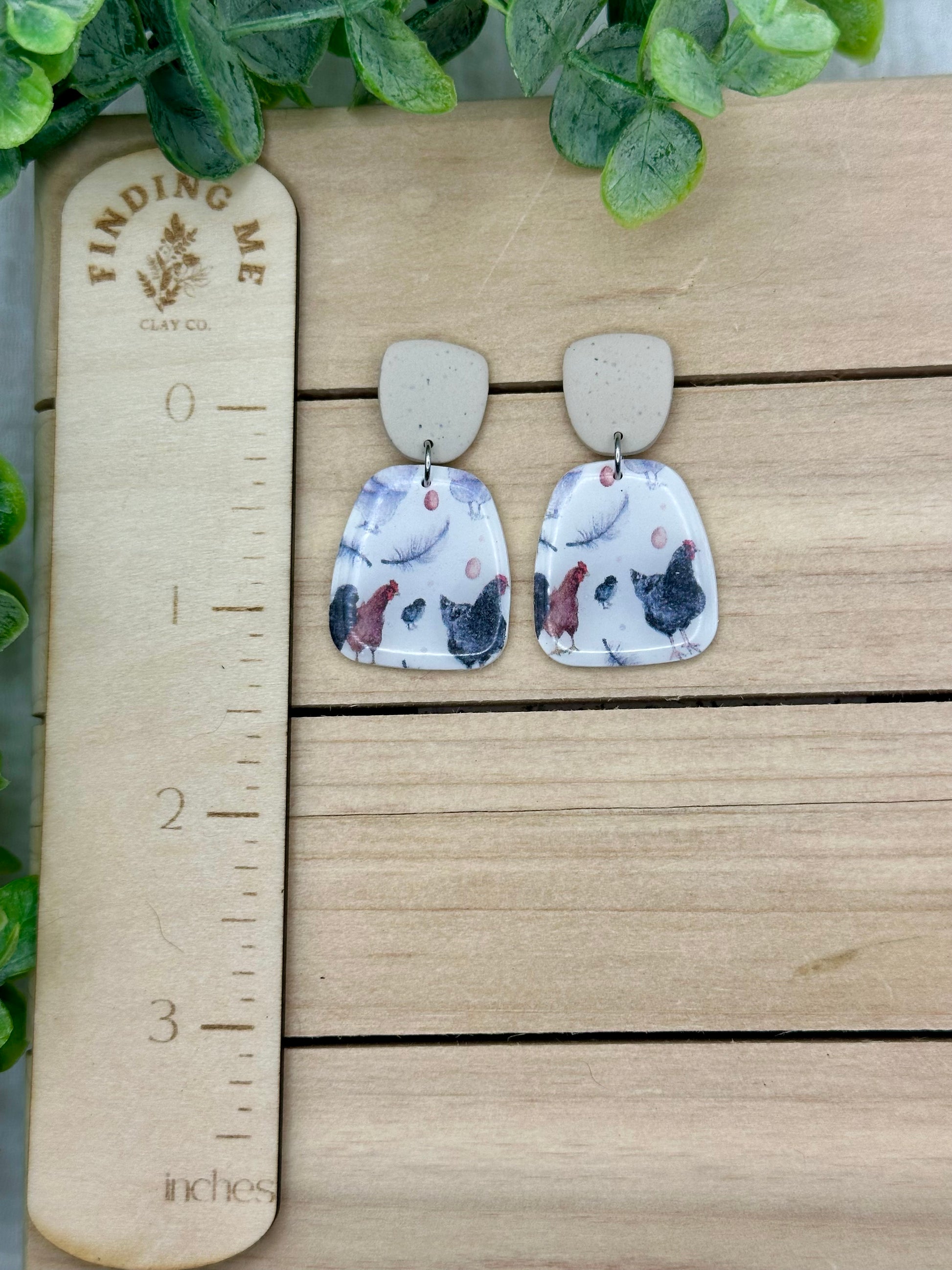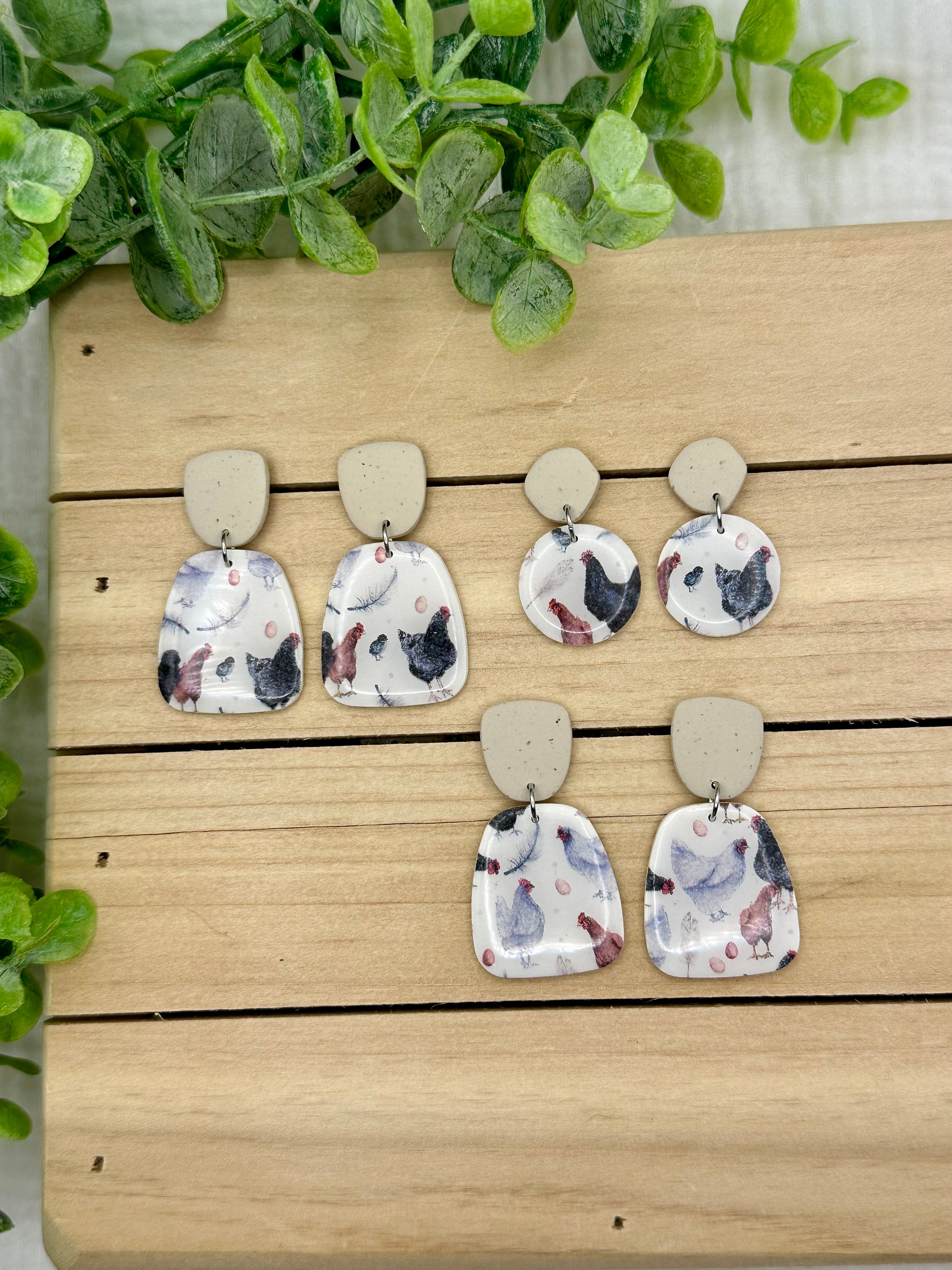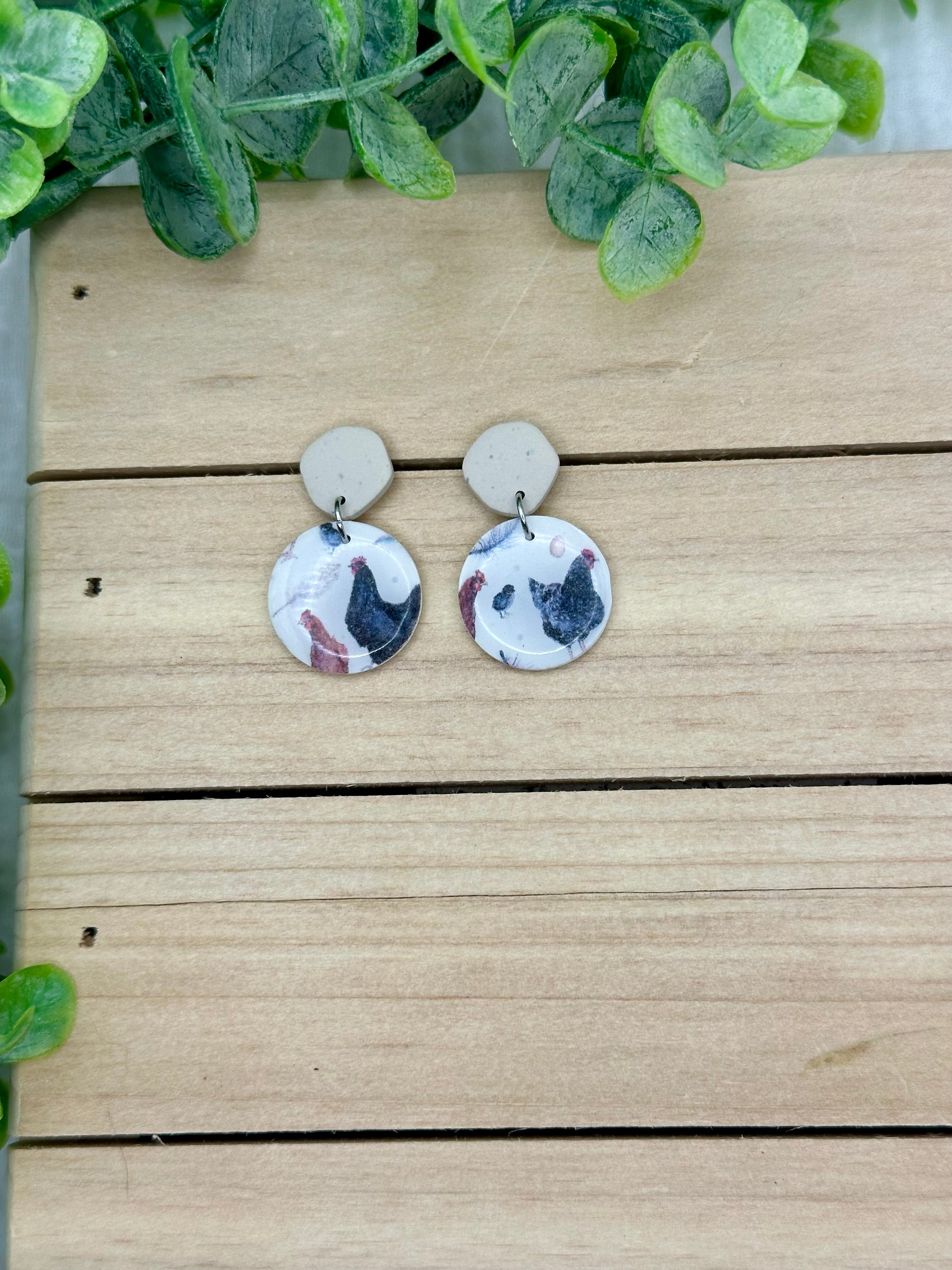 Handmade polymer clay earrings. All on hypoallergenic surgical grade steel findings. The sweetest chicken print with speckled brown tops
