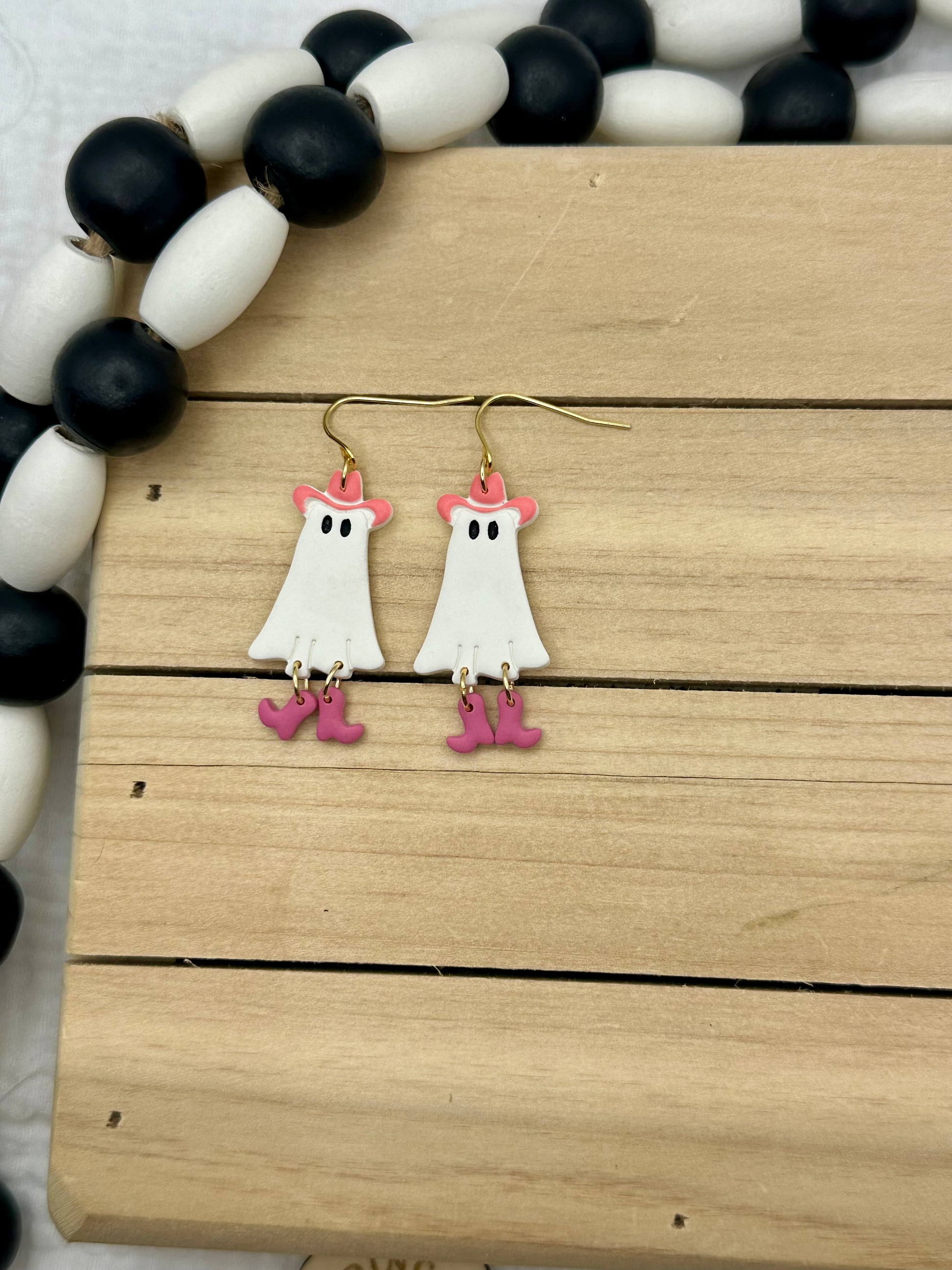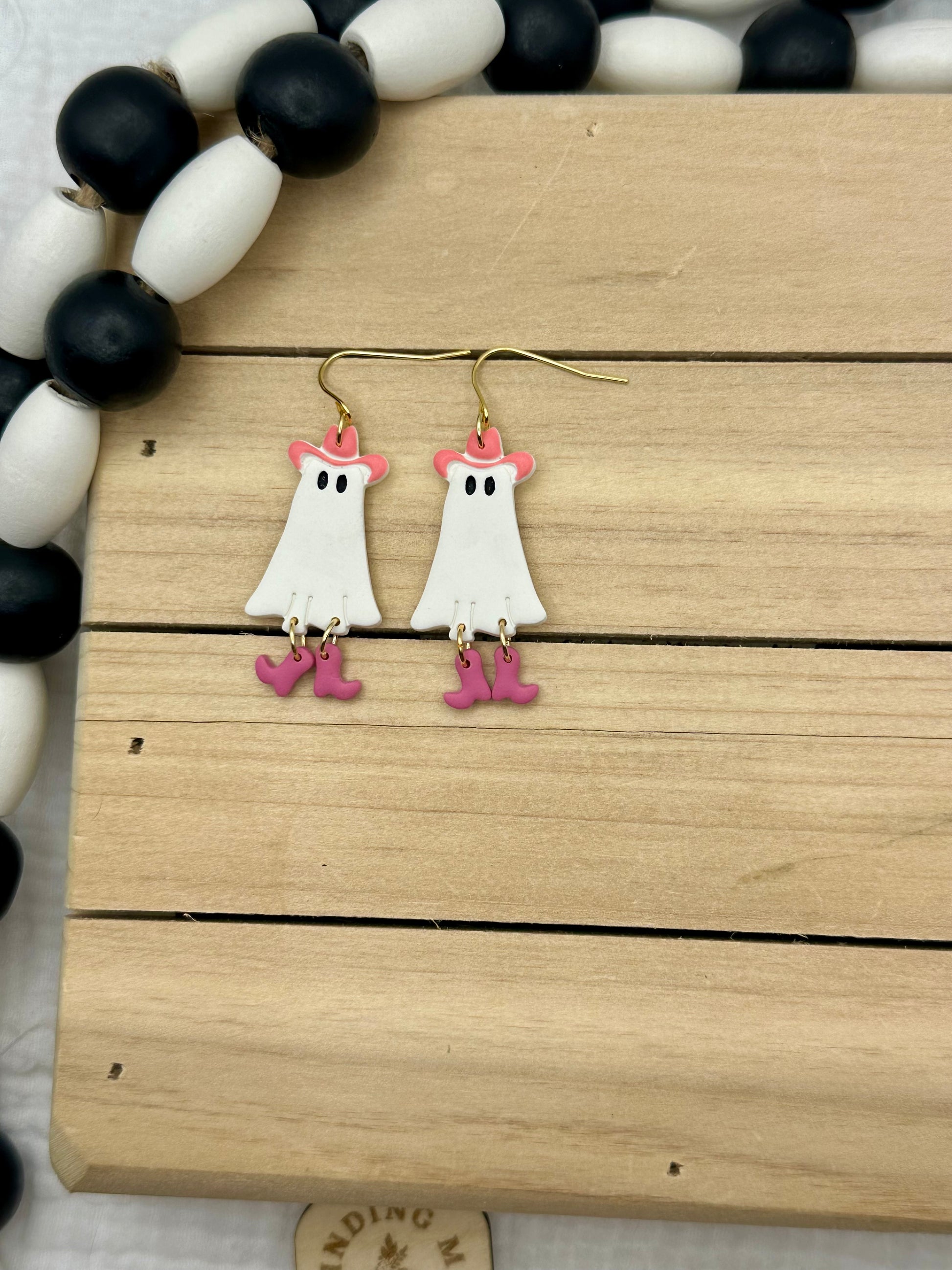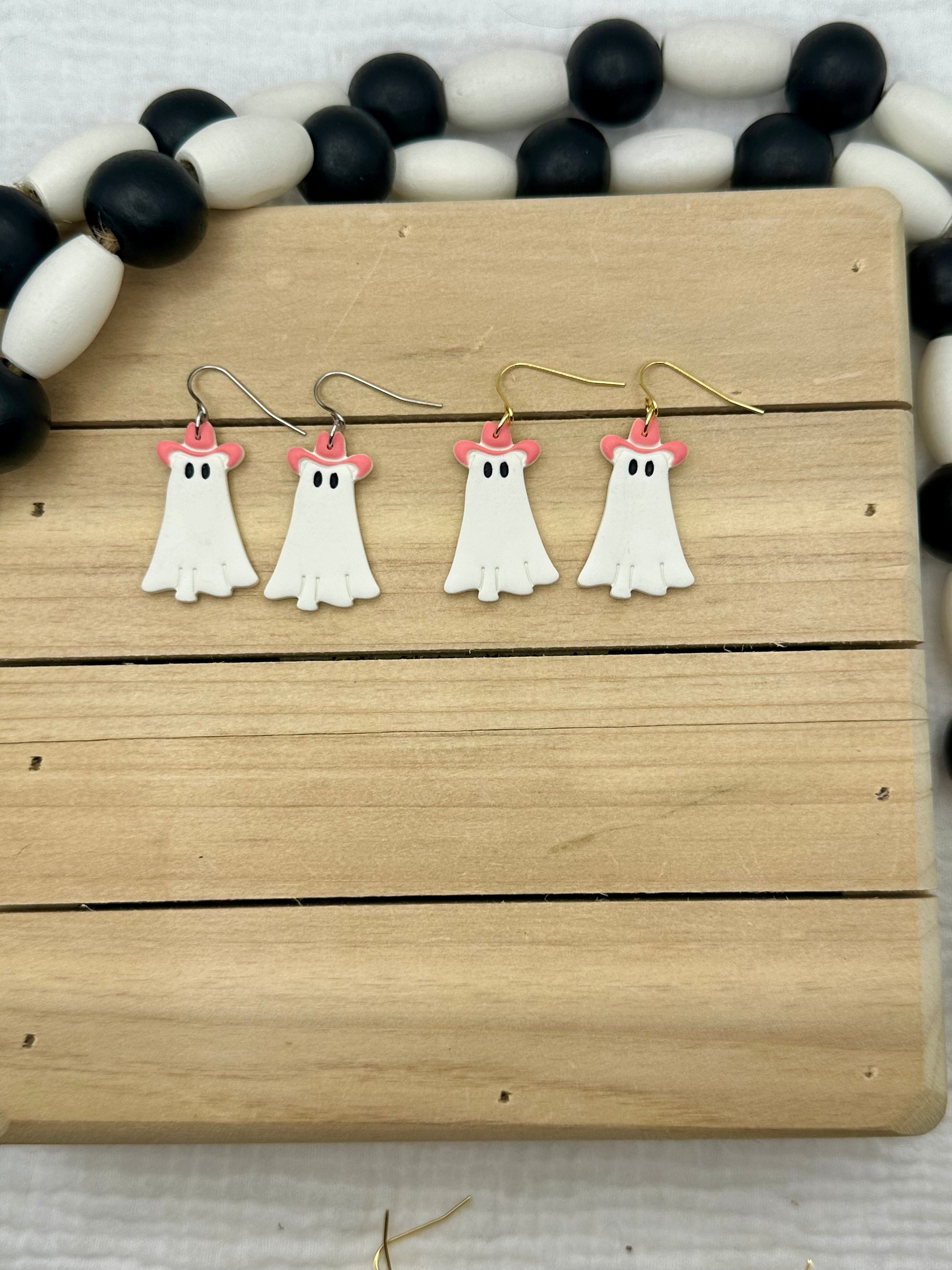 Handmade polymer clay earrings. All on hypoallergenic surgical grade steel findings. Cowboy ghosts available in pink and brown and with or without boots