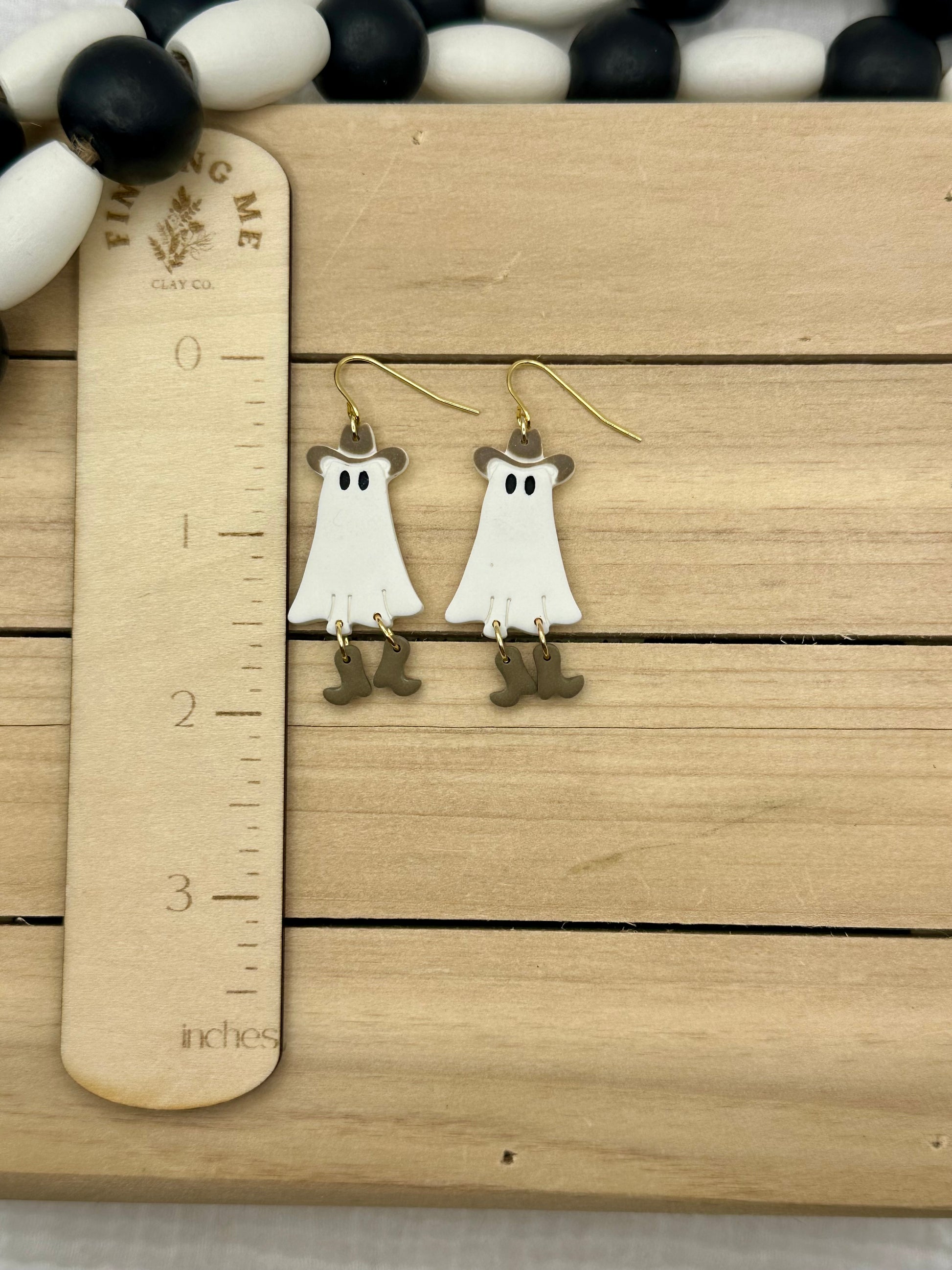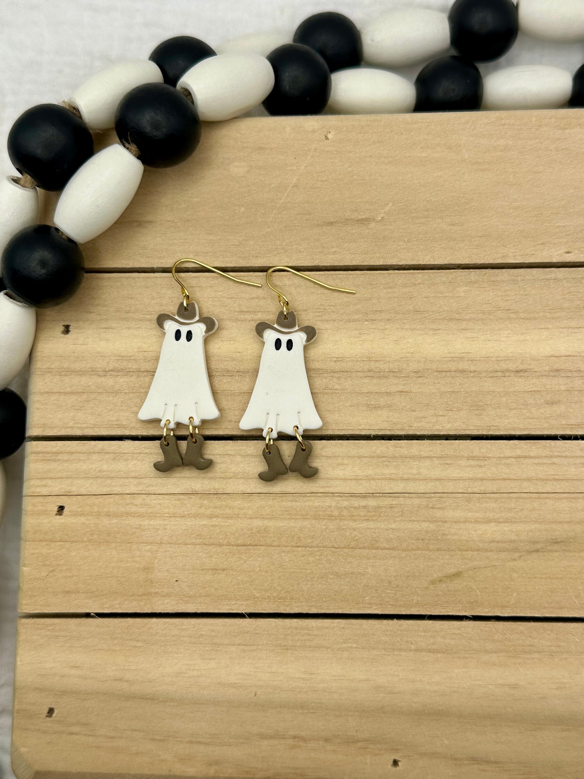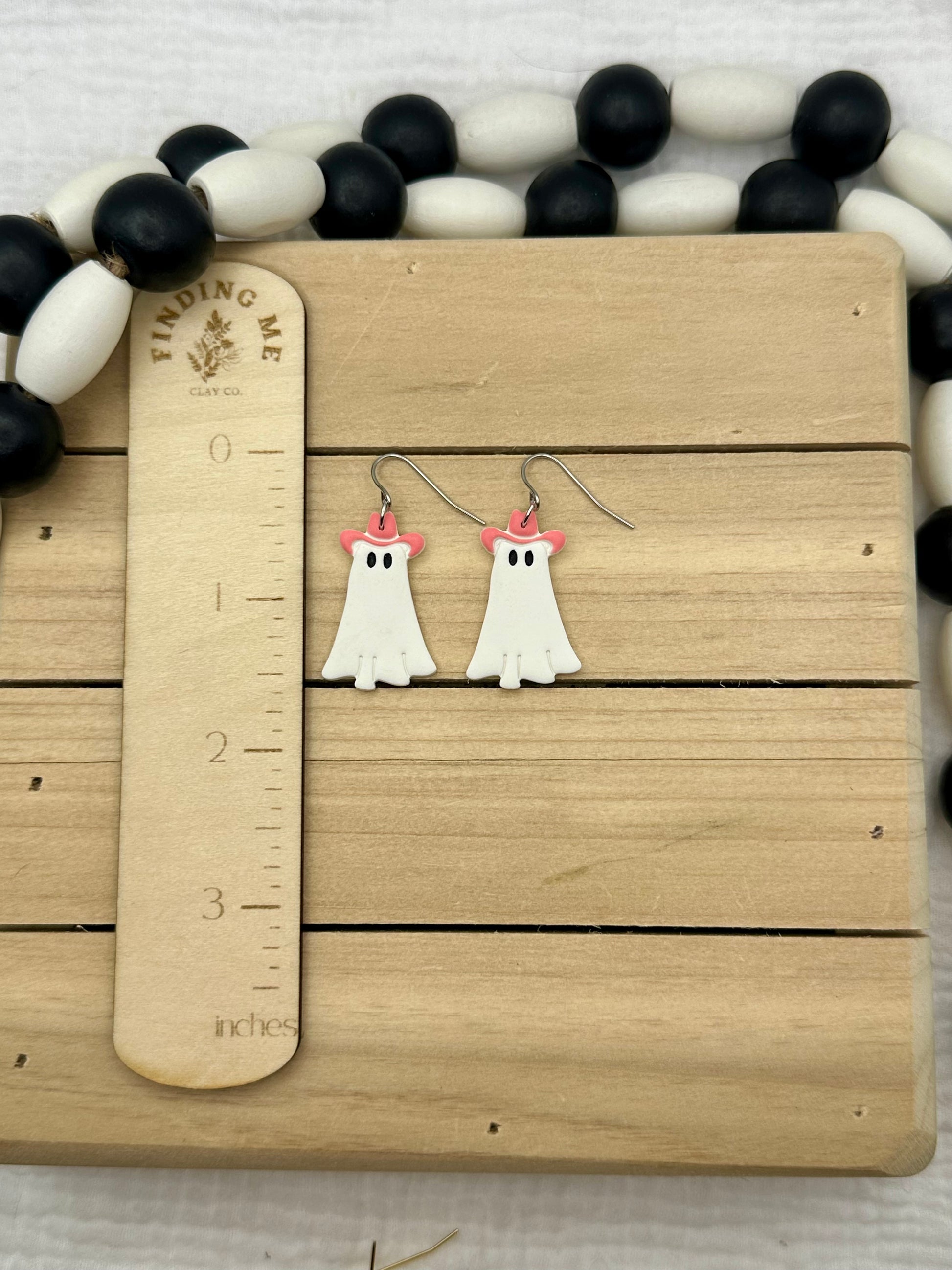 Handmade polymer clay earrings. All on hypoallergenic surgical grade steel findings. Cowboy ghosts available in pink and brown and with or without boots