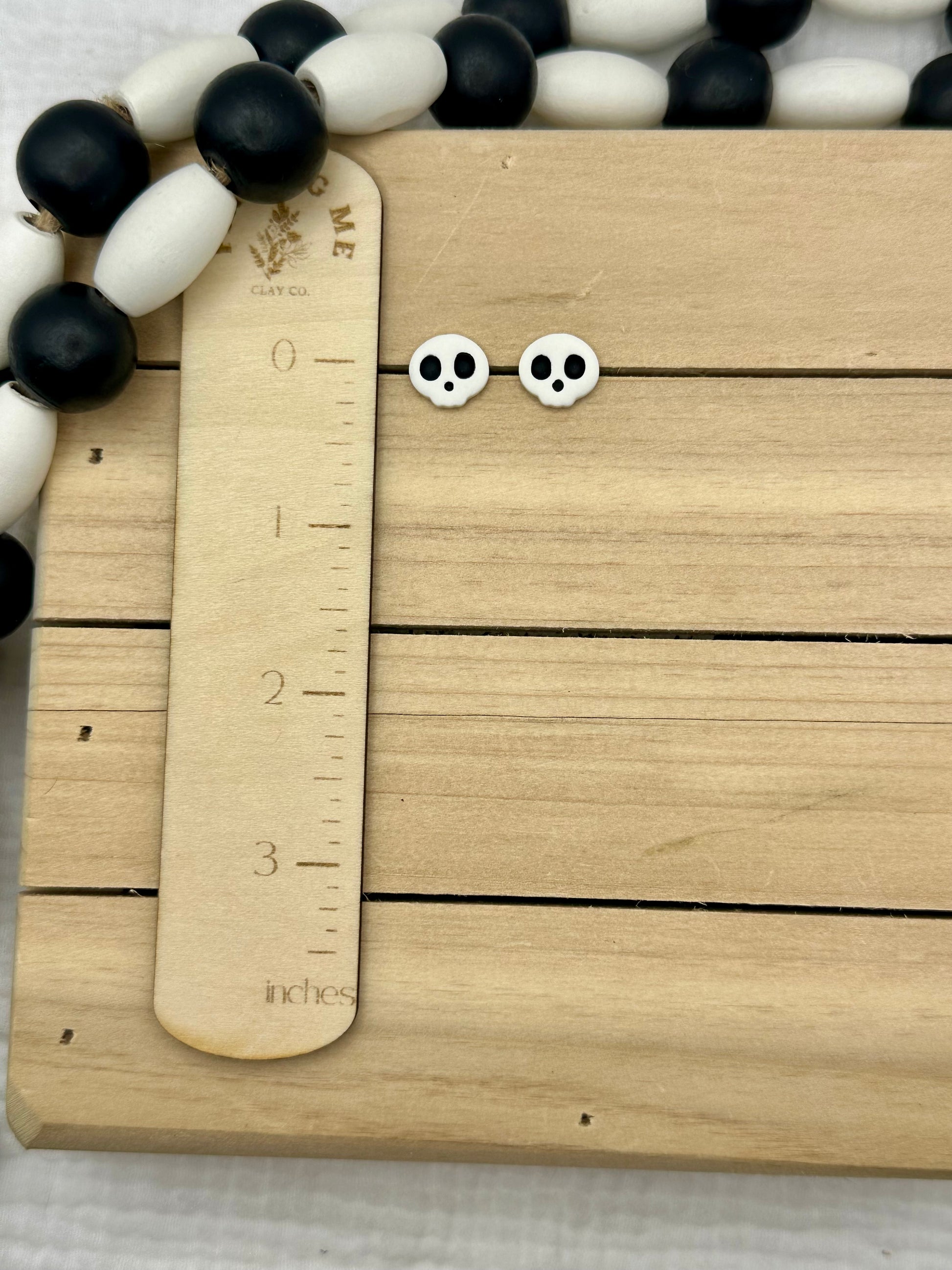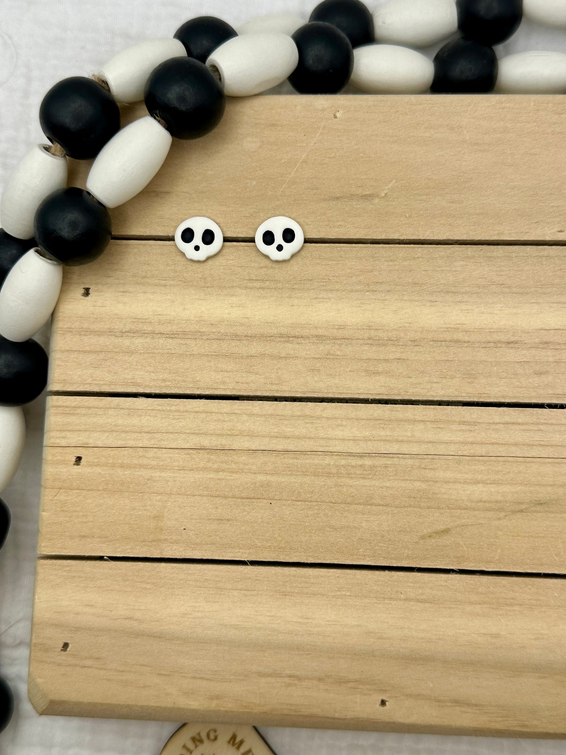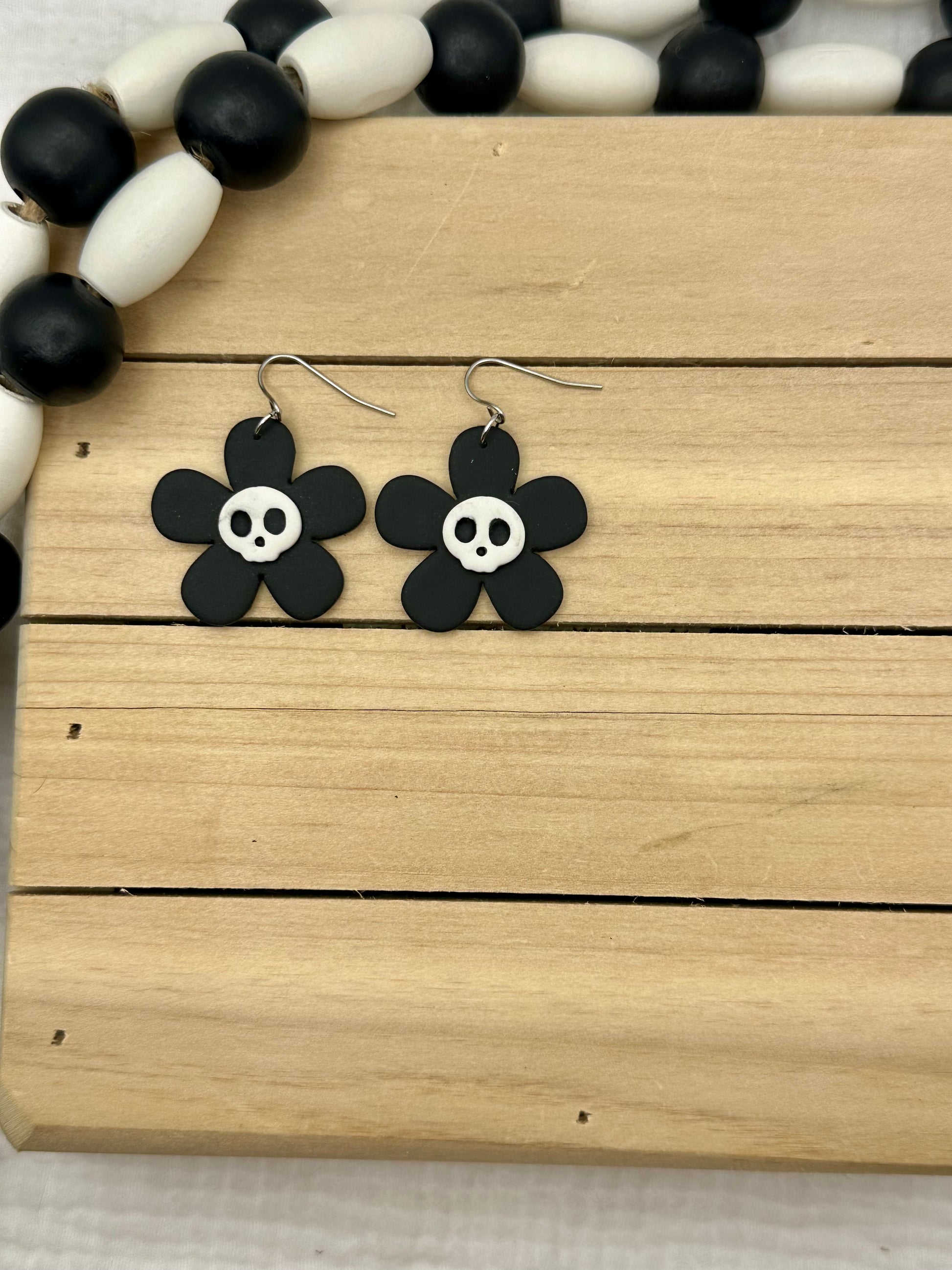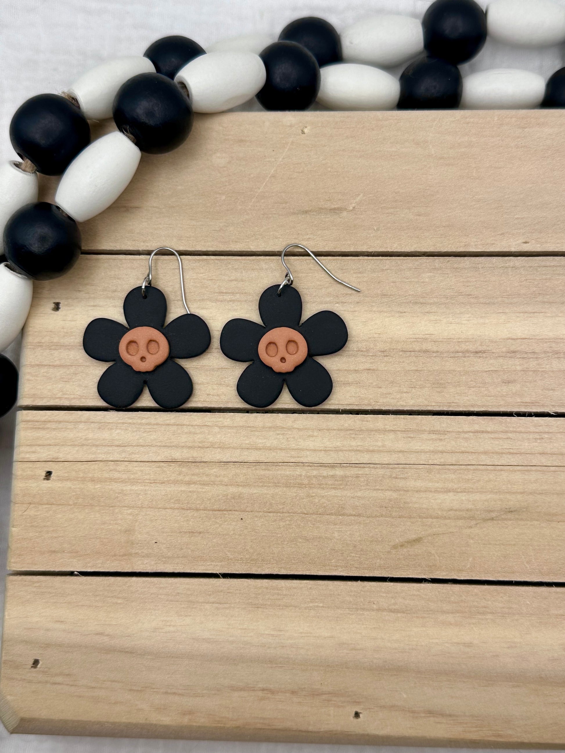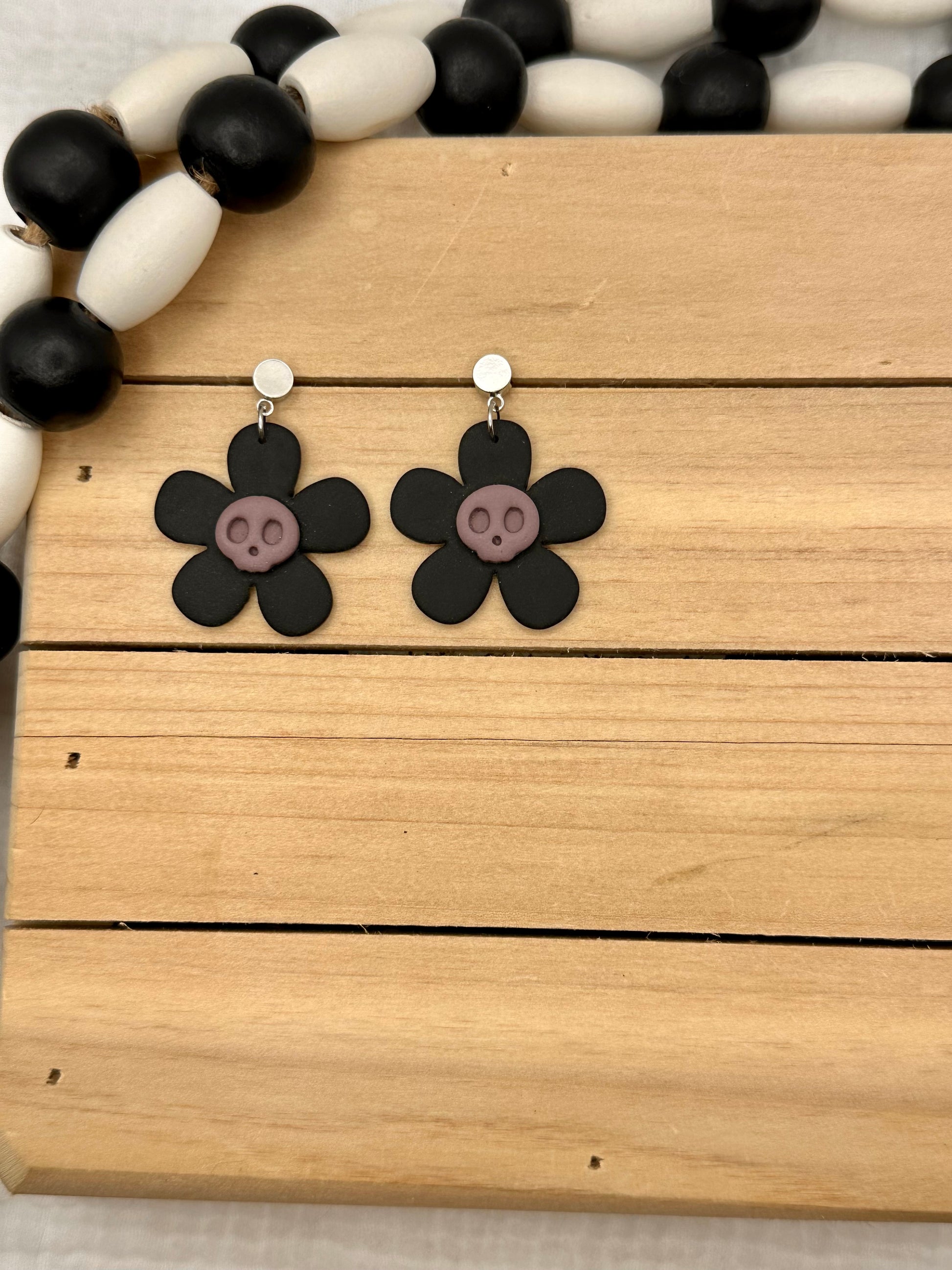 Handmade polymer clay earrings. All on hypoallergenic surgical grade steel findings. Daisy Skulls in Black and white, orange and purple
