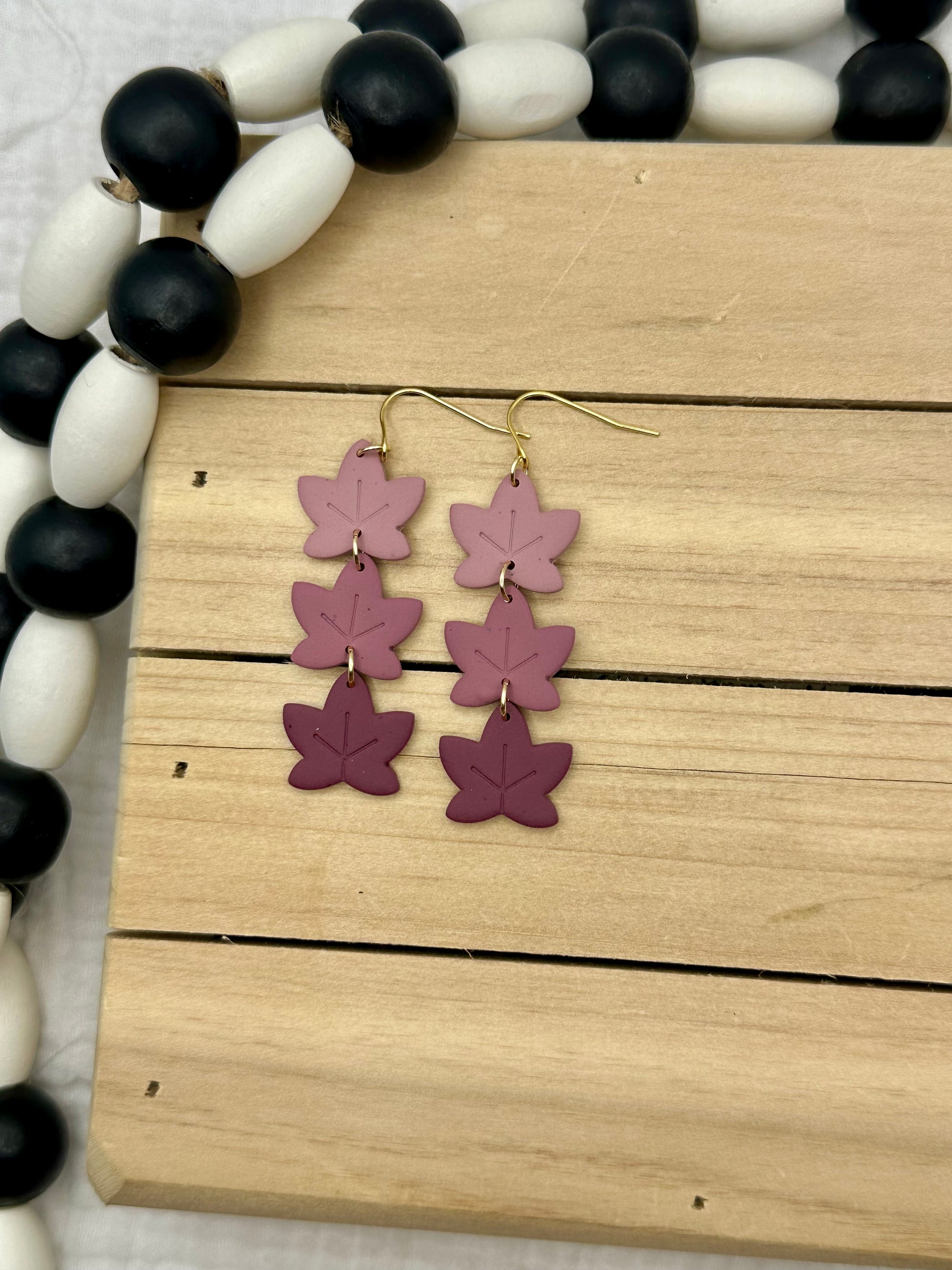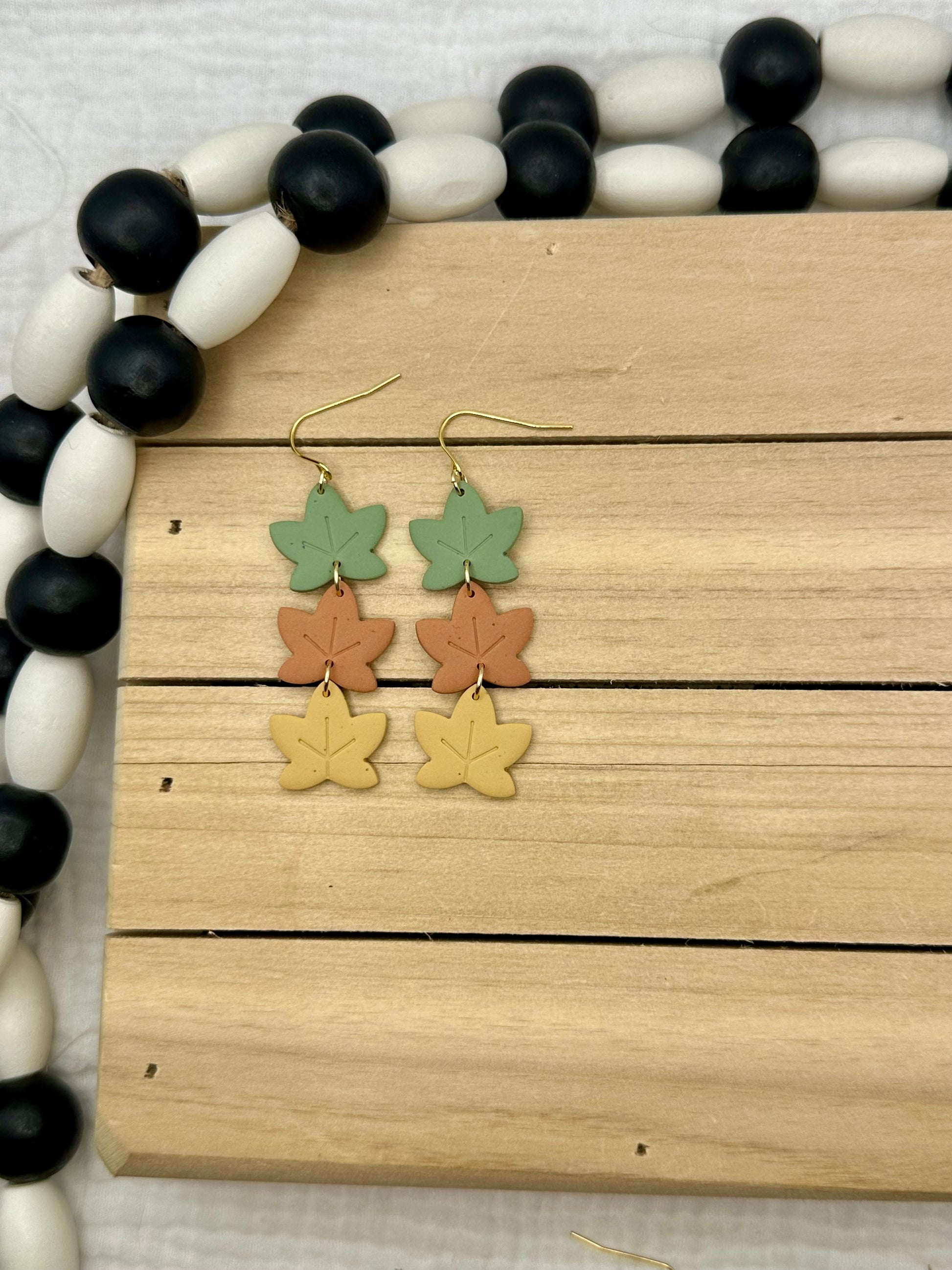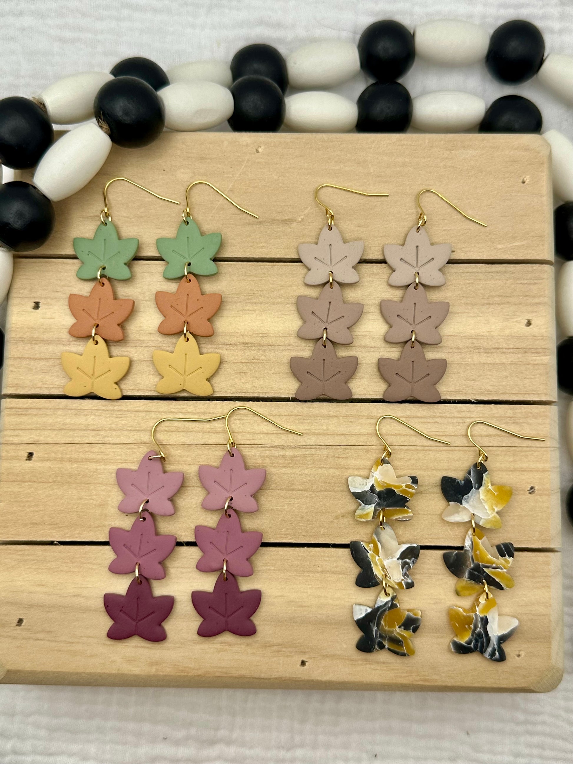 Handmade polymer clay earrings. All on hypoallergenic surgical grade steel findings. Fall leaf drops in various colors on gold coated hooks