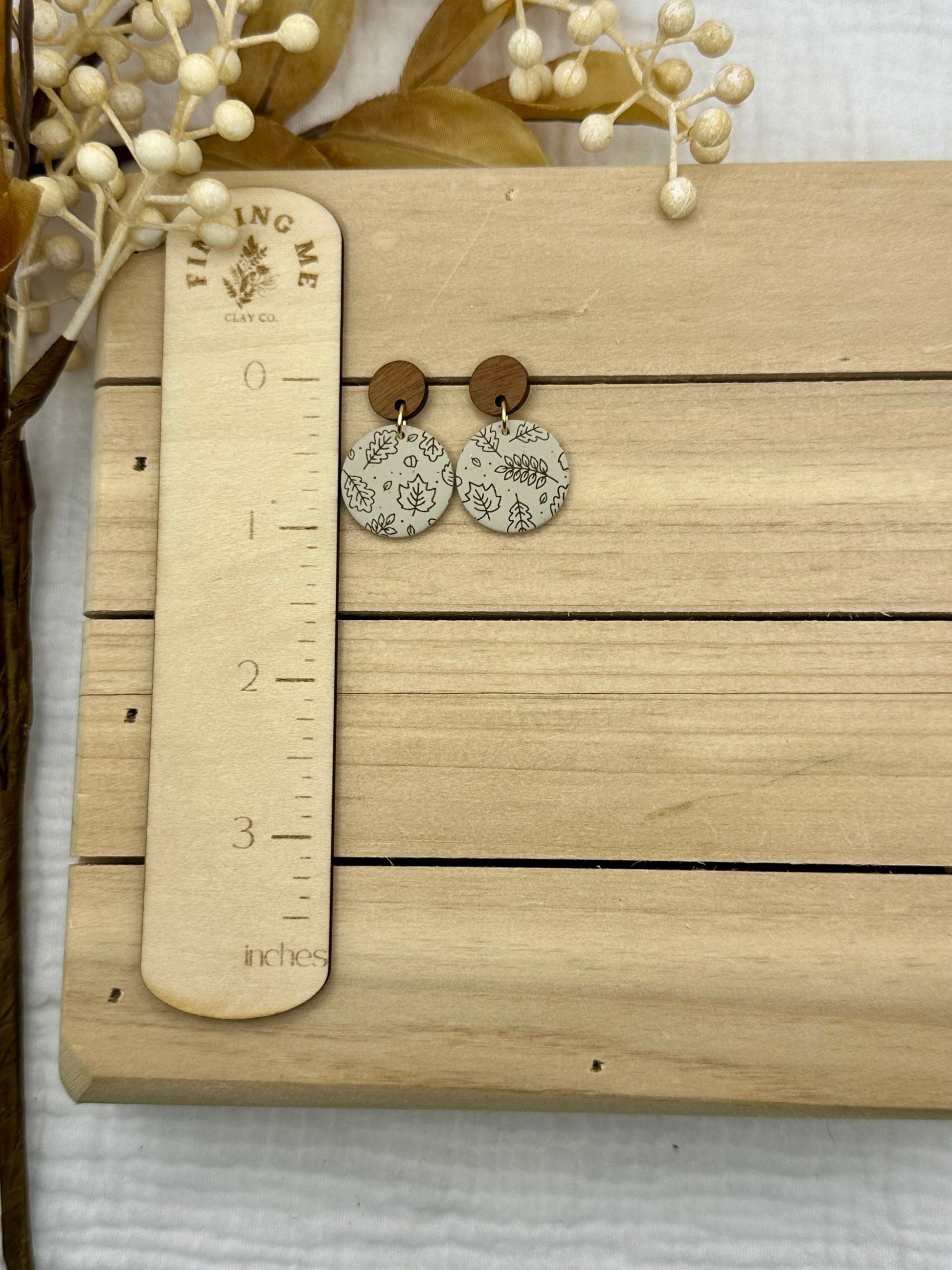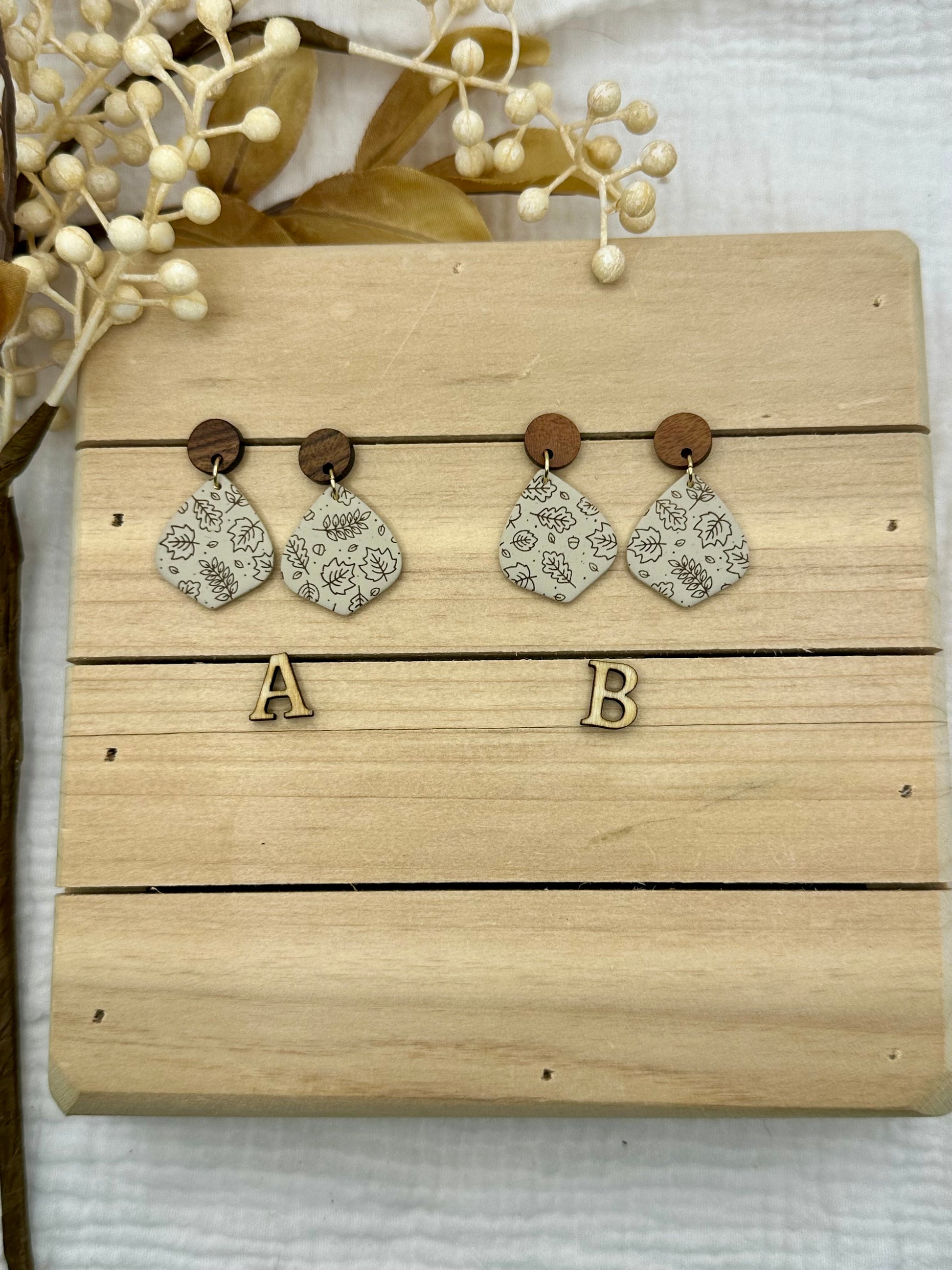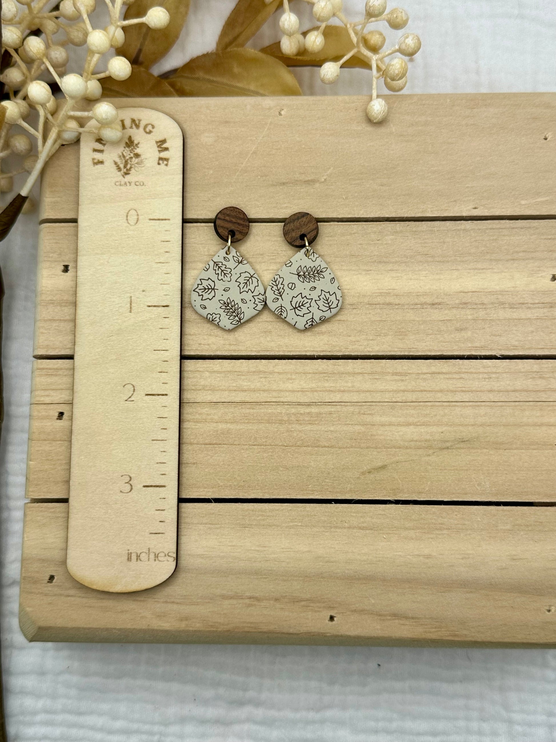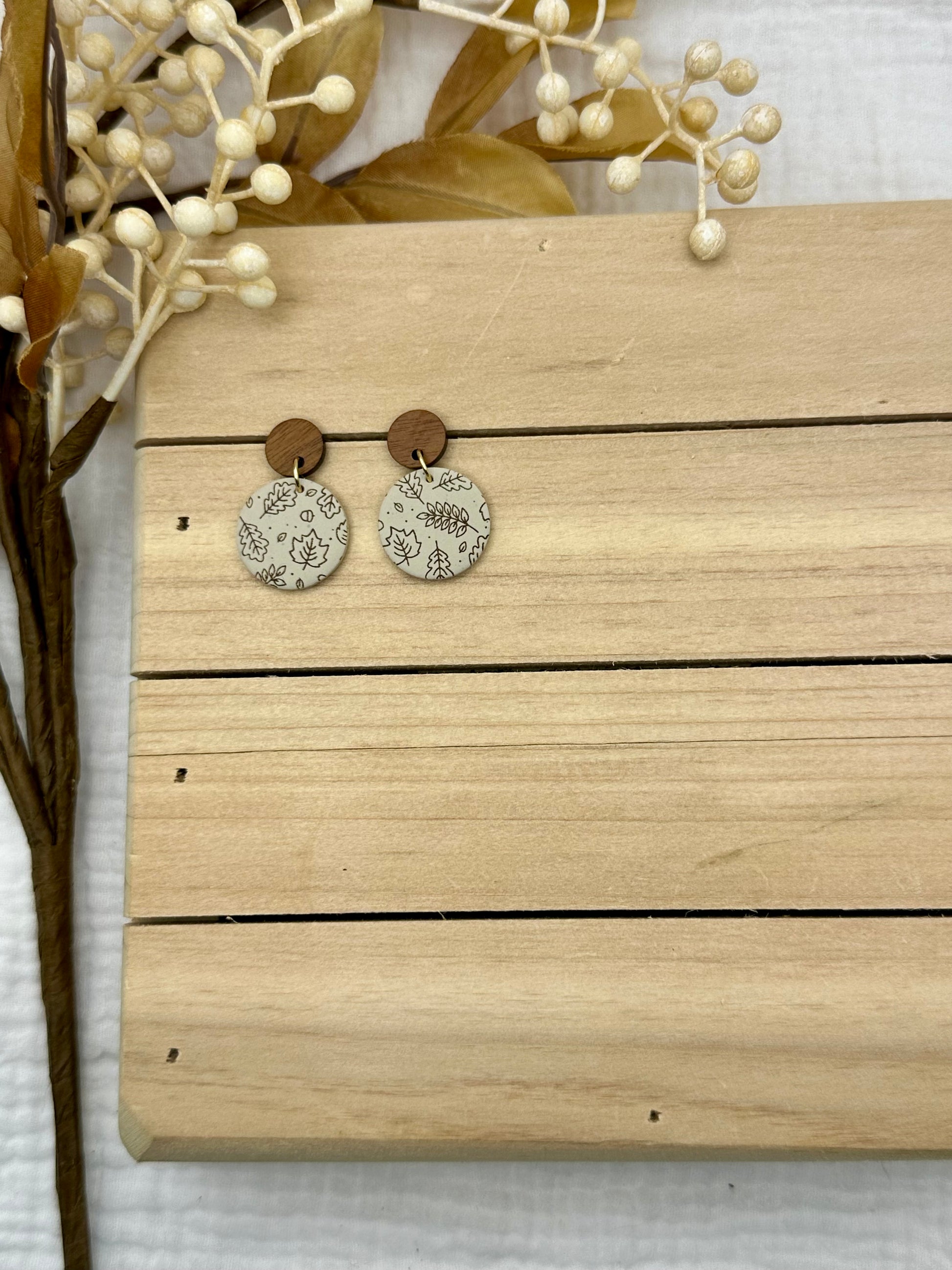 Handmade polymer clay earrings. All on hypoallergenic surgical grade steel findings. Falling leaf print on tan and wooden stud tops