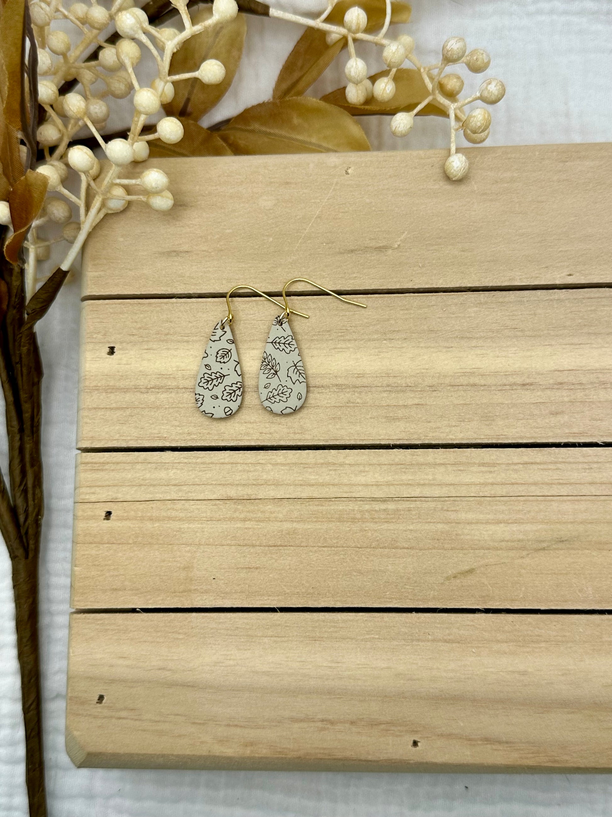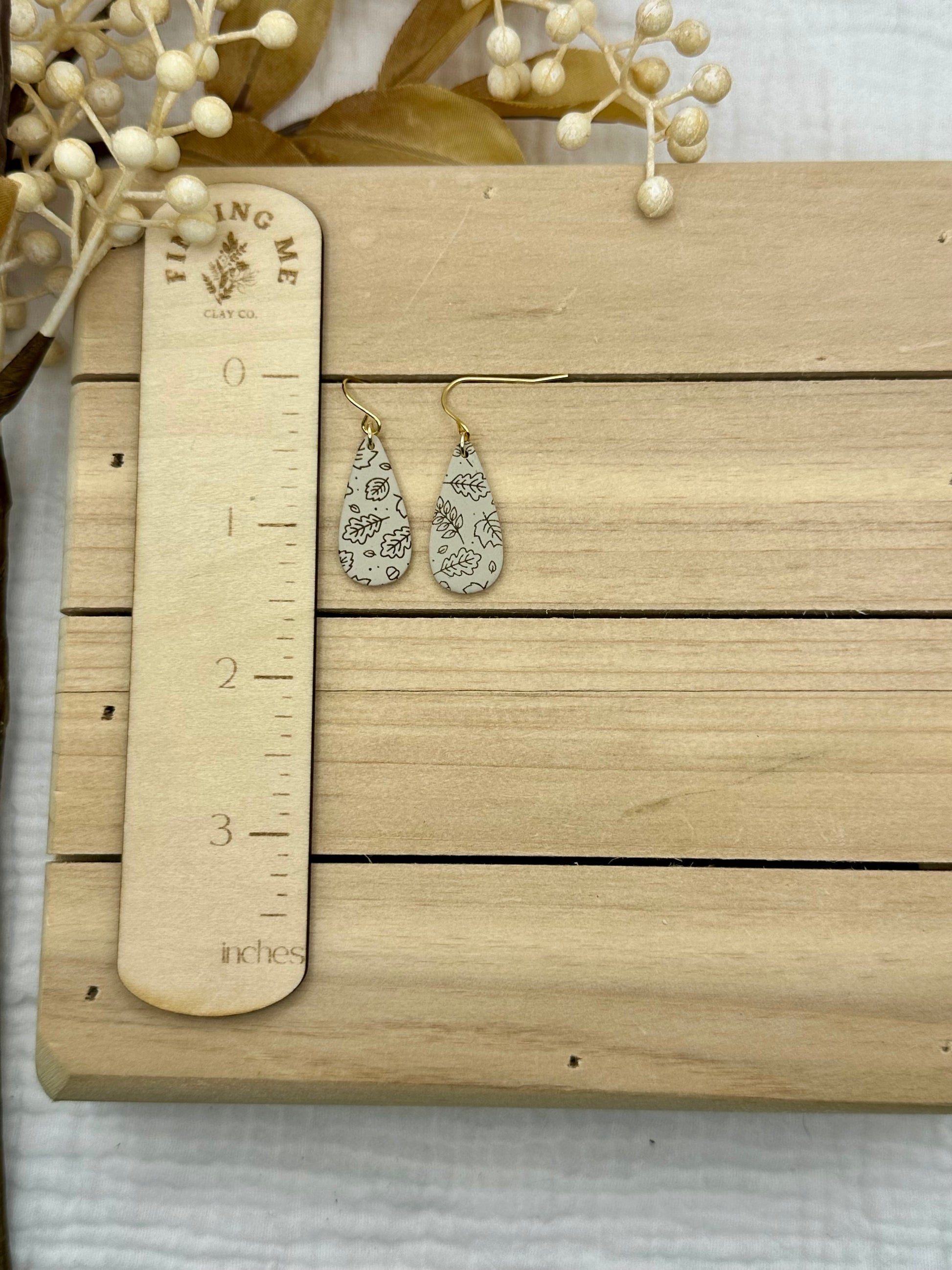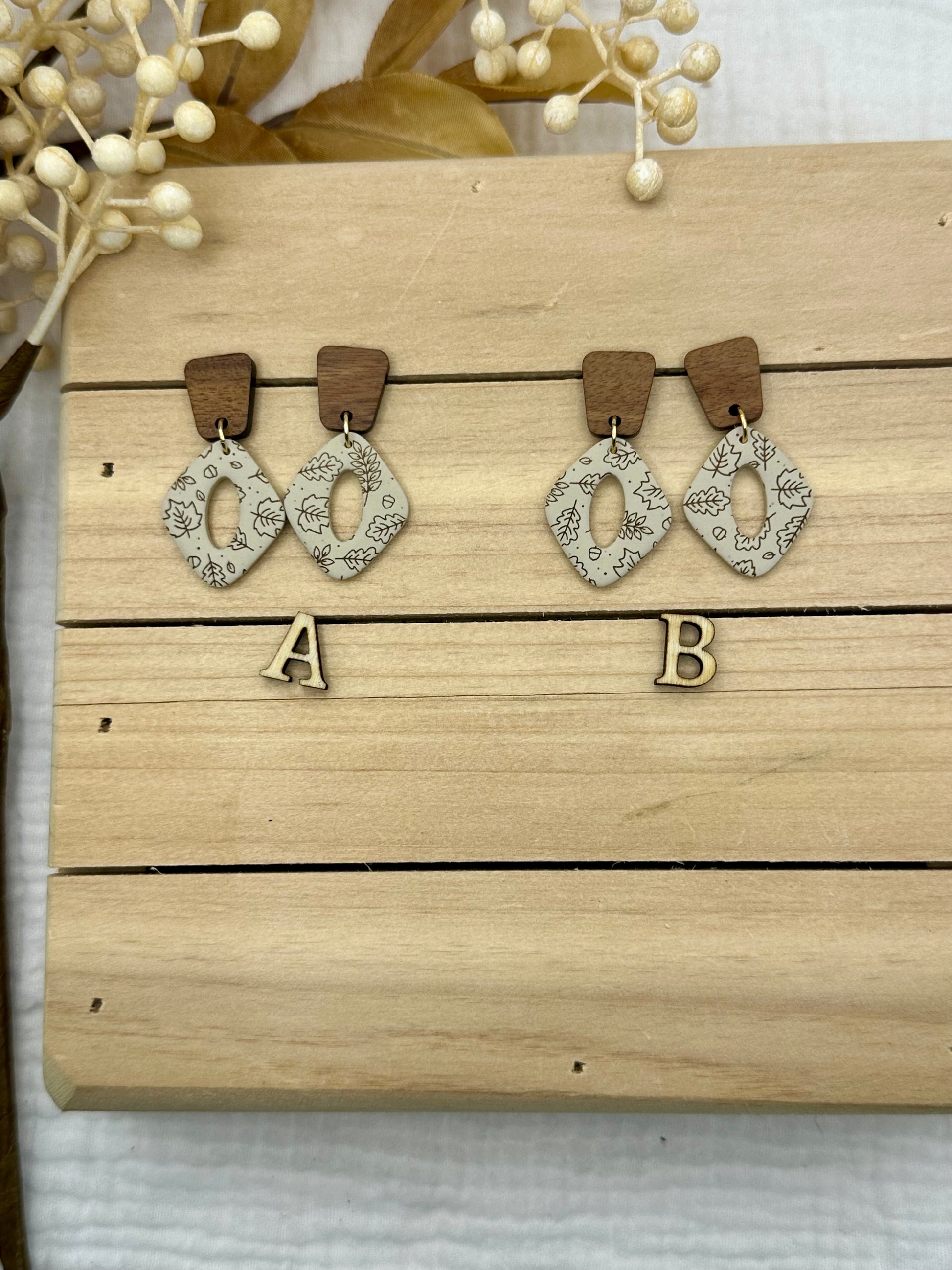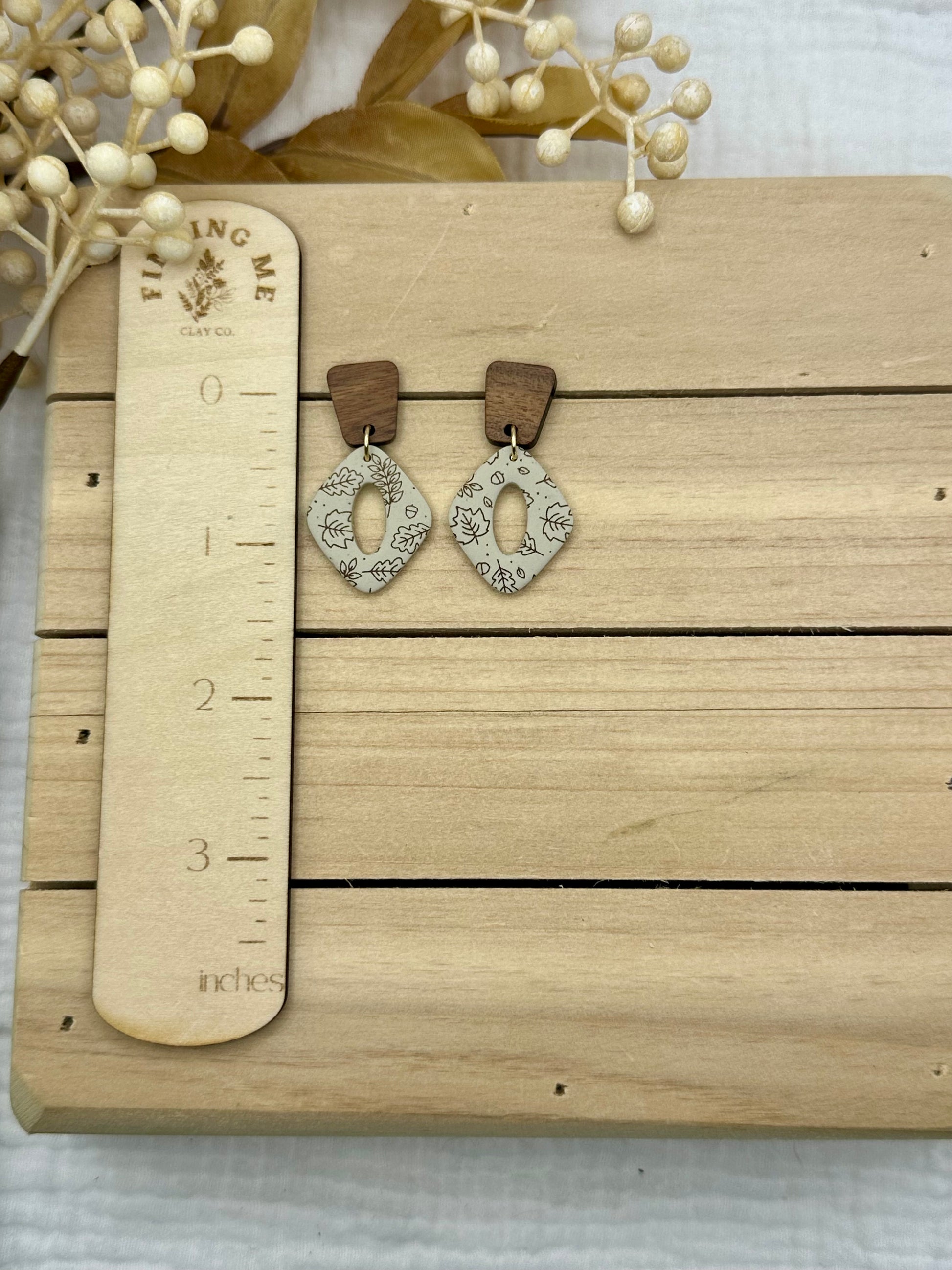 Handmade polymer clay earrings. All on hypoallergenic surgical grade steel findings. Falling leaf print on tan and wooden stud tops