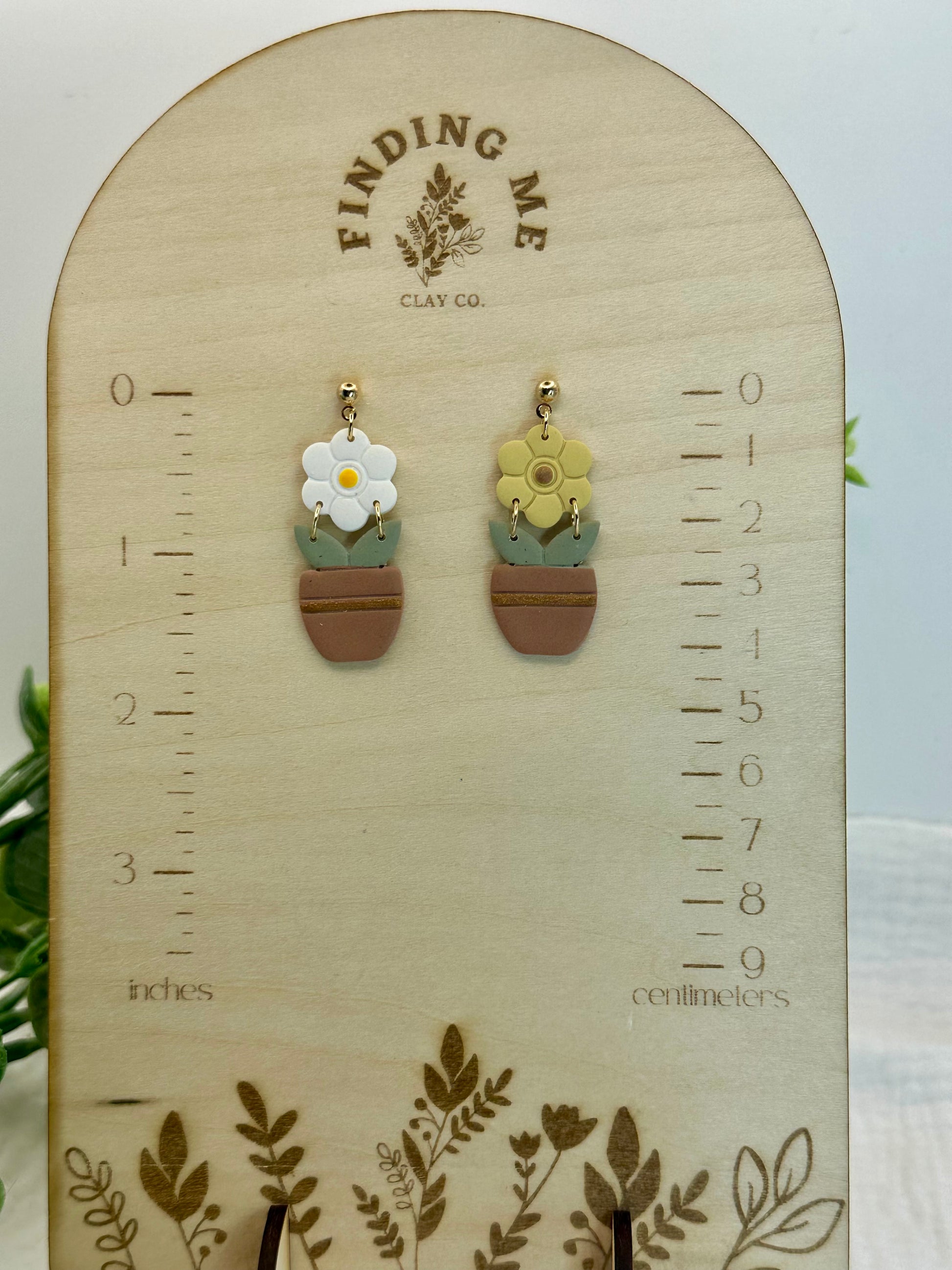 Handmade polymer clay earrings. All on hypoallergenic surgical grade steel findings. White and yellow flowers in pots on Gold coated ball post