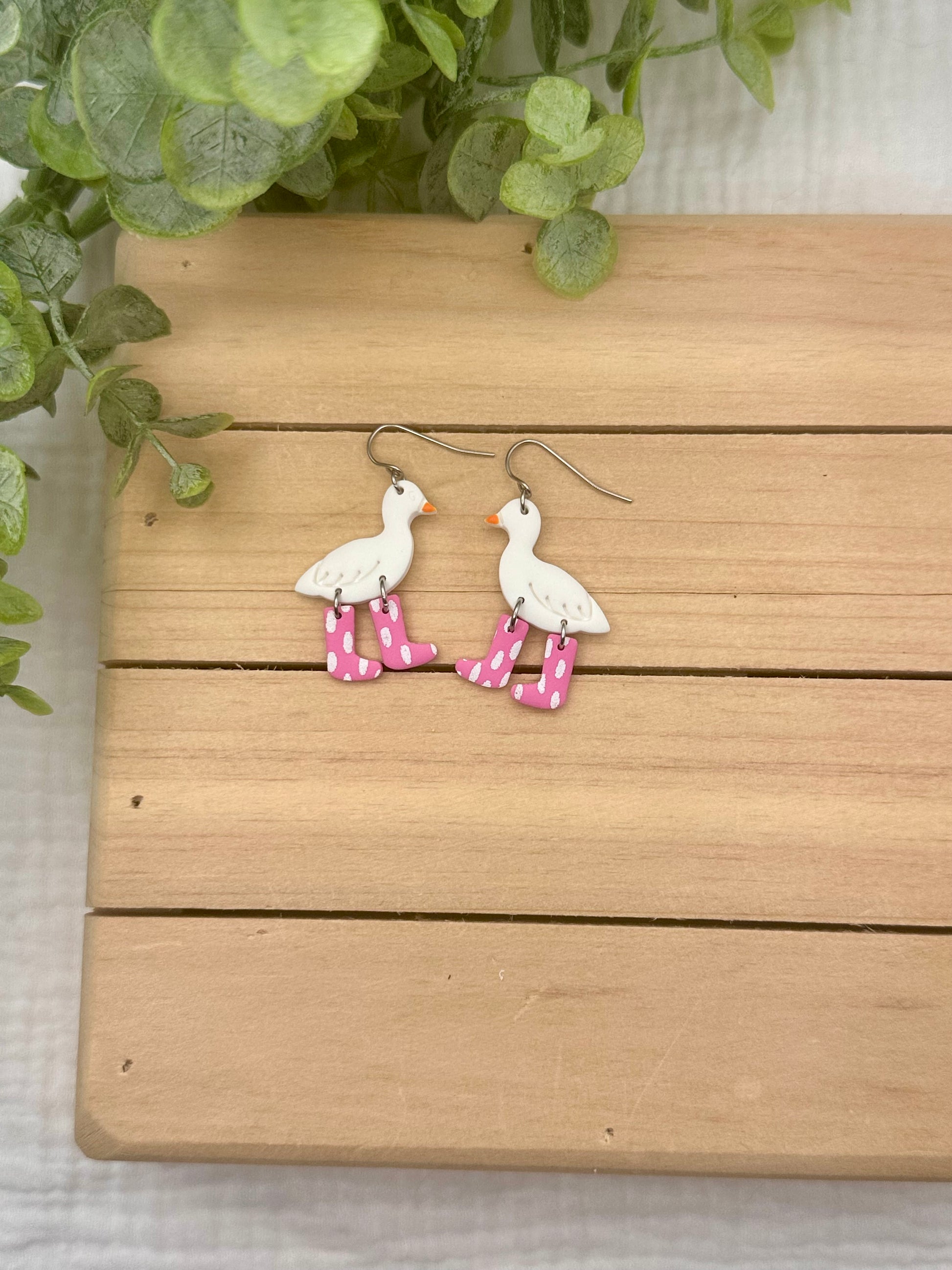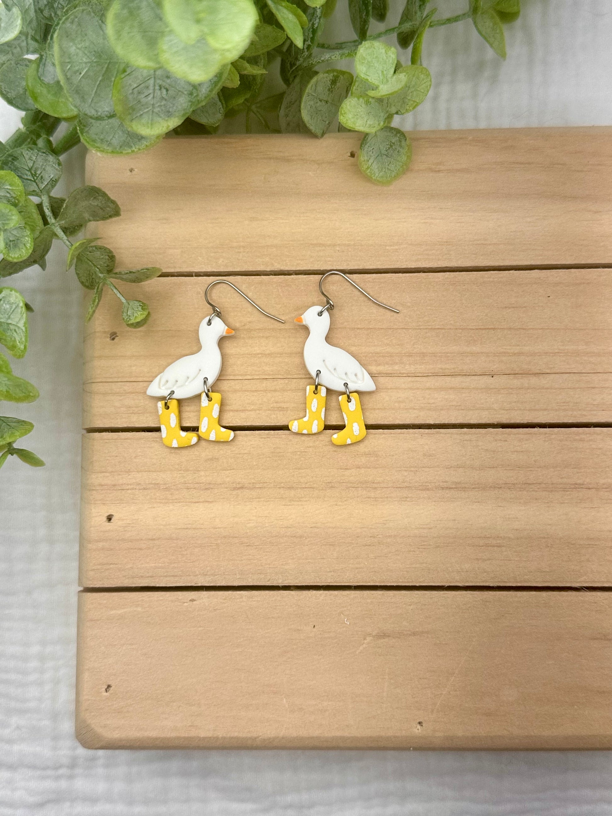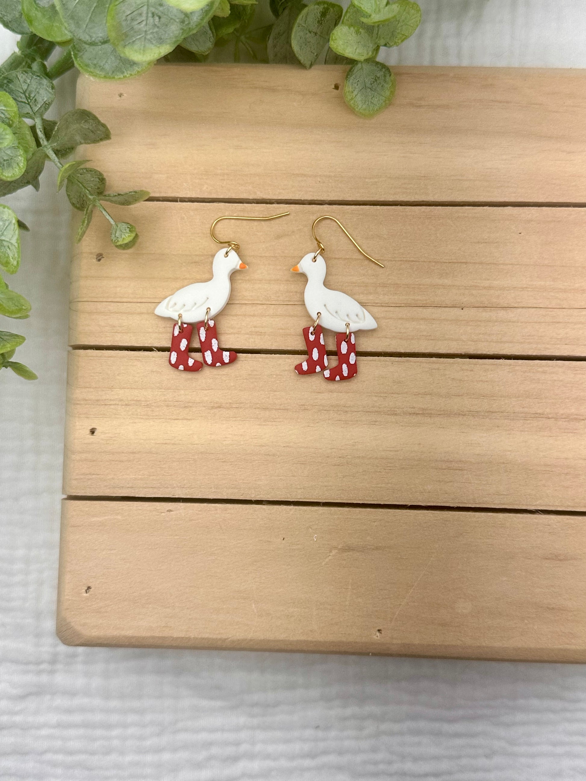 Handmade polymer clay earrings. All on hypoallergenic surgical grade steel findings. Goose in boots with different boots