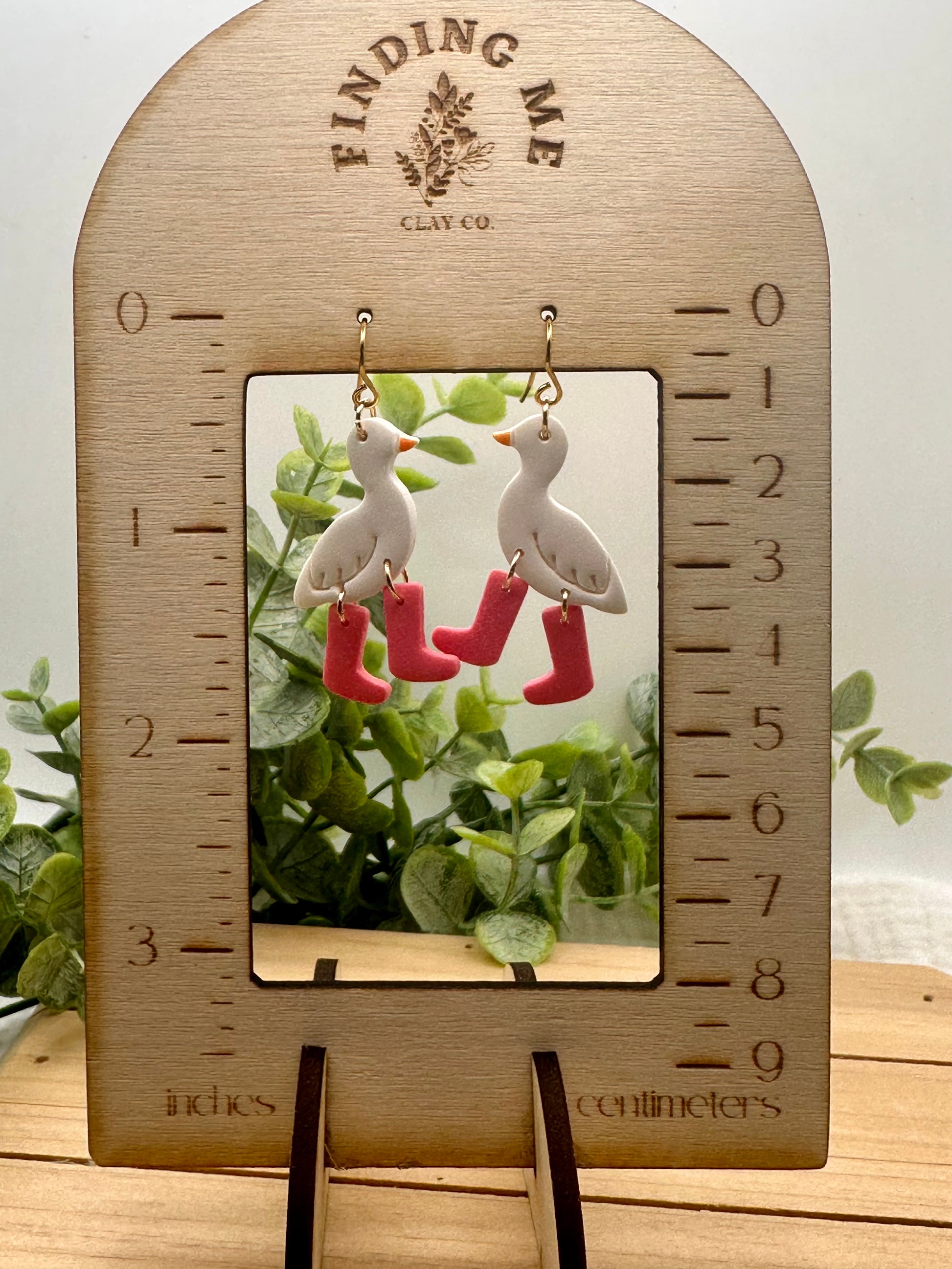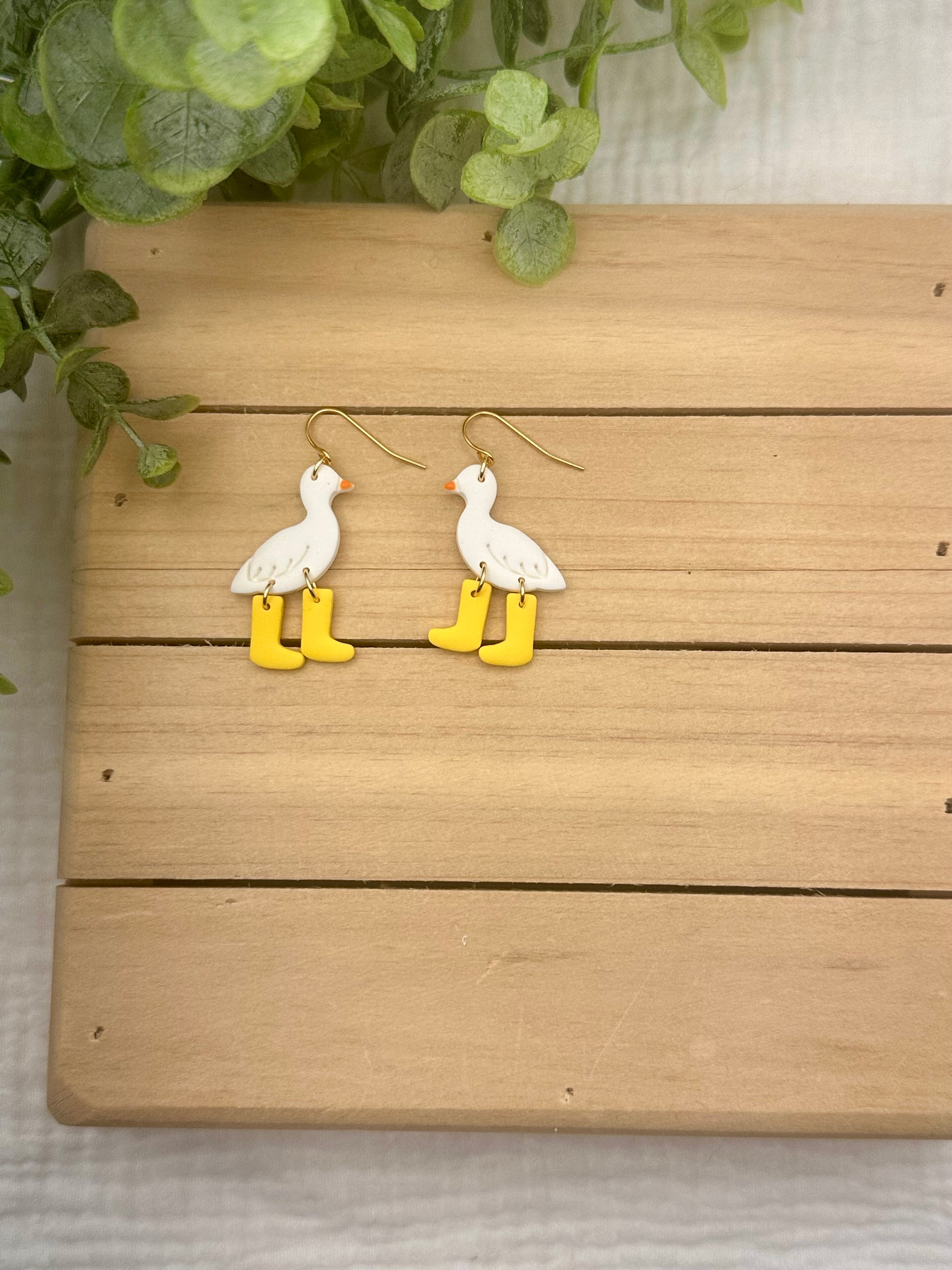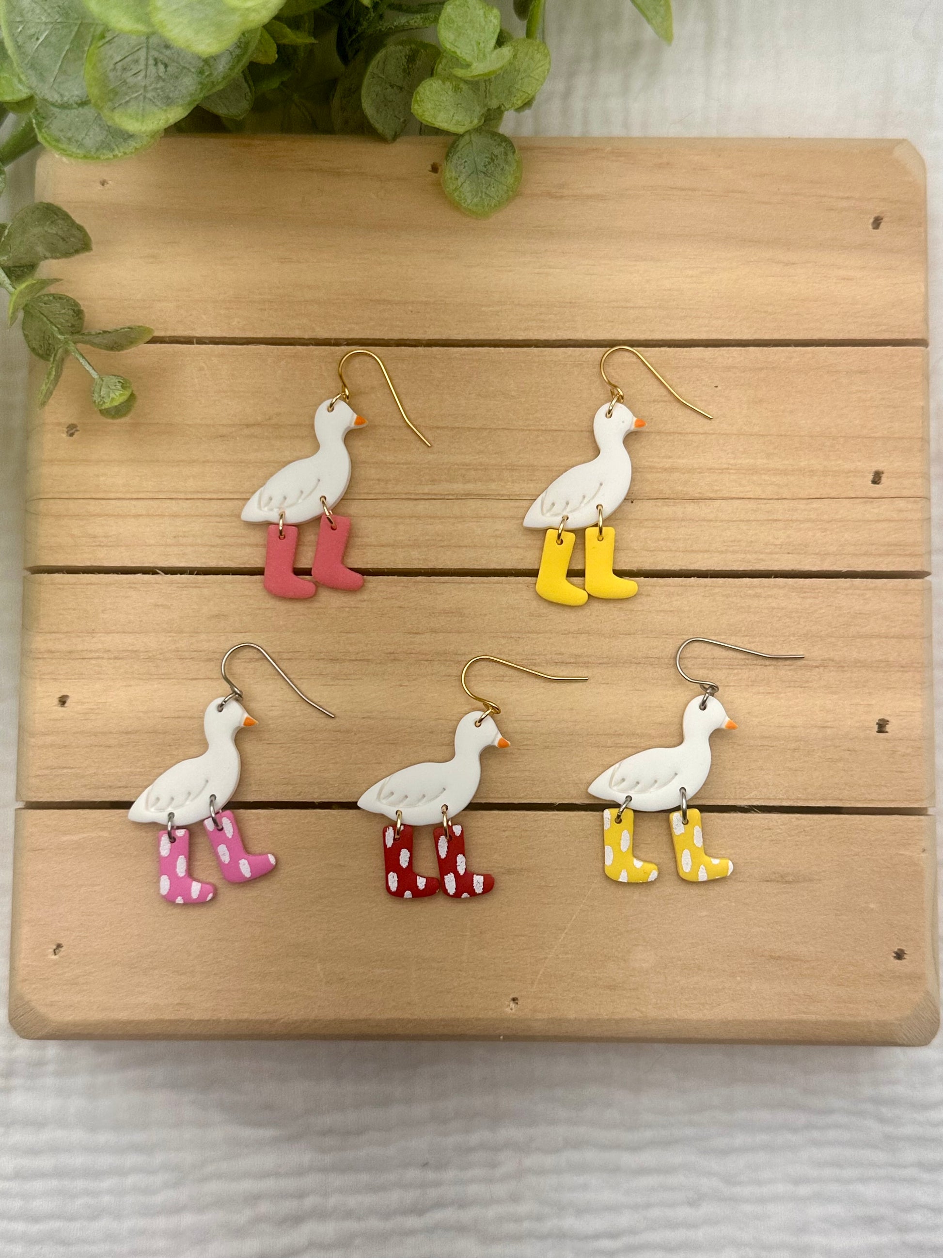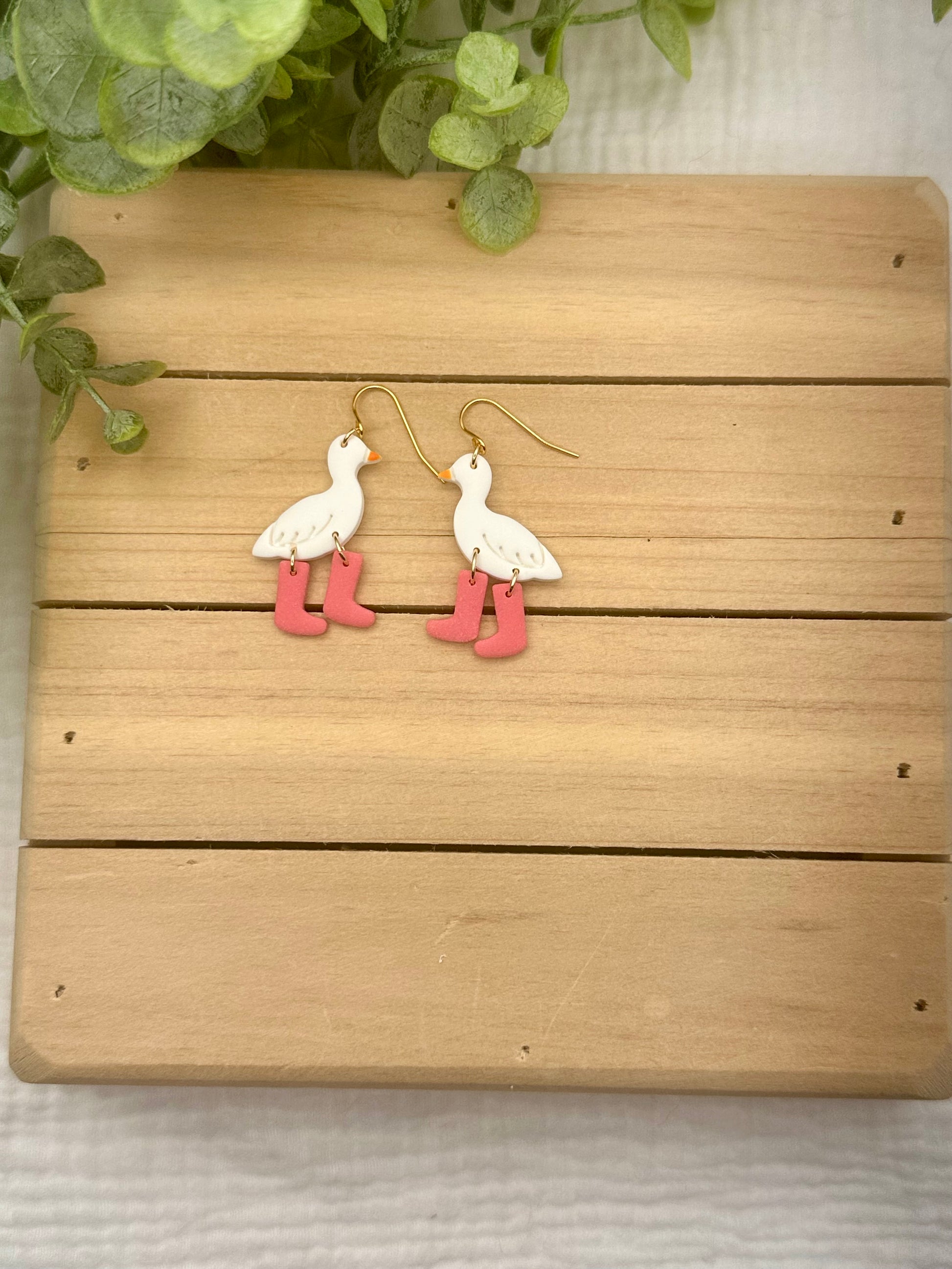 Handmade polymer clay earrings. All on hypoallergenic surgical grade steel findings. Goose in boots with different boots