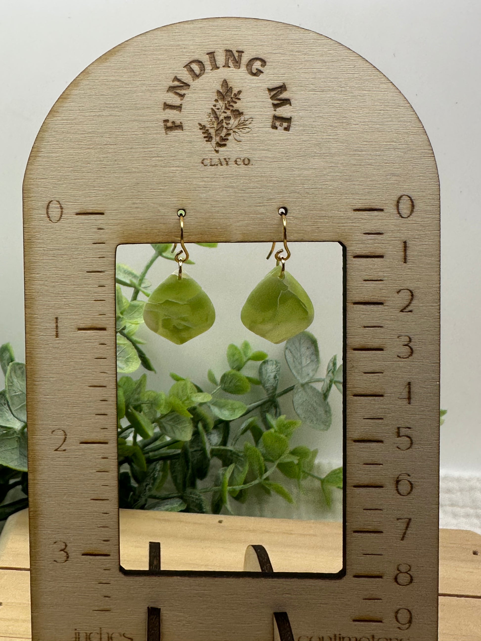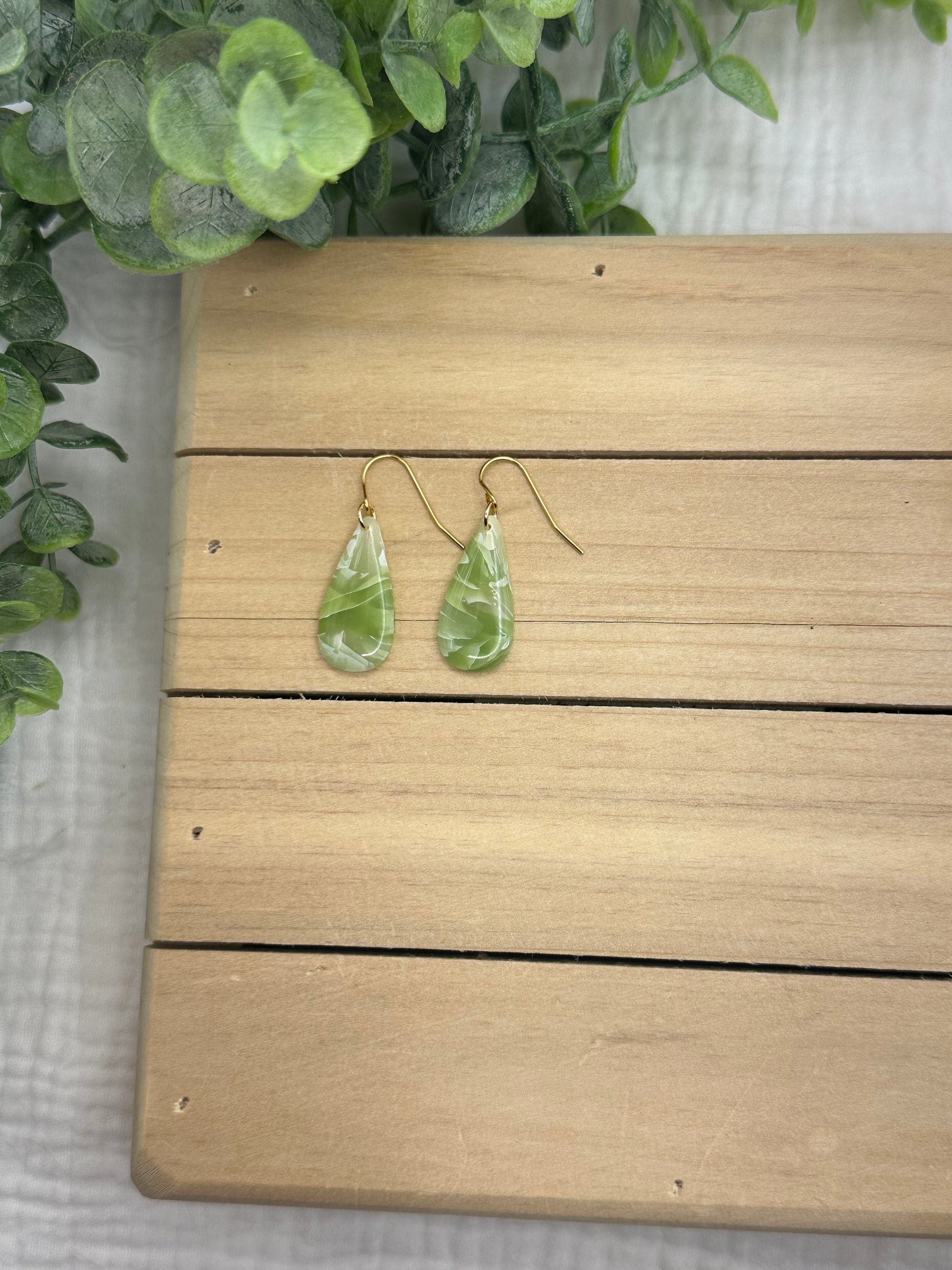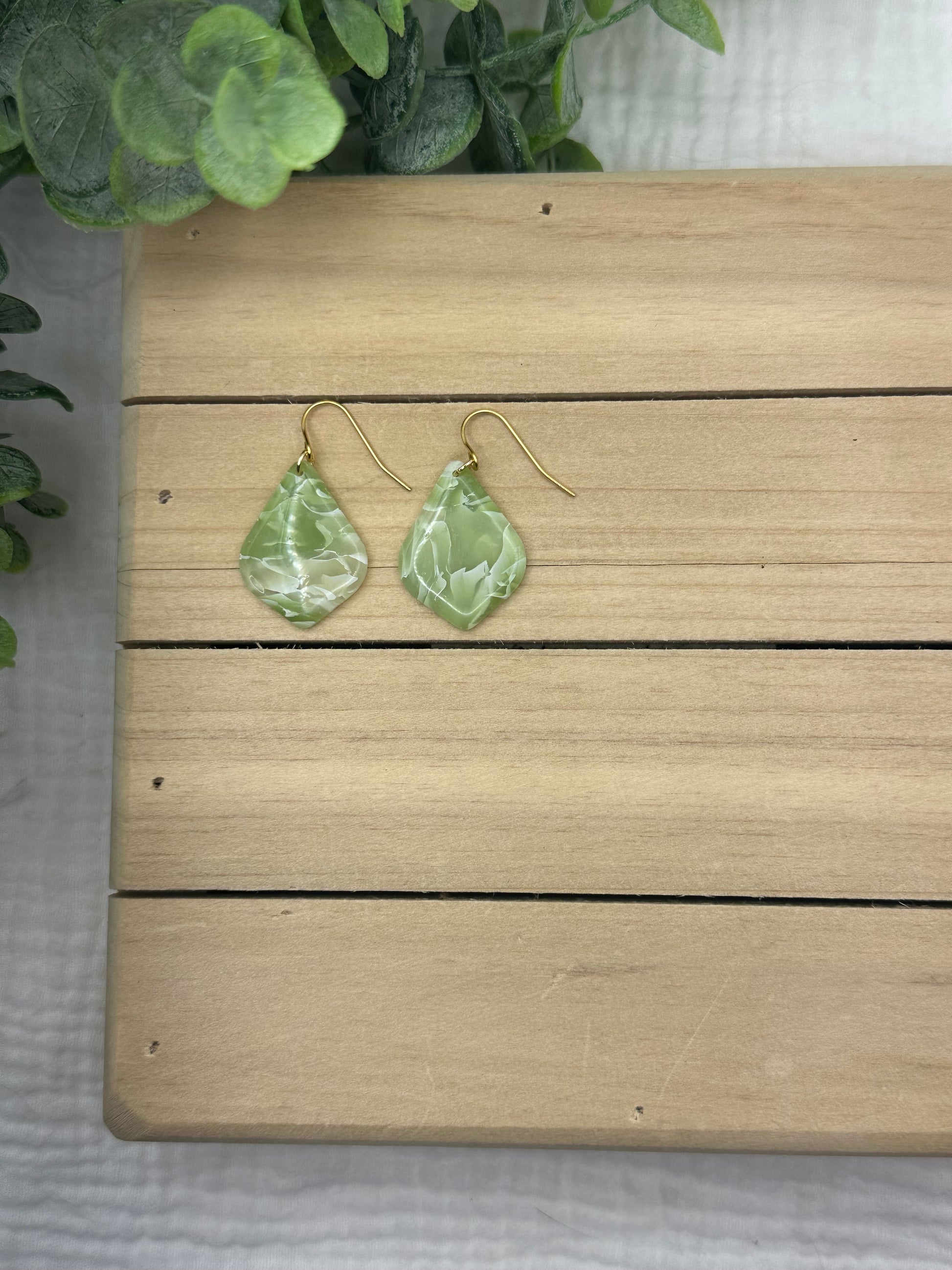 Handmade polymer clay earrings on surgical grade steel findings. Sage green semi translucent marbled on gold findings