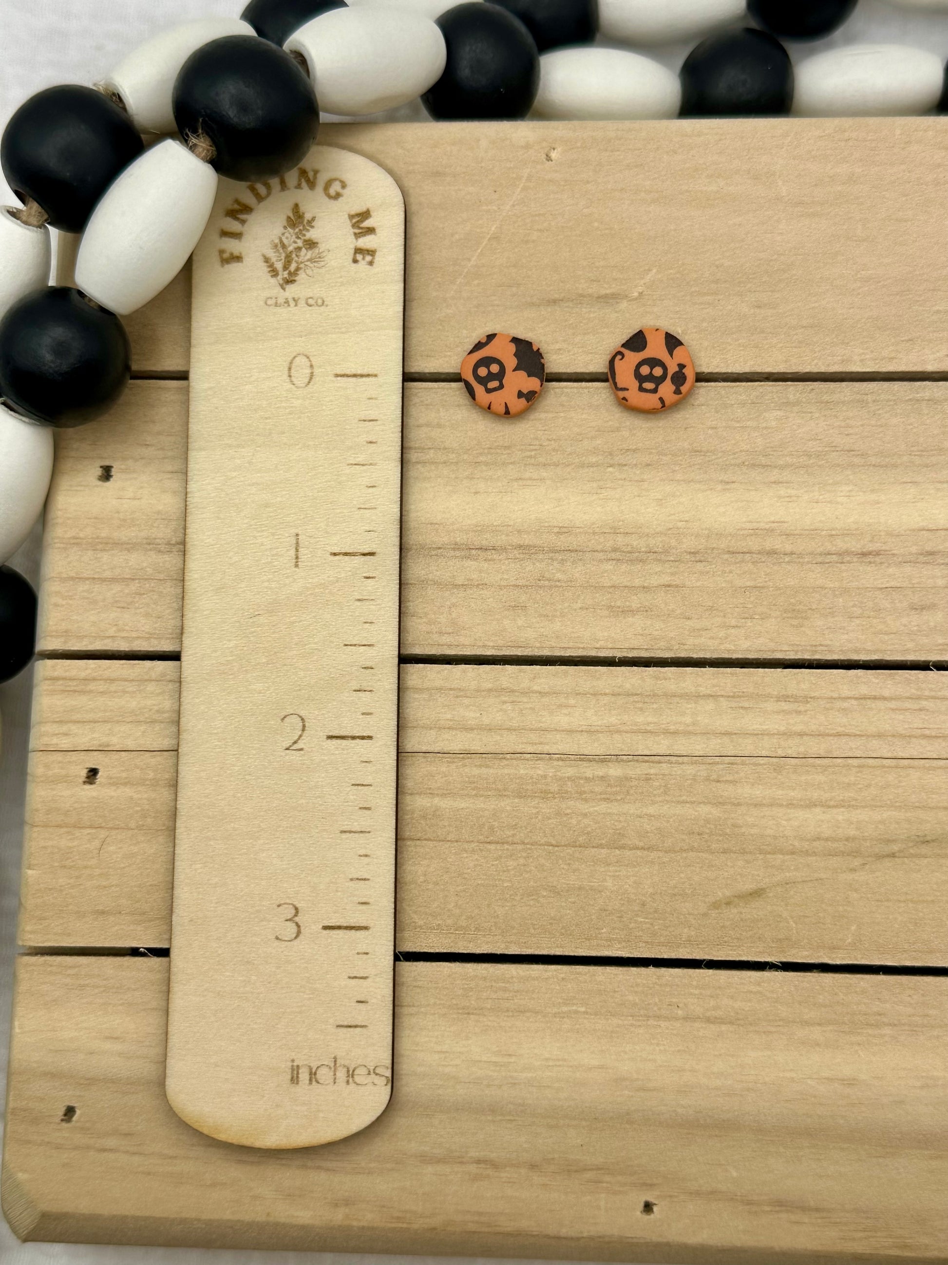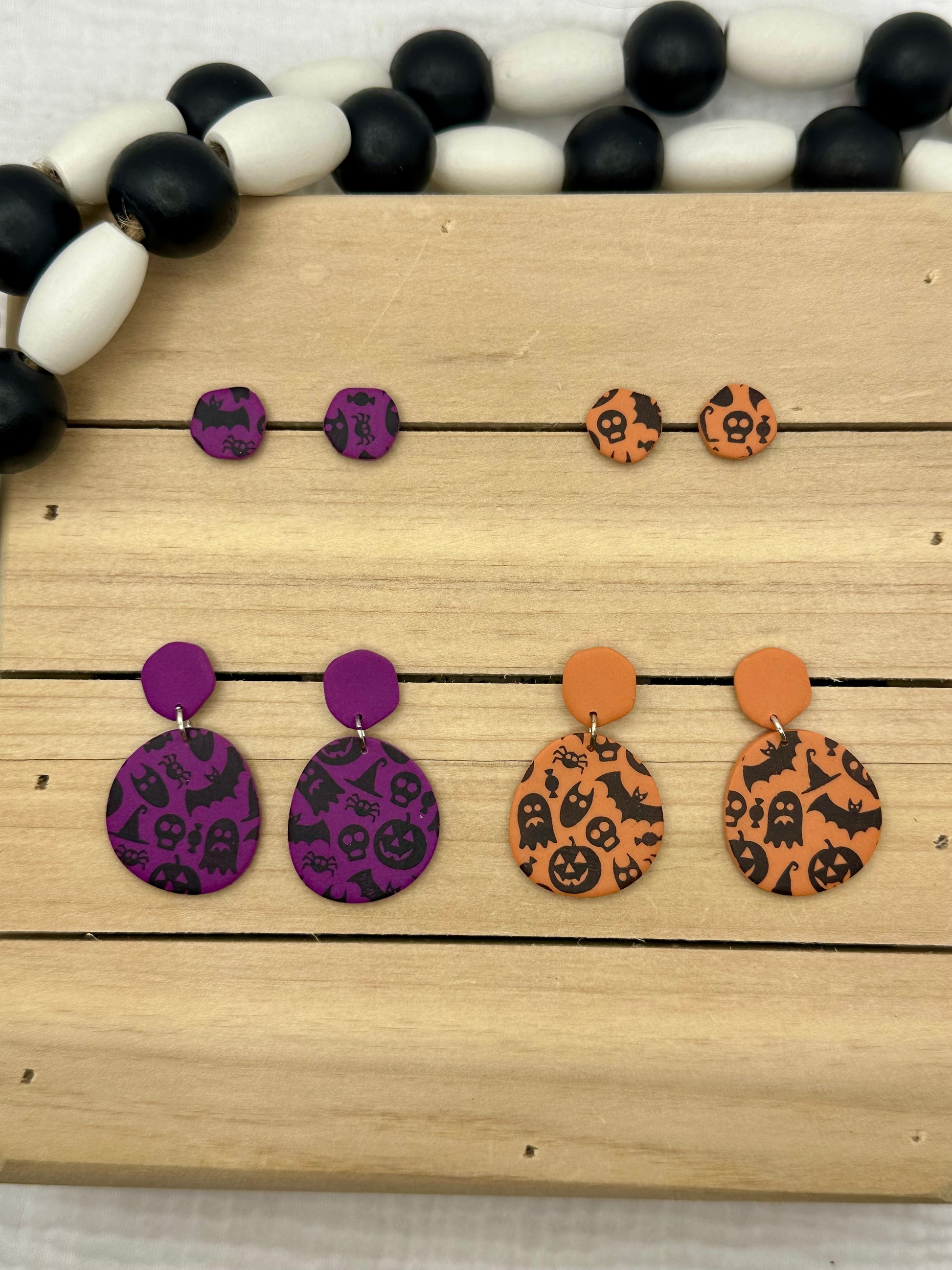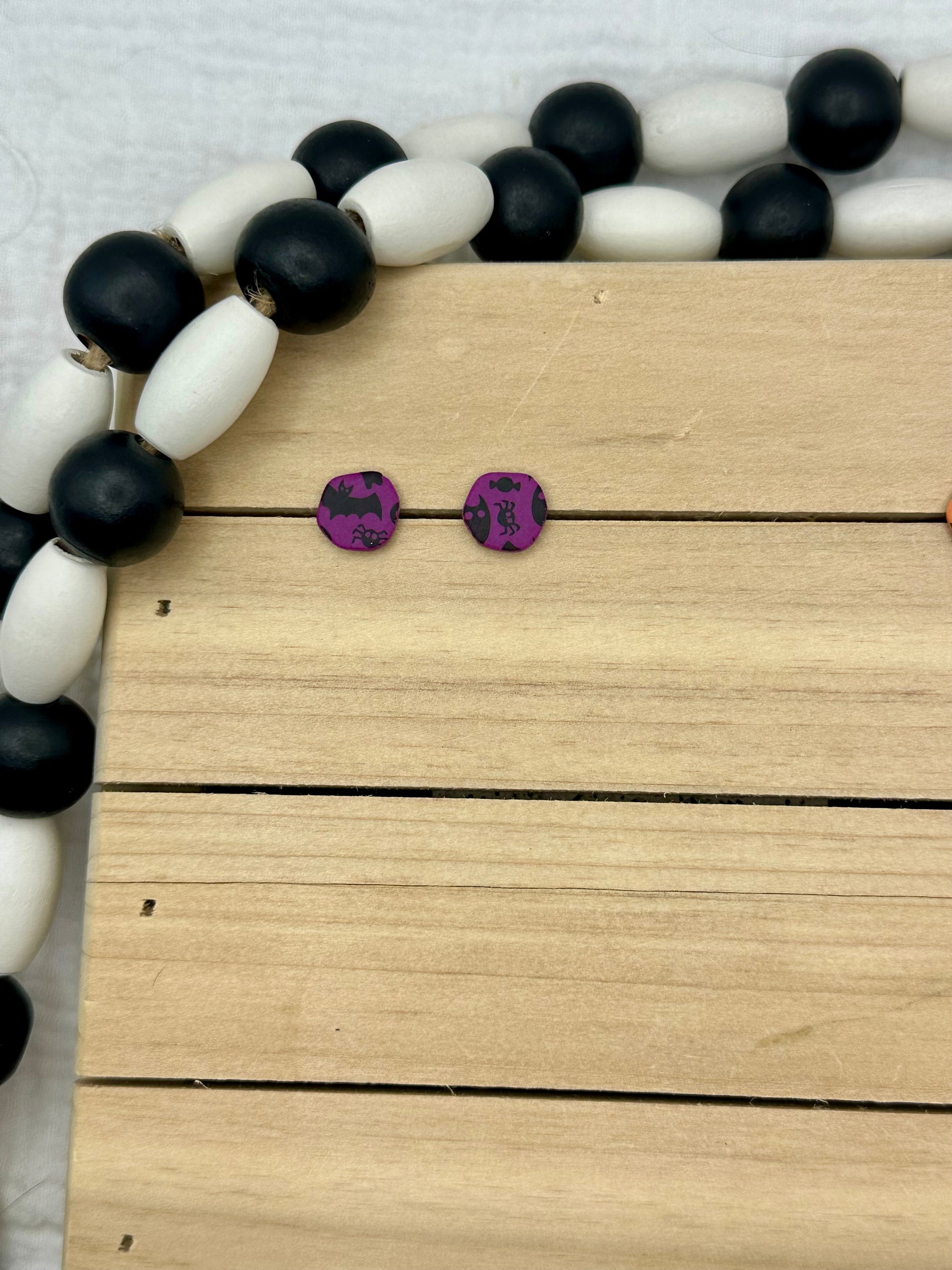 Handmade polymer clay earrings. All on hypoallergenic surgical grade steel findings. Halloween print on orange and purple