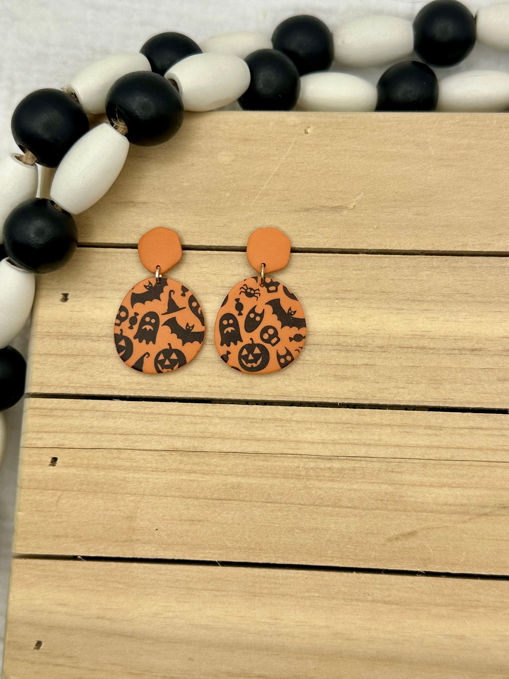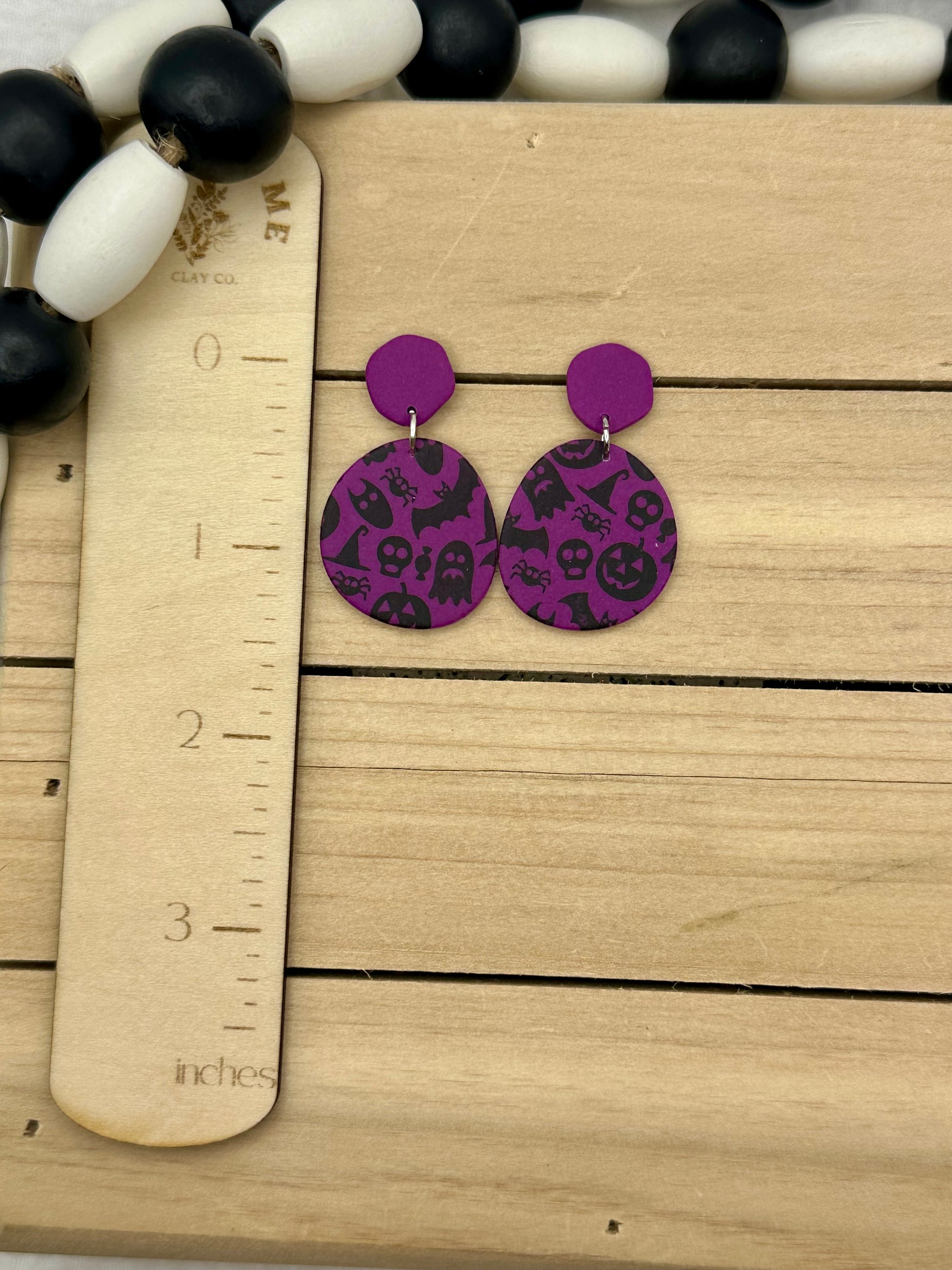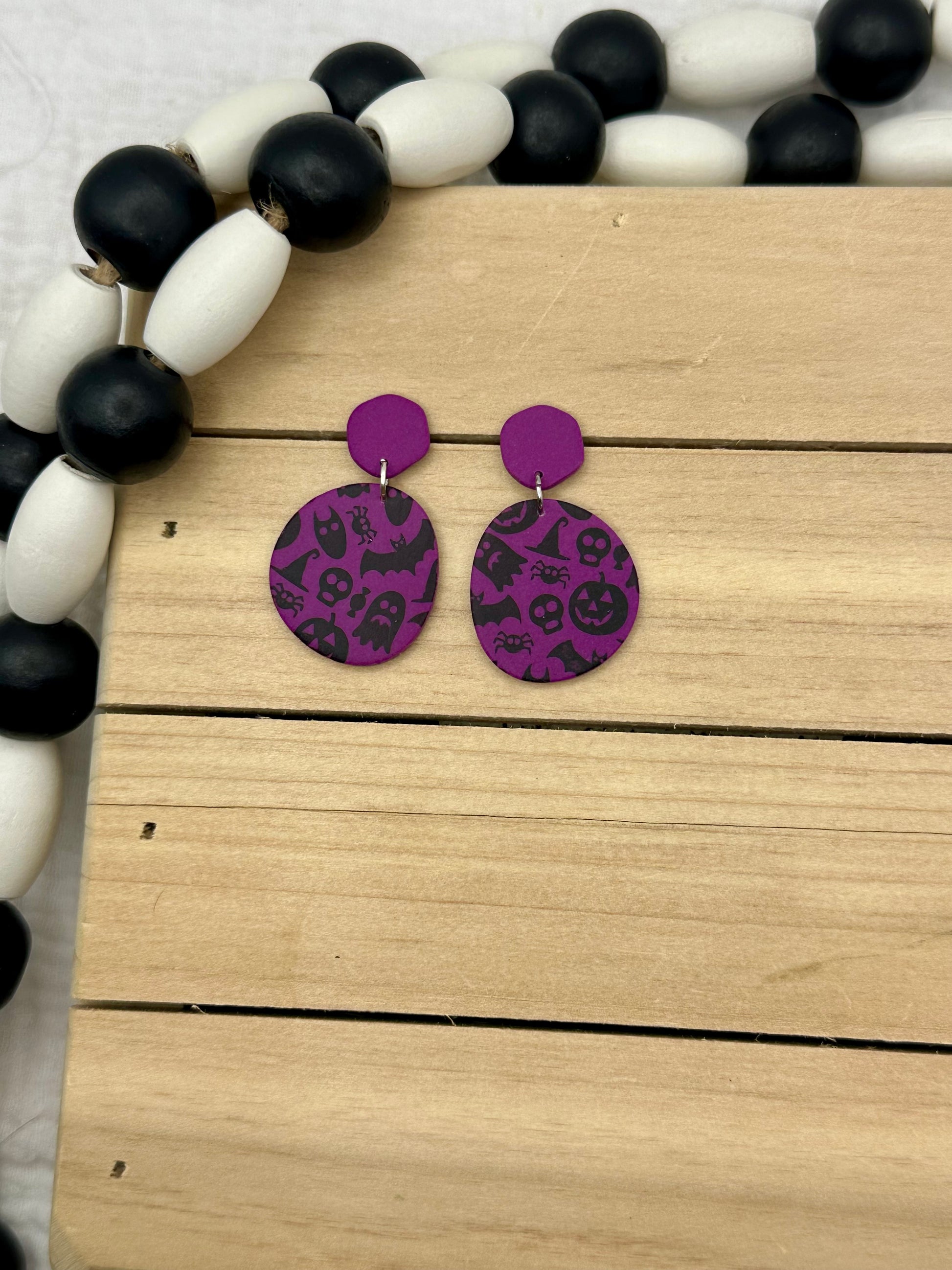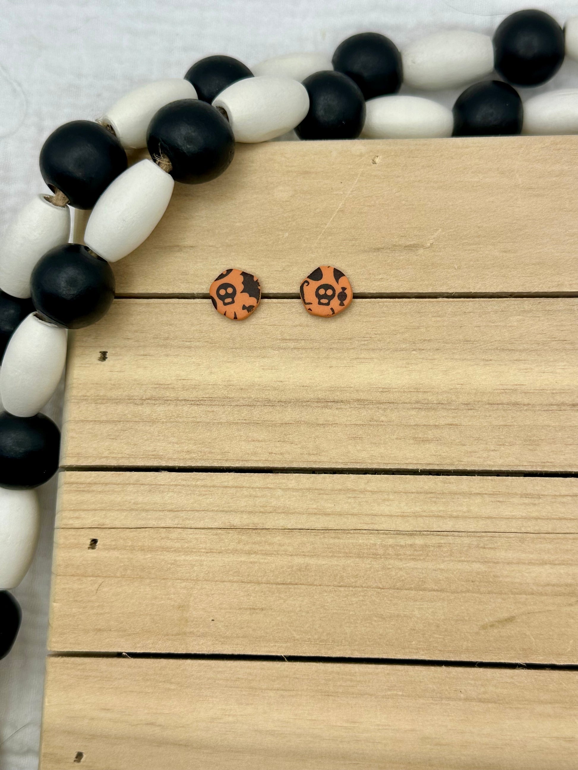 Handmade polymer clay earrings. All on hypoallergenic surgical grade steel findings. Halloween print on orange and purple