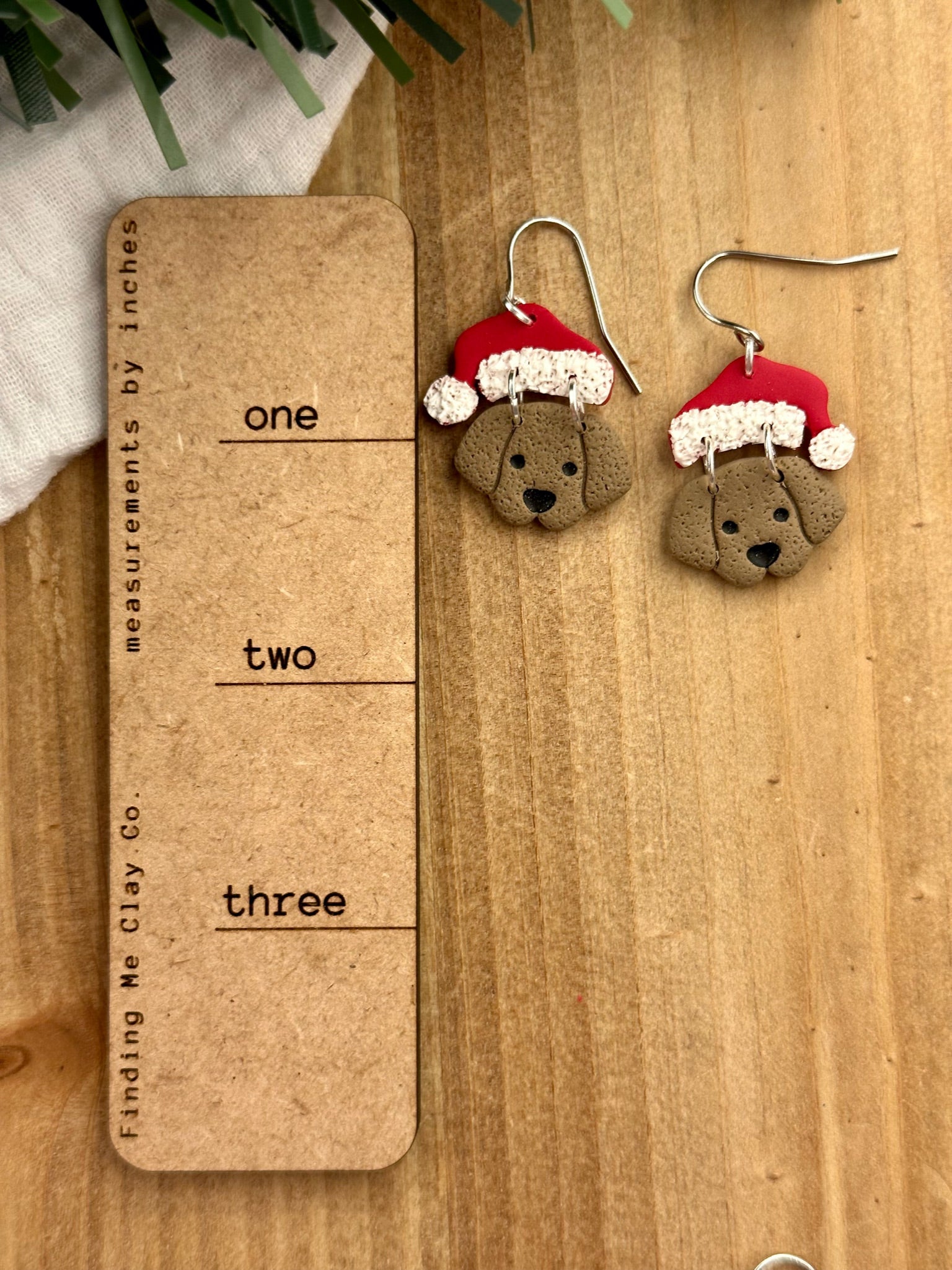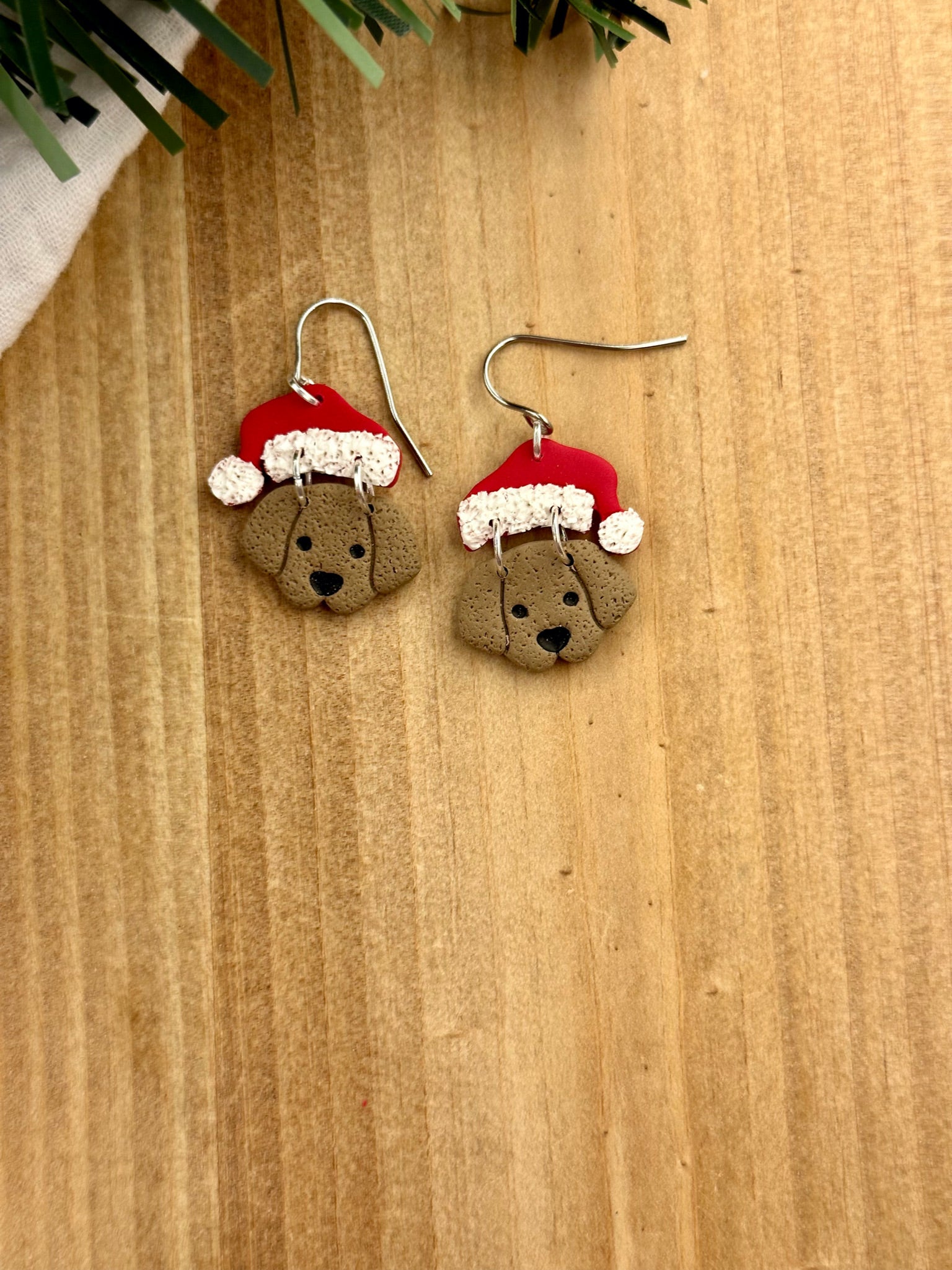 Handmade polymer clay earrings. All on hypoallergenic findings. Puppy dangles with Santa hat on silver hook
