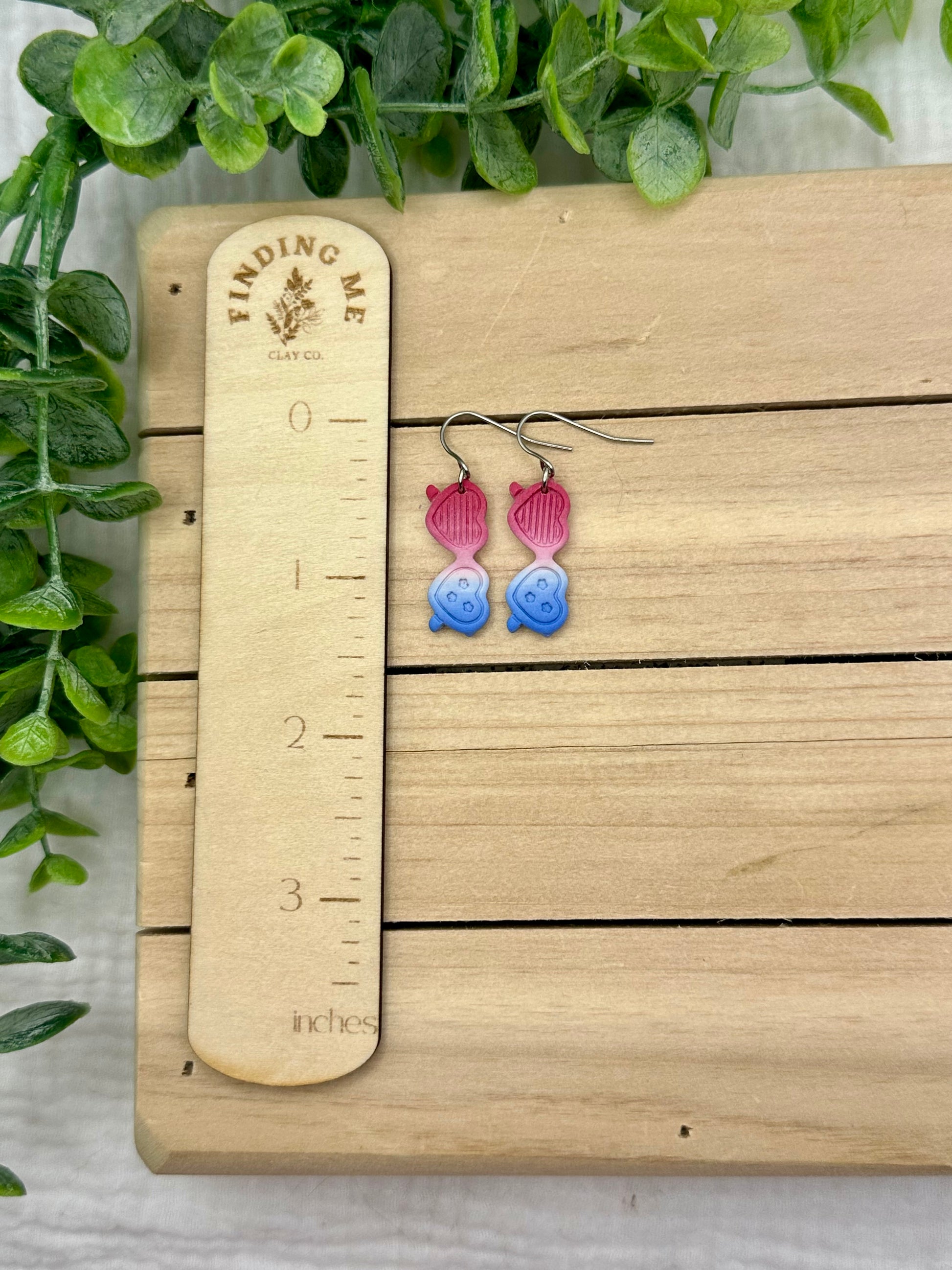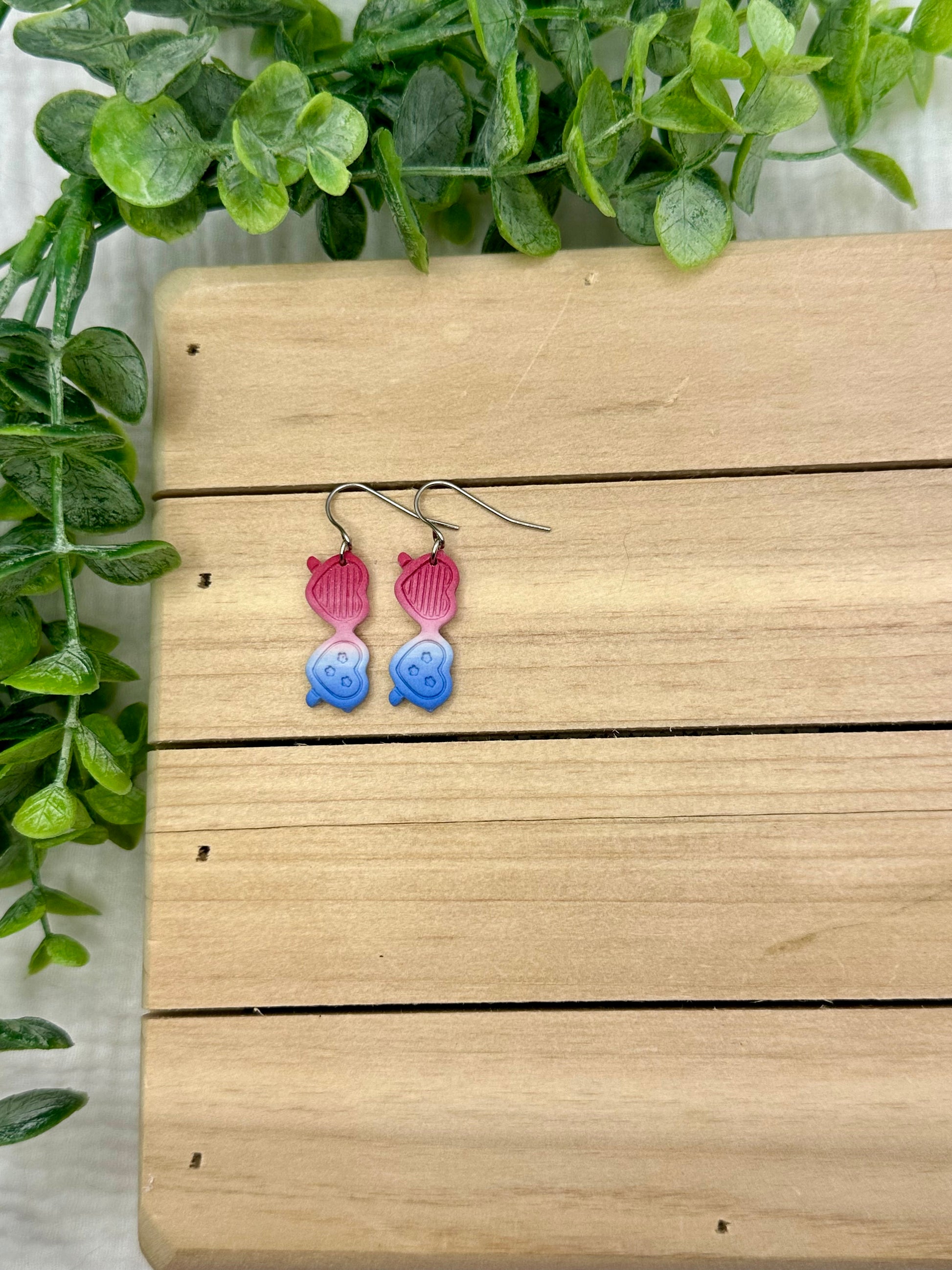 Handmade polymer clay earrings. All on hypoallergenic surgical grade steel findings. Ombre Red white and blue sunglasses on hooks