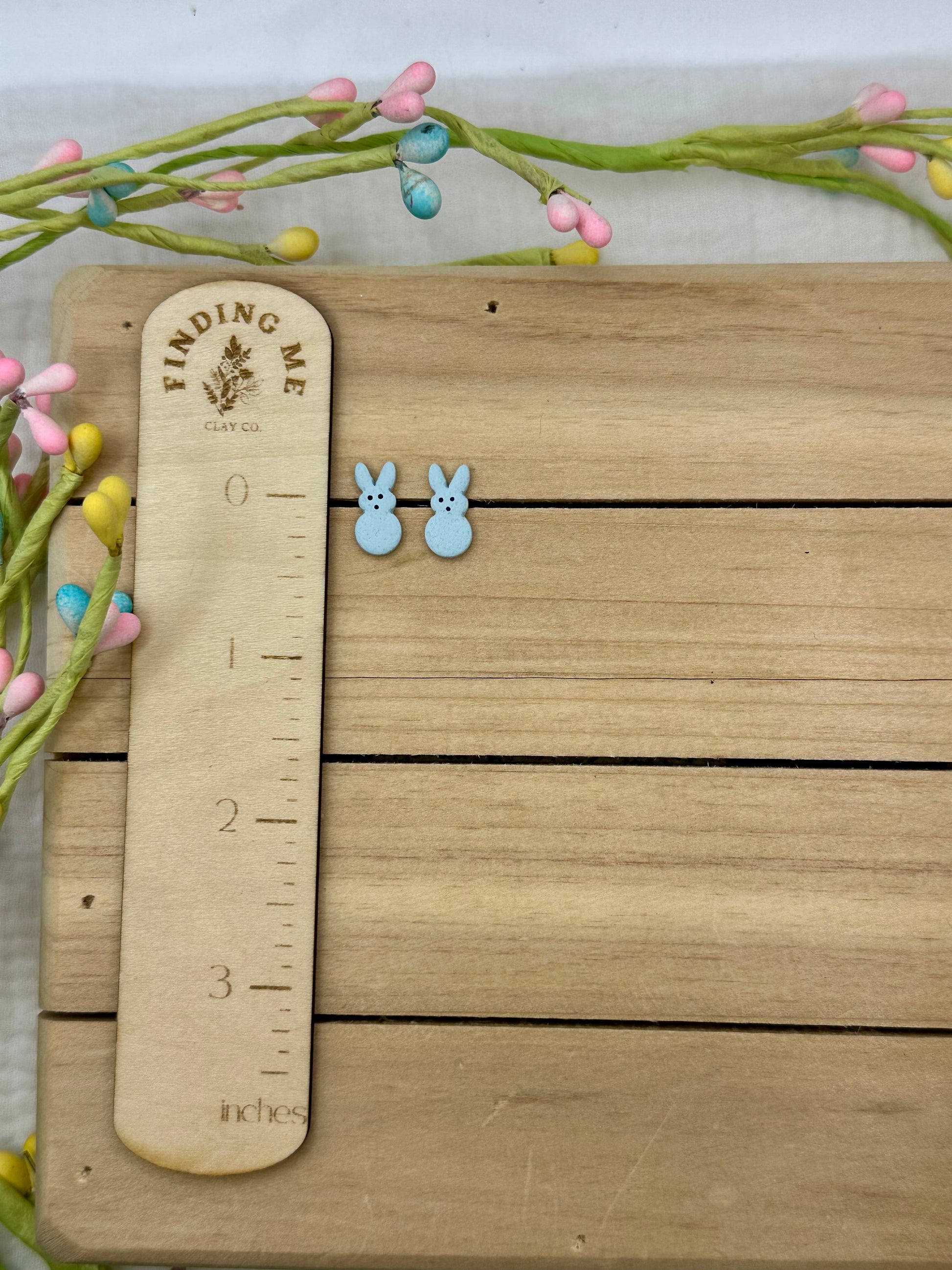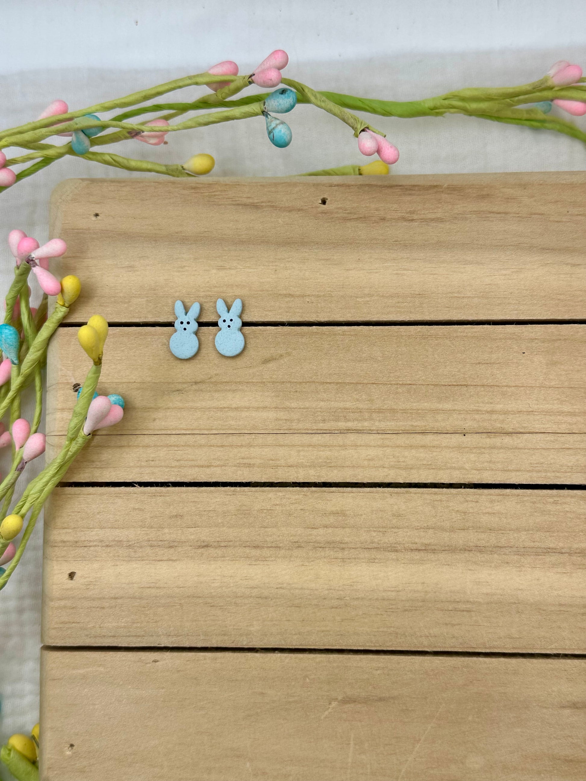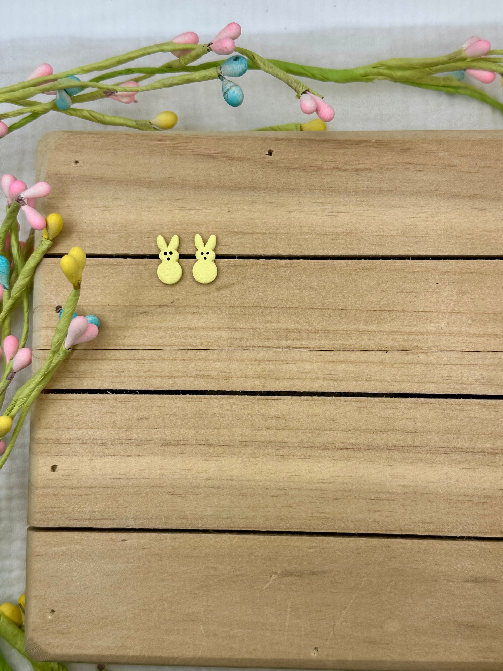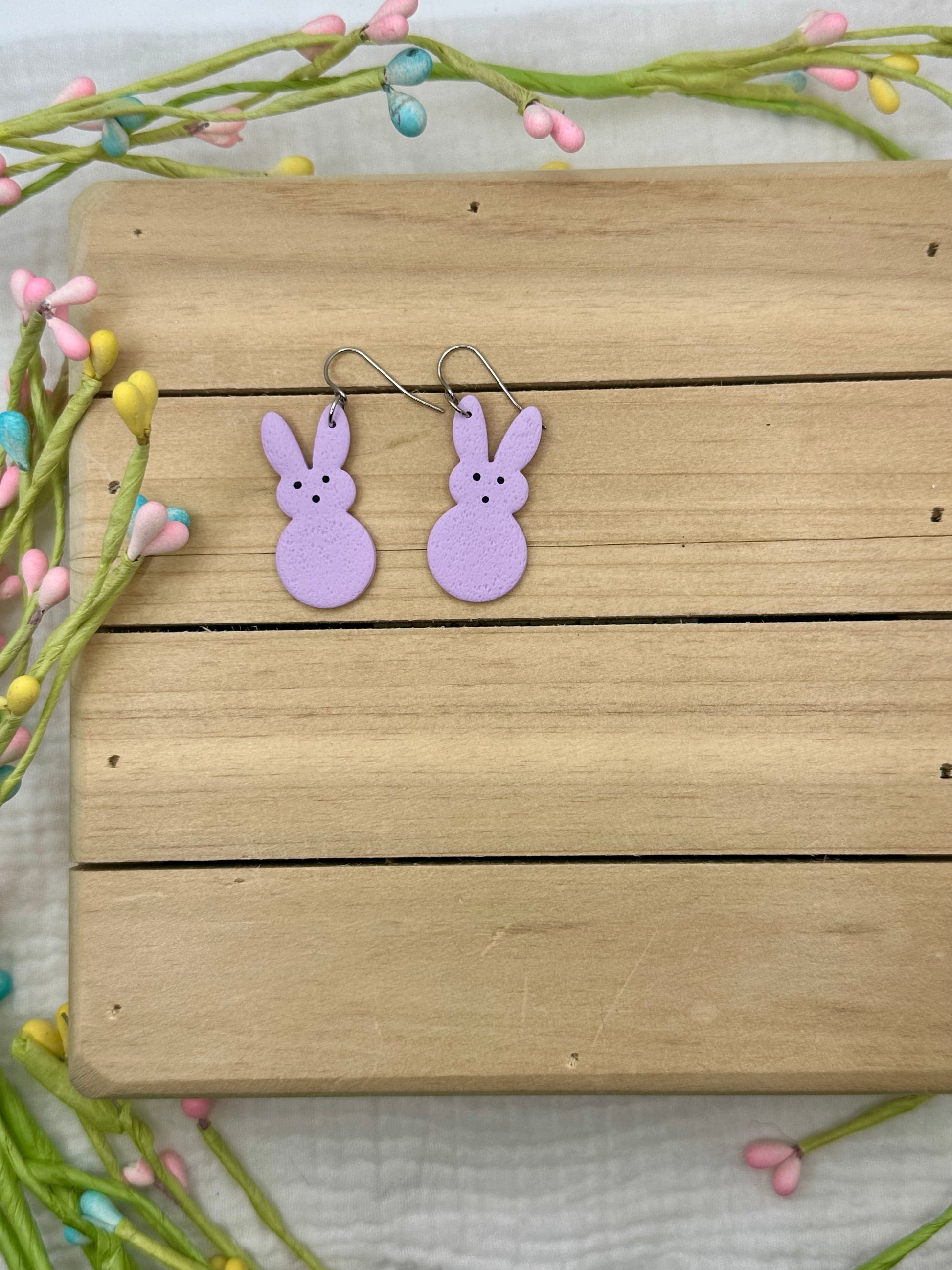 Handmade polymer clay earrings. All on hypoallergenic surgical grade steel findings. Marshmallows bunnies available in dangles and studs
