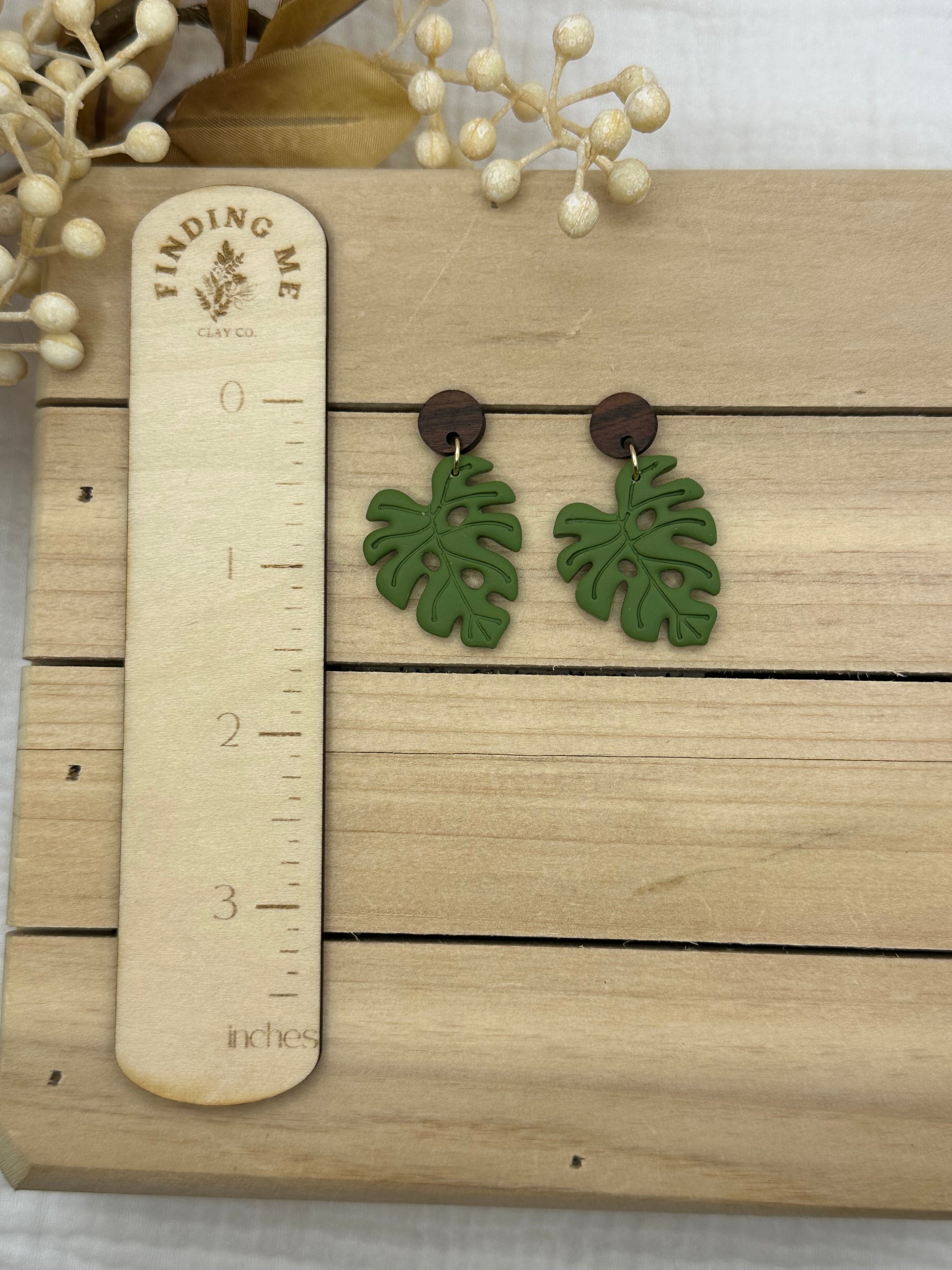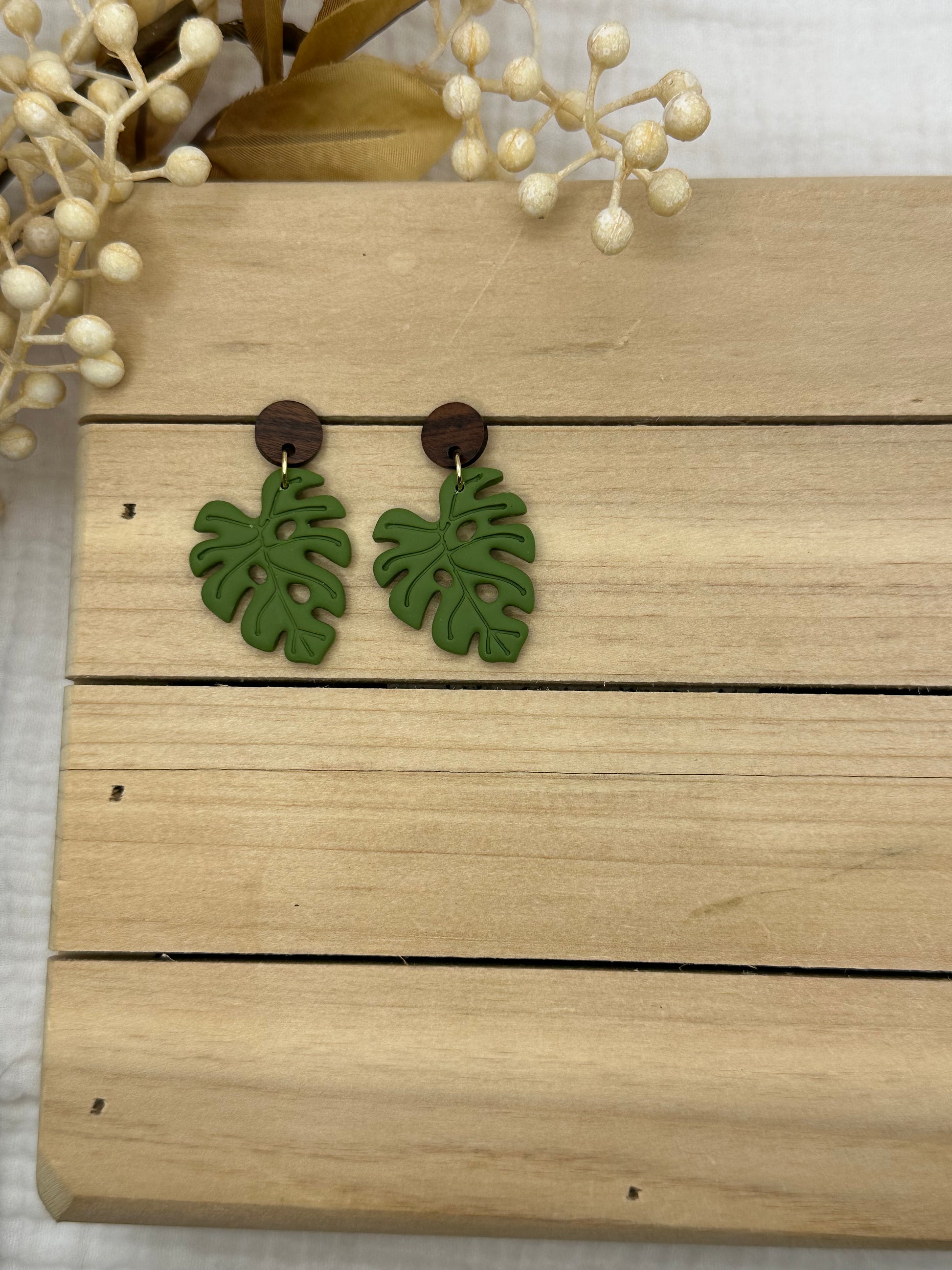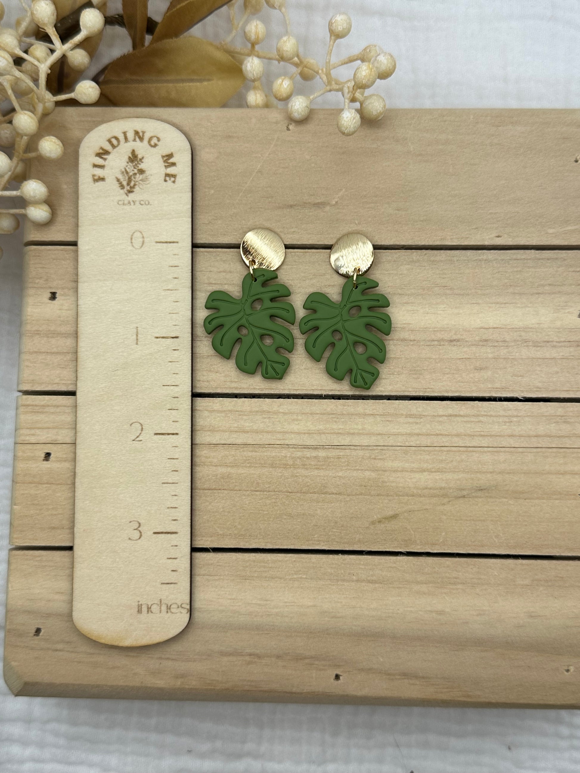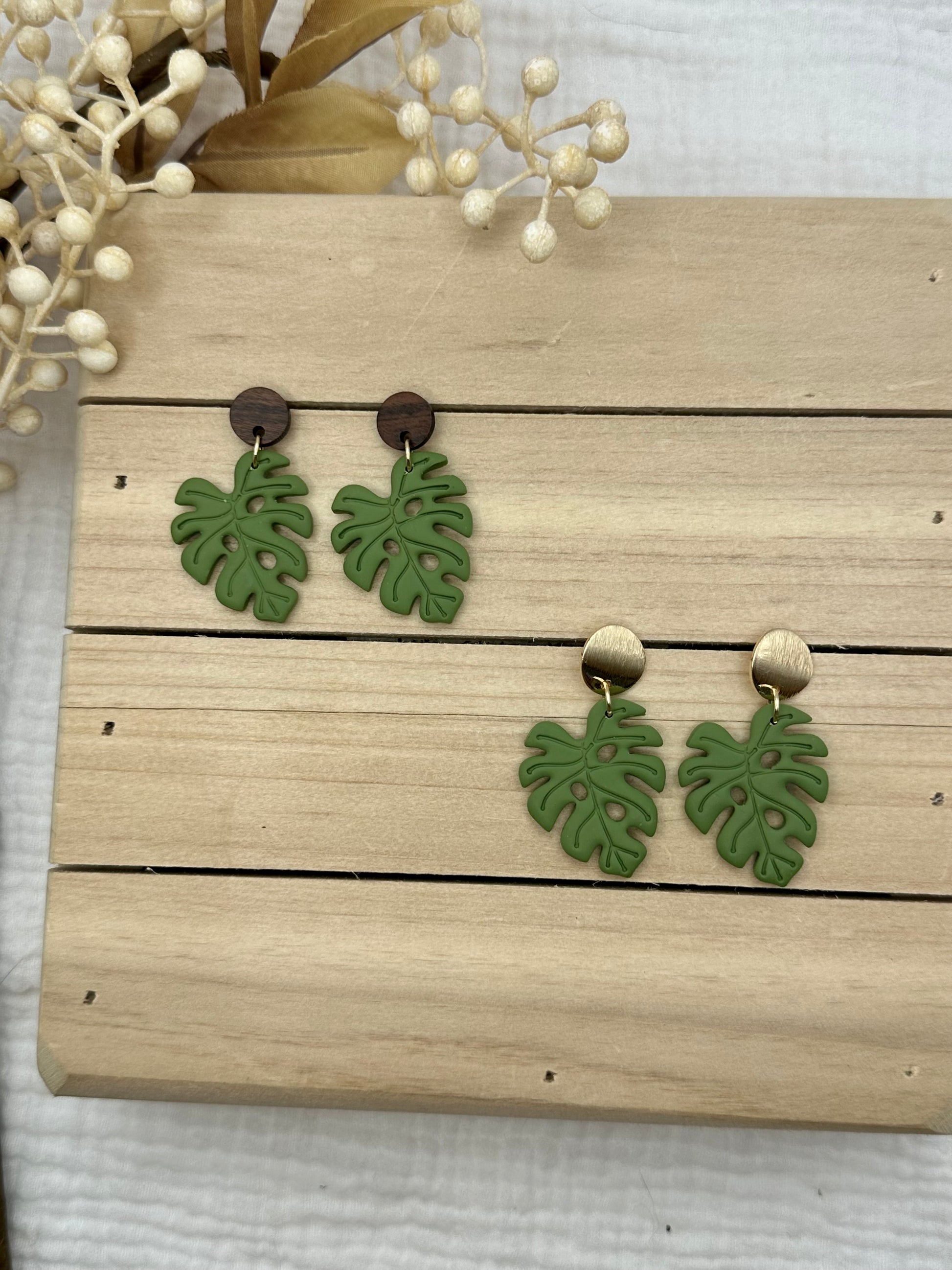 Handmade polymer clay earrings. All on hypoallergenic surgical grade steel findings. Monstera Leafs on Gold coated stud tops, also available in wooden topped studs