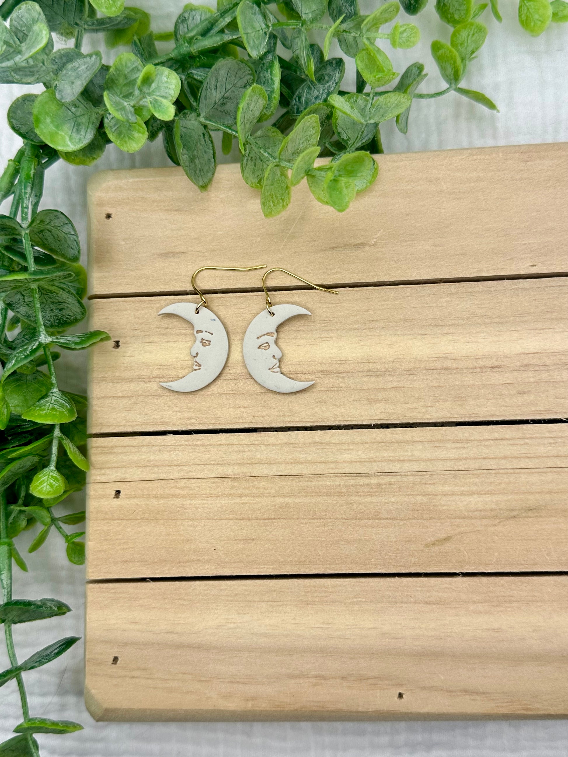 Handmade polymer clay earrings. All on hypoallergenic surgical grade steel findings. Moon dangles accented with bronze on gold coated findings