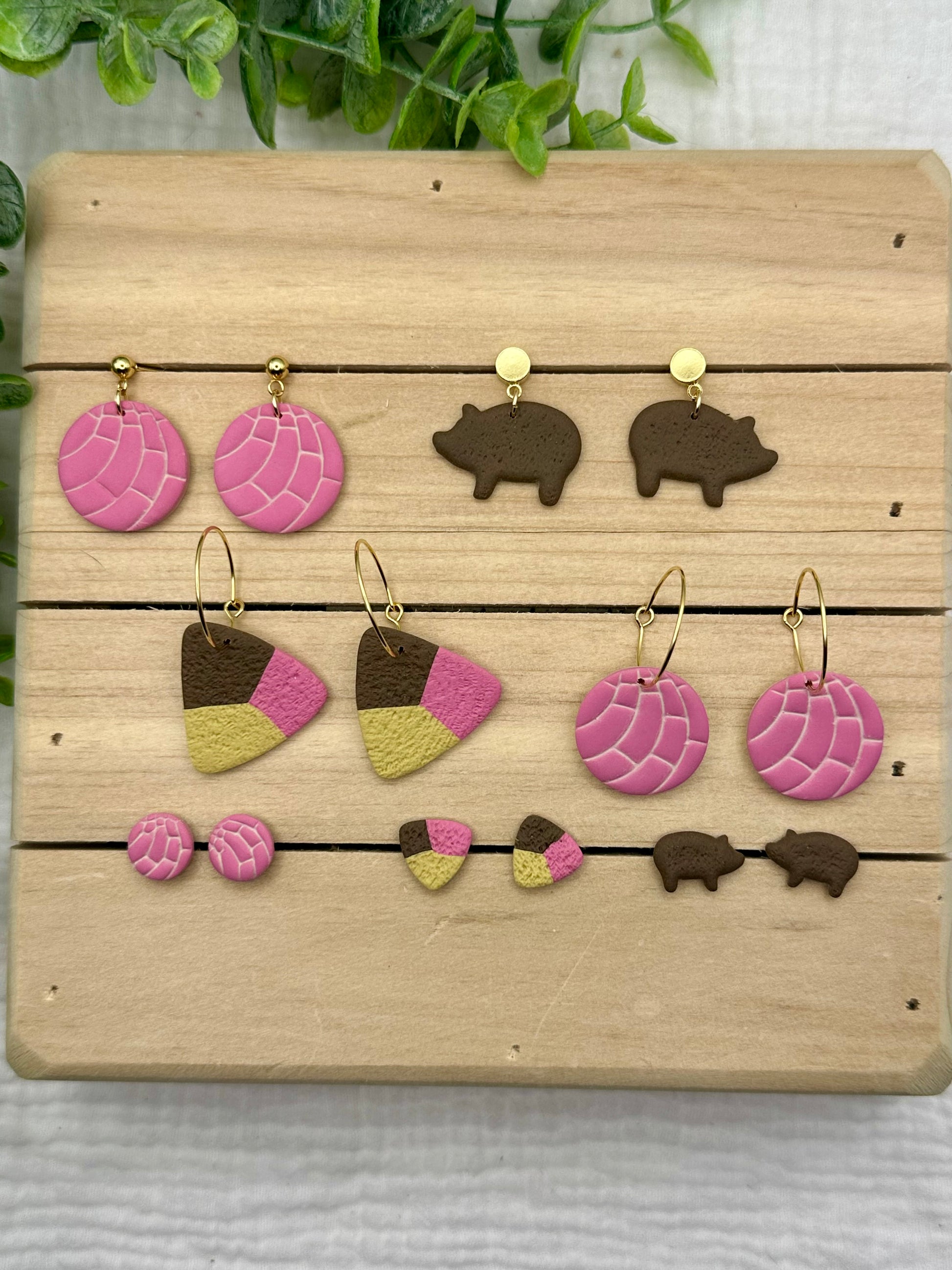 Handmade polymer clay earrings. All on hypoallergenic surgical grade steel findings. Different varieties of Mexican sweet breads on gold coated surgical steel findings.
