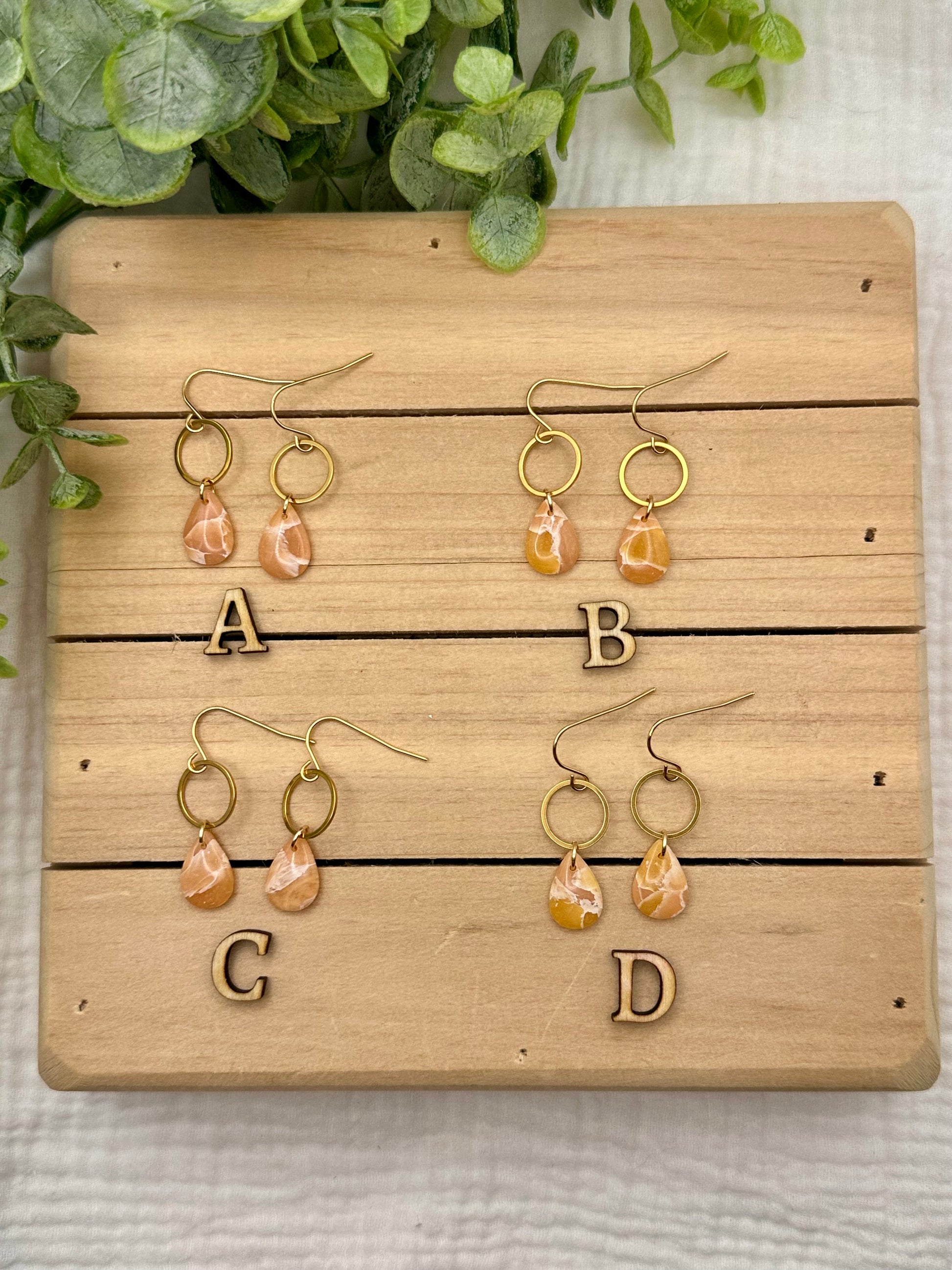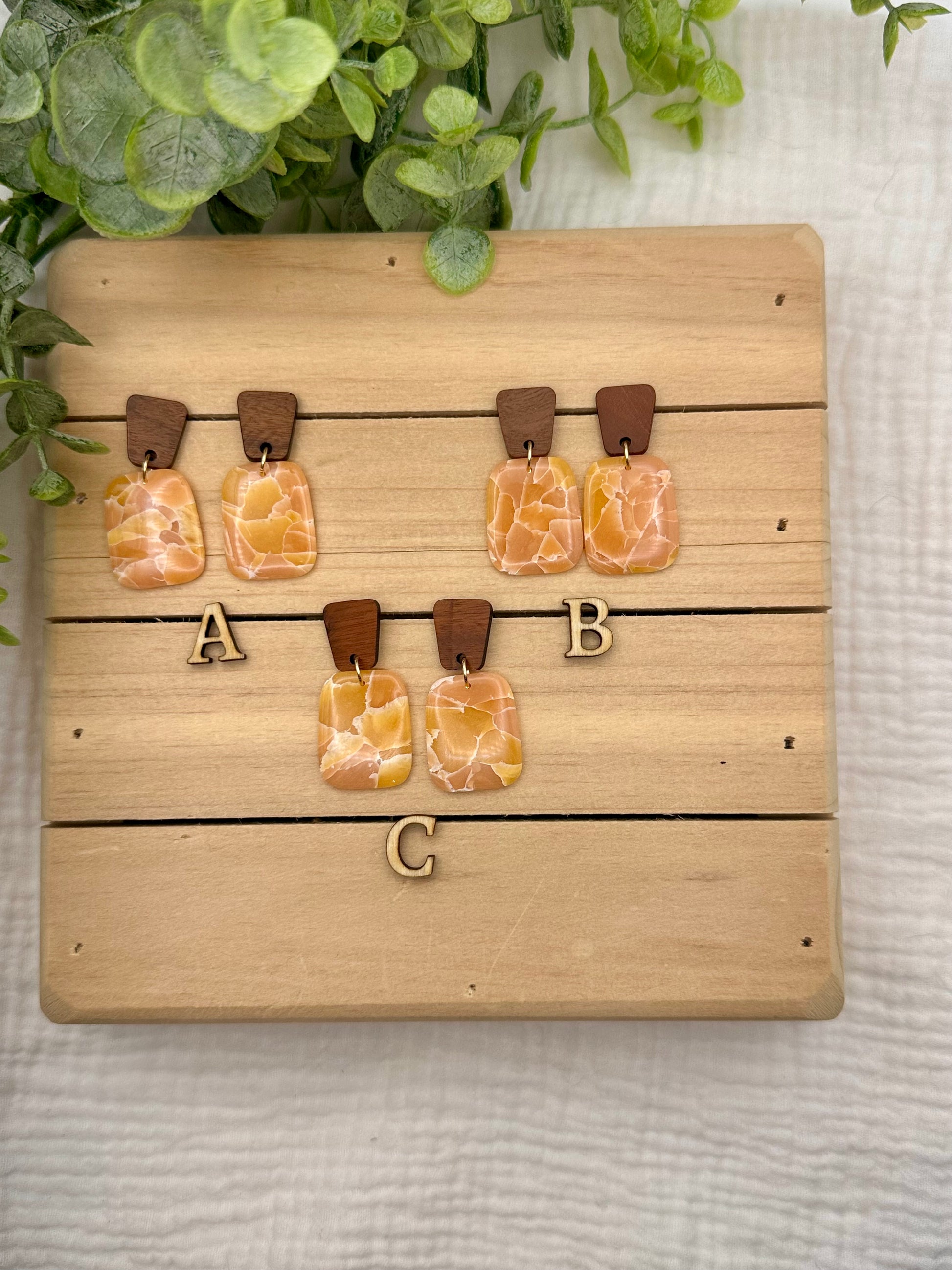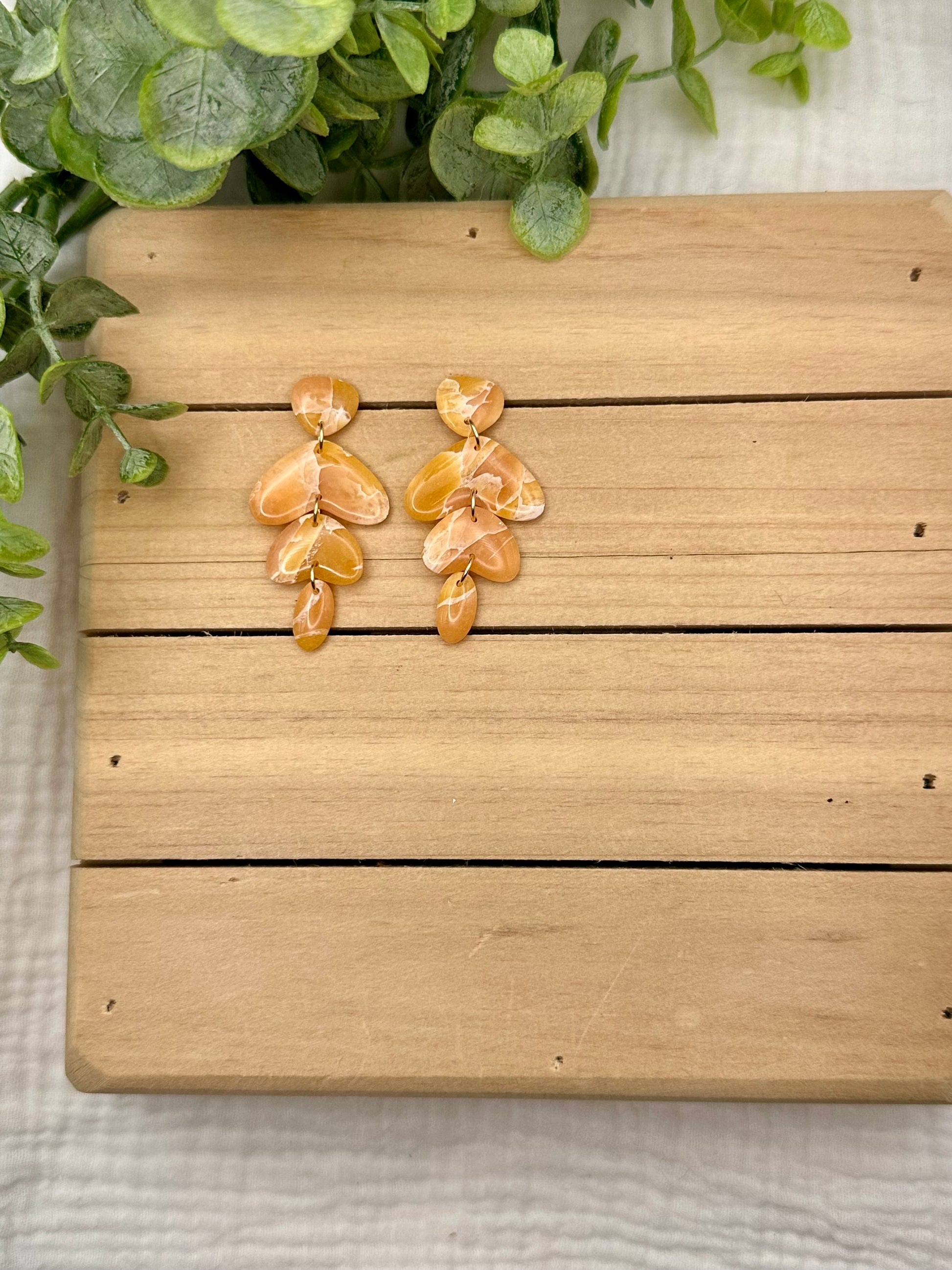 Handmade Polymer Clay Earrings. Peach marbled on surgical steel gold and wood tops