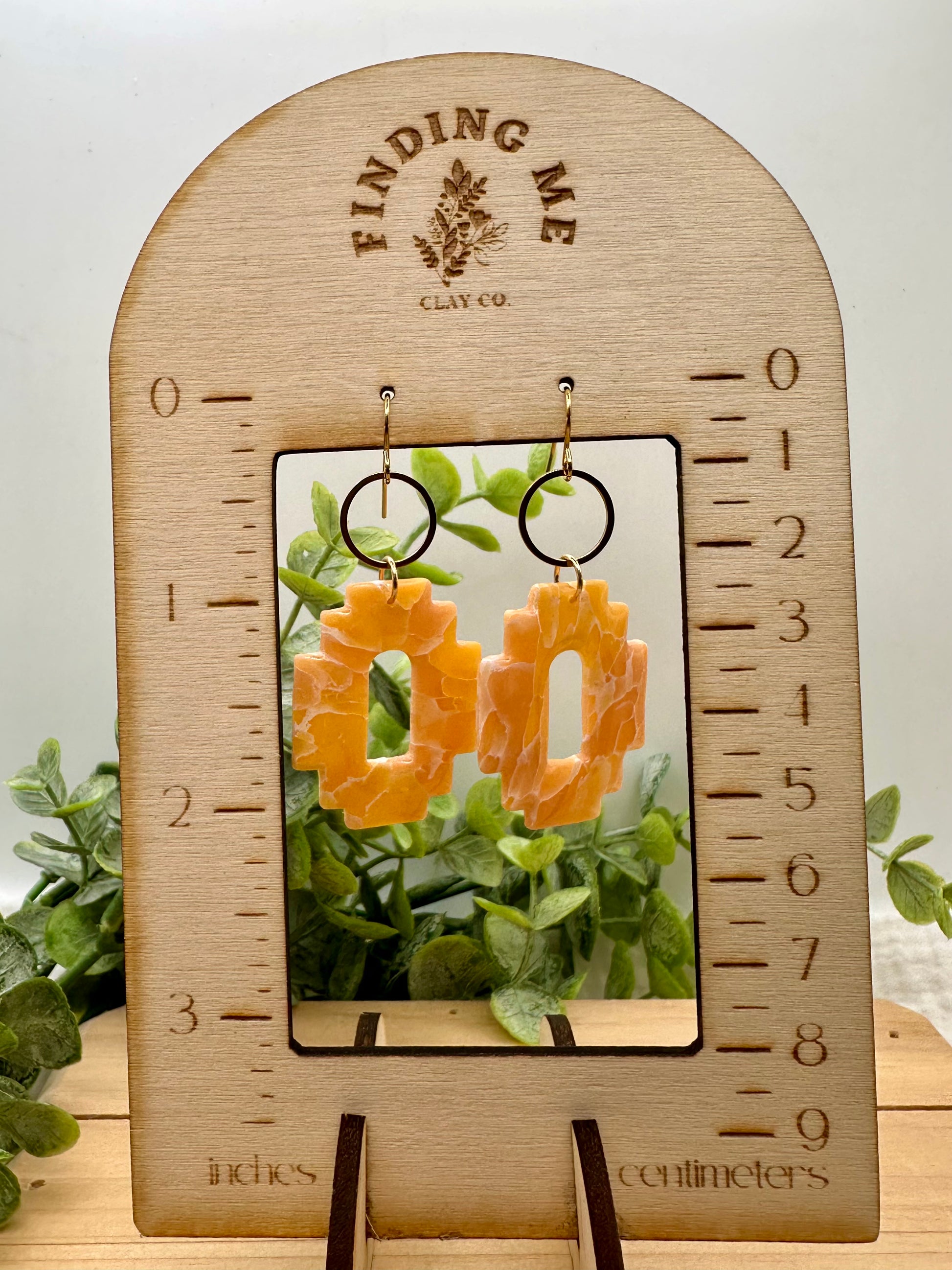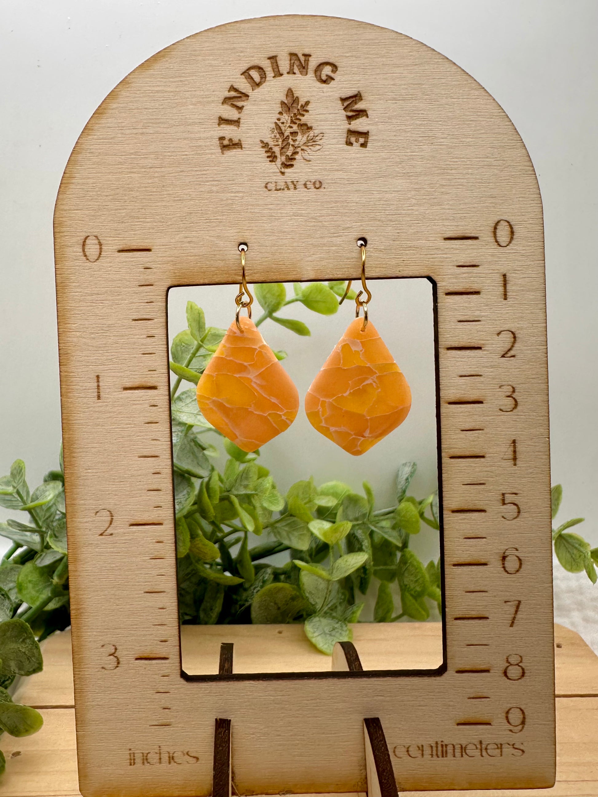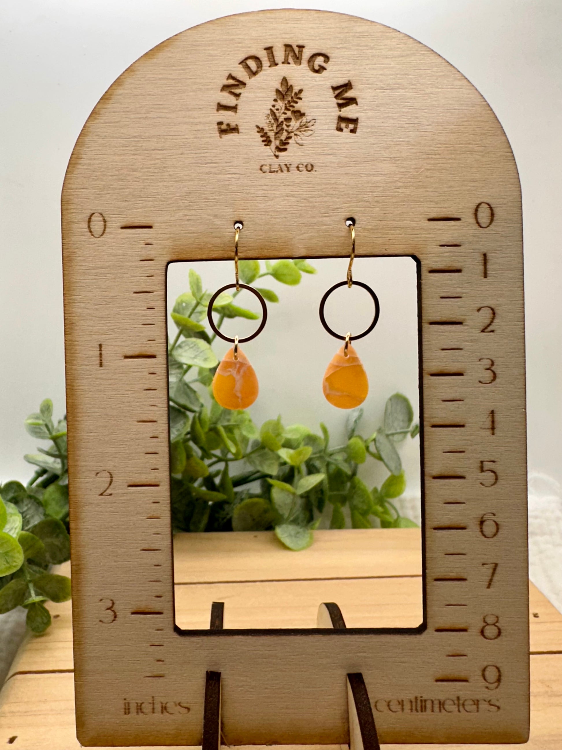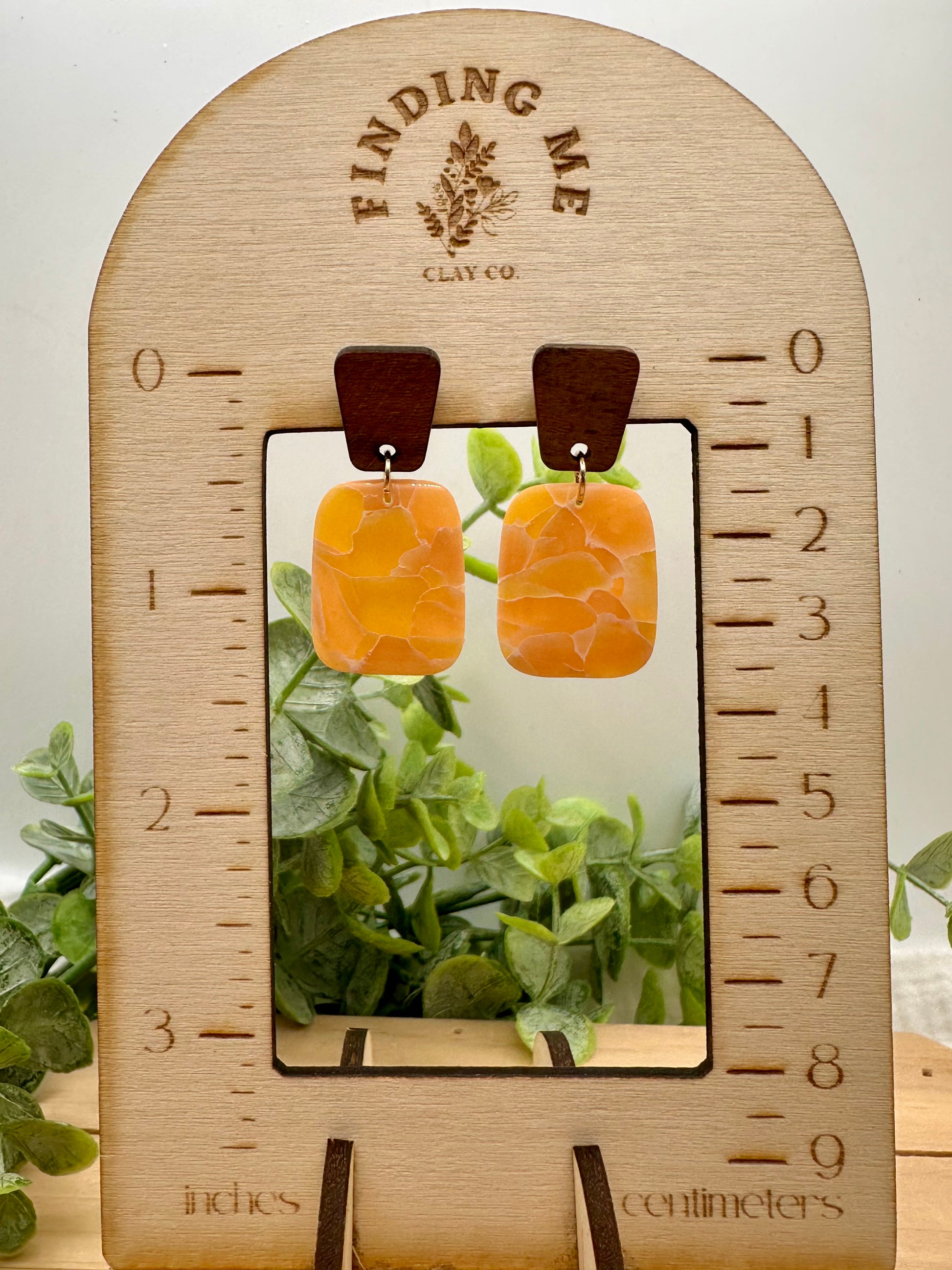 Handmade Polymer Clay Earrings. Peach marbled on surgical steel gold and wood tops