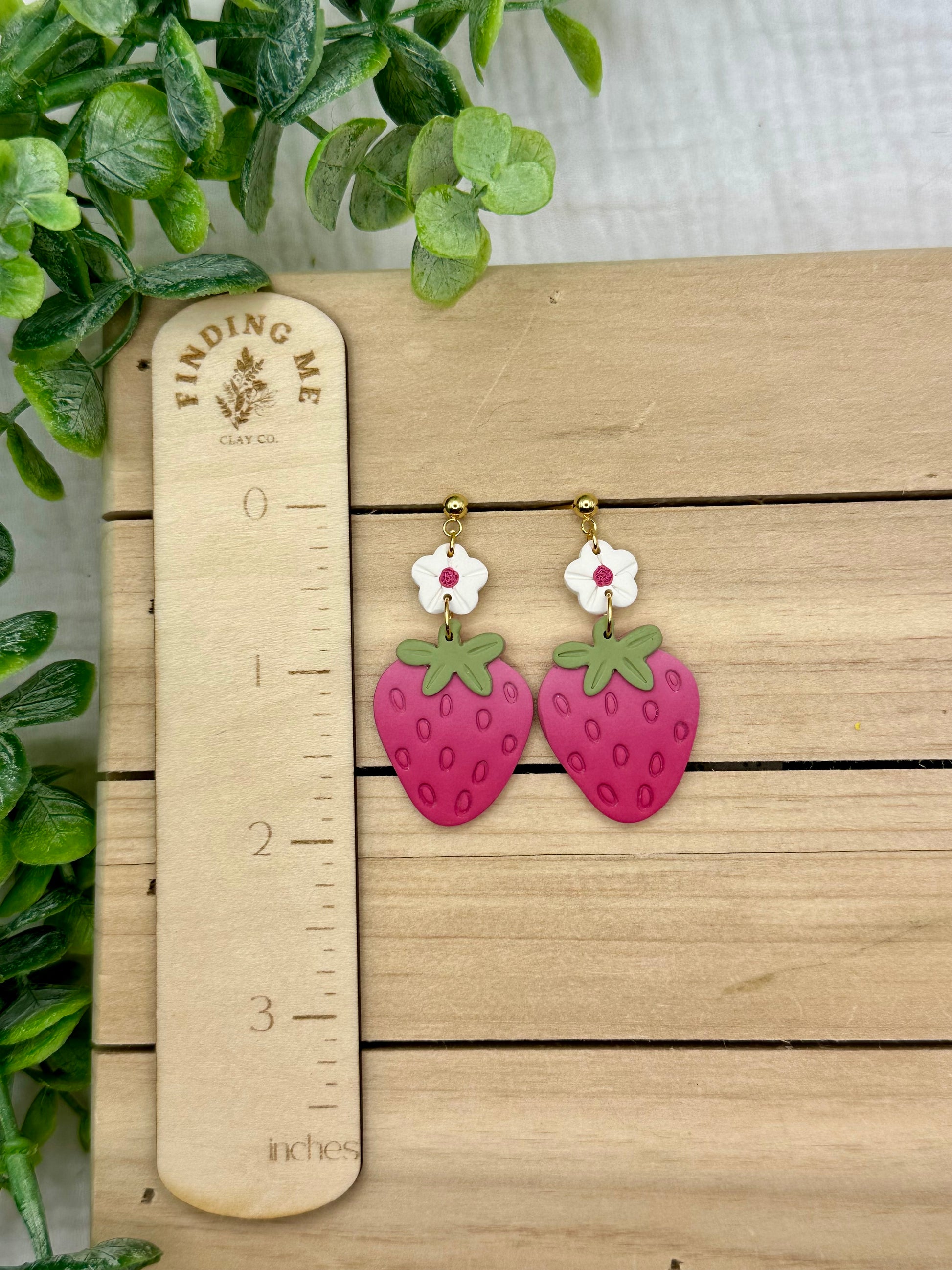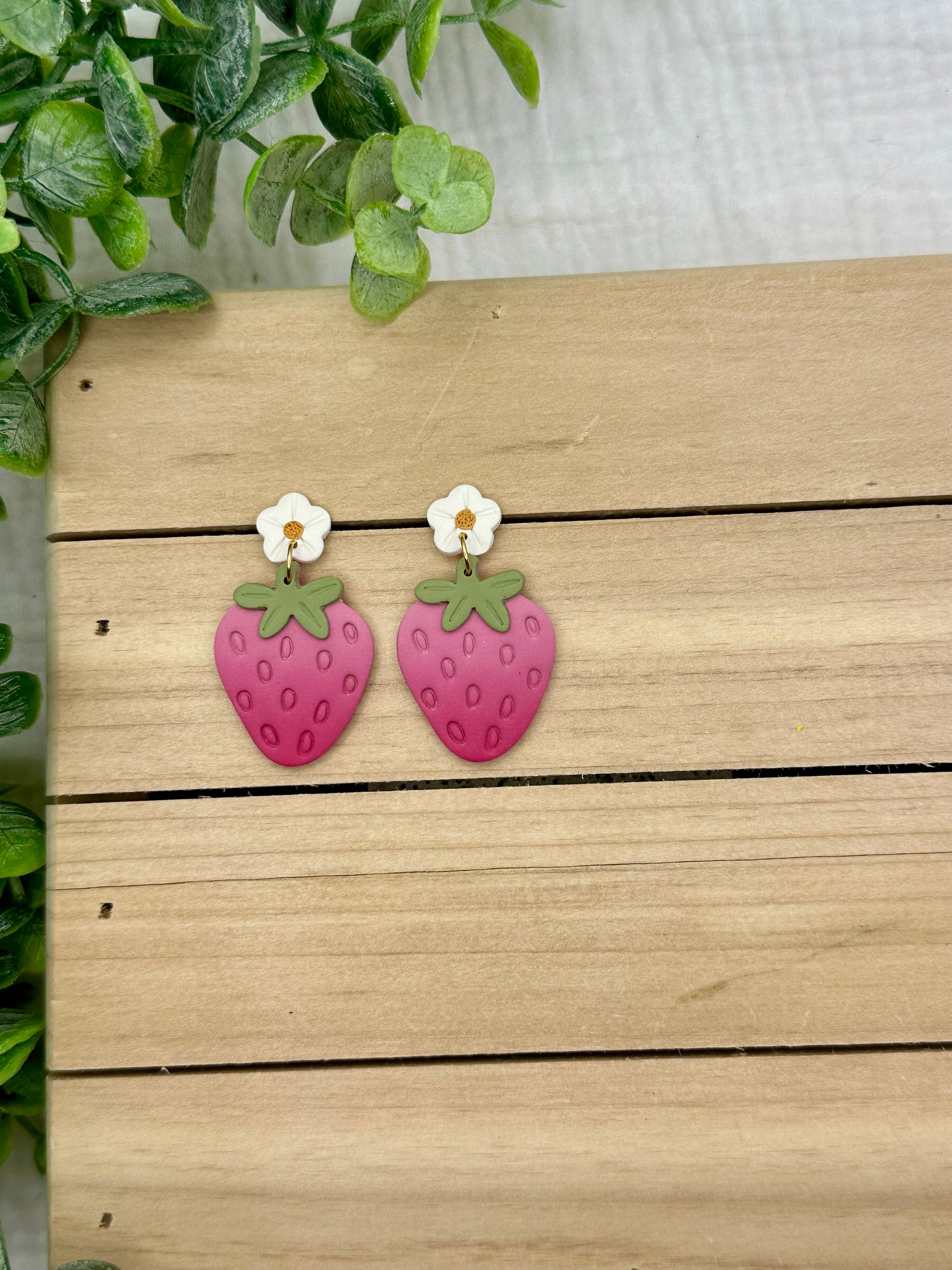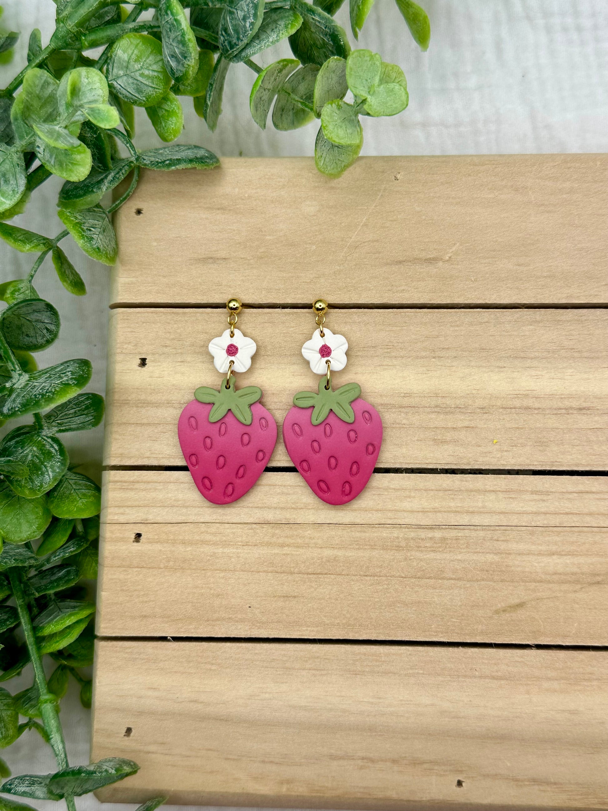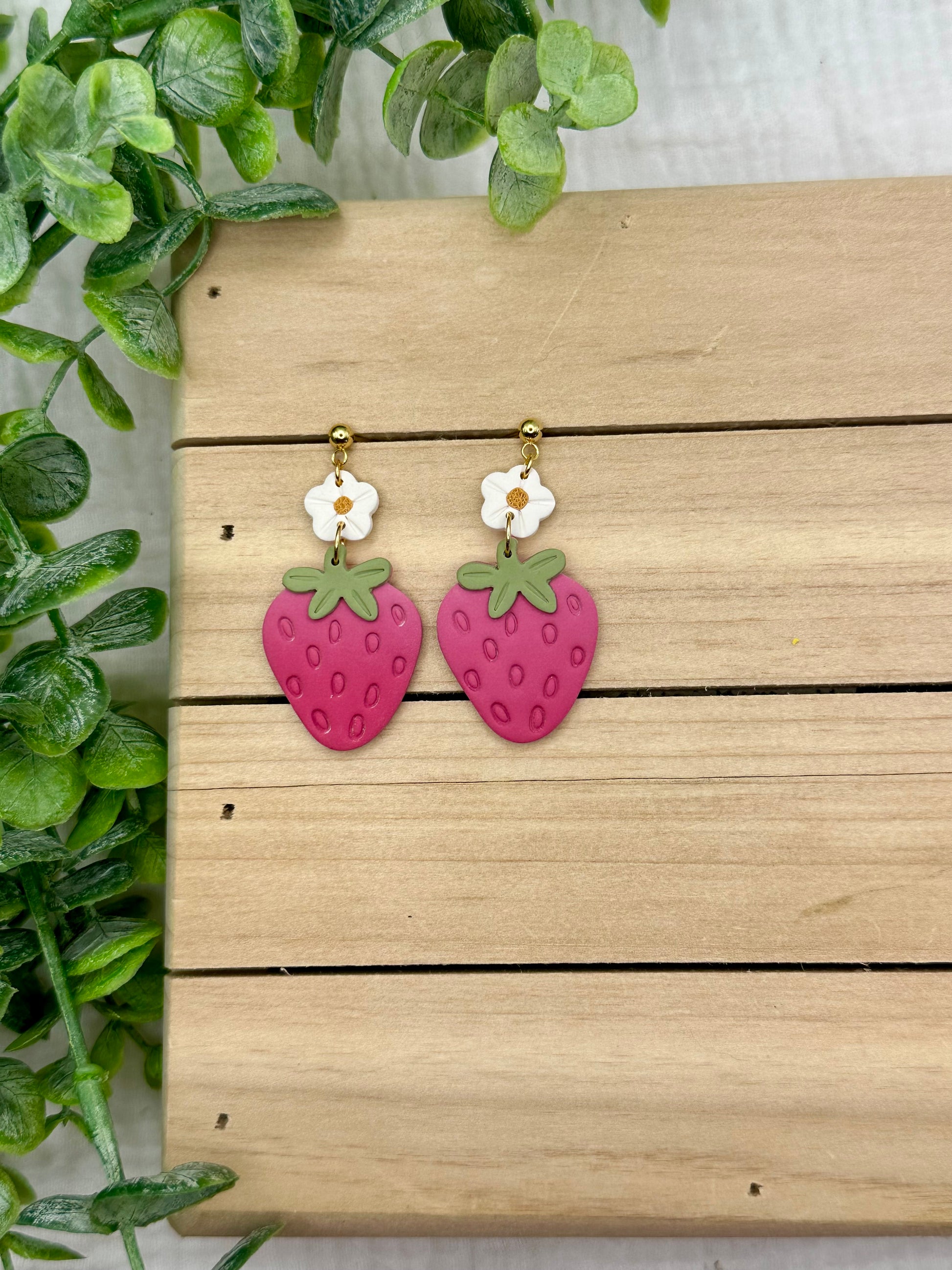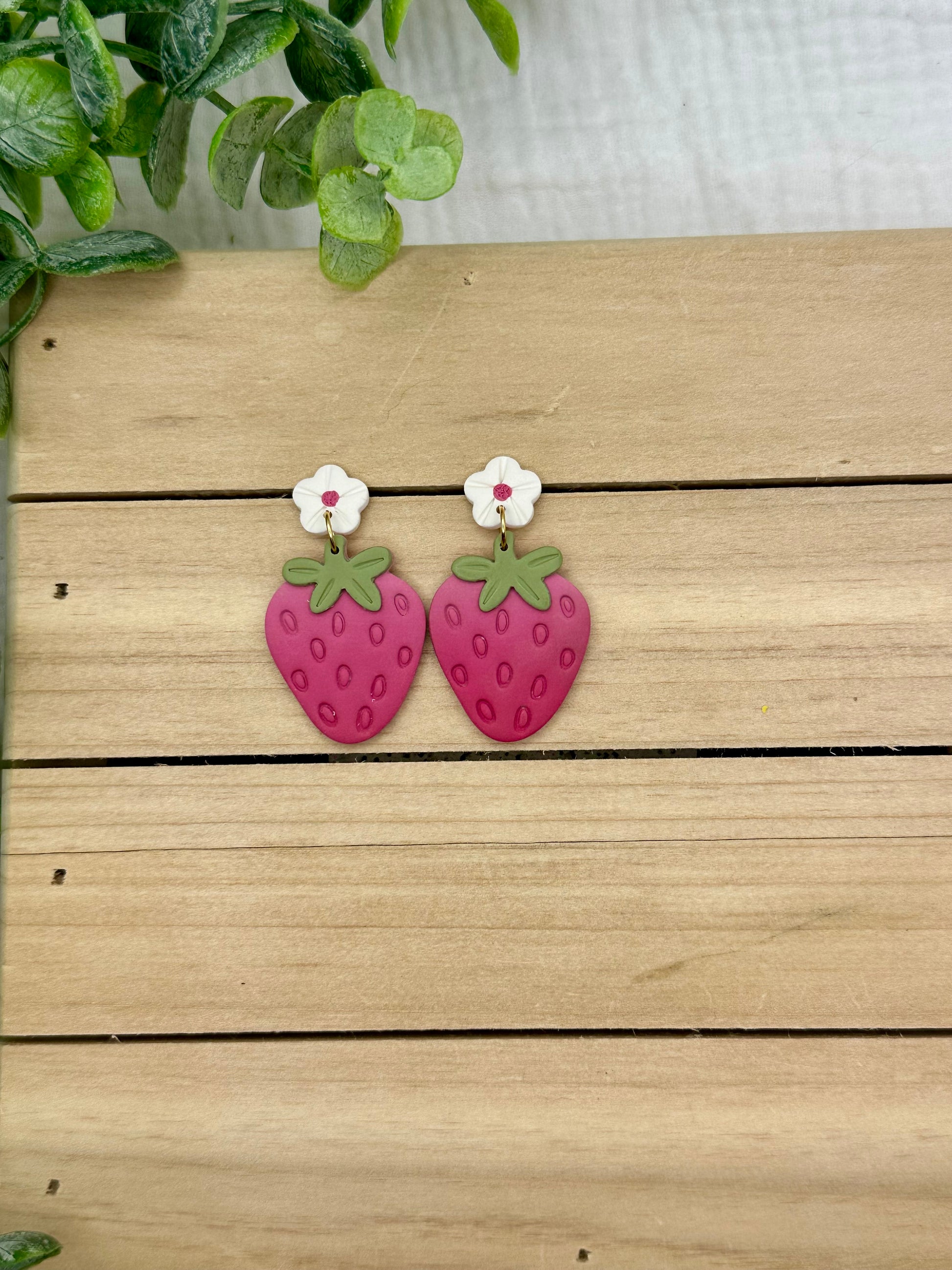 Handmade polymer clay earrings. All on hypoallergenic surgical grade steel findings. Pink Strawberry Dangles, Choose between flower topped of hook