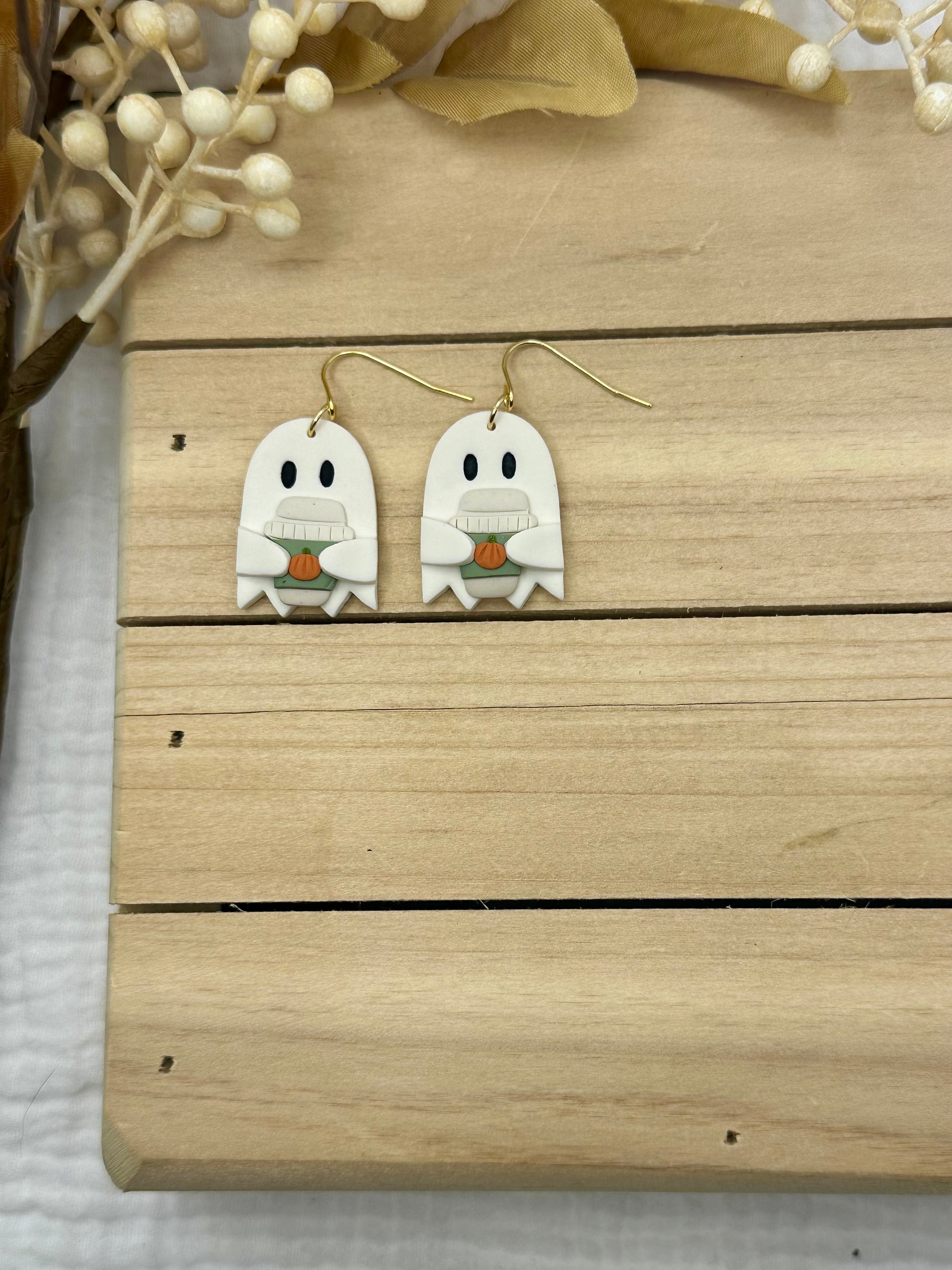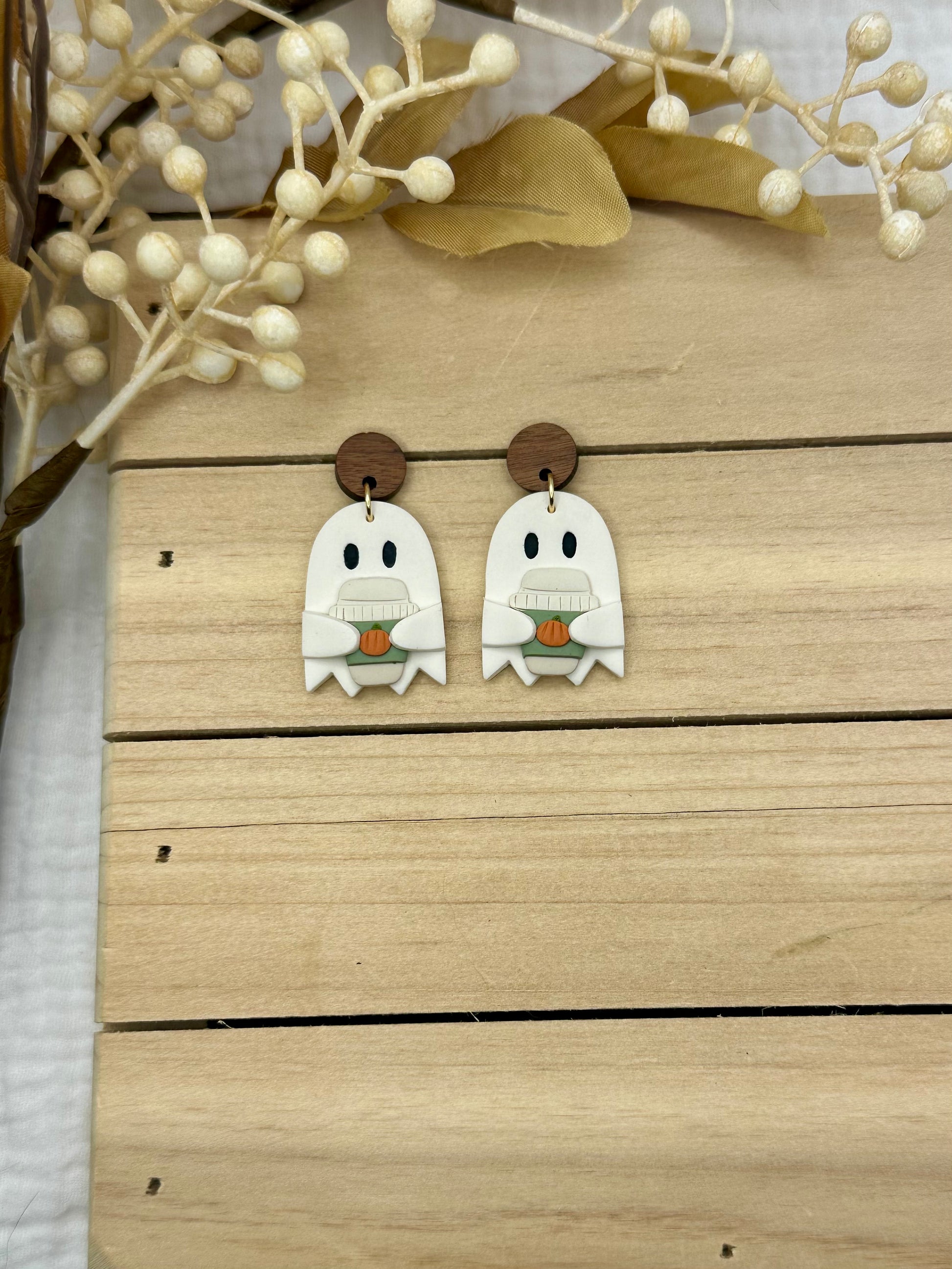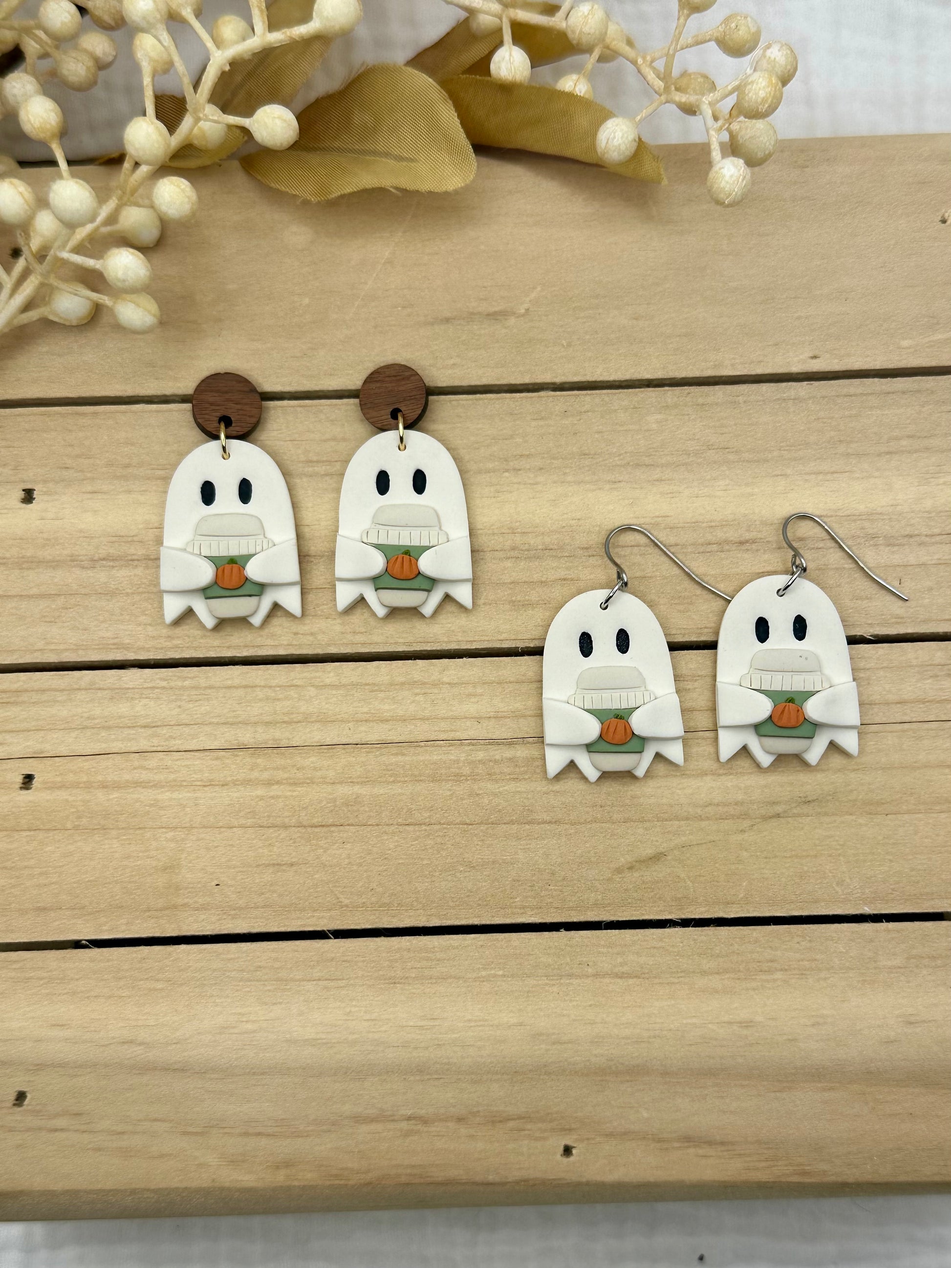 Handmade polymer clay earrings. All on hypoallergenic surgical grade steel findings. Ghosts holding PSL cup available on wooden post or gold or silver hook