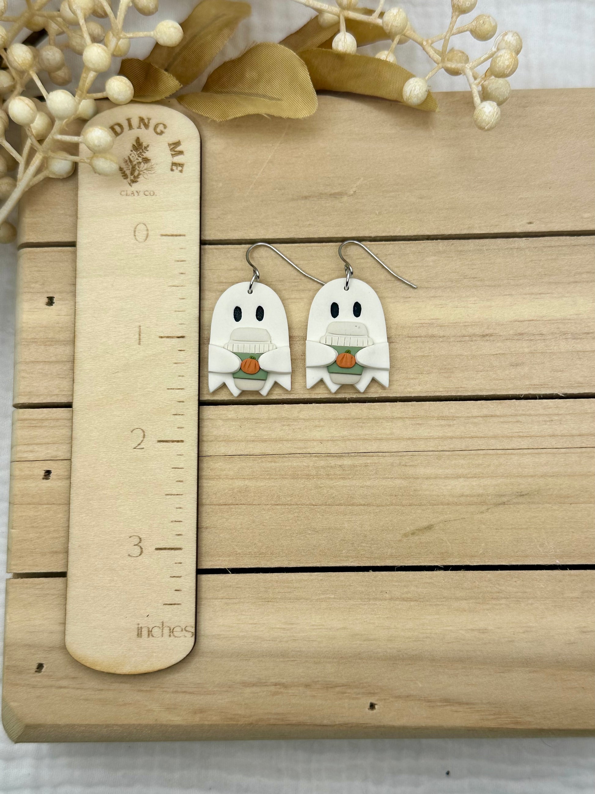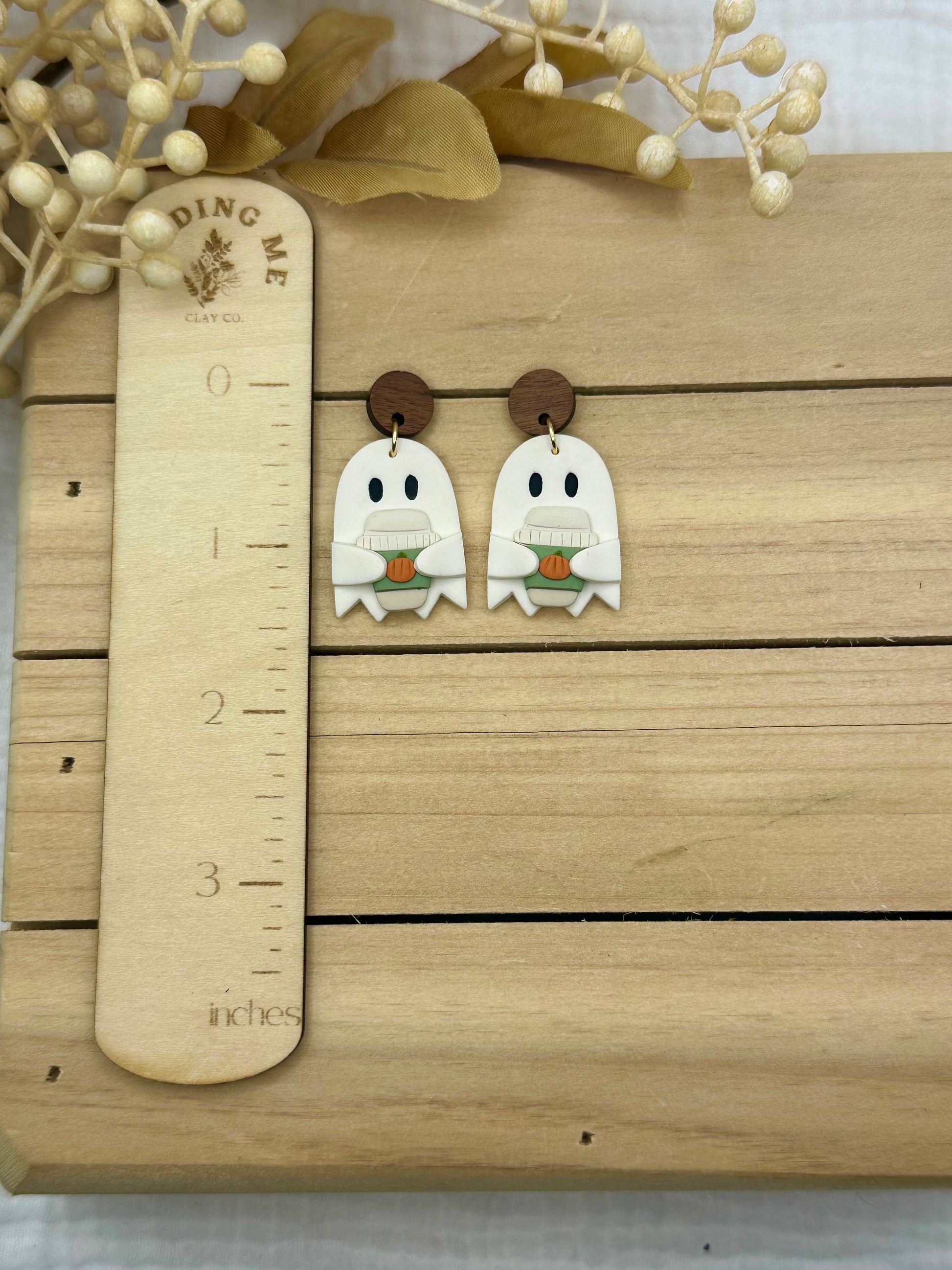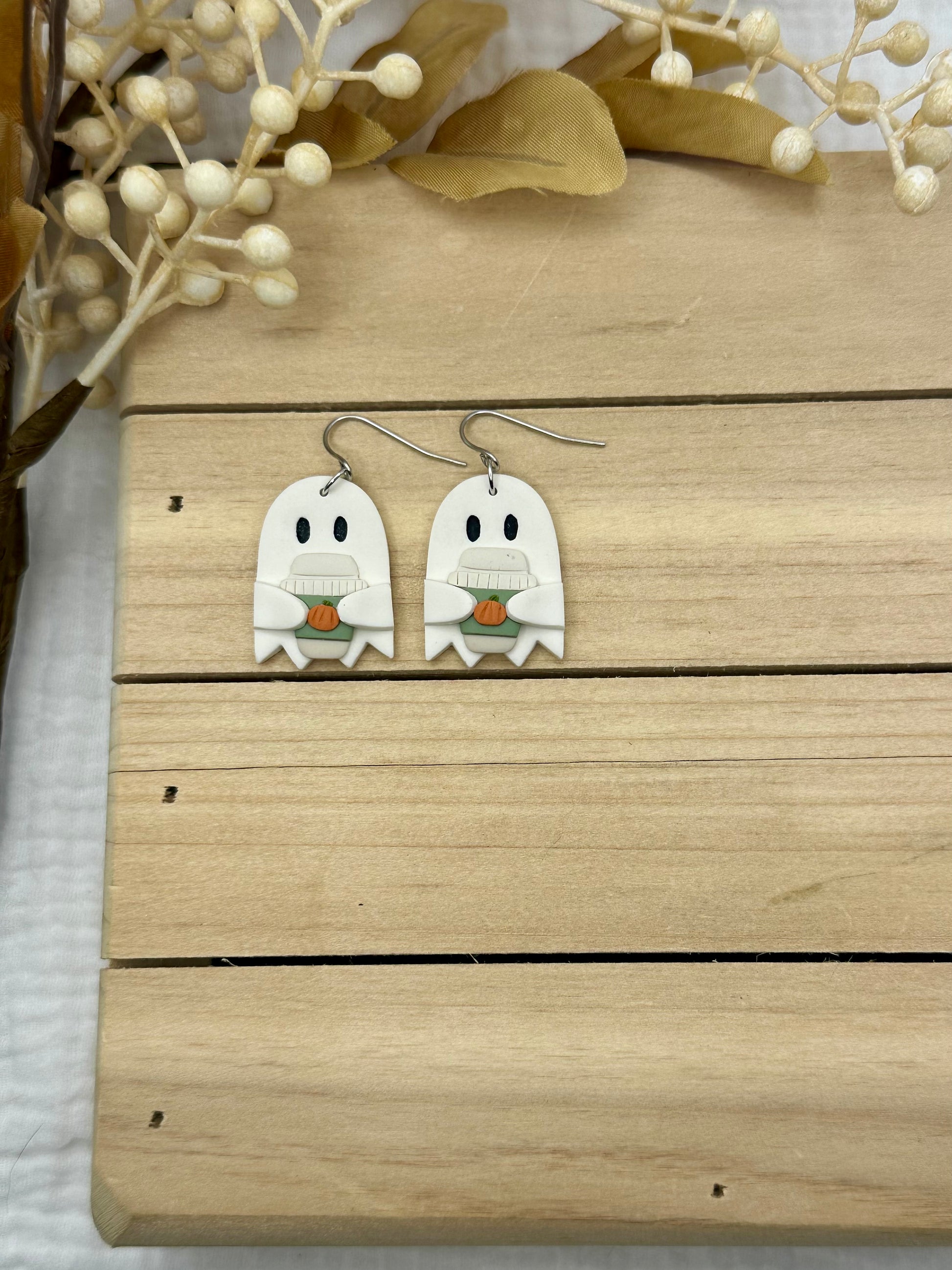 Handmade polymer clay earrings. All on hypoallergenic surgical grade steel findings. Ghosts holding PSL cup available on wooden post or gold or silver hook