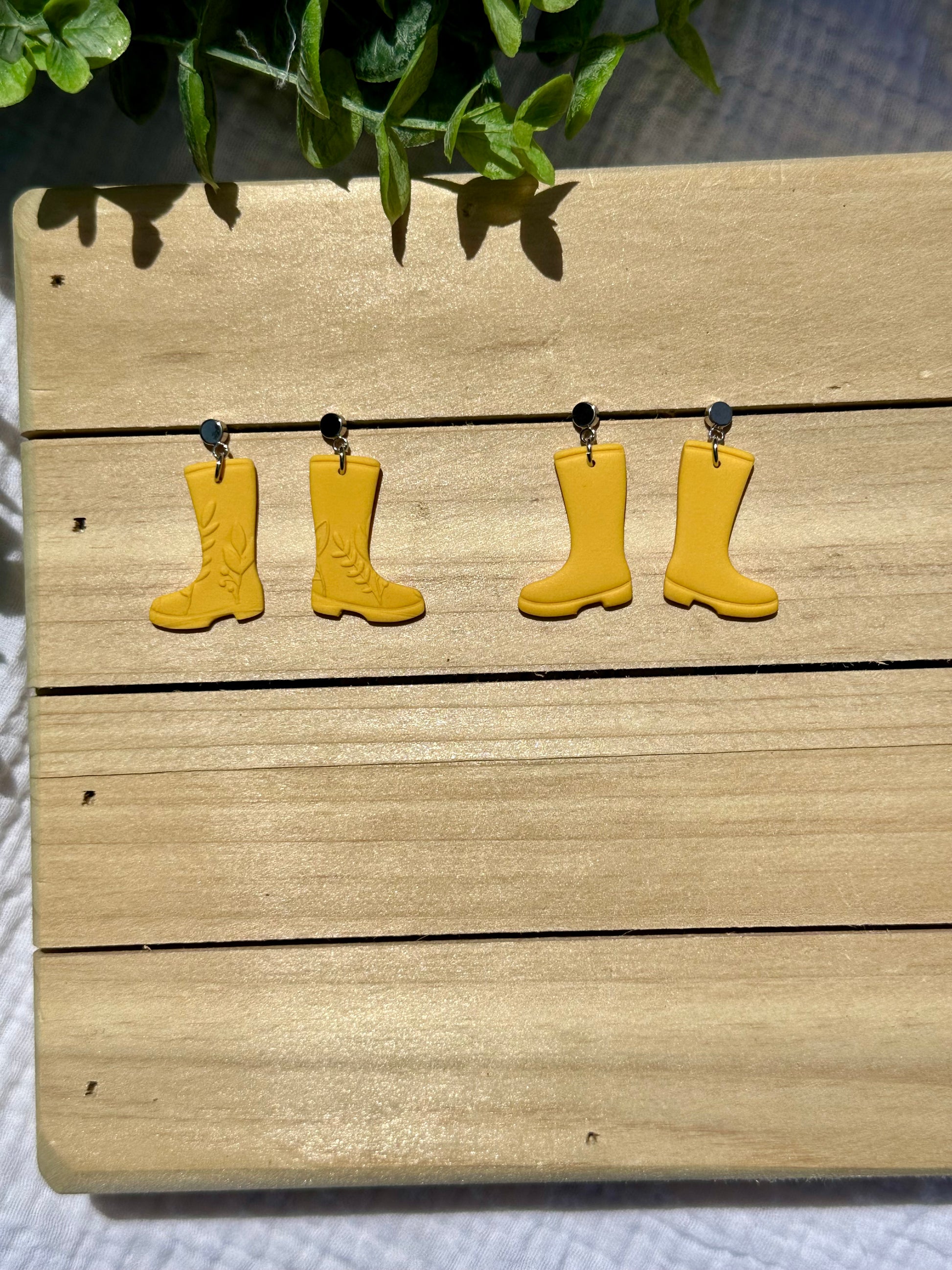 Handmade polymer clay earrings. All on hypoallergenic surgical grade steel findings. Rain boot dangles on Silver flat post available Plain or with Floral texture