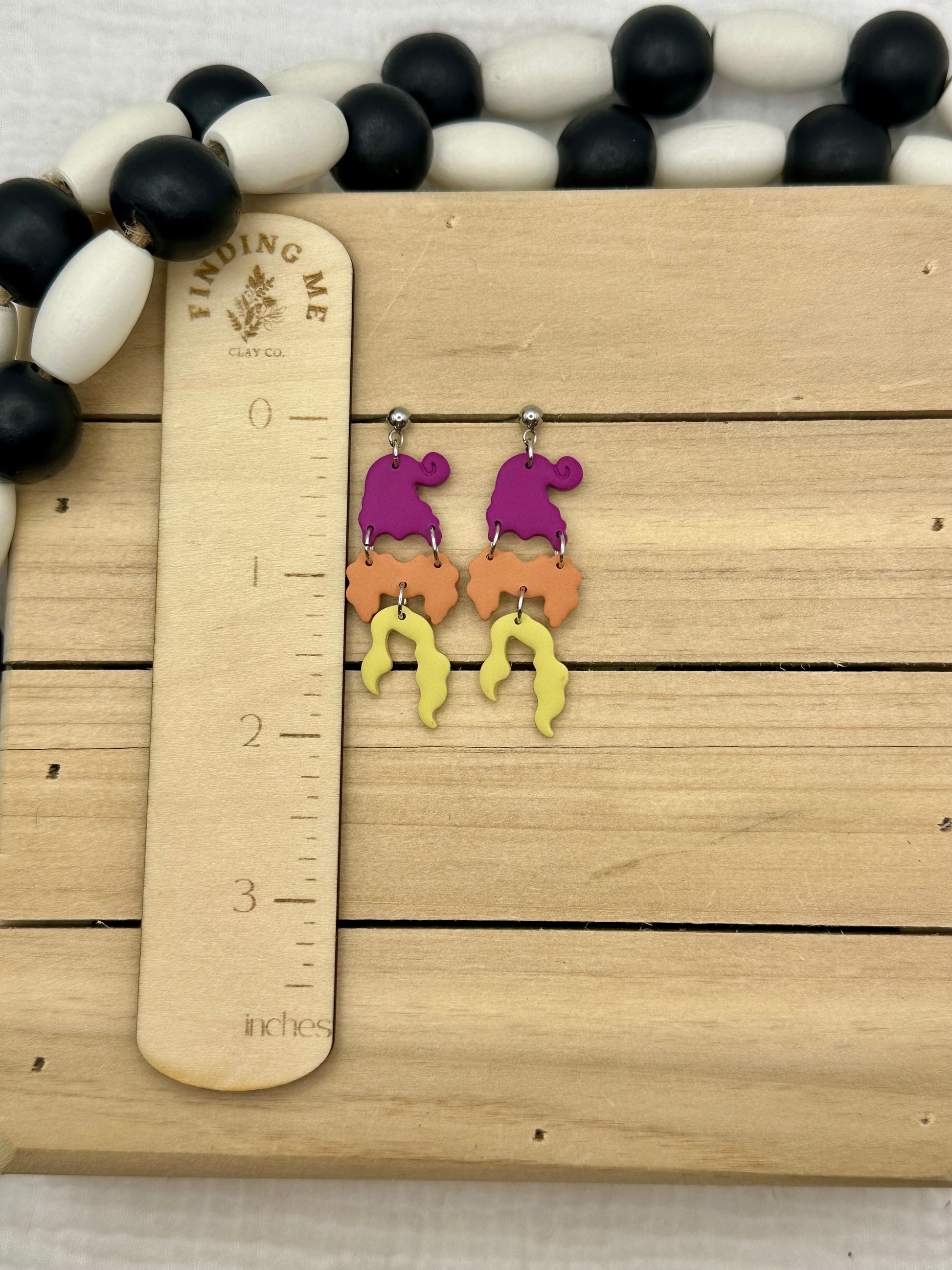 Handmade polymer clay earrings. All on hypoallergenic surgical grade steel findings. Stacked witches hair dangles on hooks and ball posts