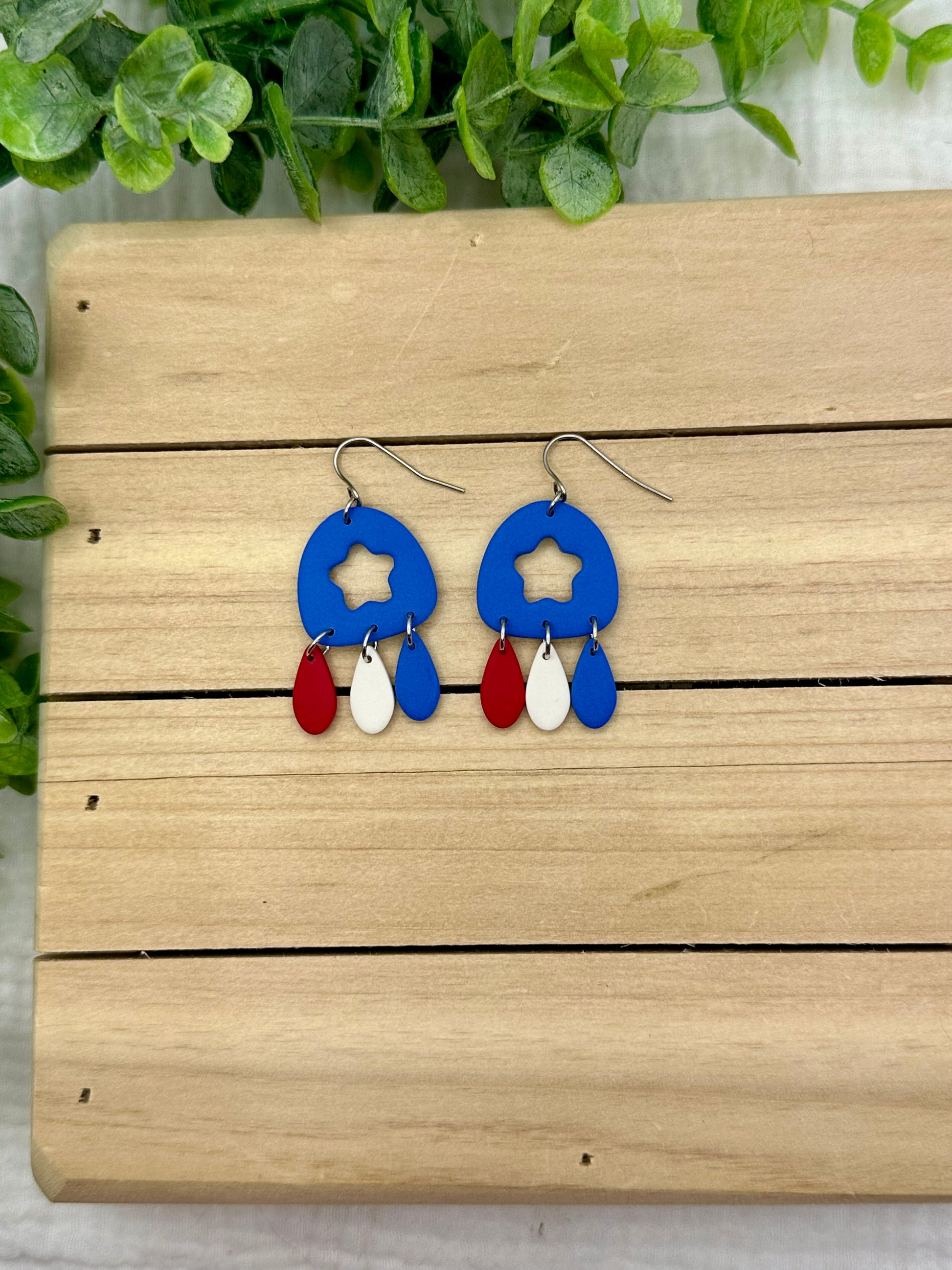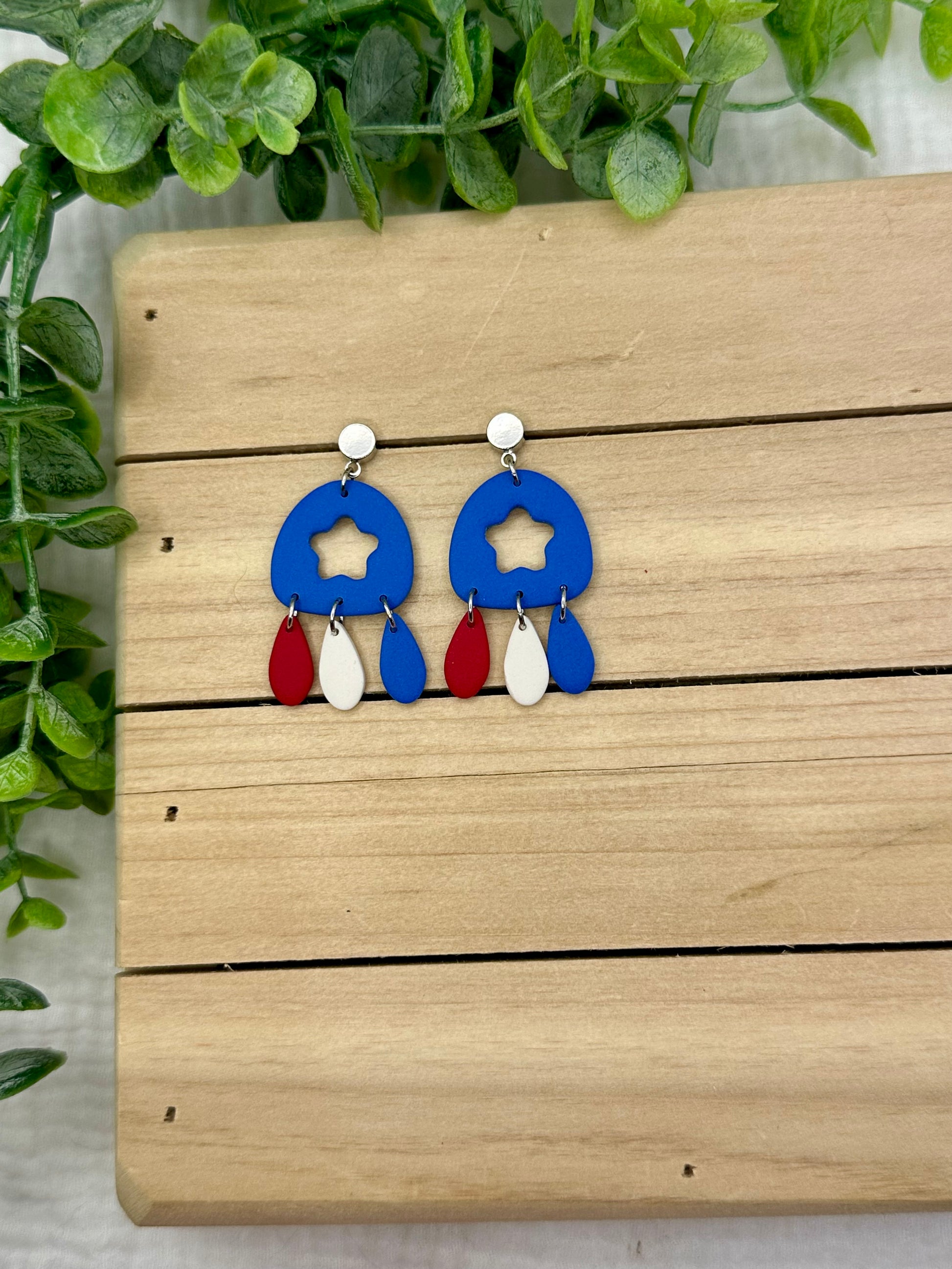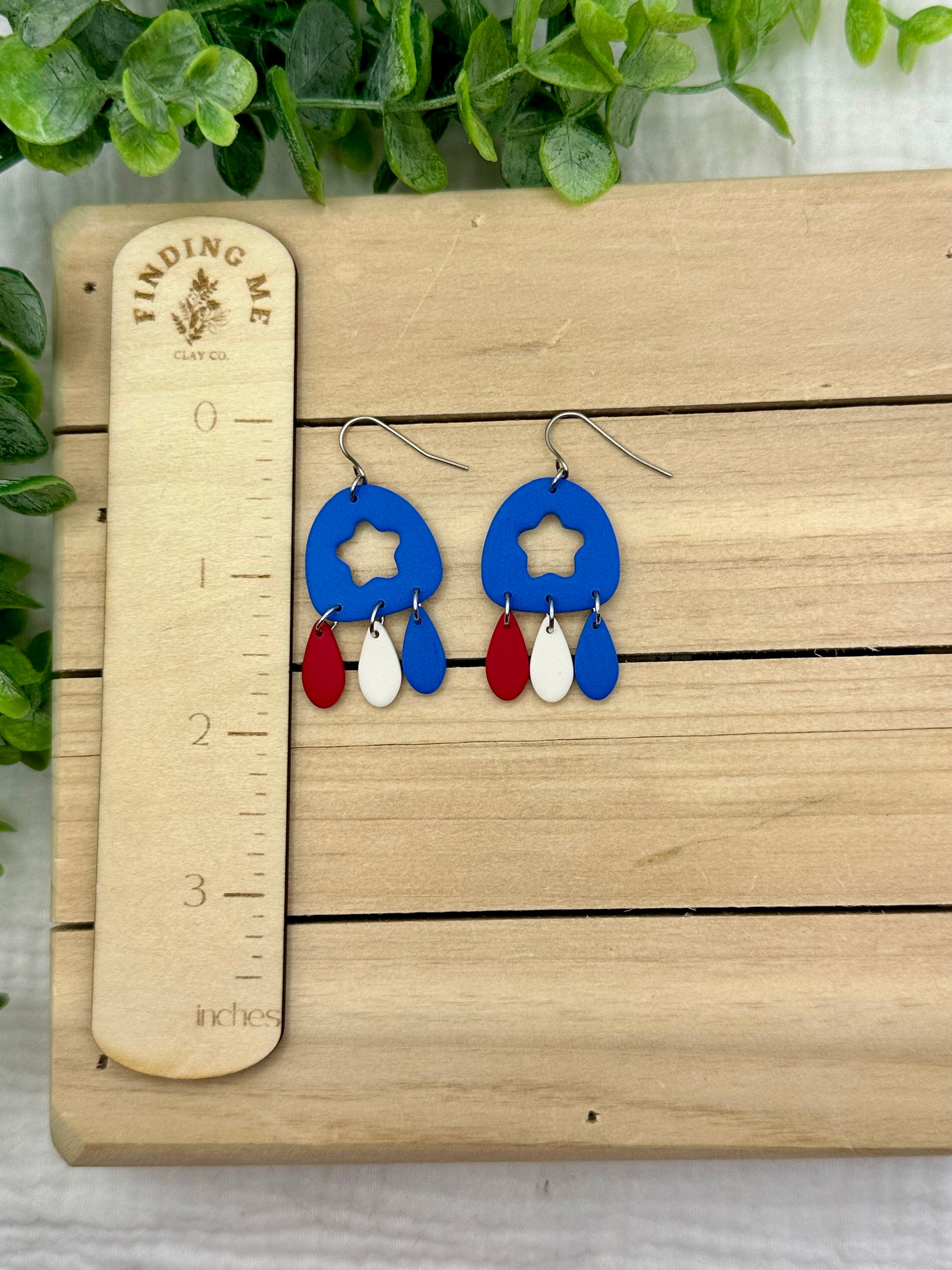 Handmade polymer clay earrings. All on hypoallergenic surgical grade steel findings. Star Dangles with red white and blue on surgical steel hook or flat post