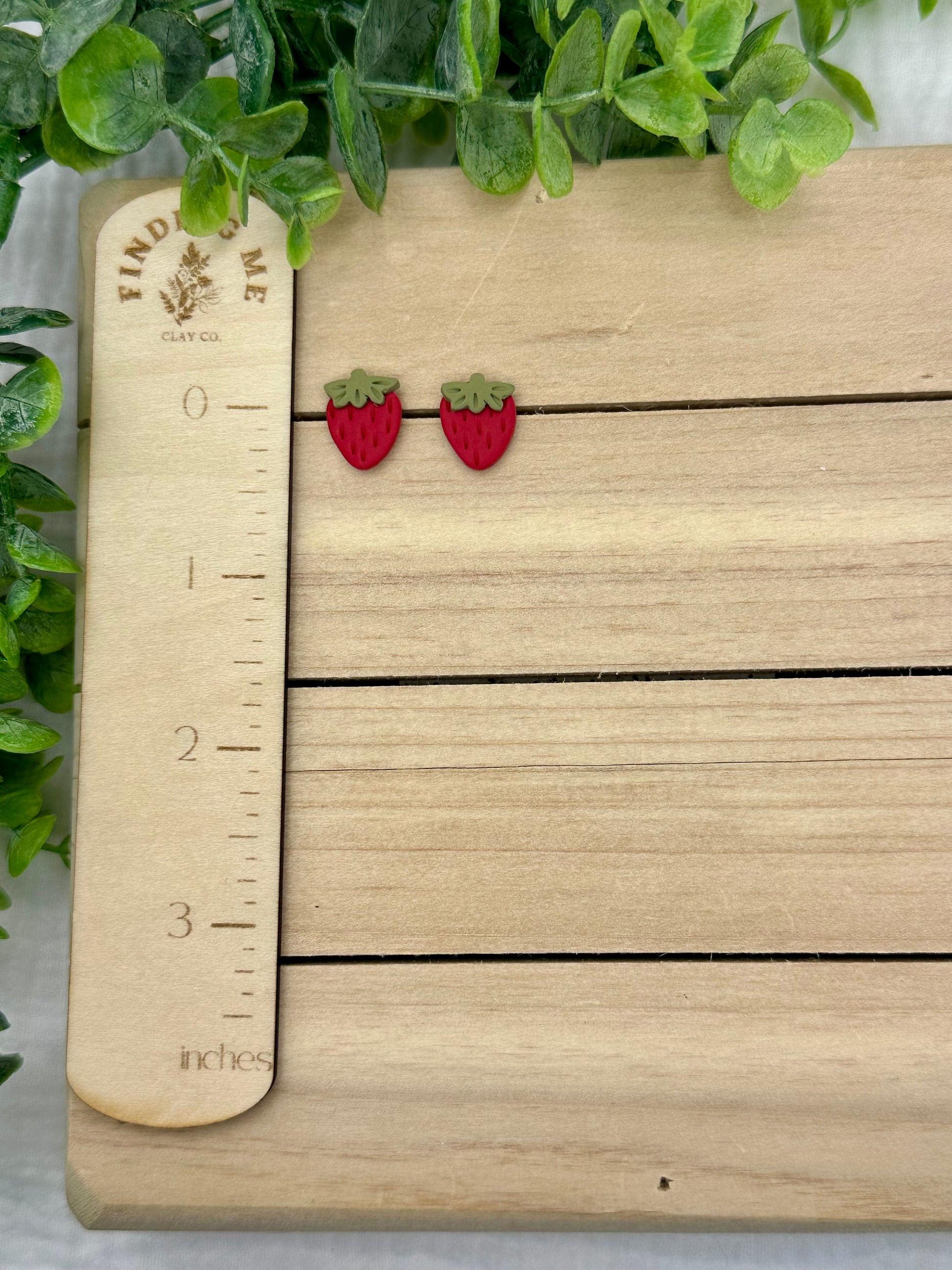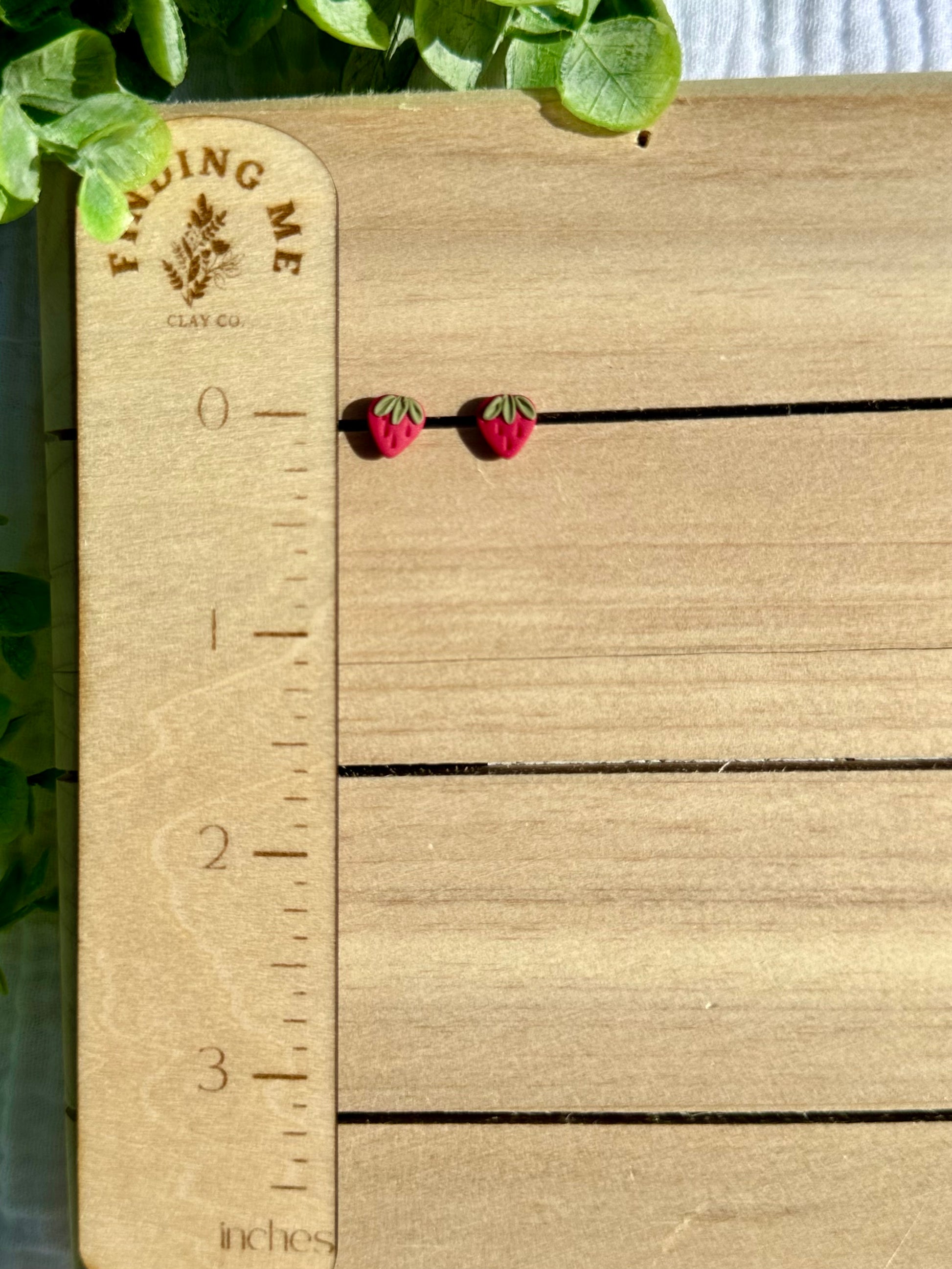 Handmade polymer clay earrings. All on hypoallergenic surgical grade steel findings. Strawberry dangles on hooks or wooden posts as well as strawberry stud and mini strawberry studs