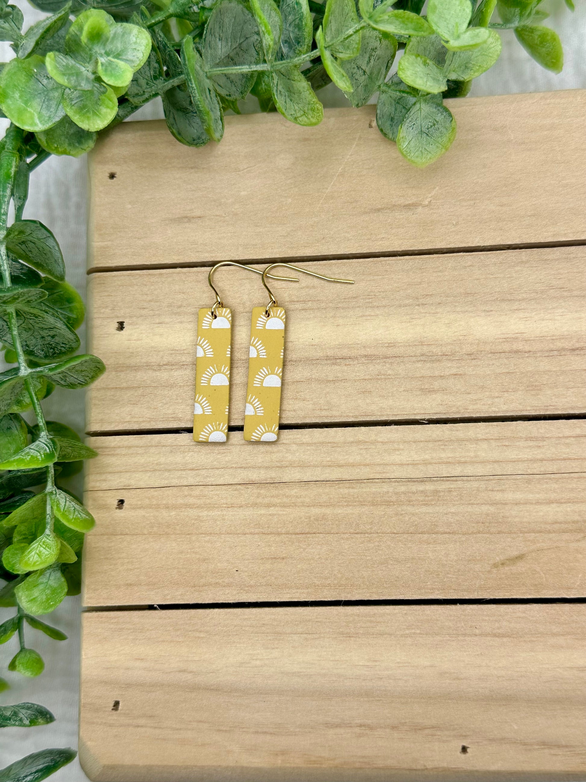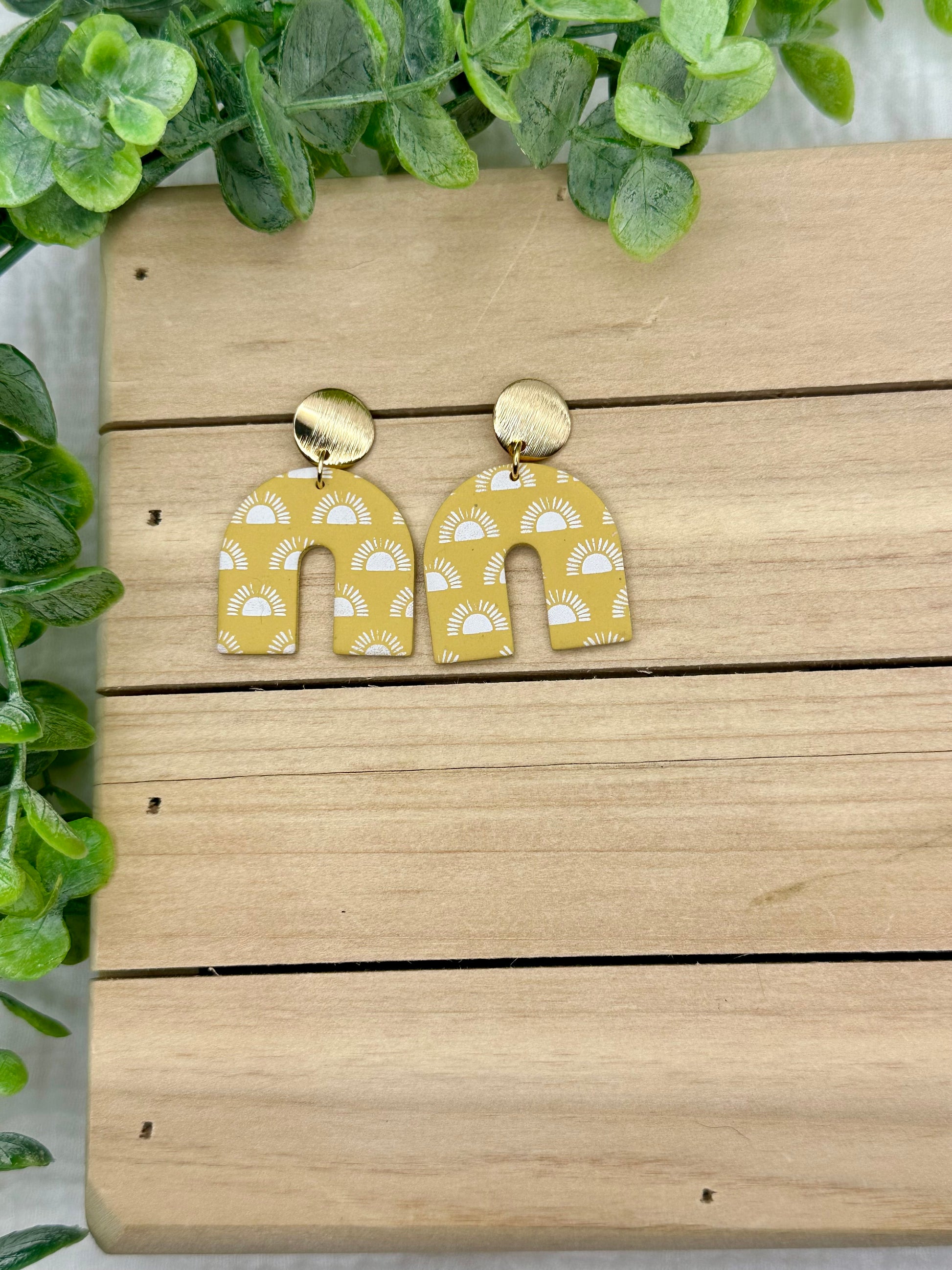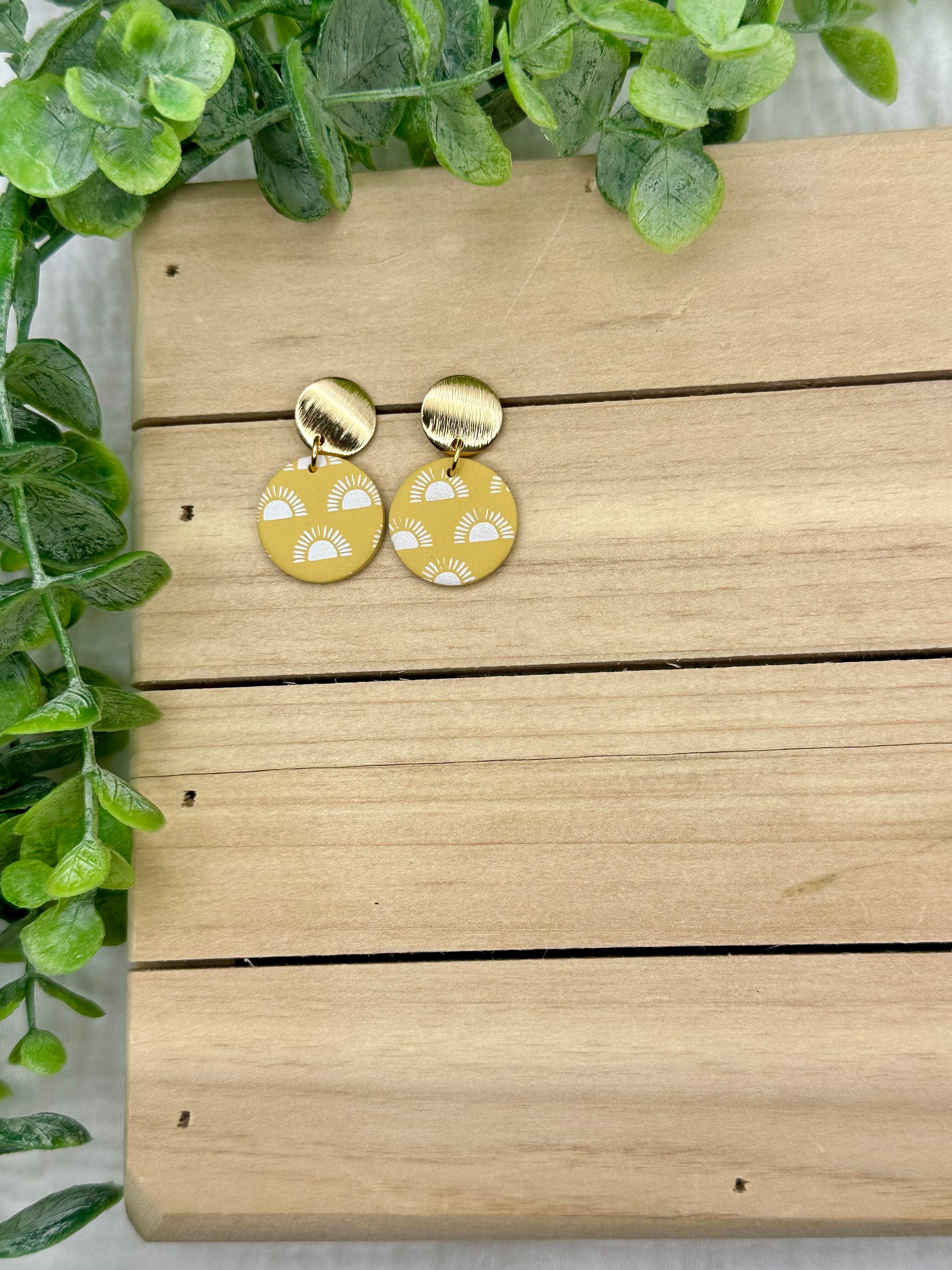 Handmade polymer clay earrings. All on hypoallergenic surgical grade steel findings. Sun burst print on yellow with gold coated findings.