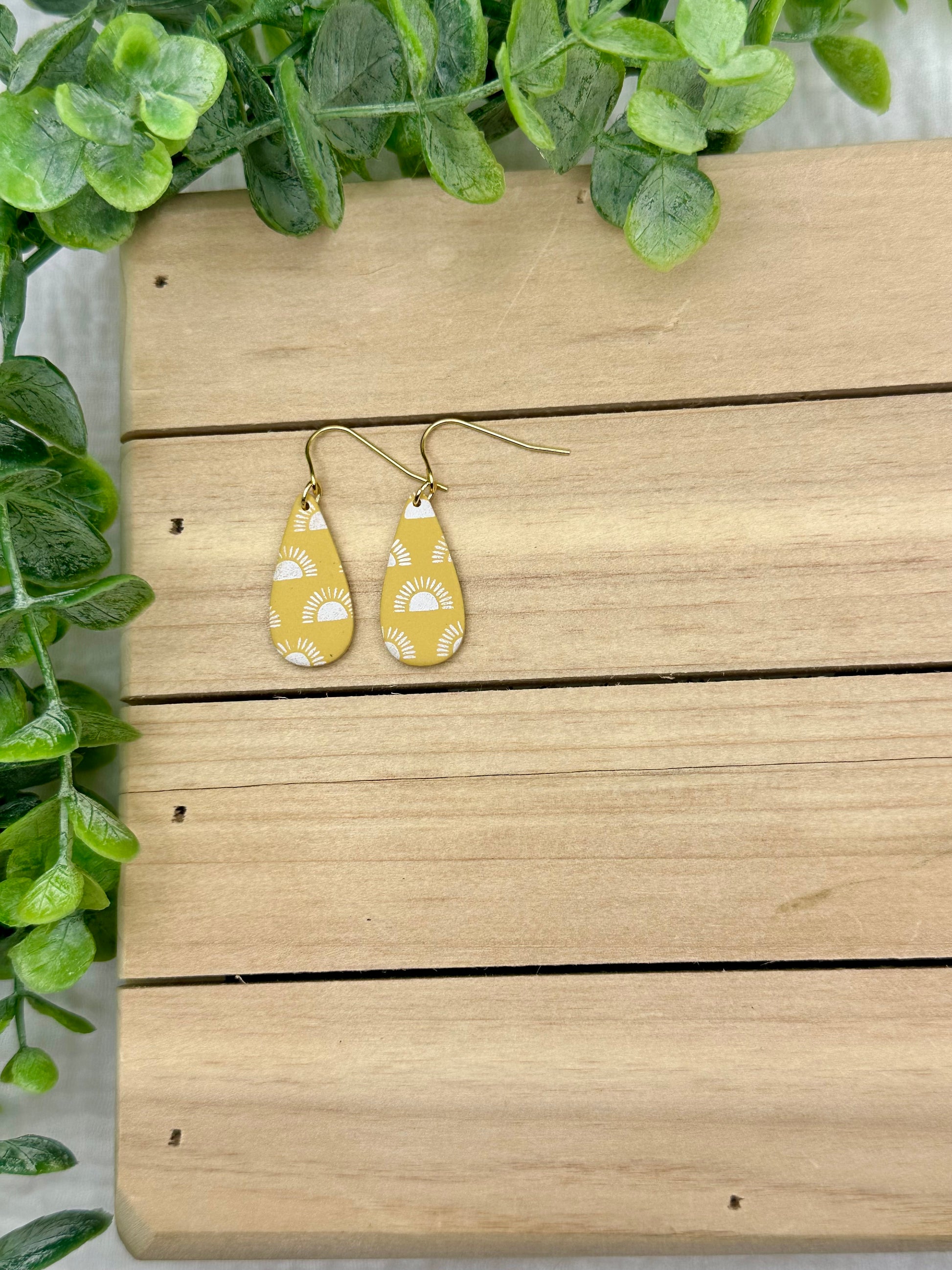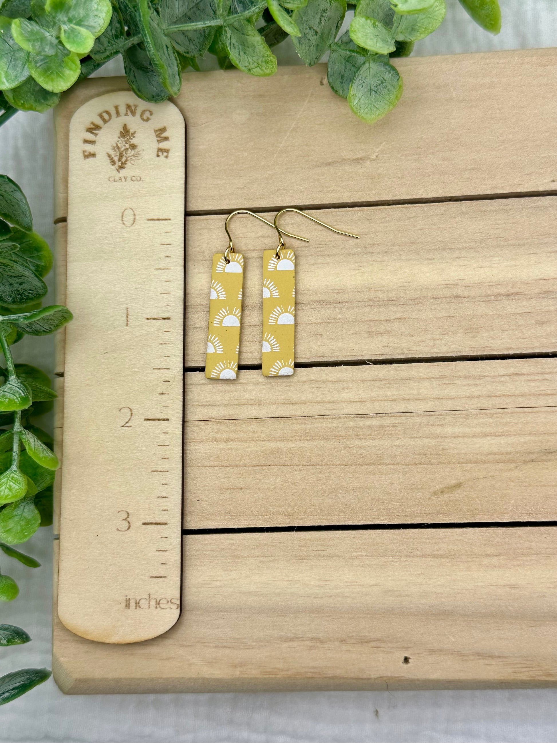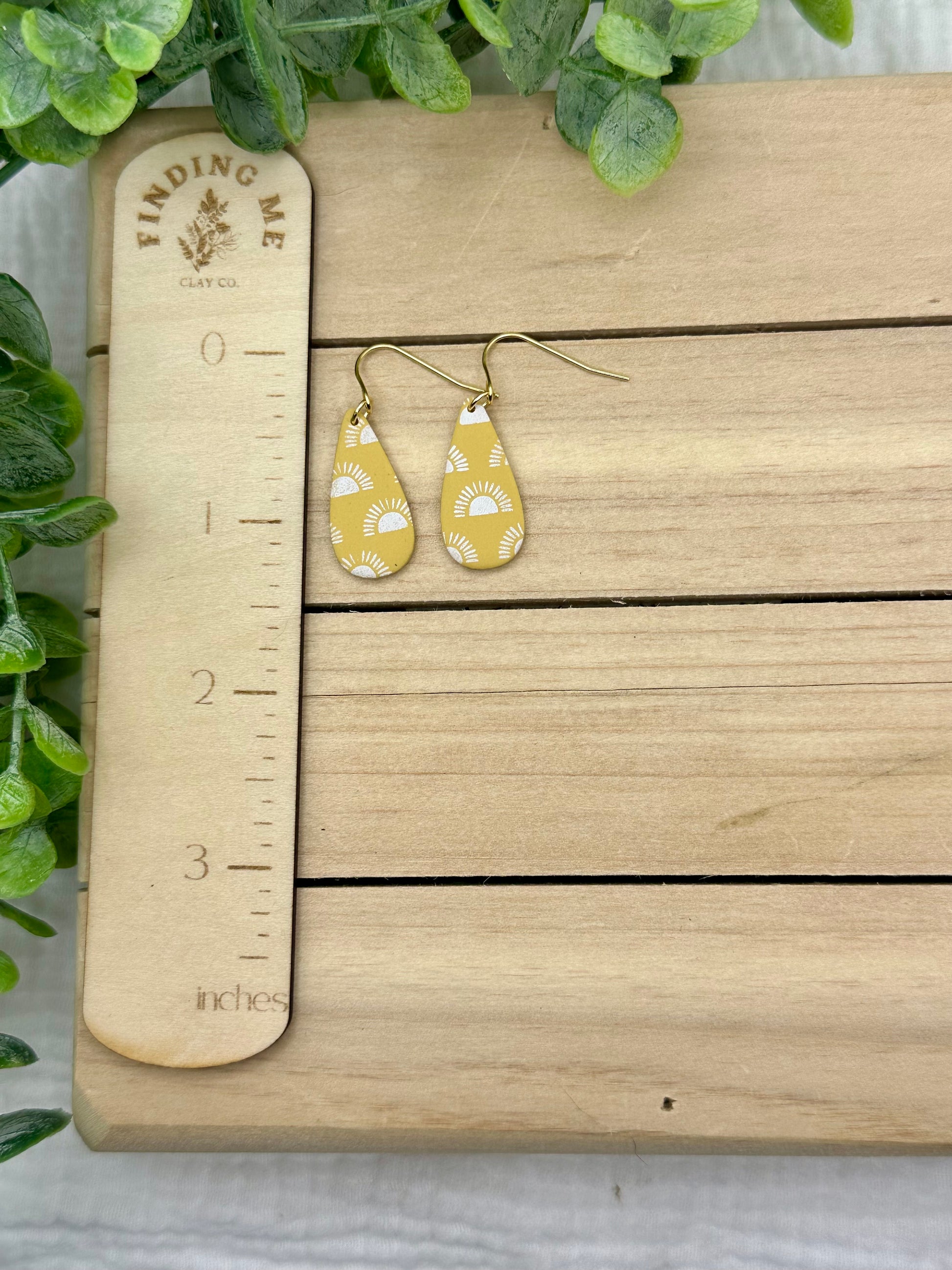 Handmade polymer clay earrings. All on hypoallergenic surgical grade steel findings. Sun burst print on yellow with gold coated findings.