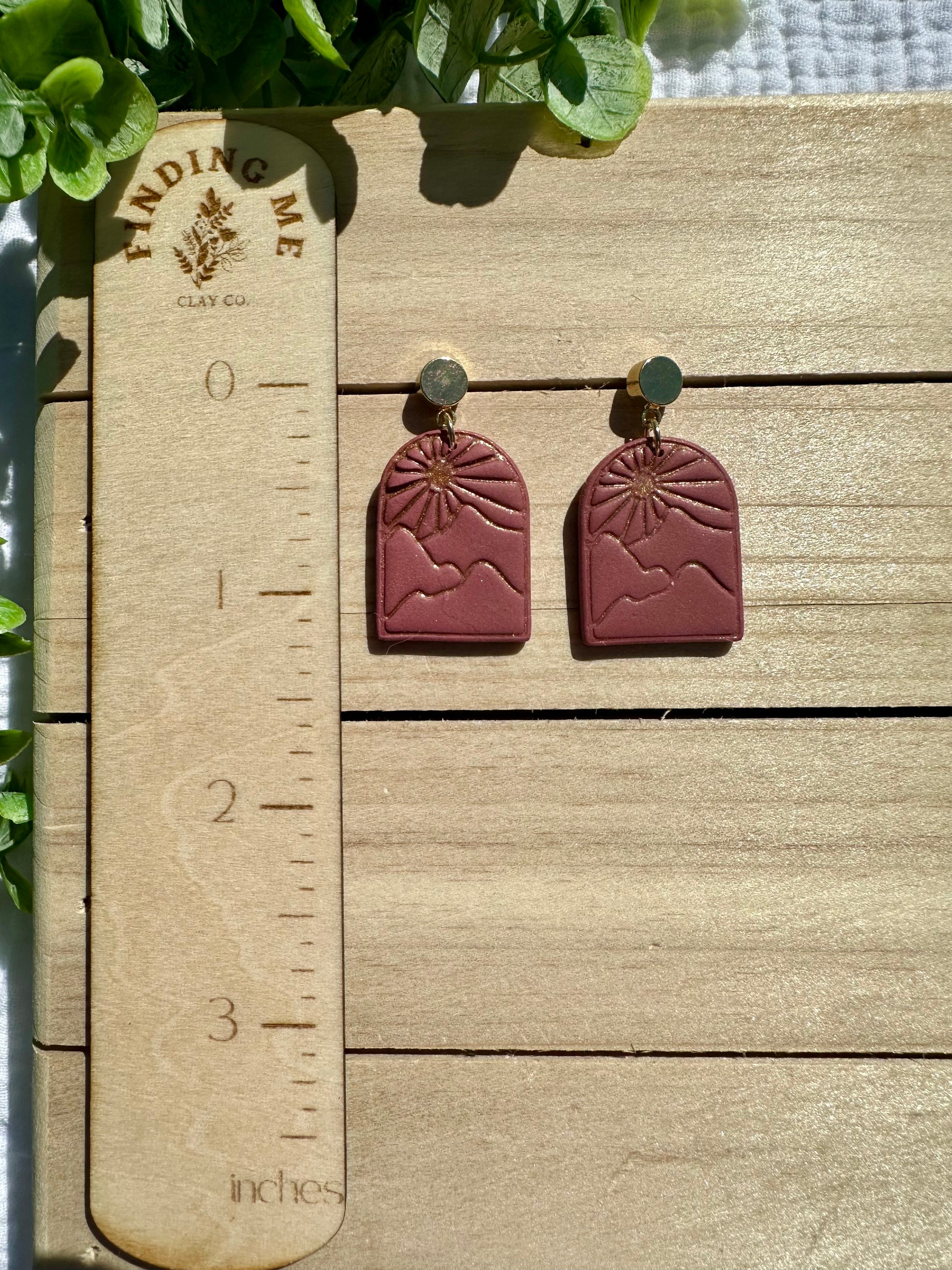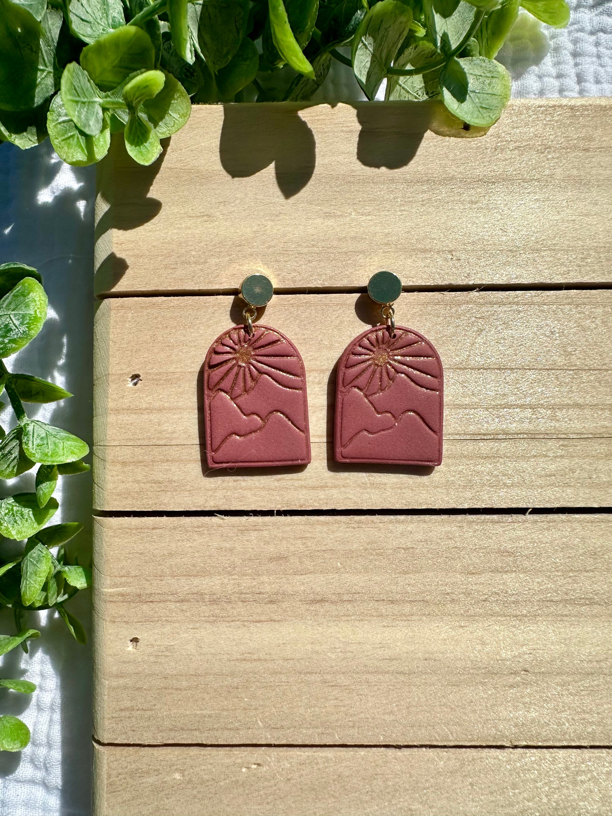 Handmade polymer clay earrings. All on hypoallergenic surgical grade steel findings. Sun rise grouted with gold on gold flat post