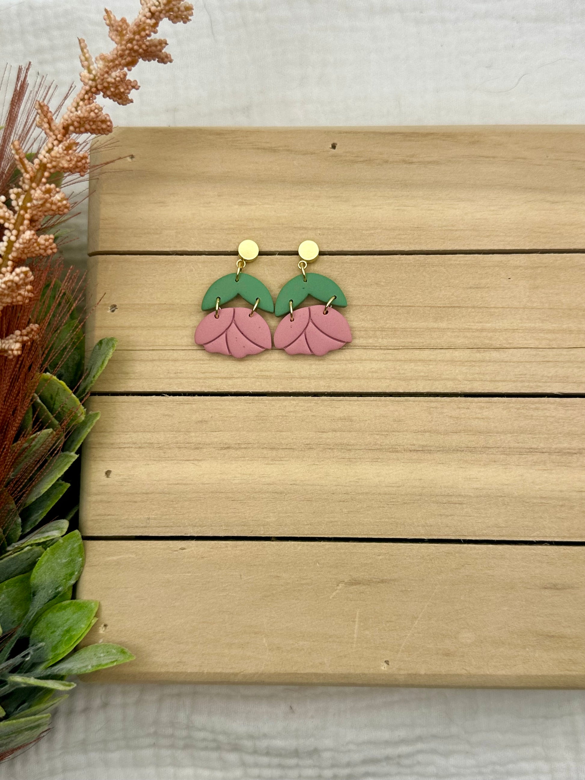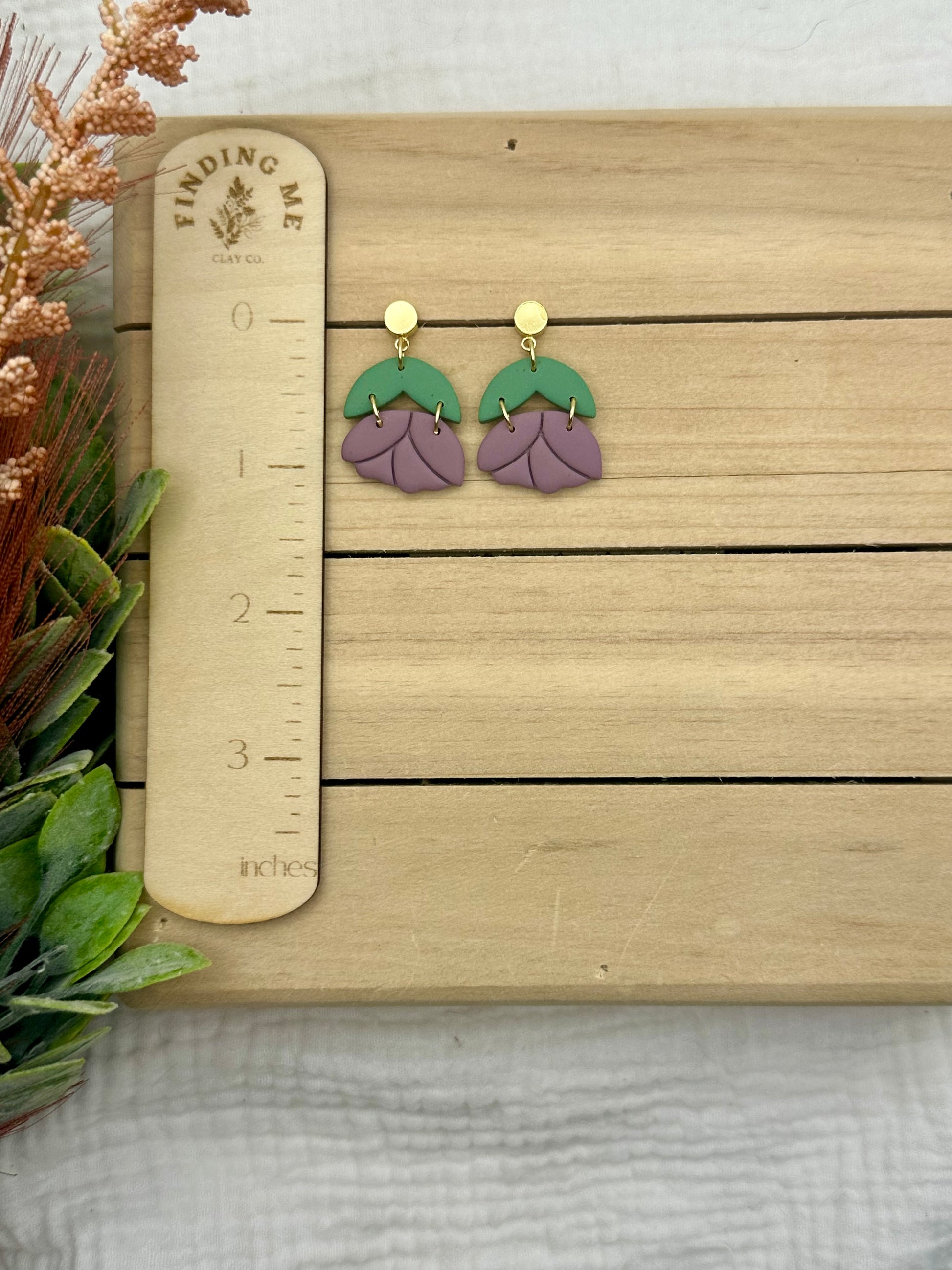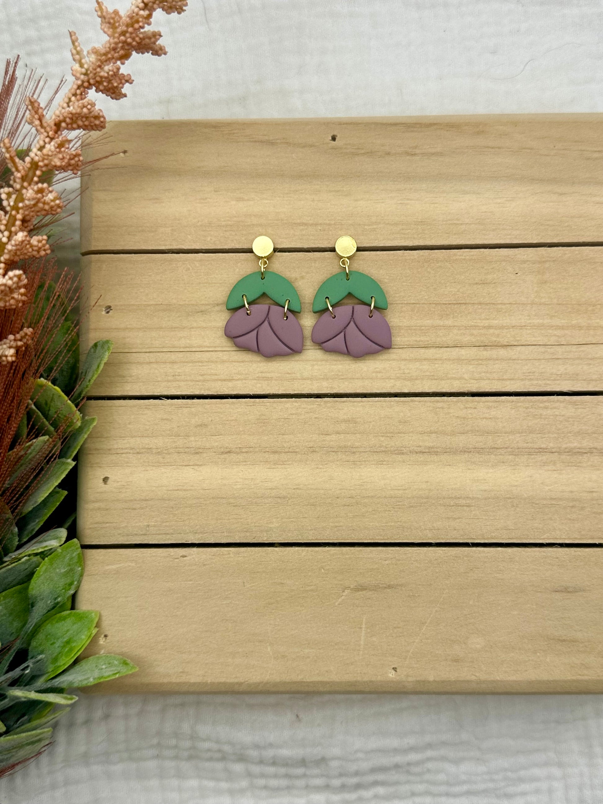 Handmade polymer clay earrings. All on hypoallergenic surgical grade steel findings. Hanging tulip dangles on gold coated findings in both dusty rose and purple.
