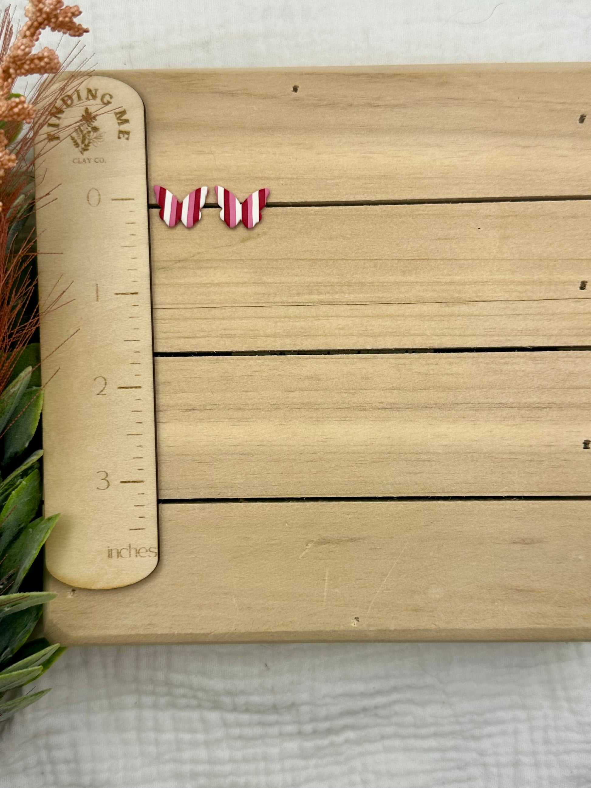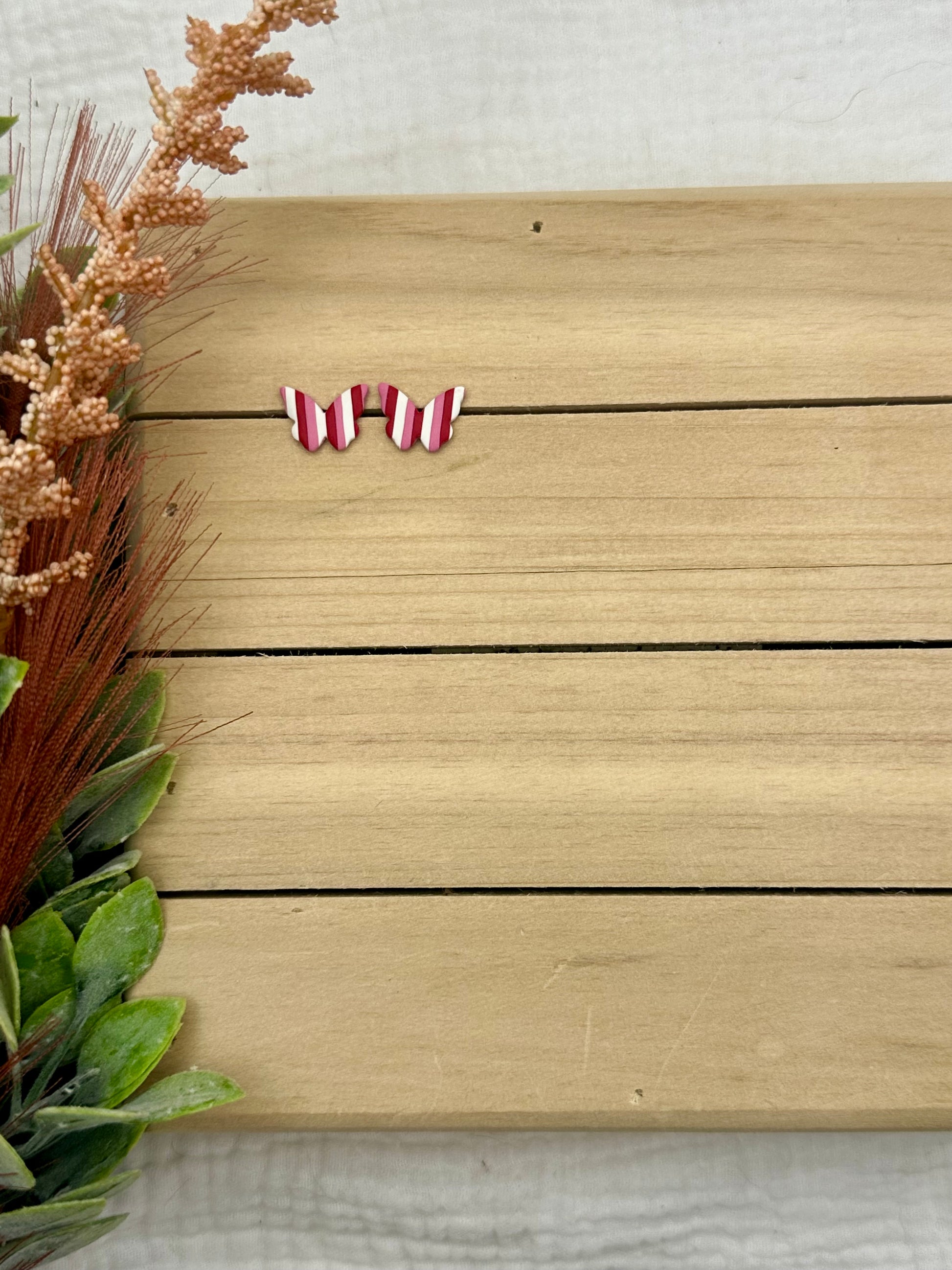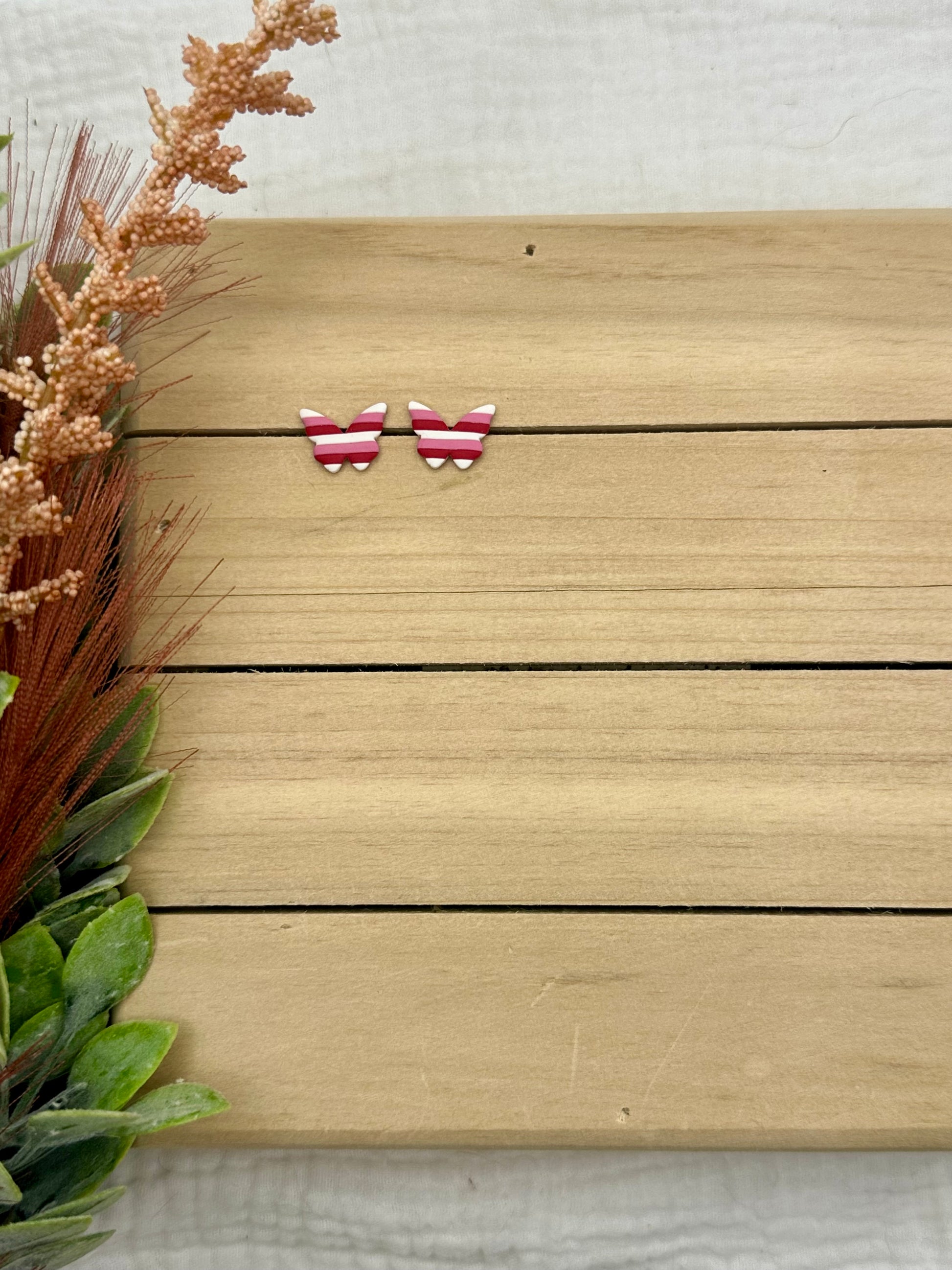 Handmade polymer clay earrings. All on hypoallergenic surgical grade steel findings. Valentines strips on wooden heart studs, as well as heart, circle and butterfly studs
