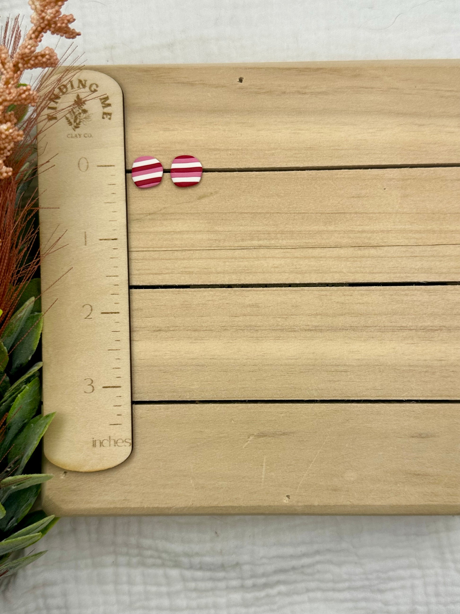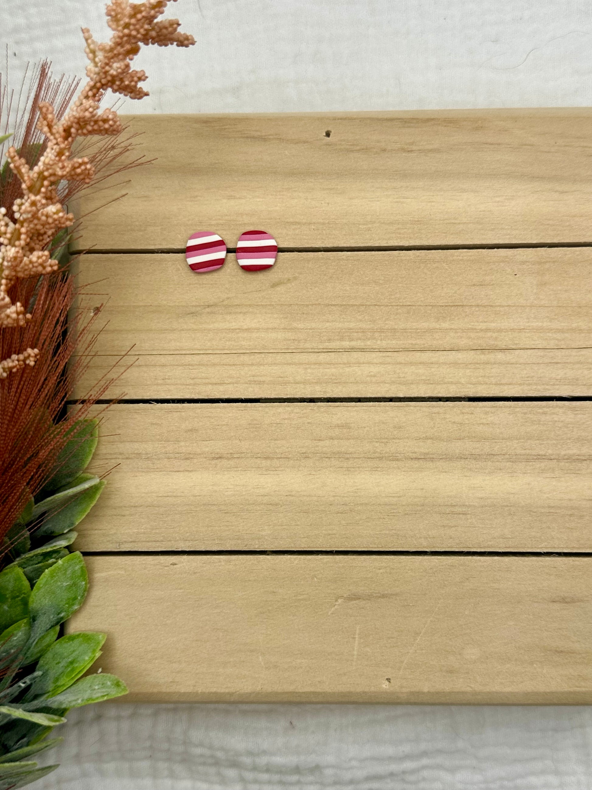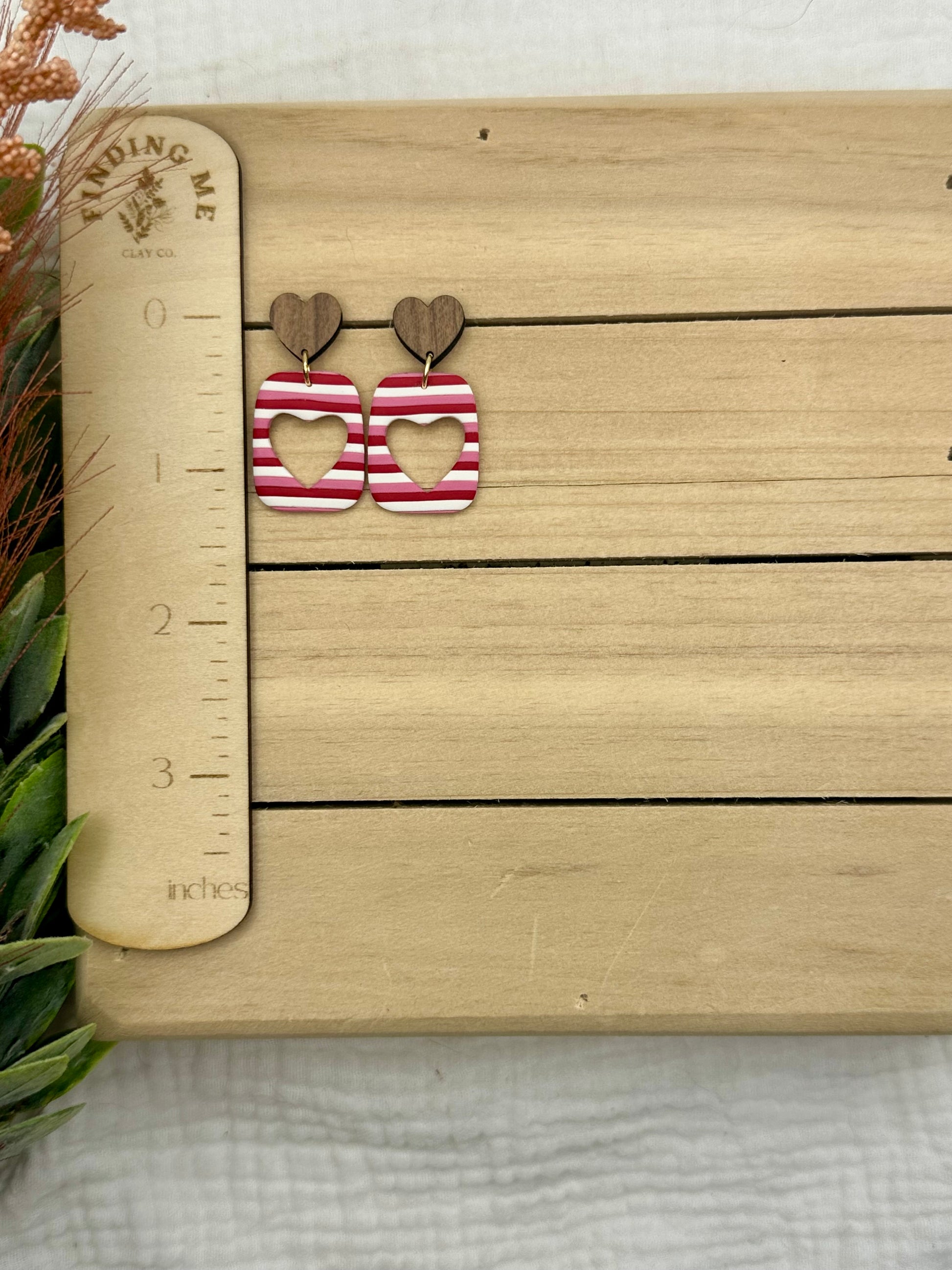 Handmade polymer clay earrings. All on hypoallergenic surgical grade steel findings. Valentines strips on wooden heart studs, as well as heart, circle and butterfly studs