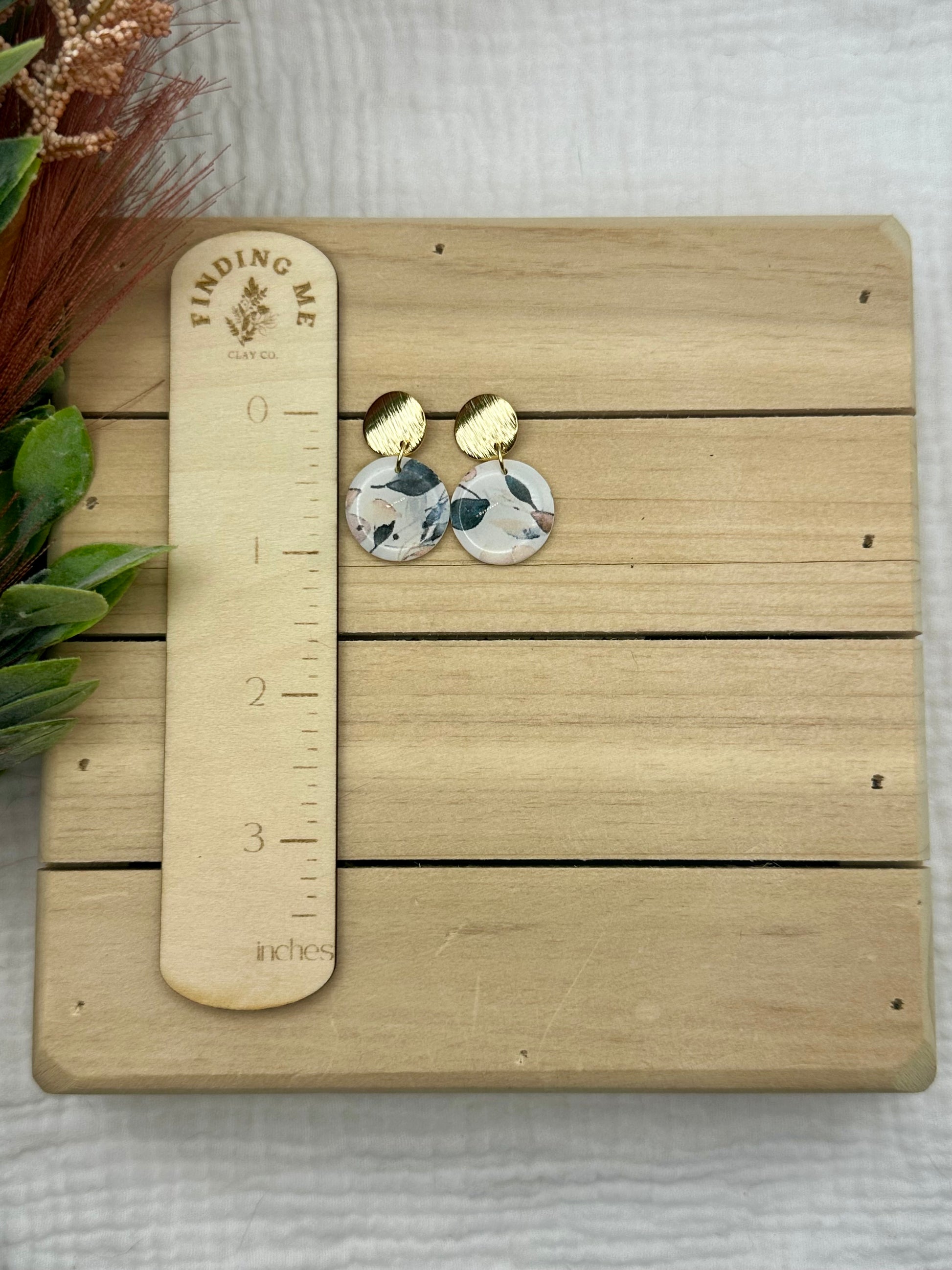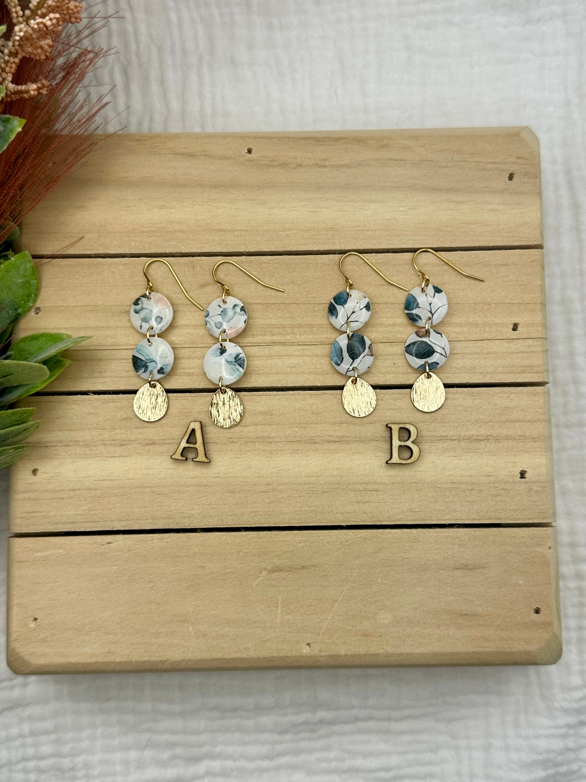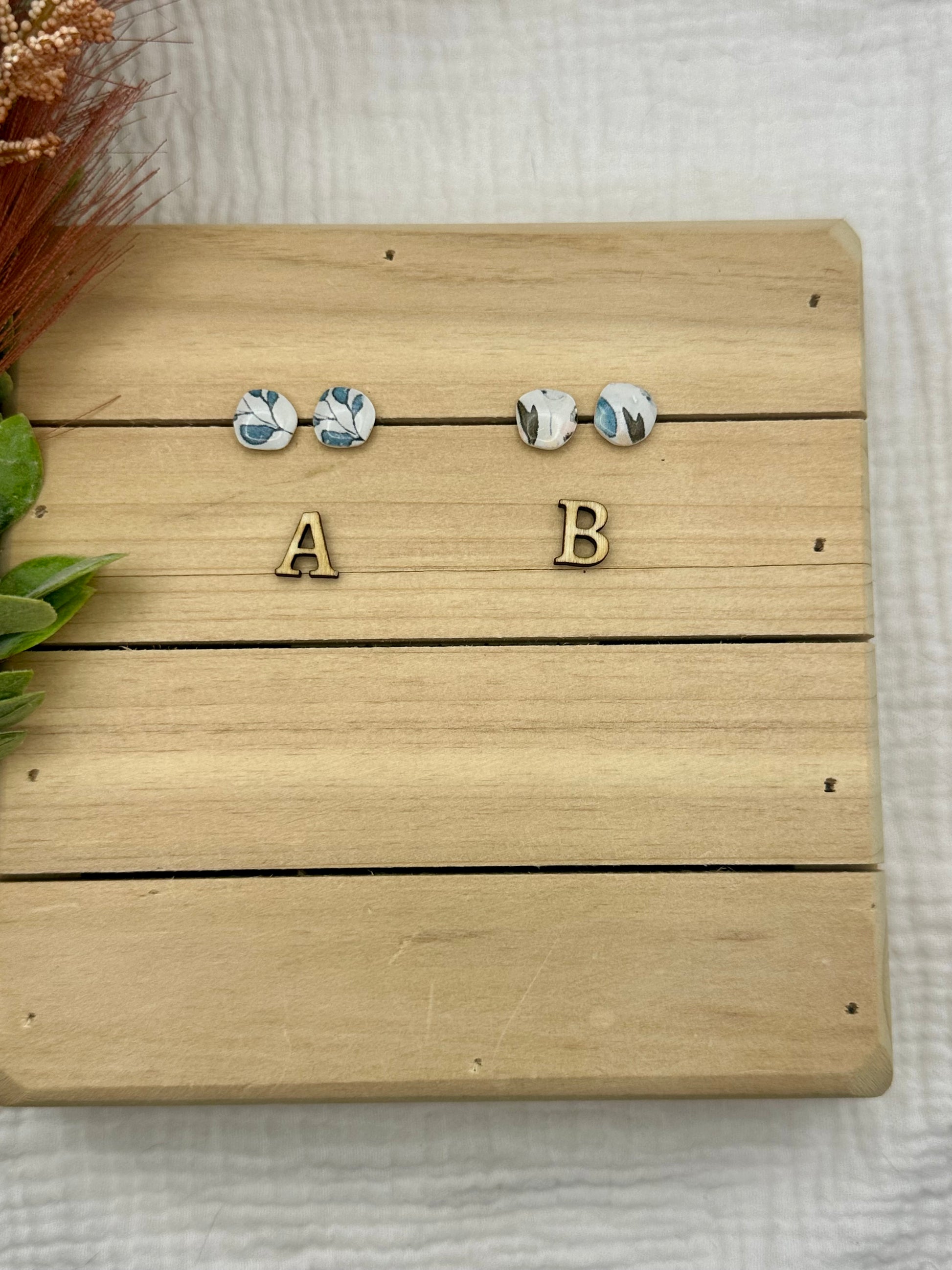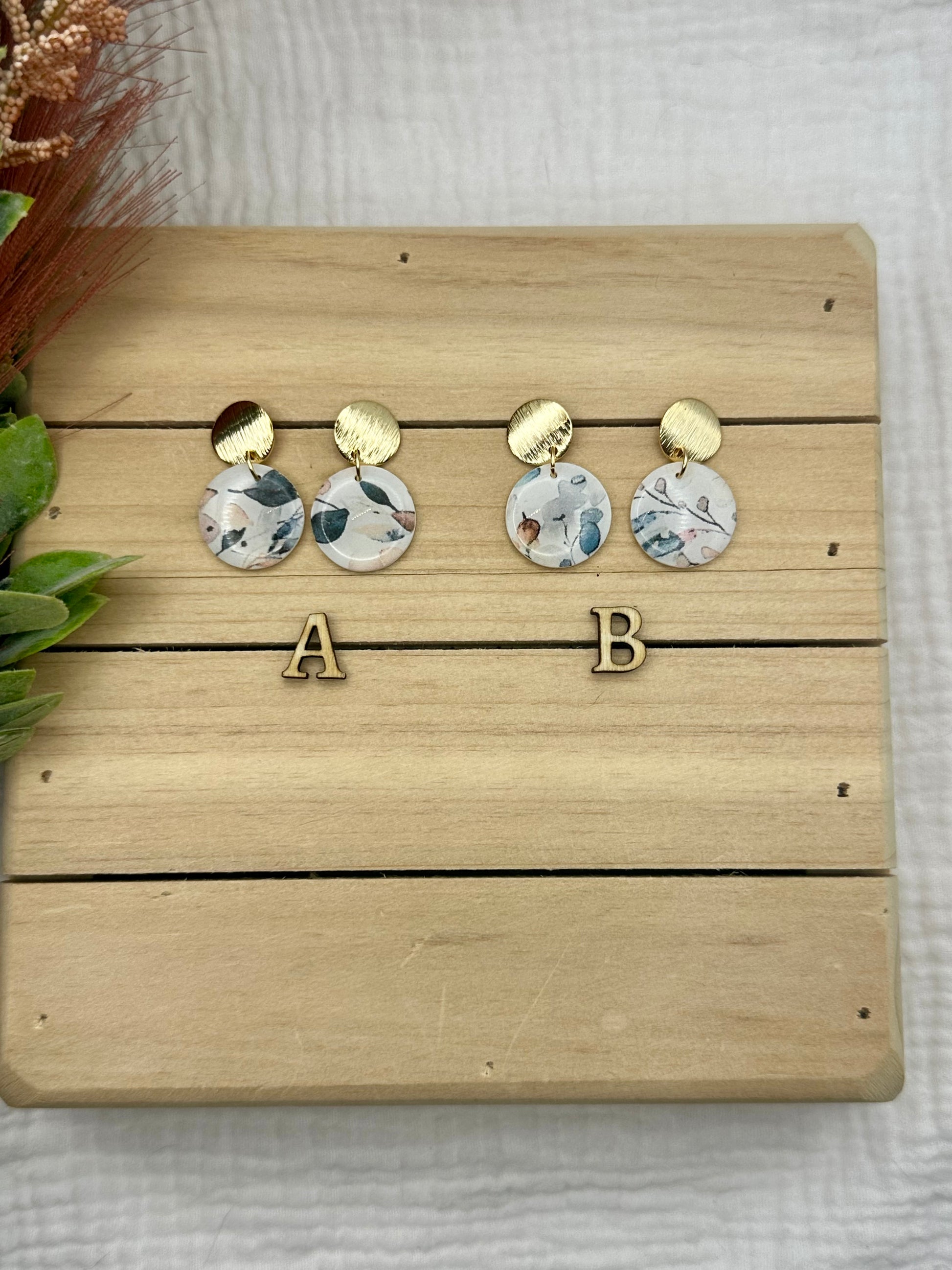 Handmade polymer clay earrings. All on hypoallergenic surgical grade steel findings. Watercolor leaf print on Gold coated surgical steel findings