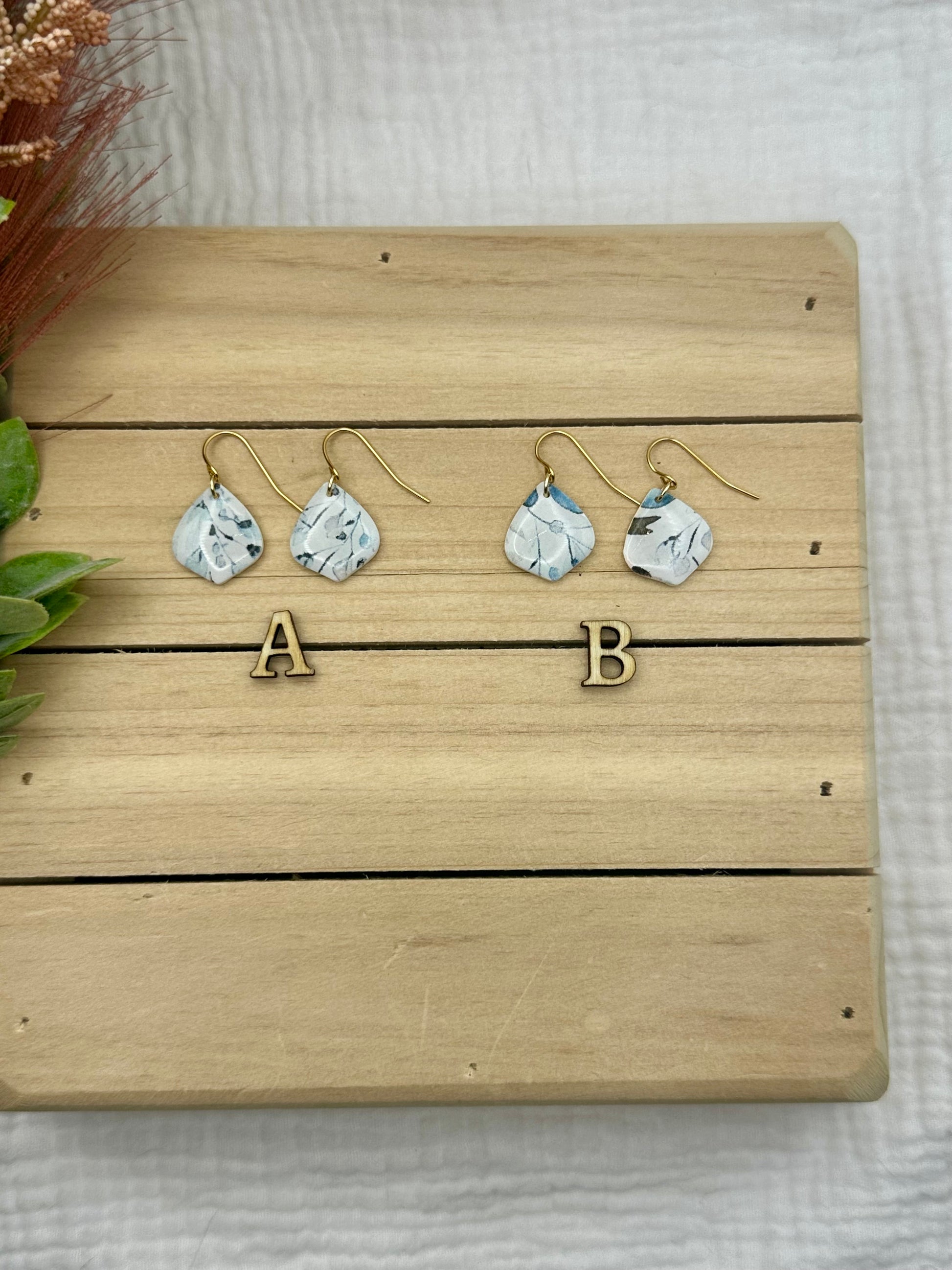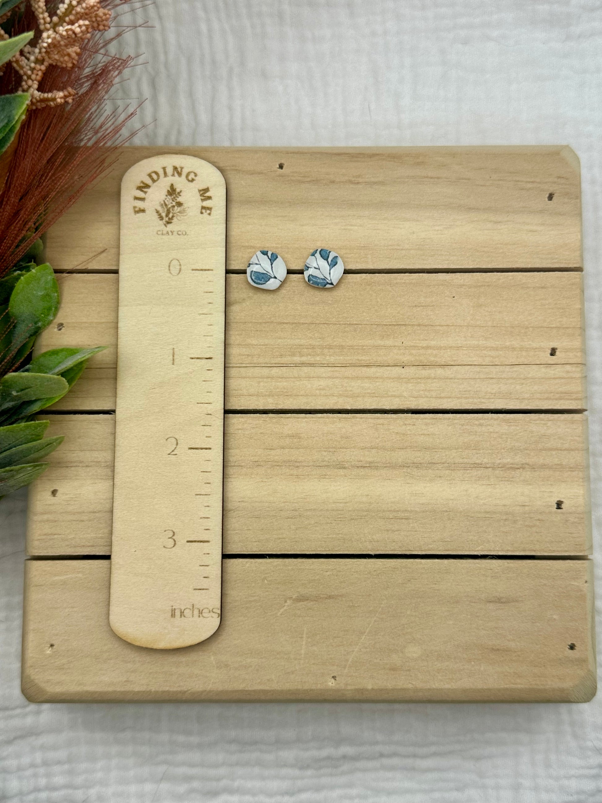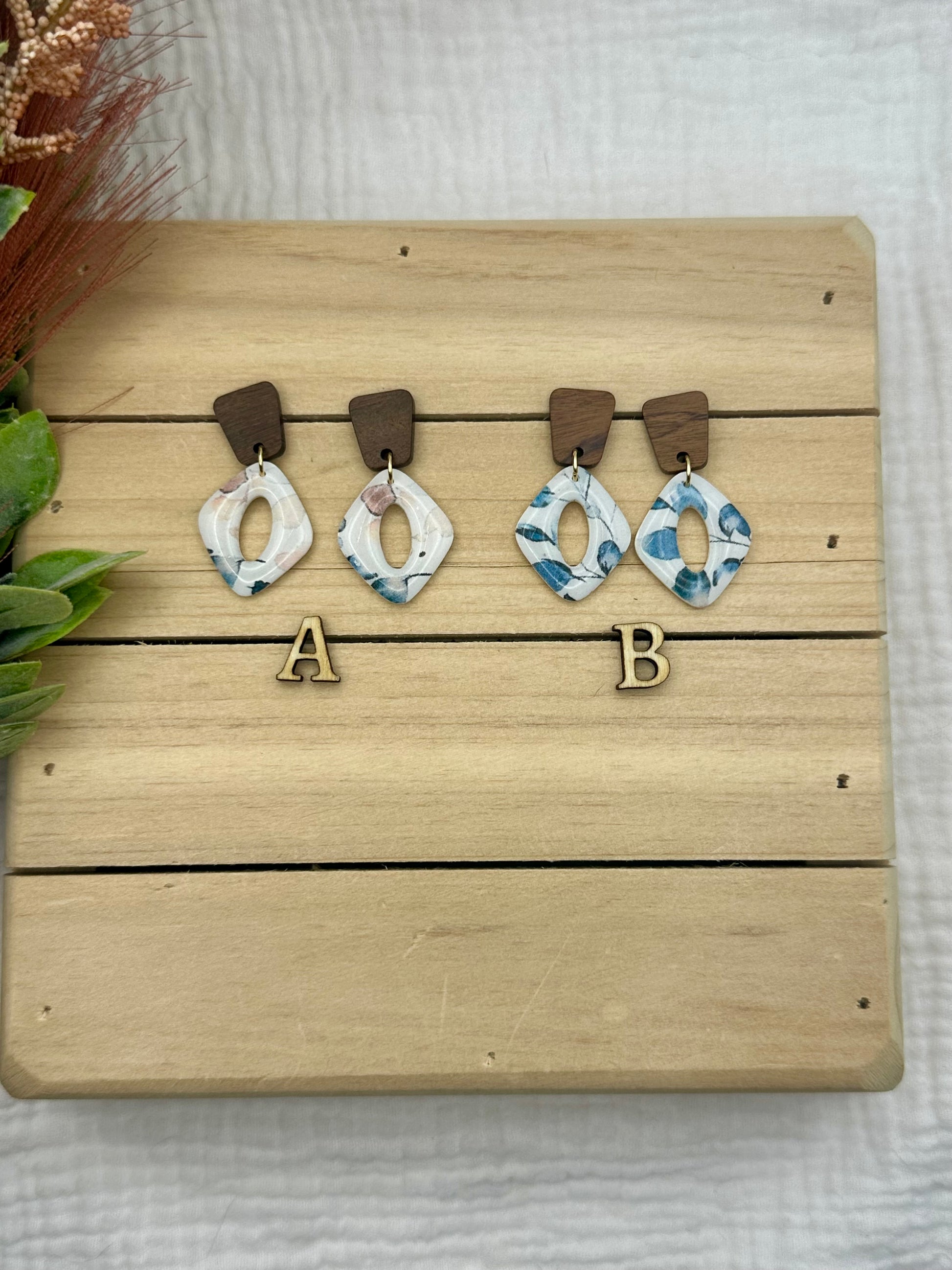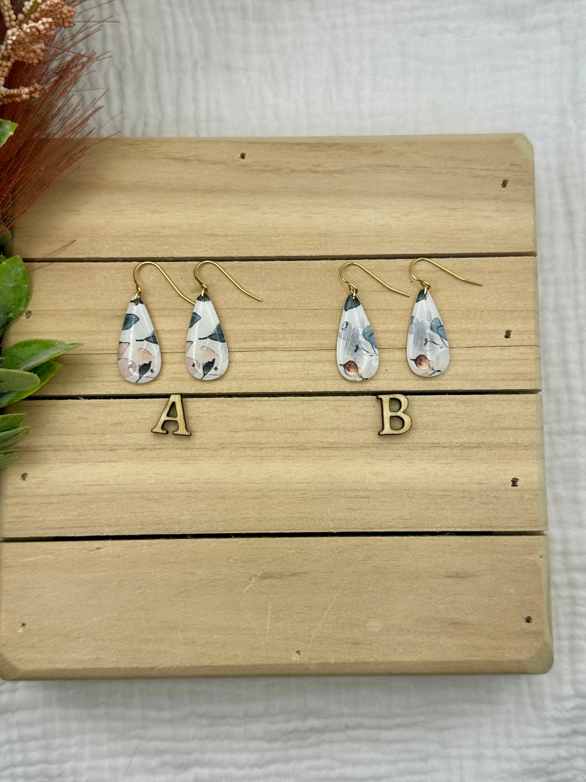 Handmade polymer clay earrings. All on hypoallergenic surgical grade steel findings. Watercolor leaf print on Gold coated surgical steel findings