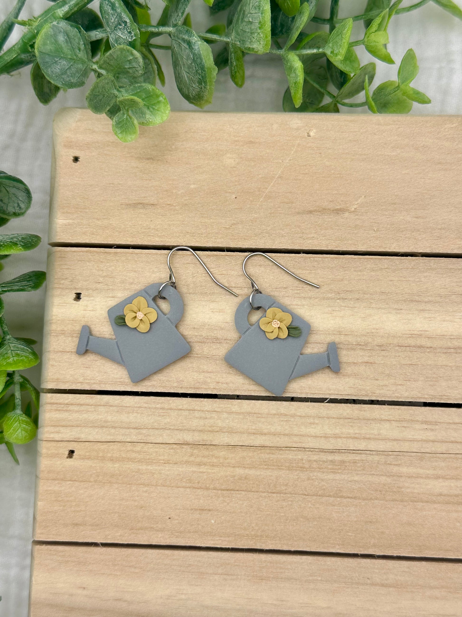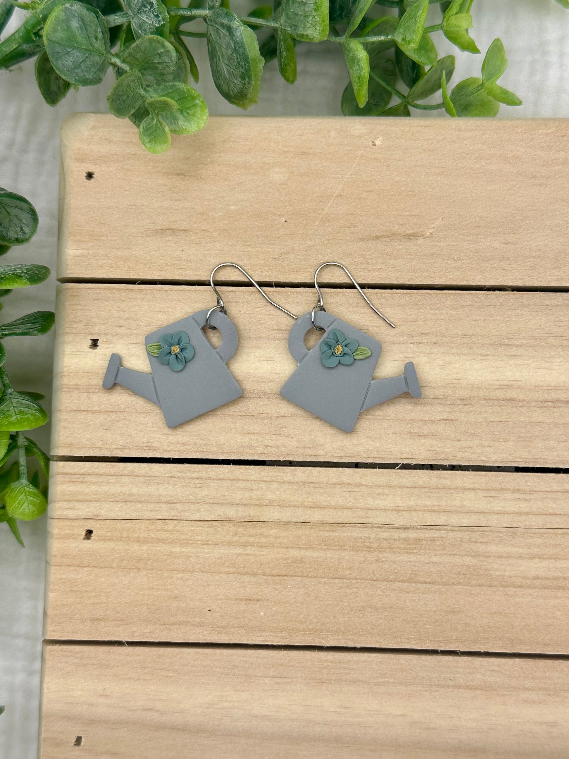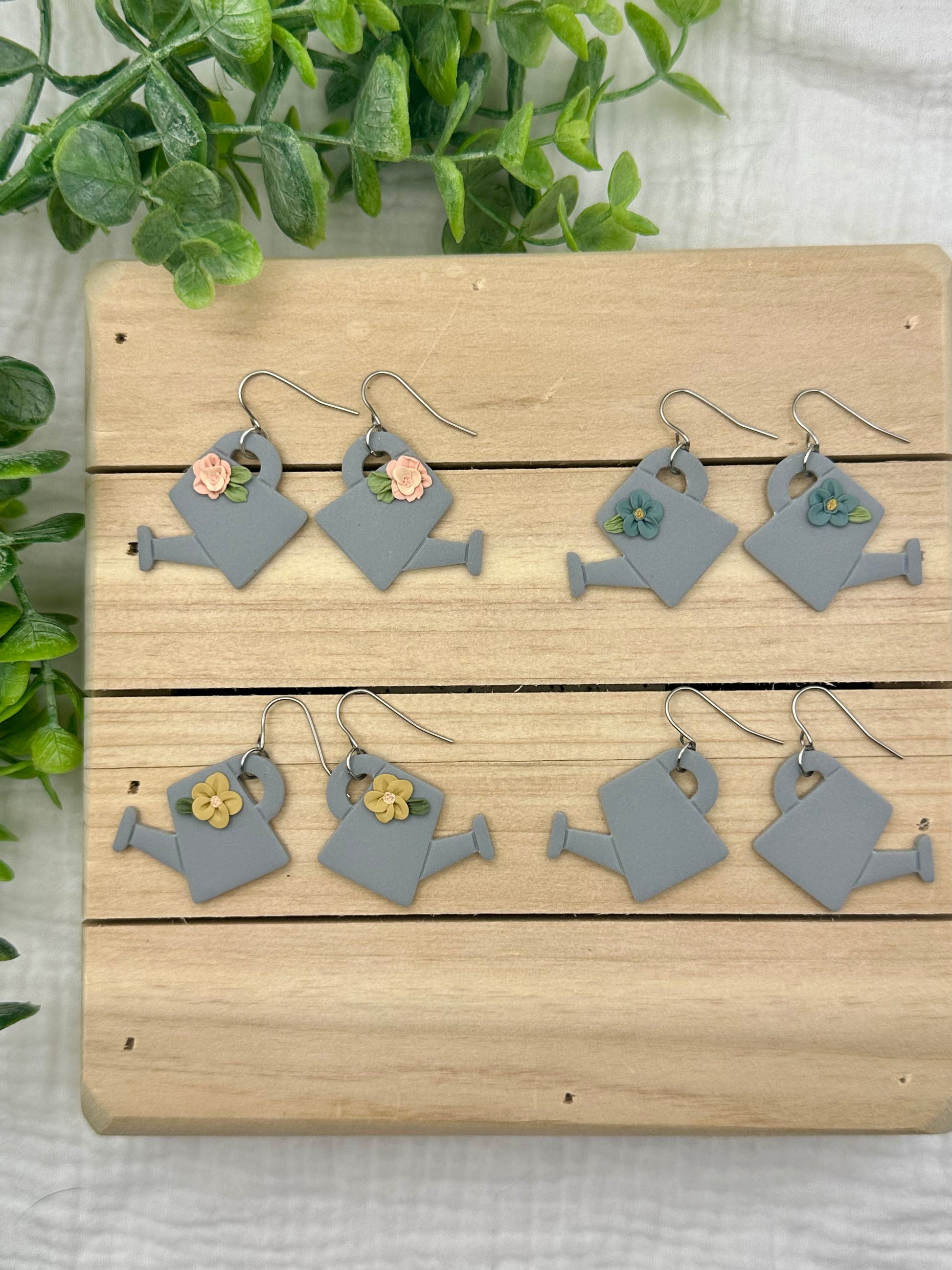 Handmade polymer clay earrings. All on hypoallergenic surgical grade steel findings. Watering cans with flower or plain on hooks