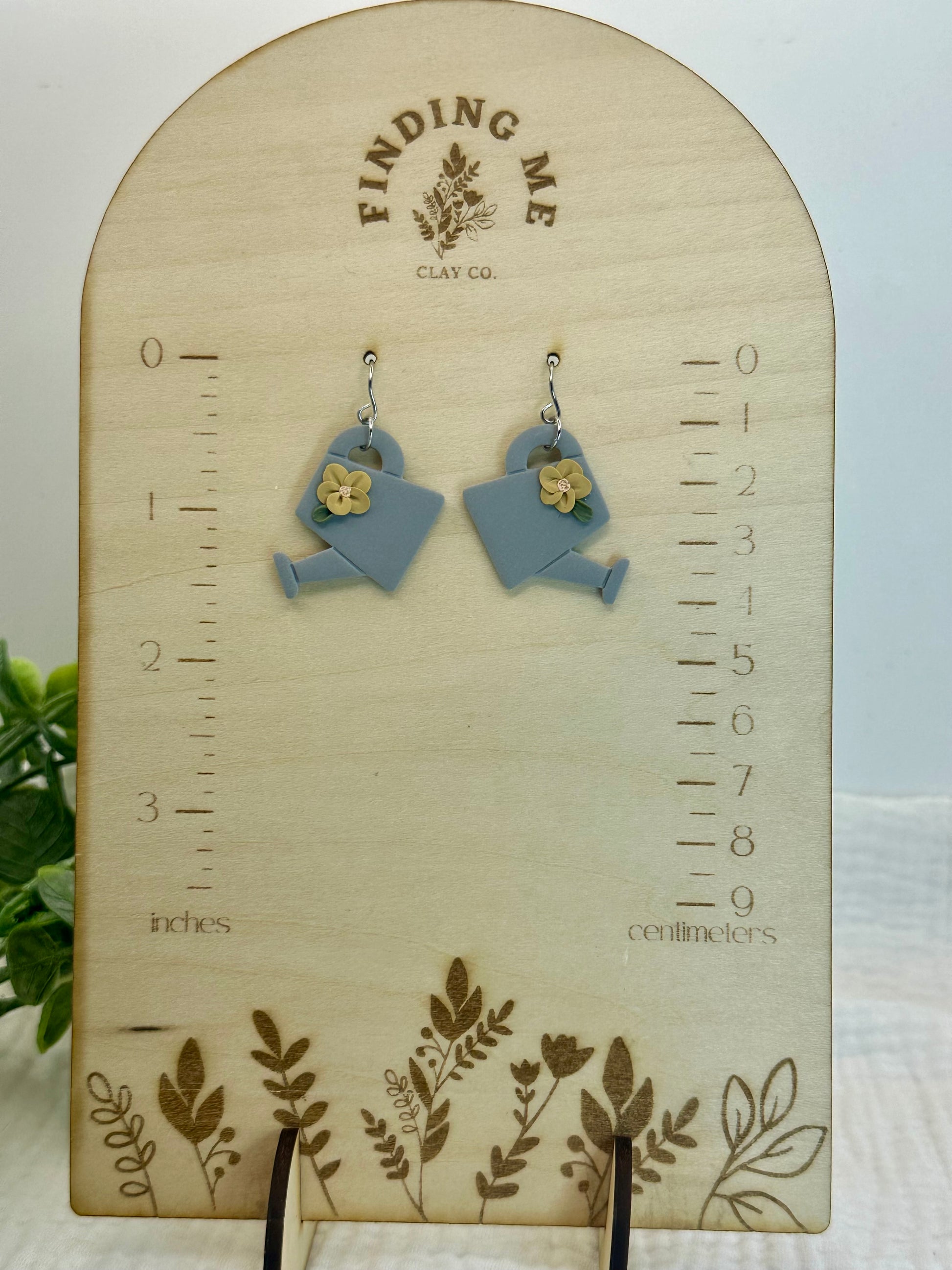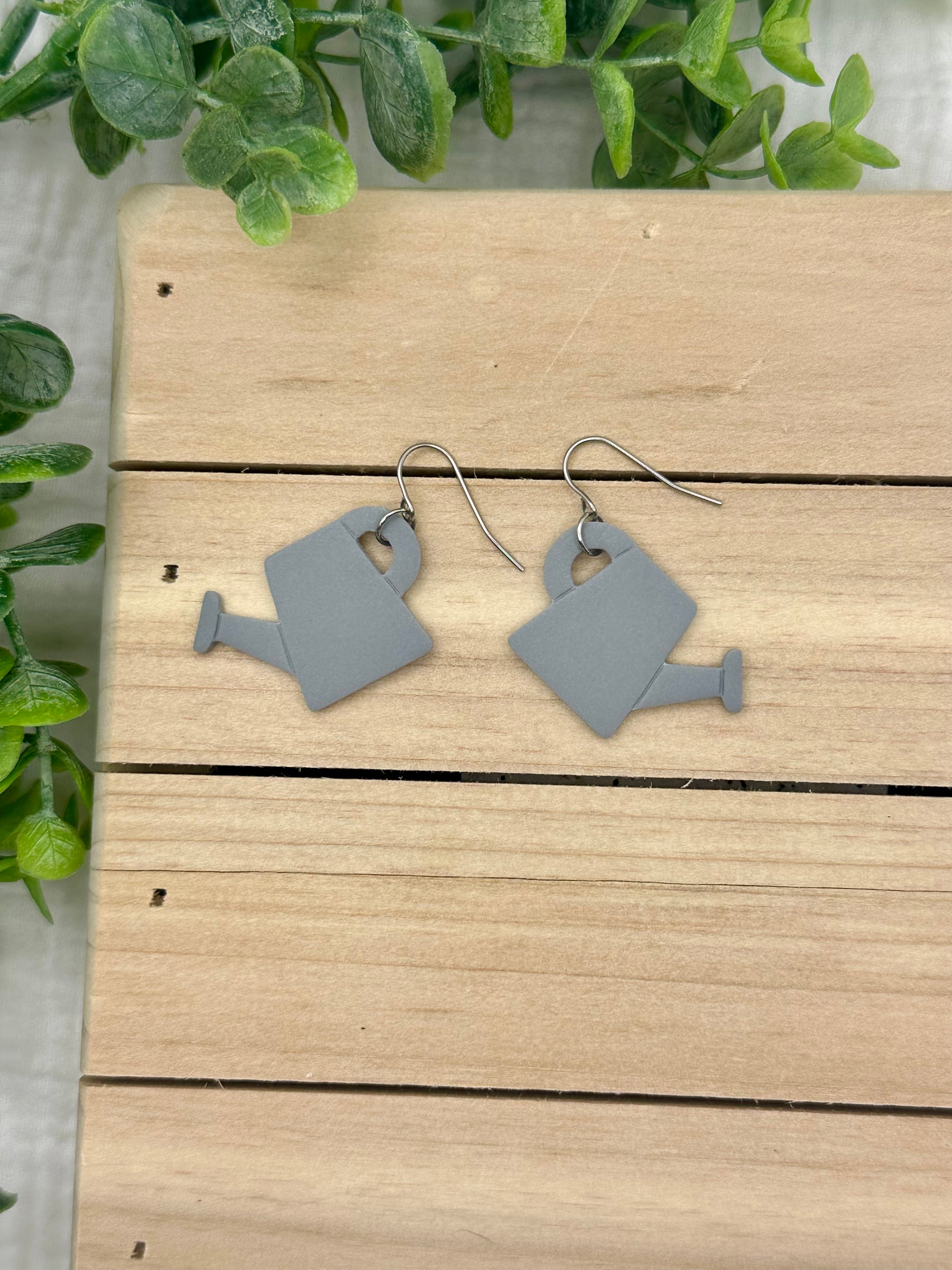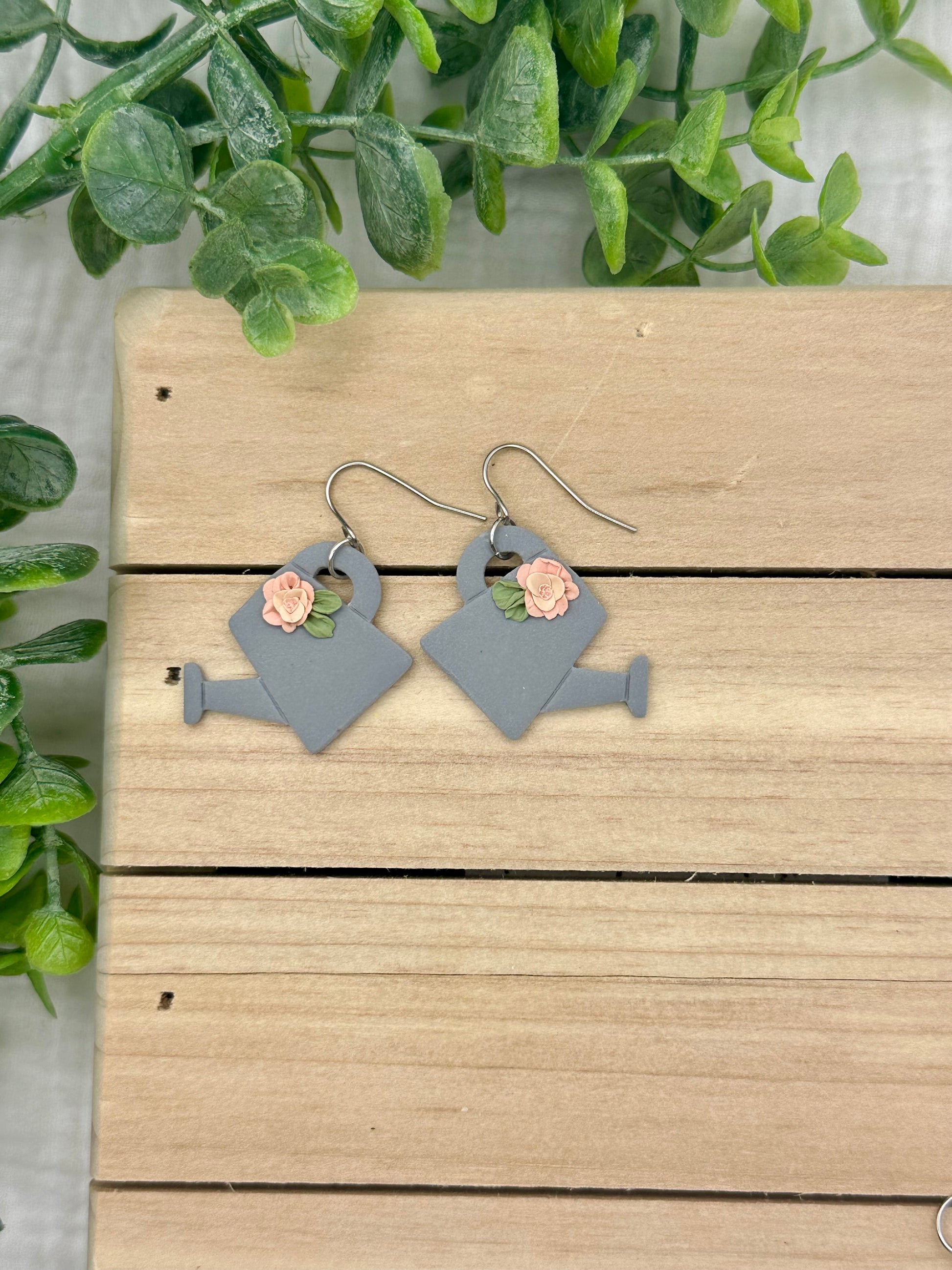 Handmade polymer clay earrings. All on hypoallergenic surgical grade steel findings. Watering cans with flower or plain on hooks