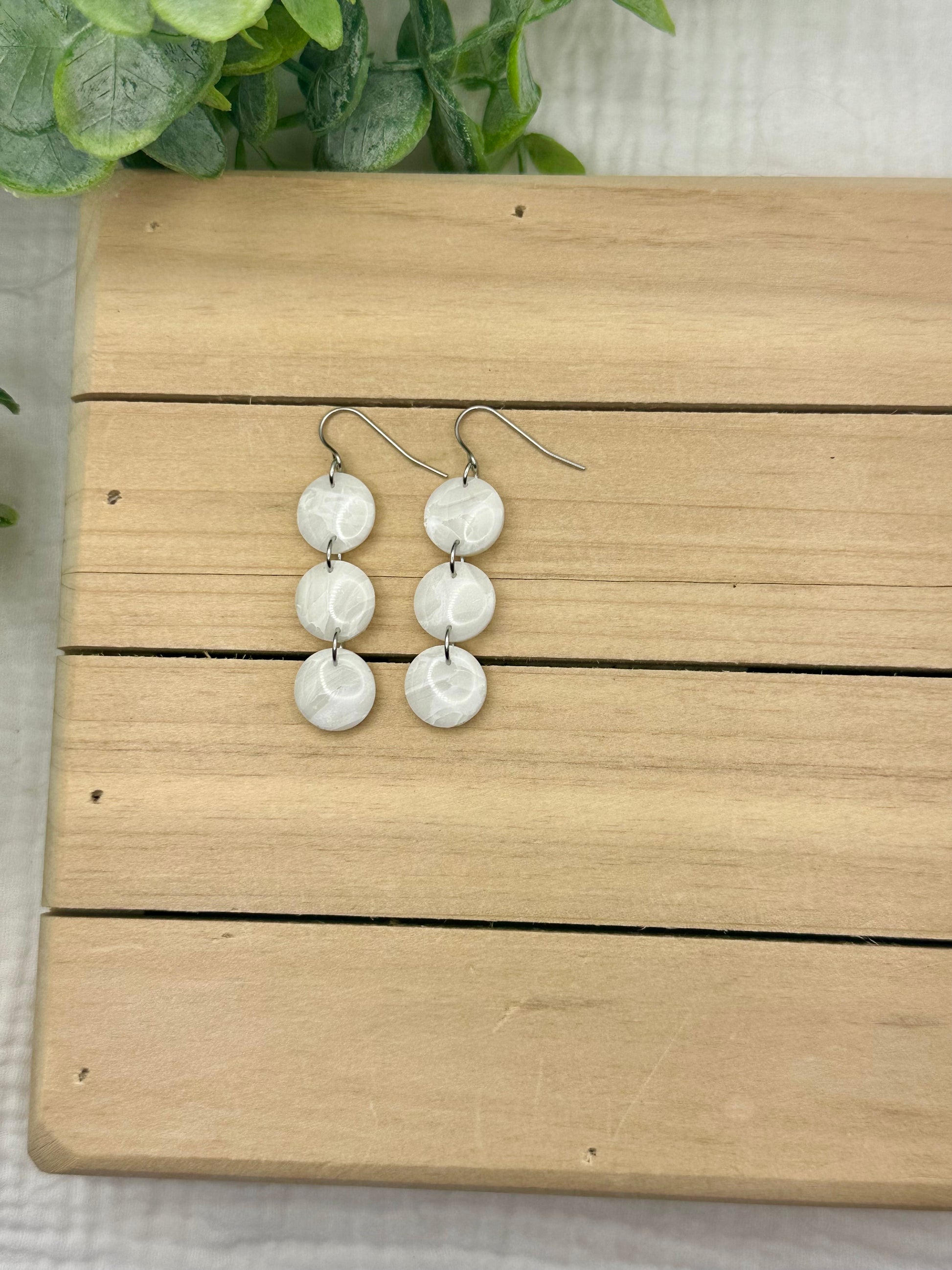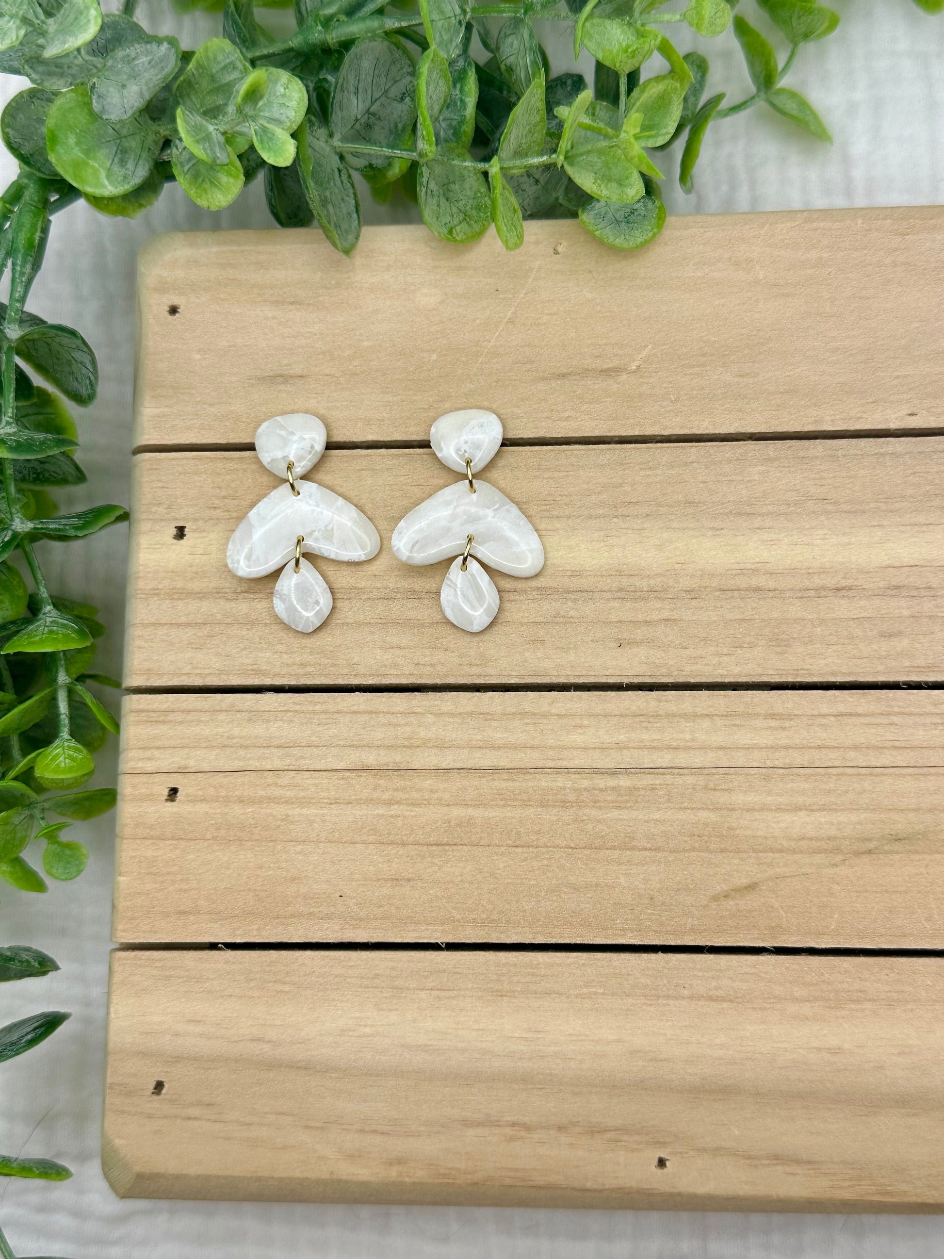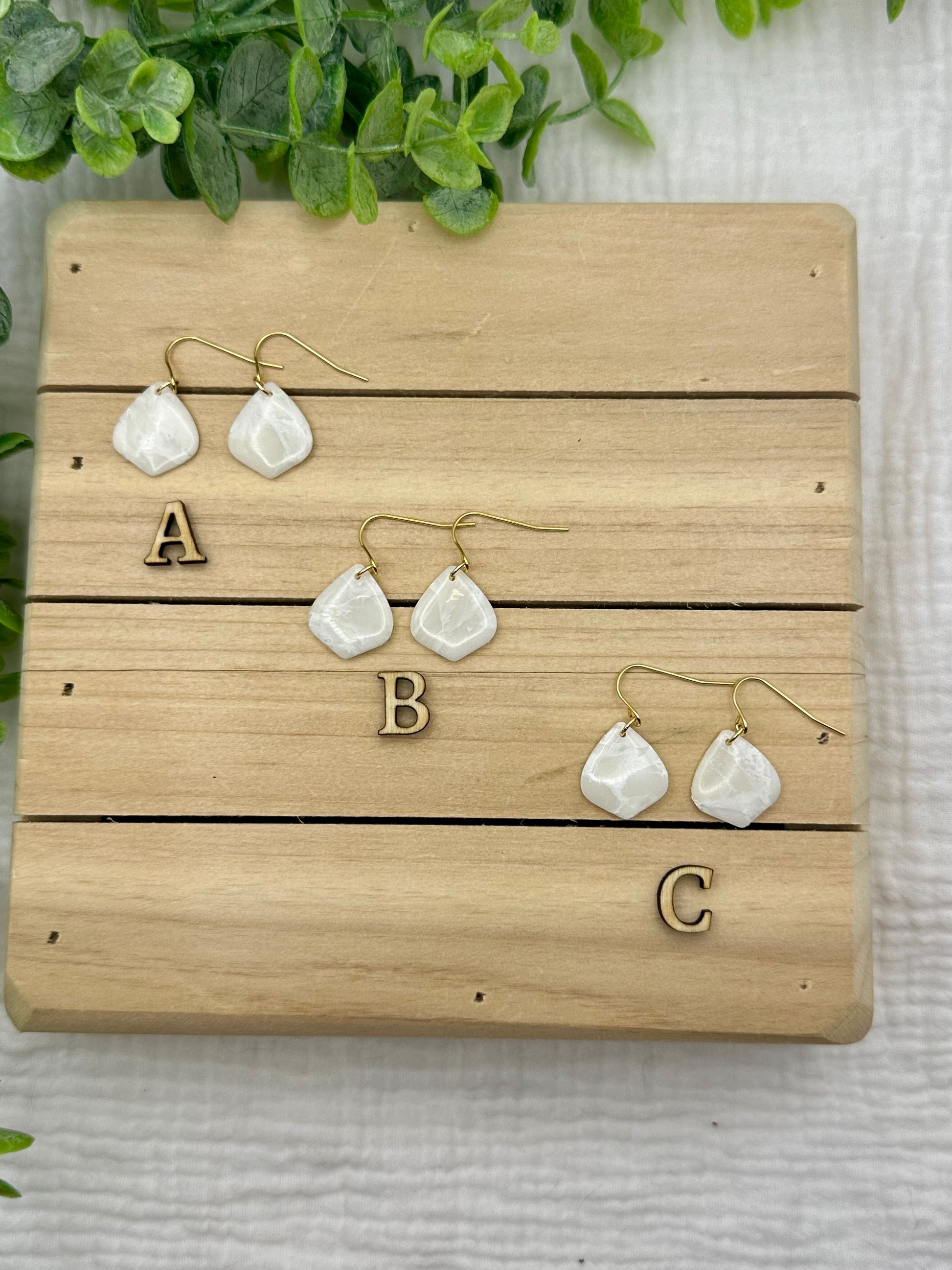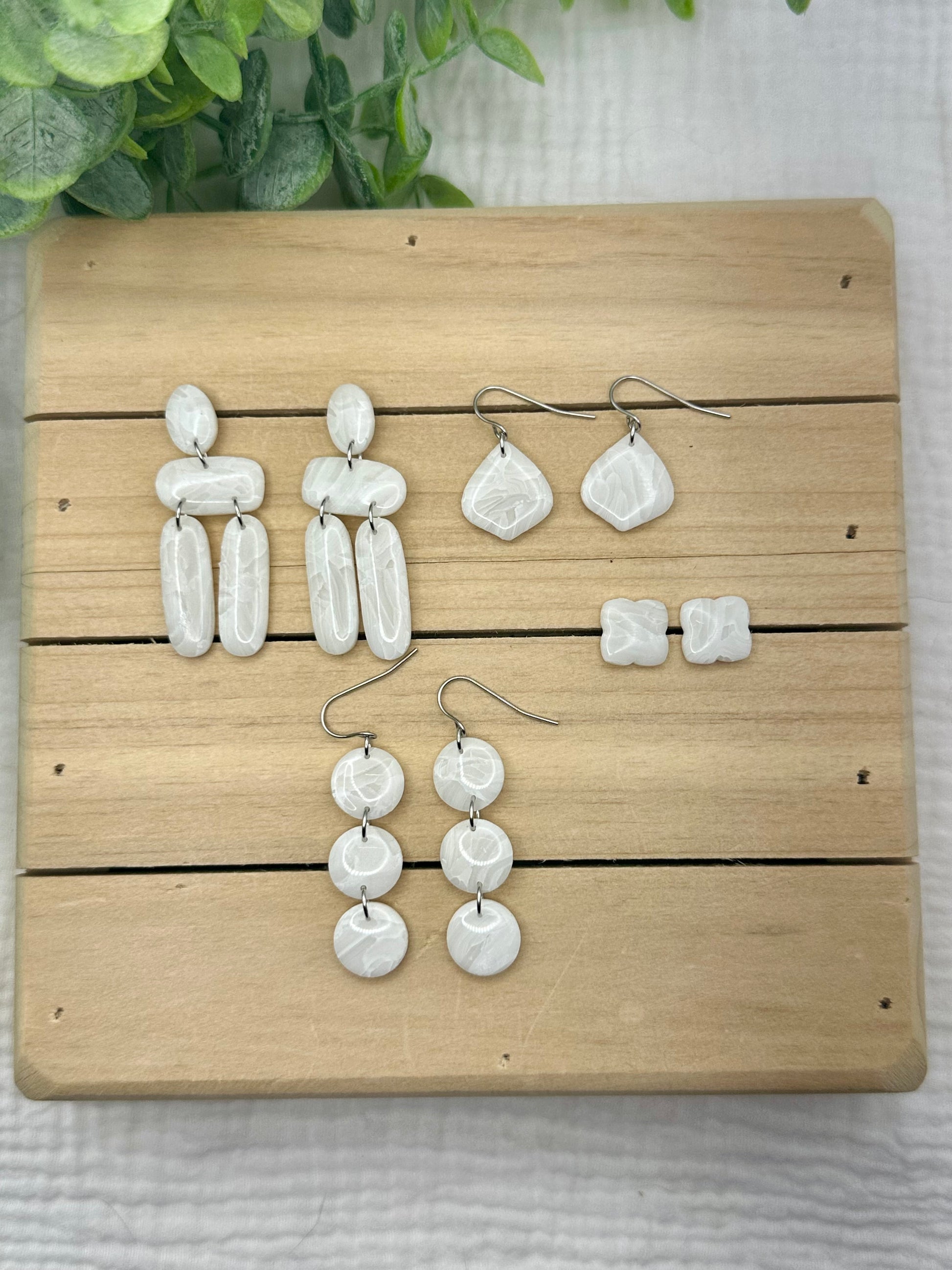 Handmade polymer clay earrings. All on hypoallergenic surgical grade steel findings. White marbled on gold coated findings