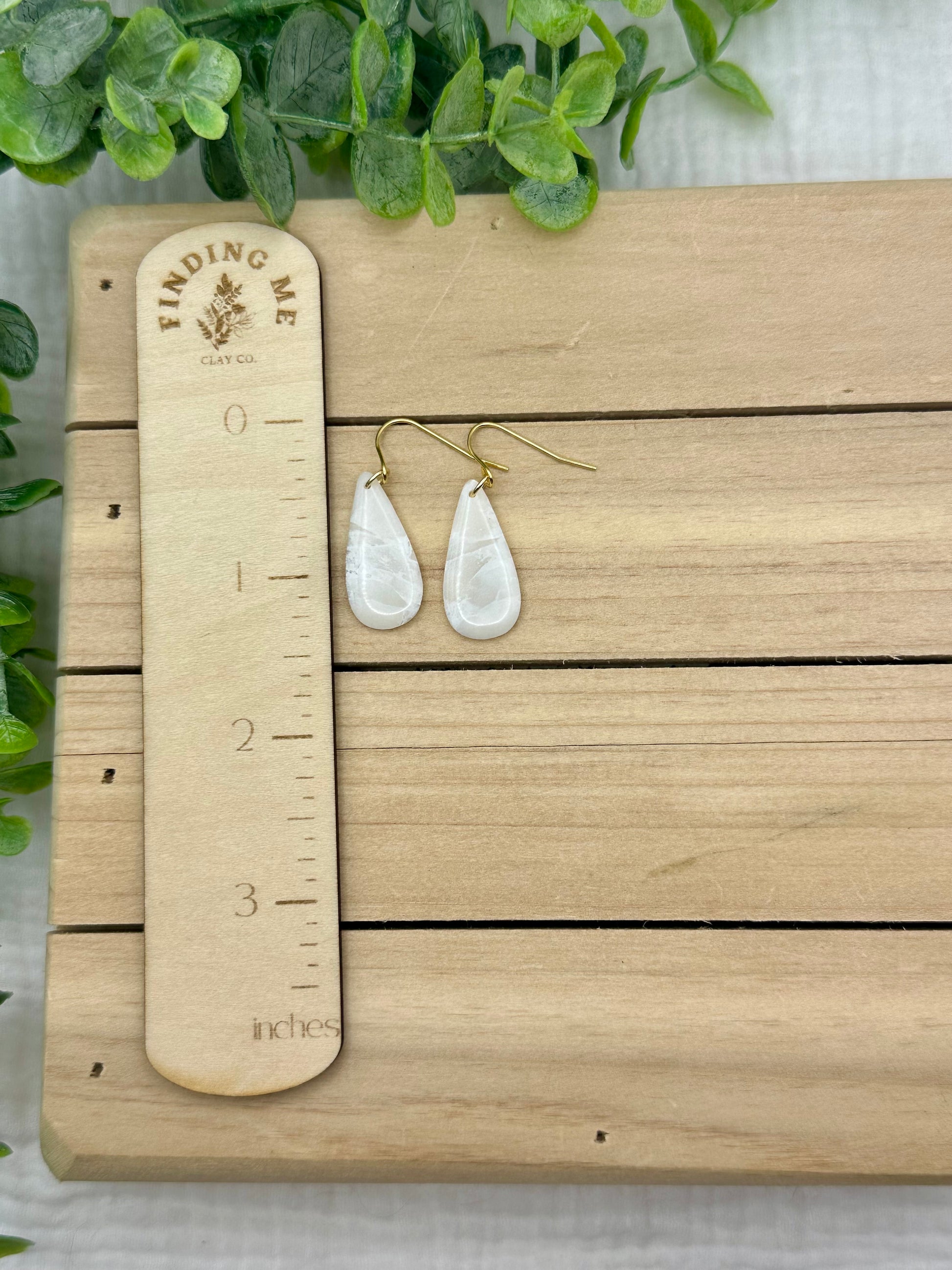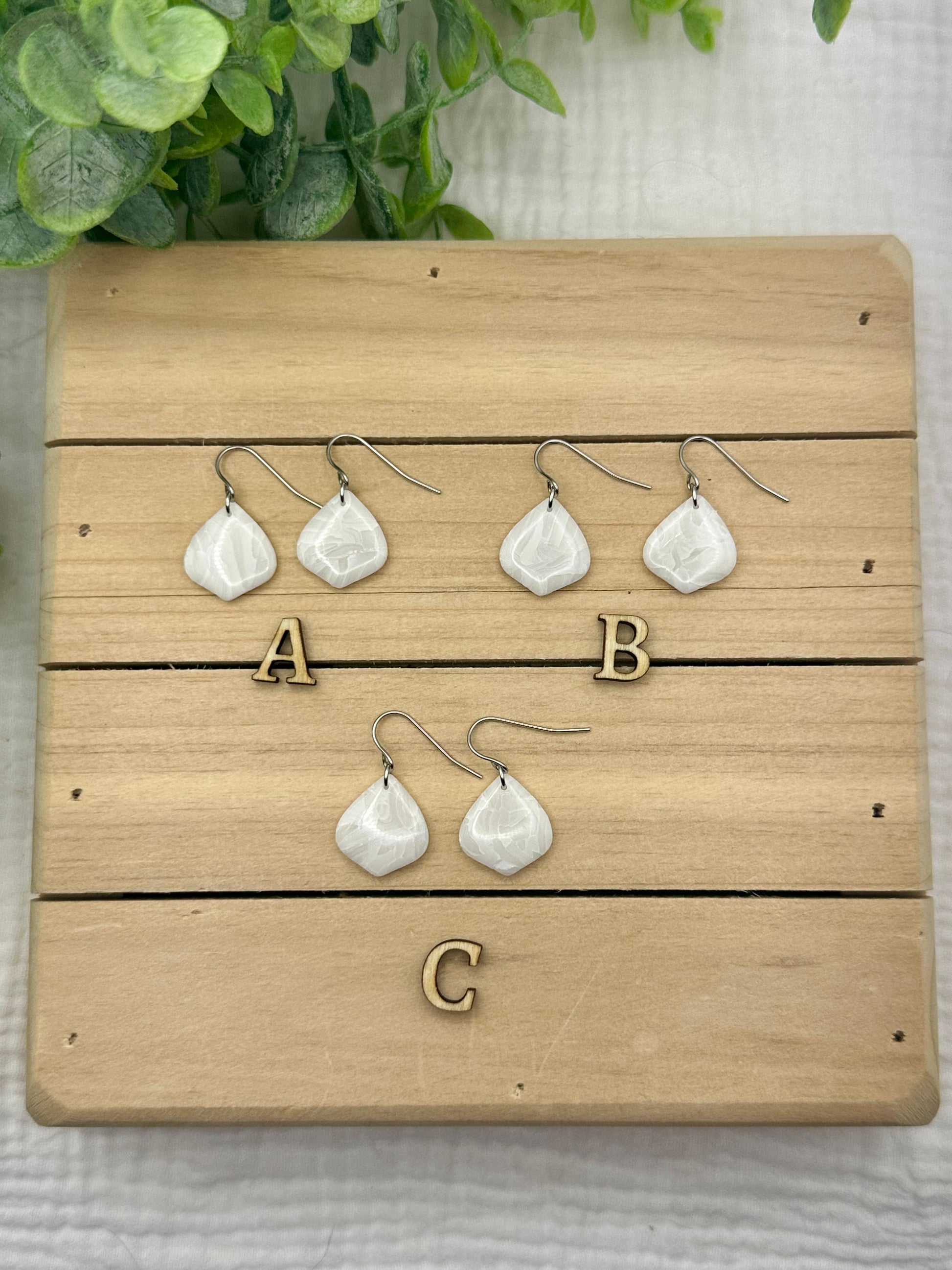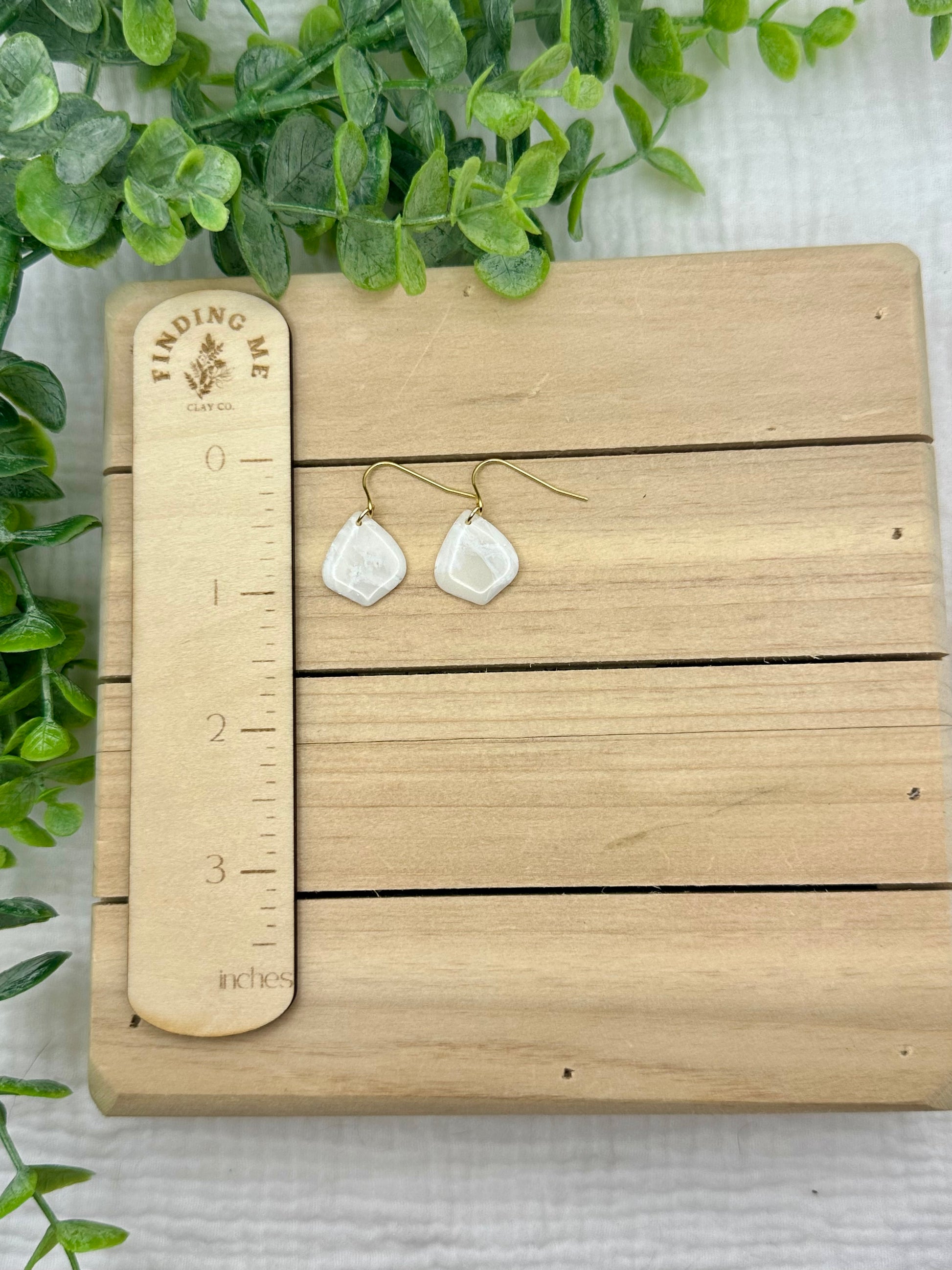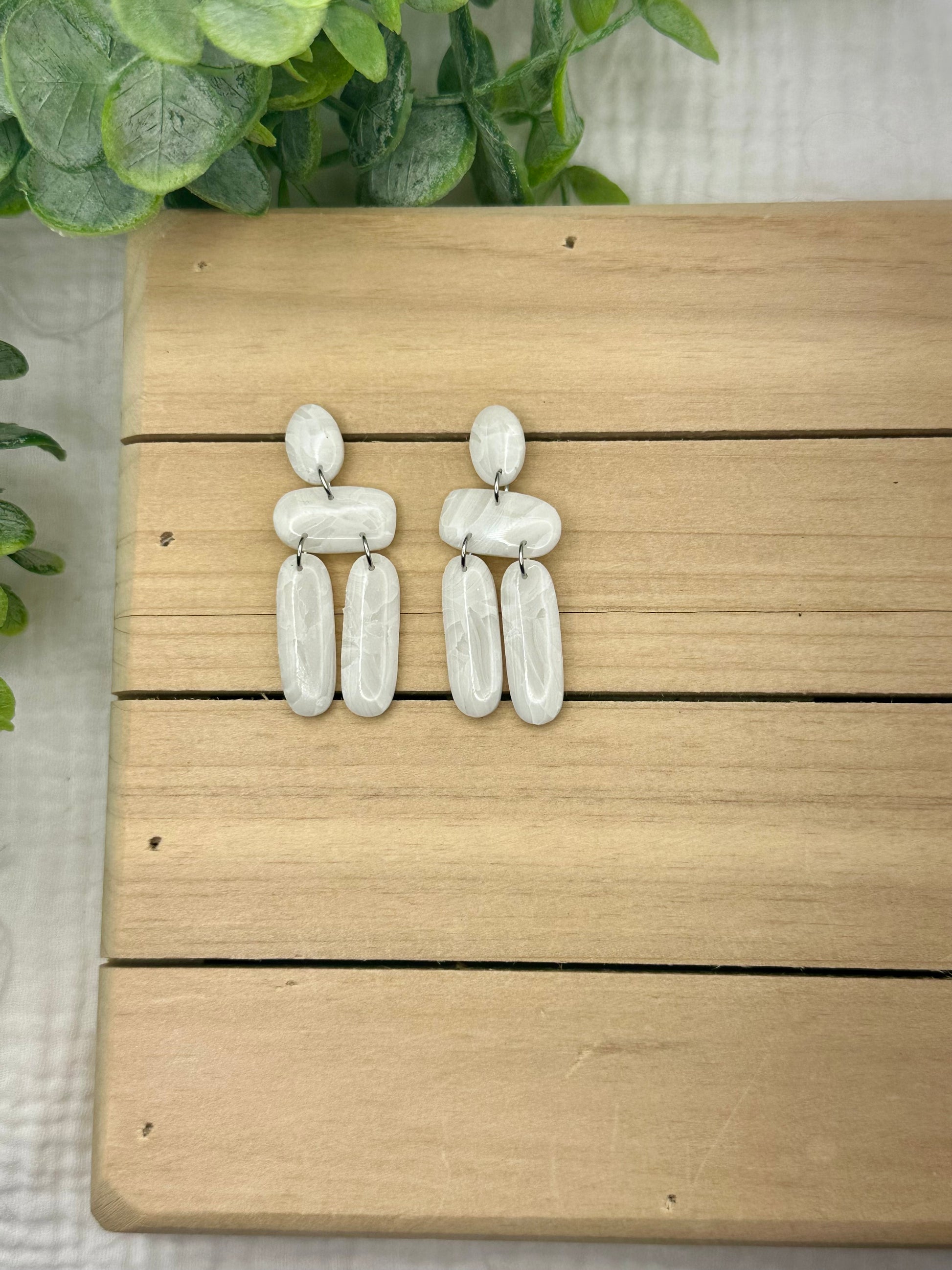 Handmade polymer clay earrings. All on hypoallergenic surgical grade steel findings. White marbled on gold coated findings