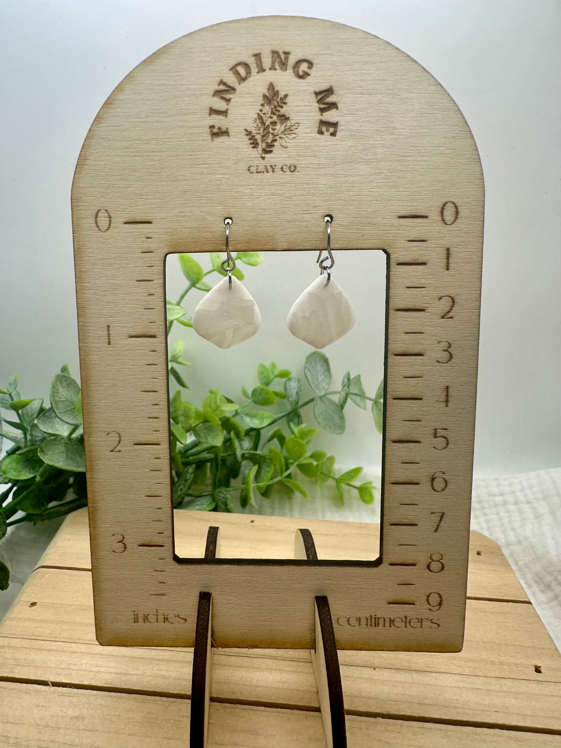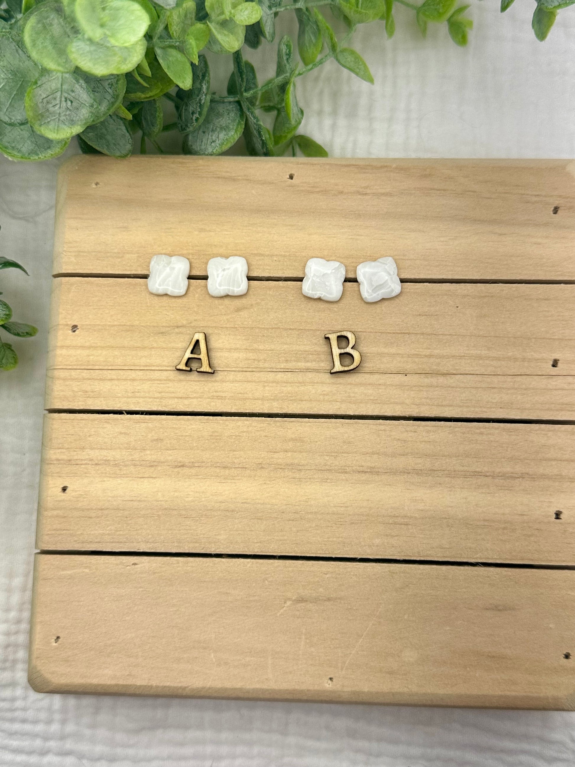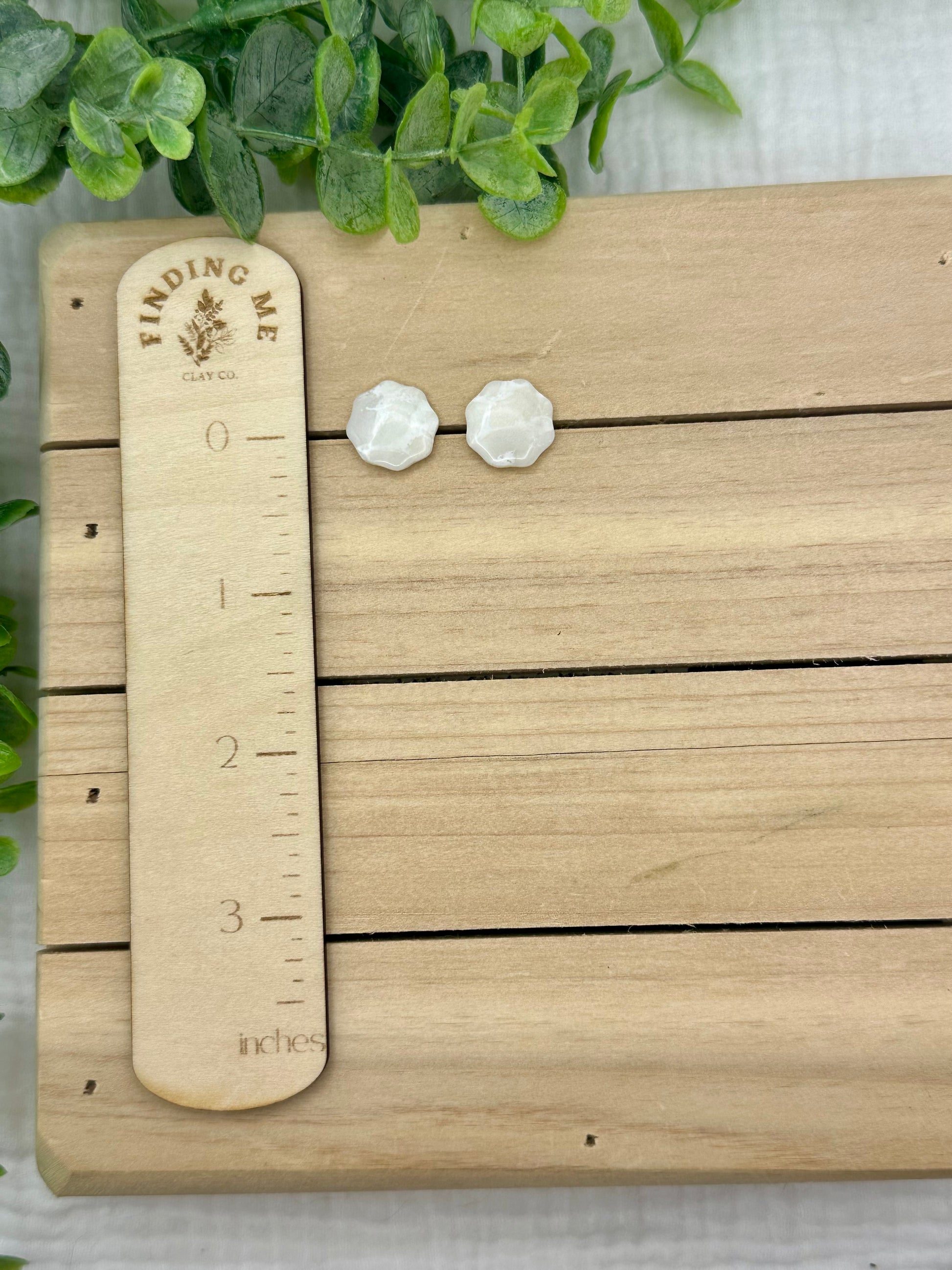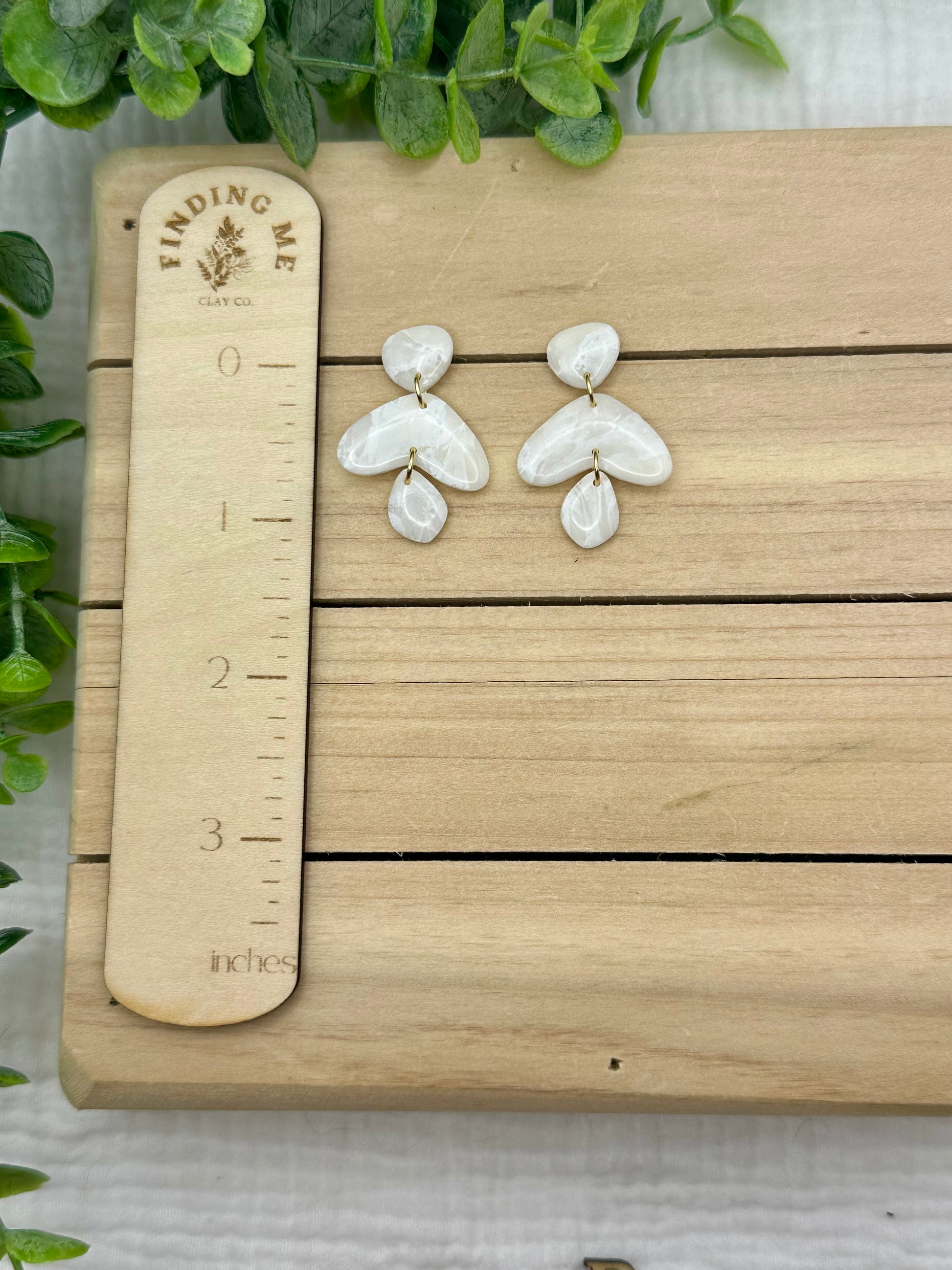 Handmade polymer clay earrings. All on hypoallergenic surgical grade steel findings. White marbled on gold coated findings